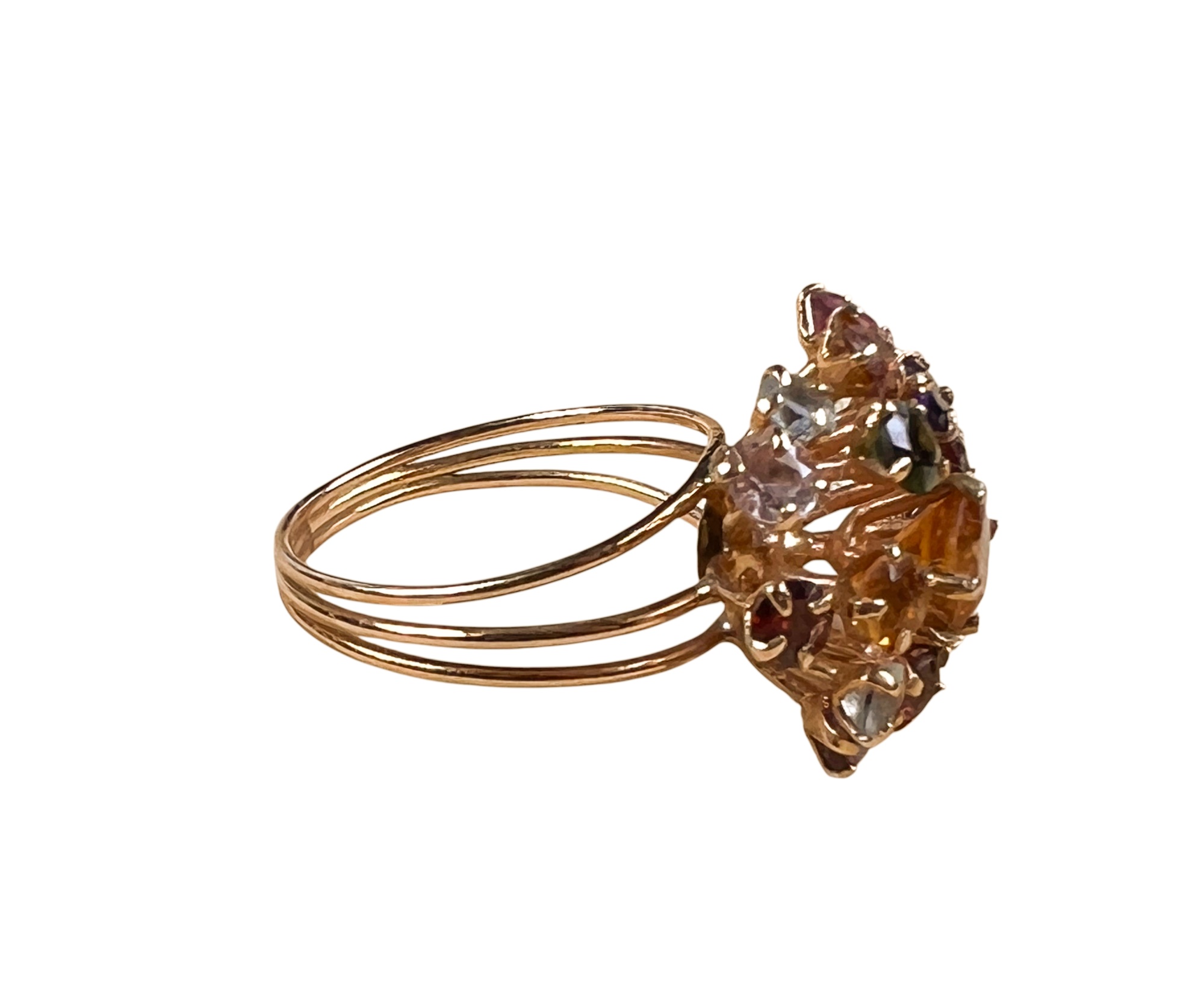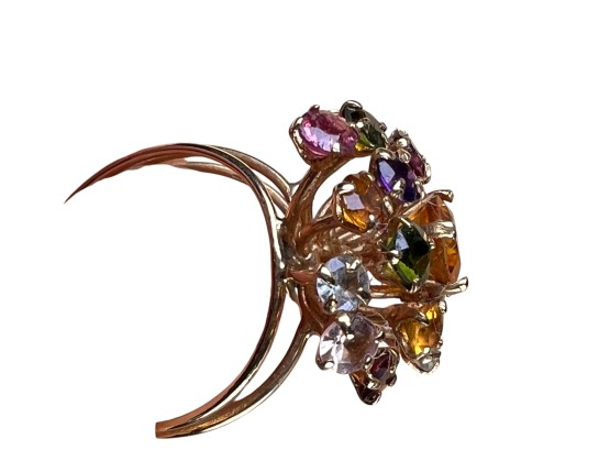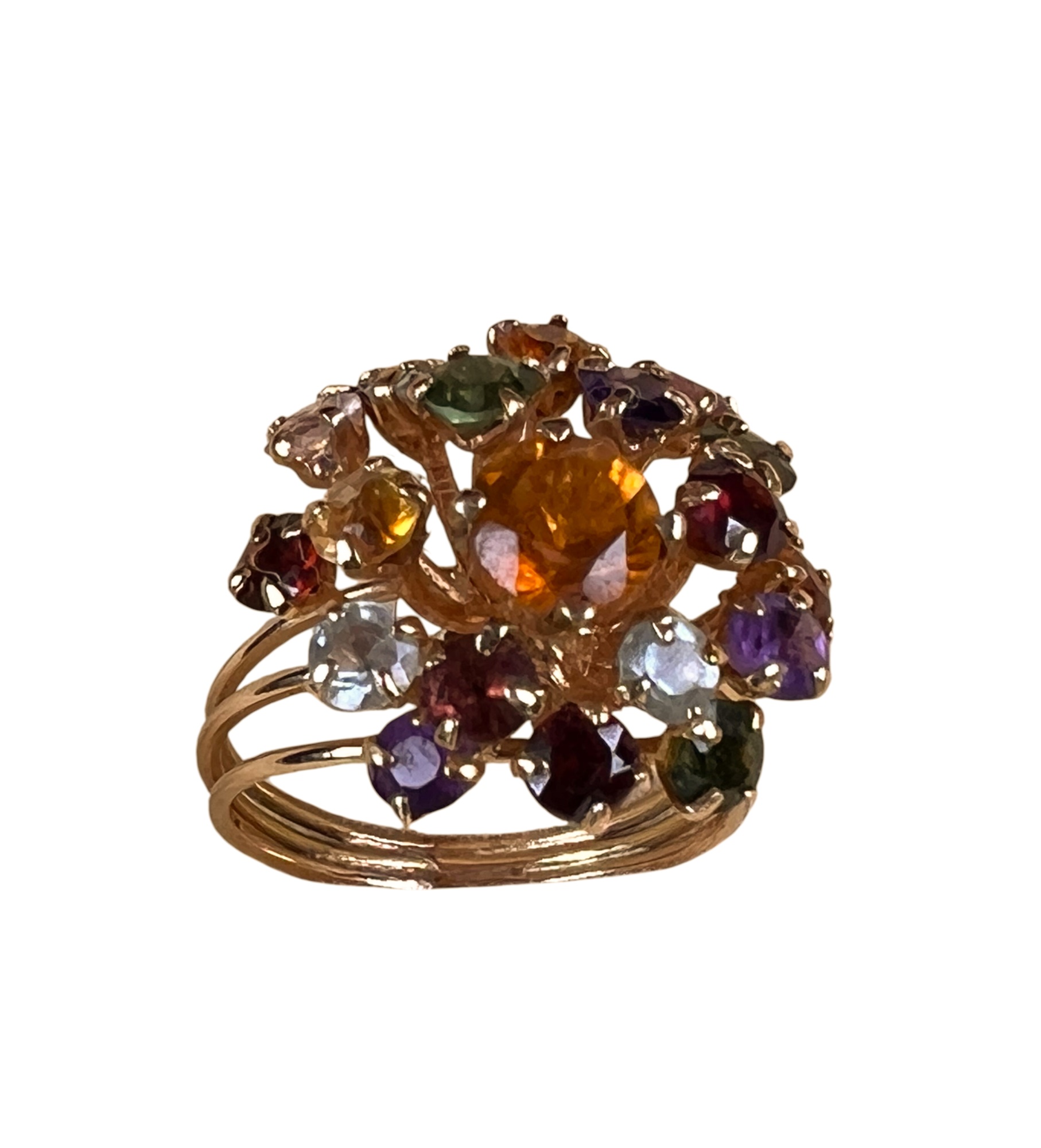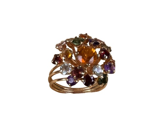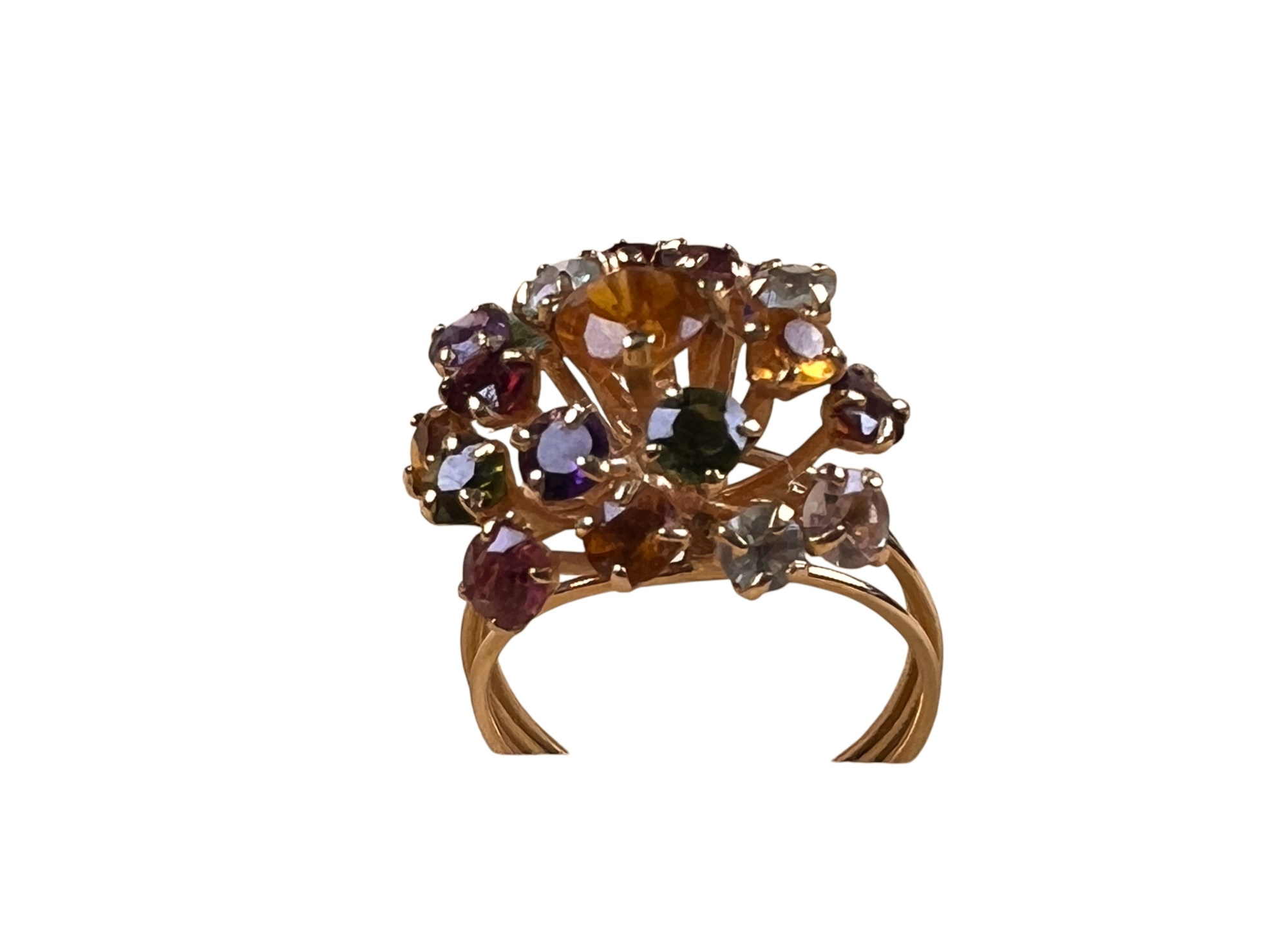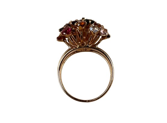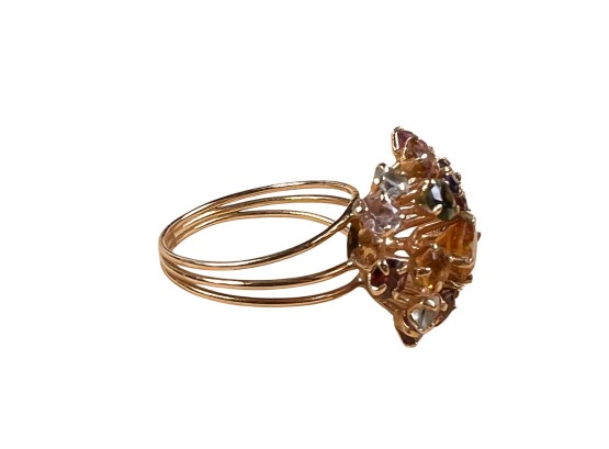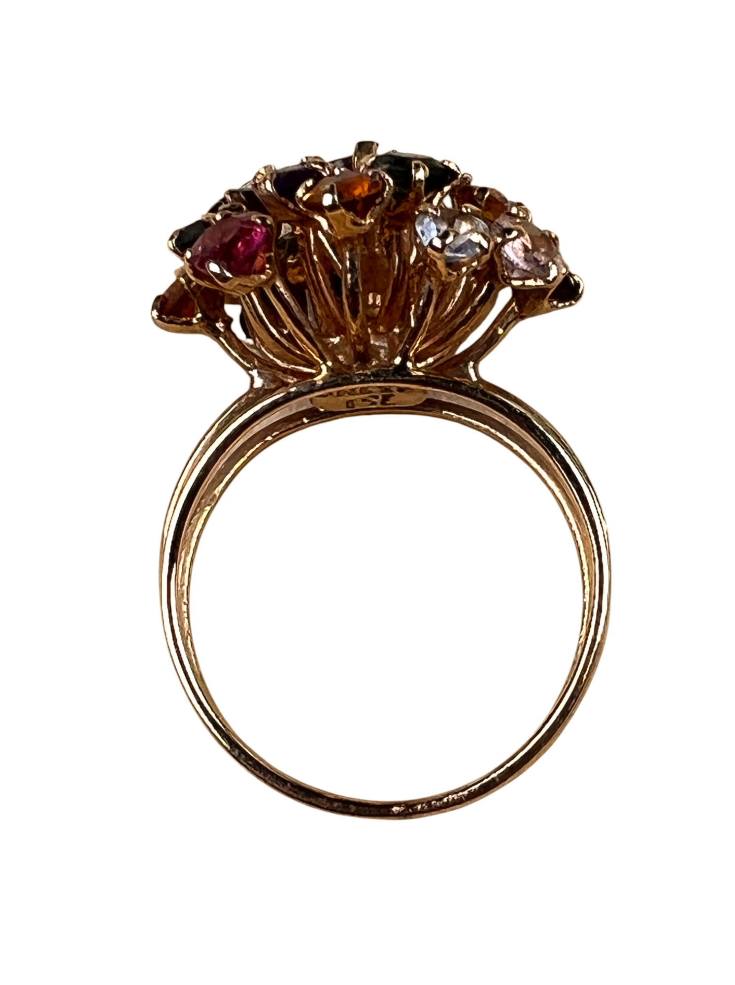 Marked 750 (18K) with a variety of gemstones. 2.6 DWT. Size 6. Condition: Good, used