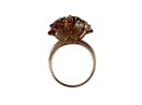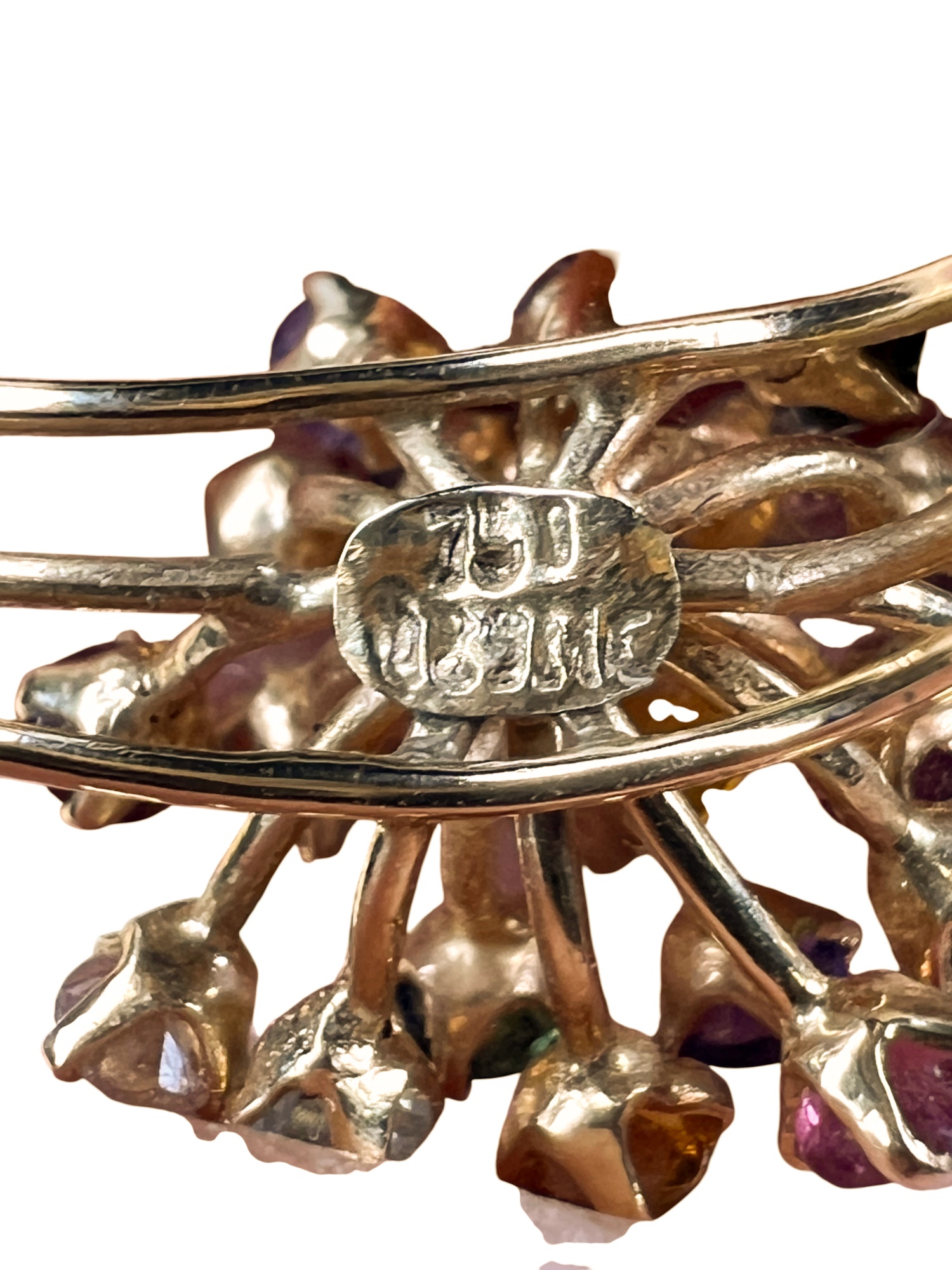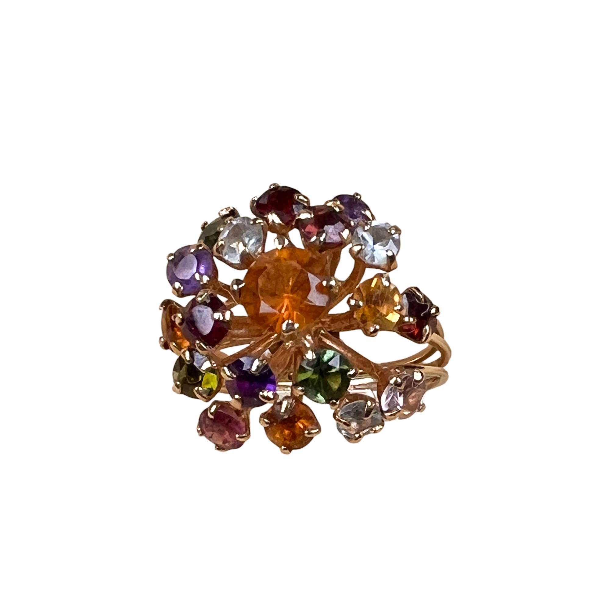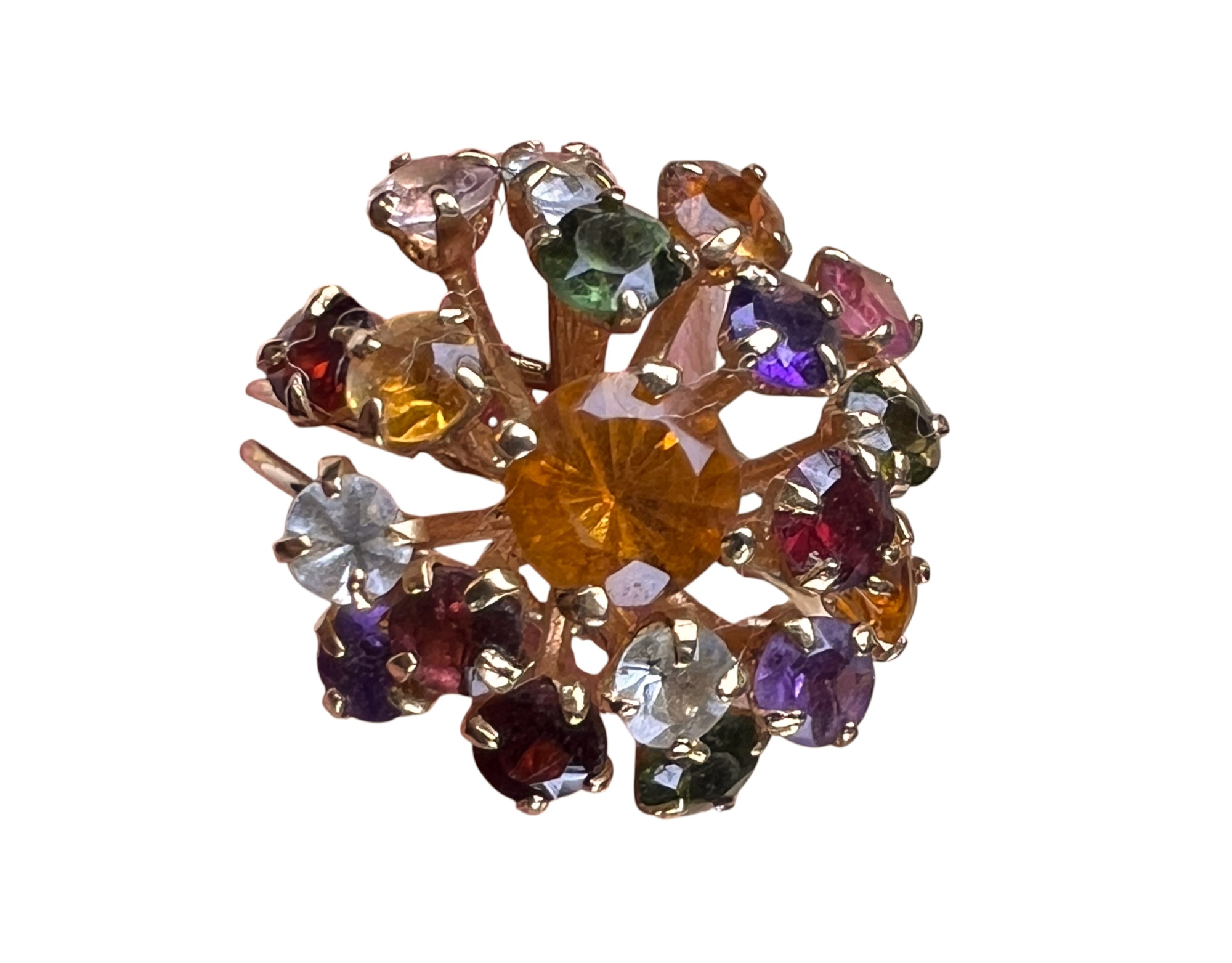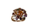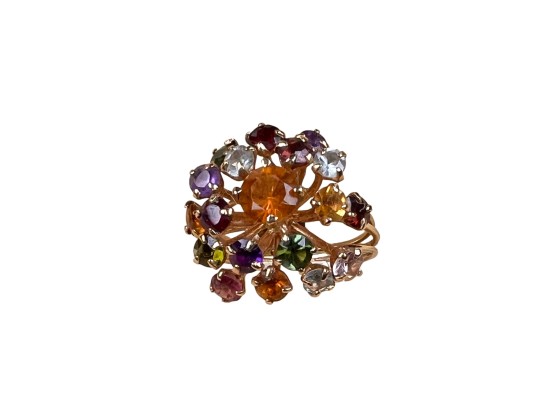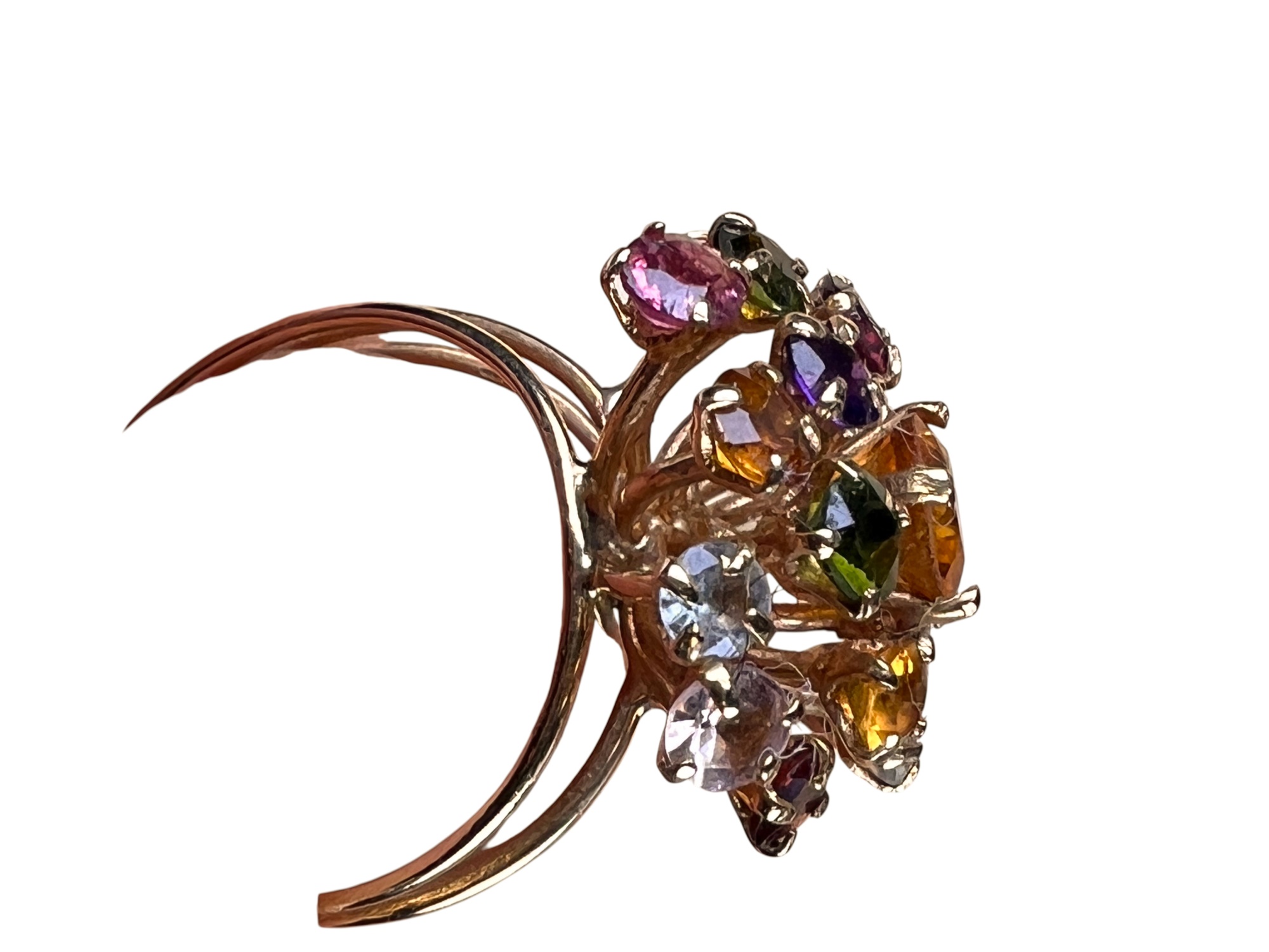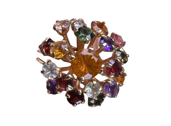 Marked 750 (18K) with a variety of gemstones. 2.6 DWT. Size 6. Condition: Good, used