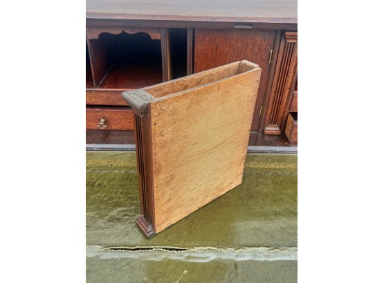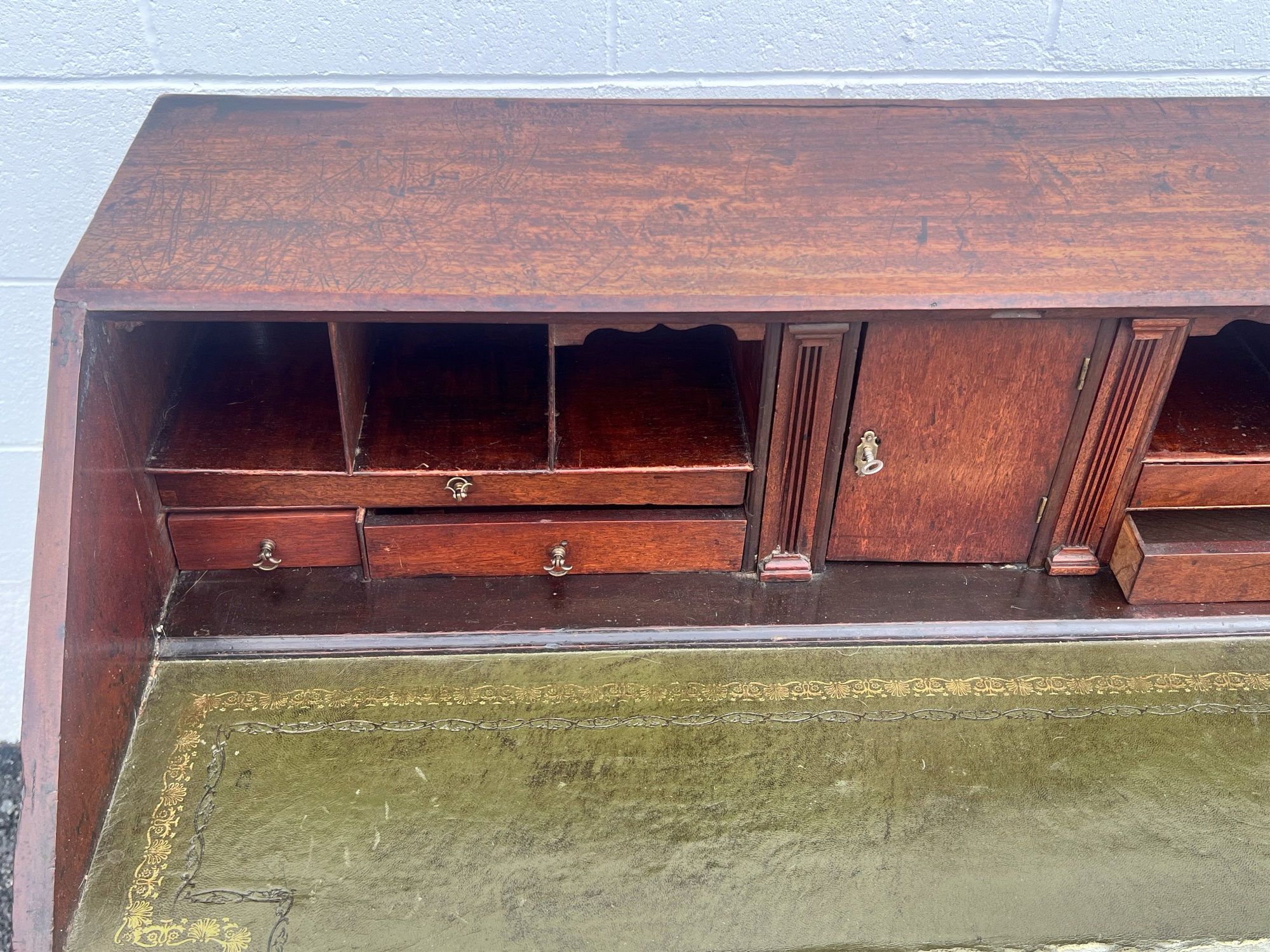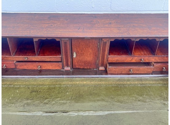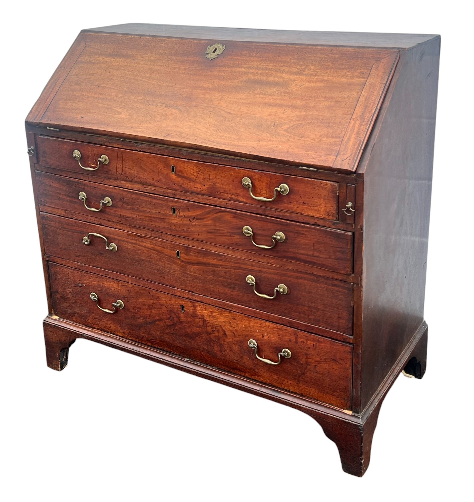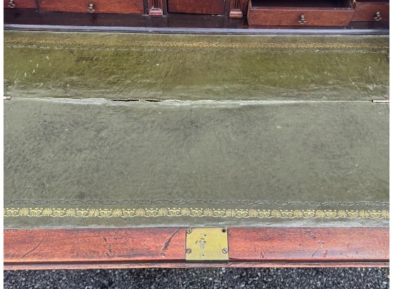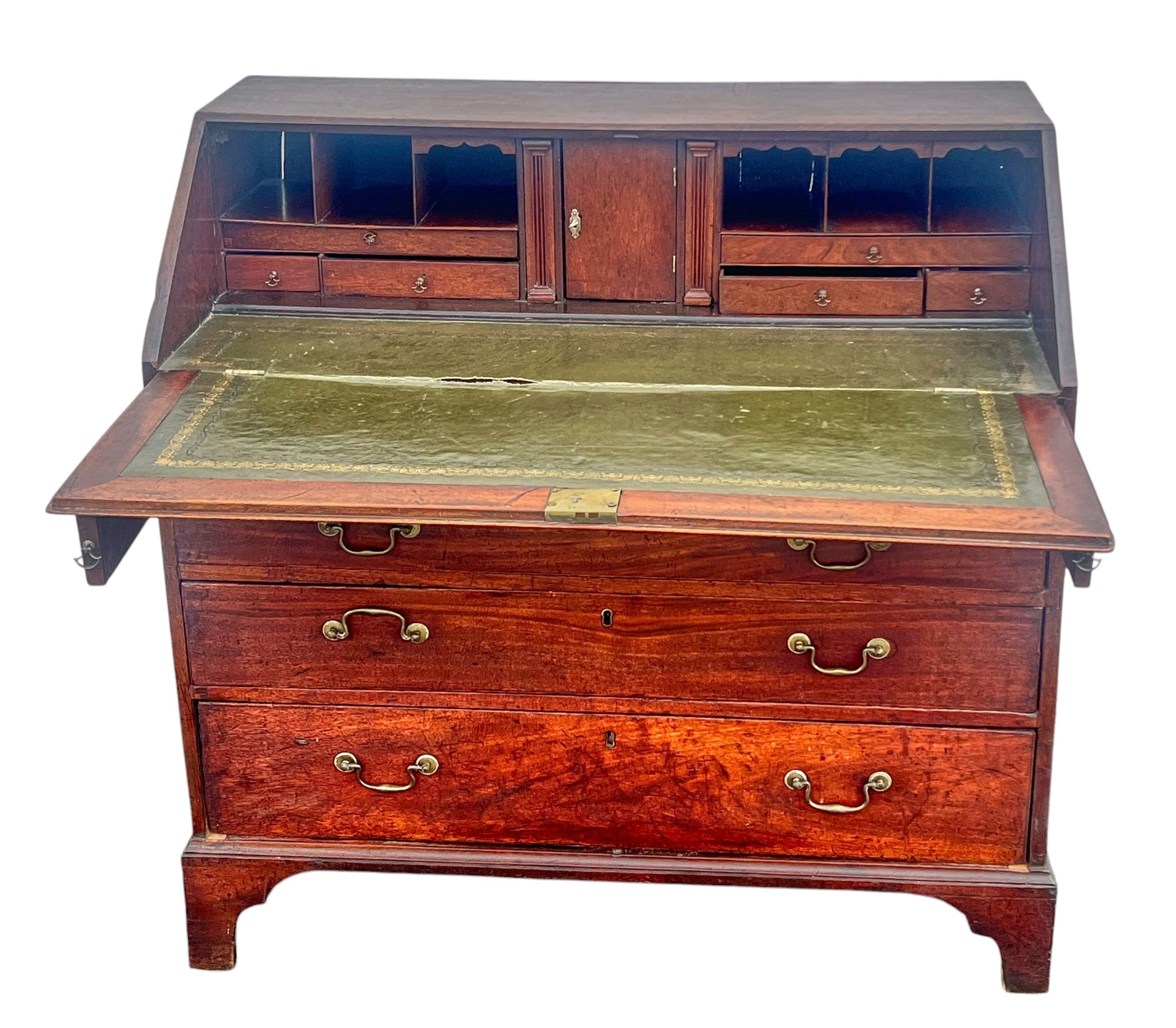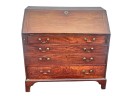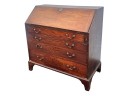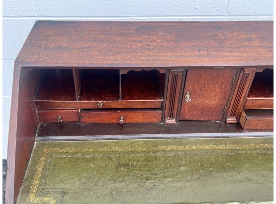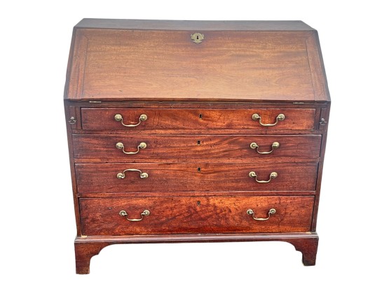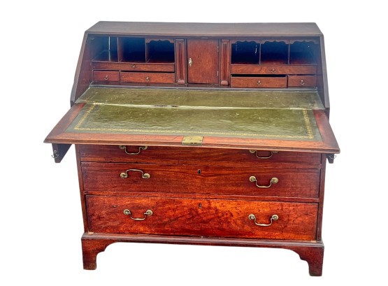 Fall front opens to a tooled leather writing surface, pigeon hole and document drawers over (4) graduating drawer and applied bracket feet. 41 x 43 x 21.5 inches Condition: Minor veneer loss Temp No 6059