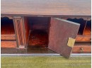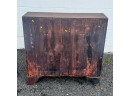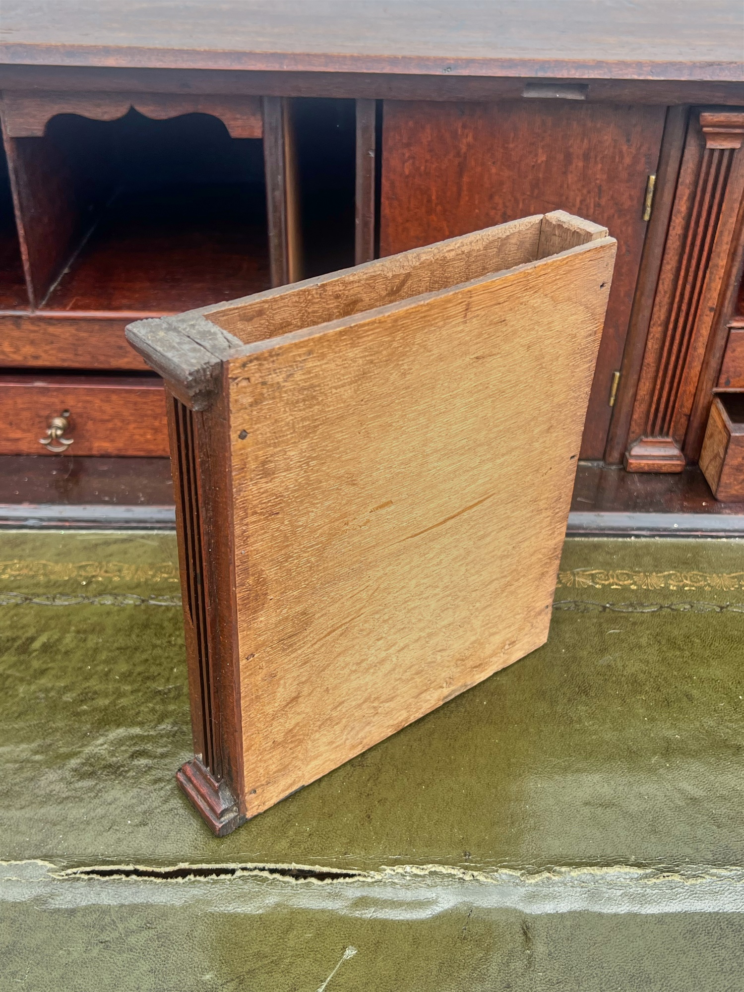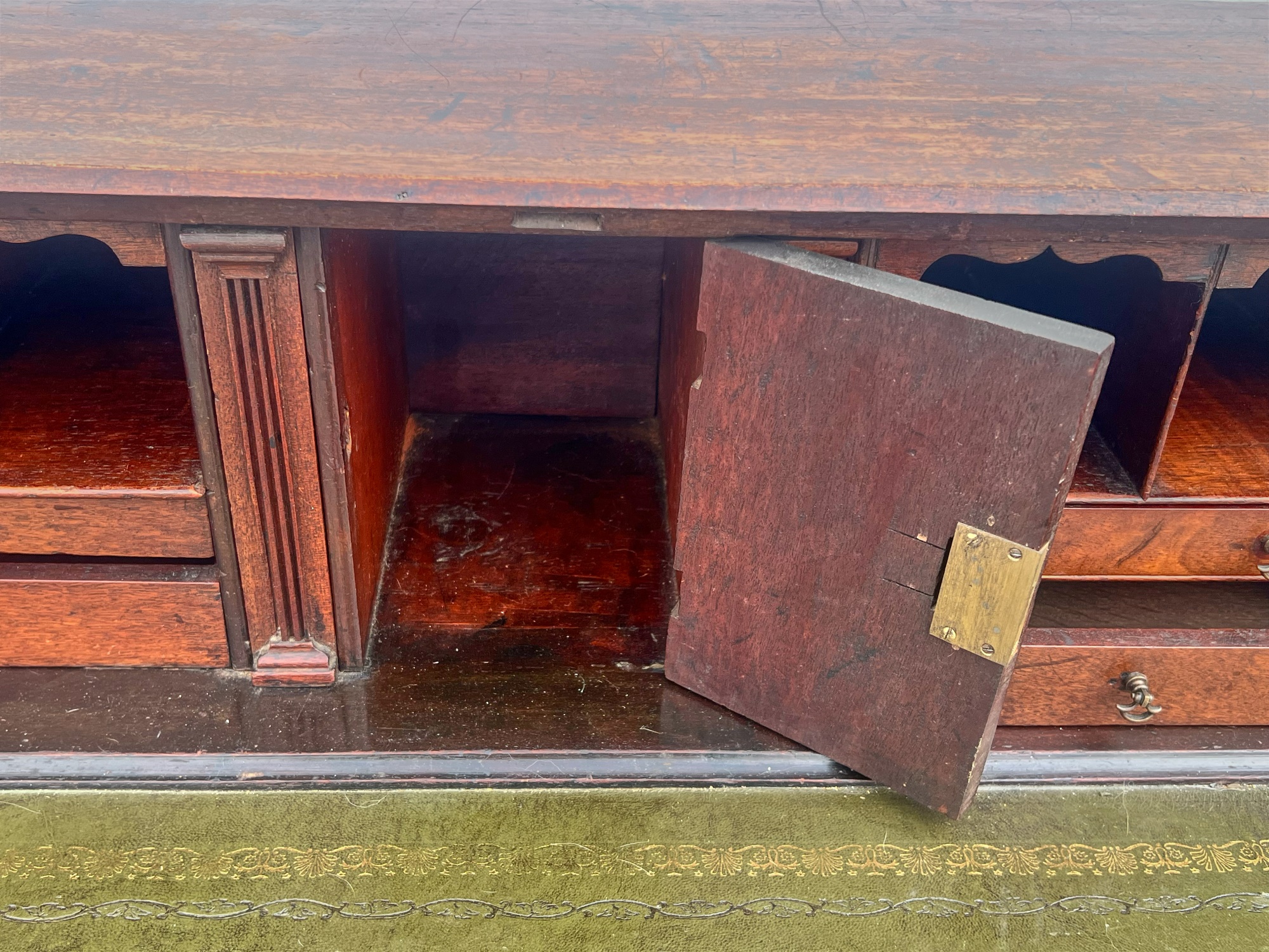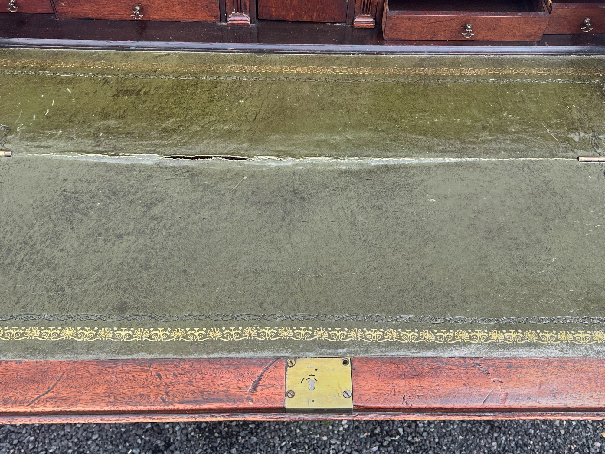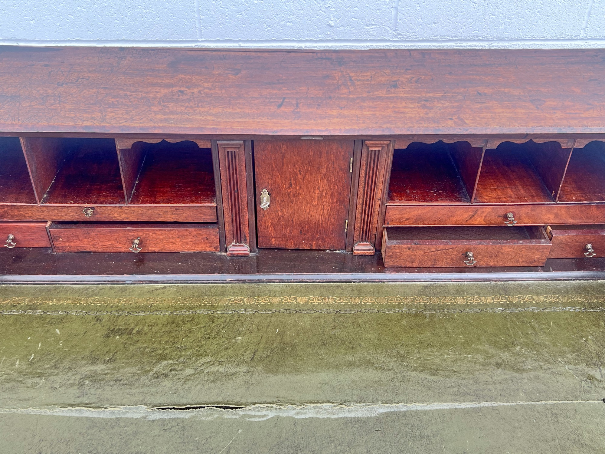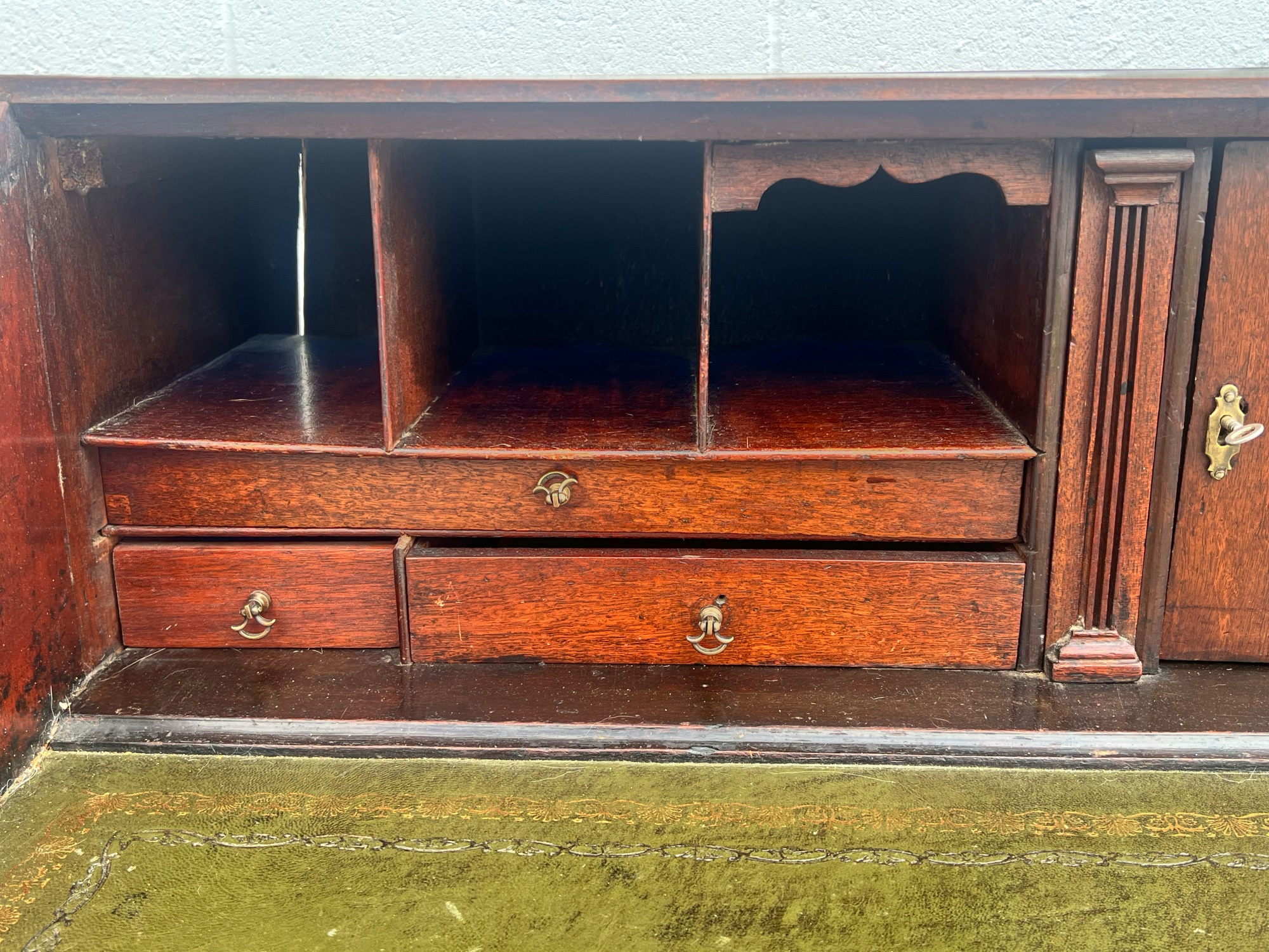 Fall front opens to a tooled leather writing surface, pigeon hole and document drawers over (4) graduating drawer and applied bracket feet. 41 x 43 x 21.5 inches Condition: Minor veneer loss Temp No 6059