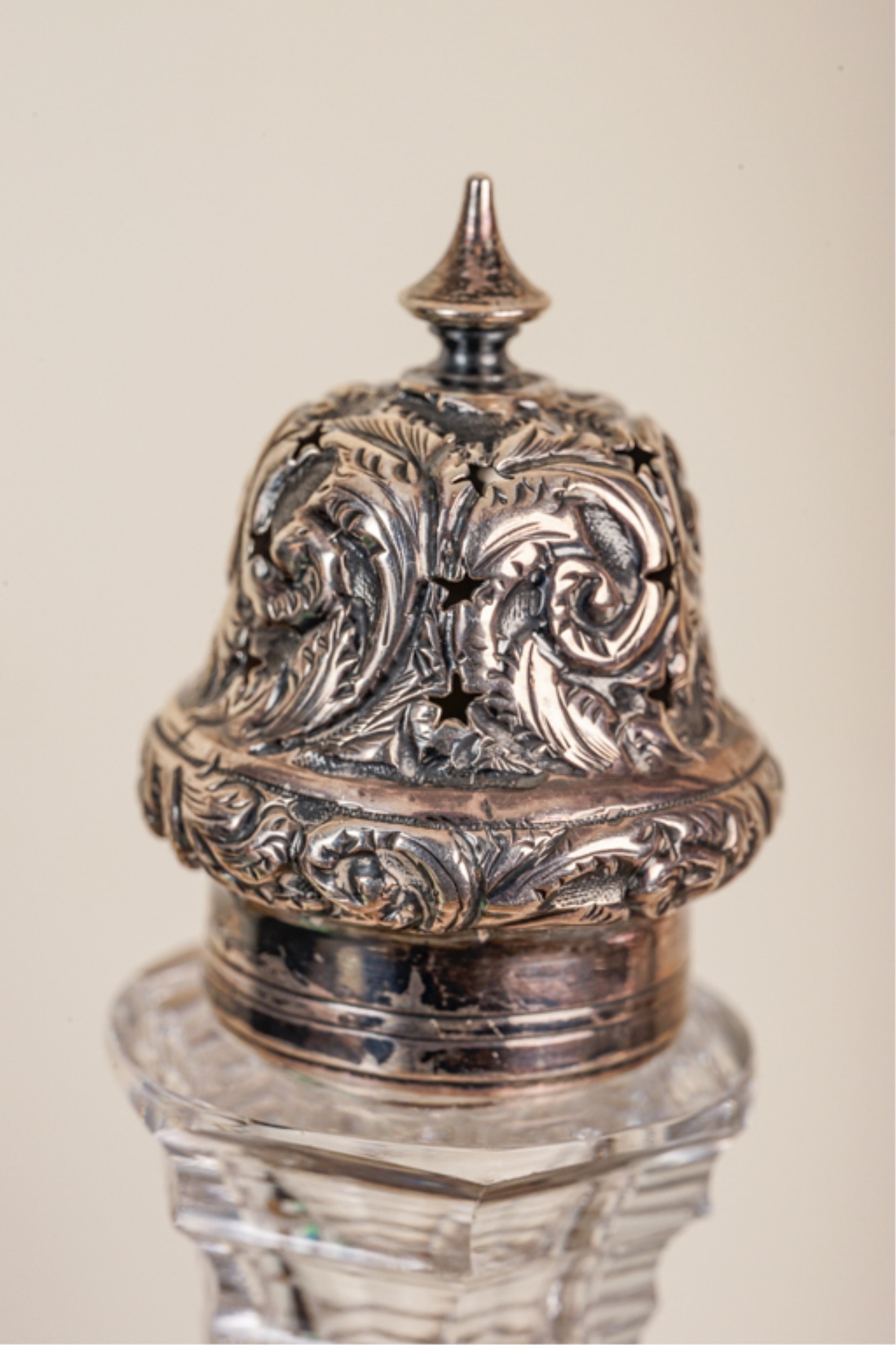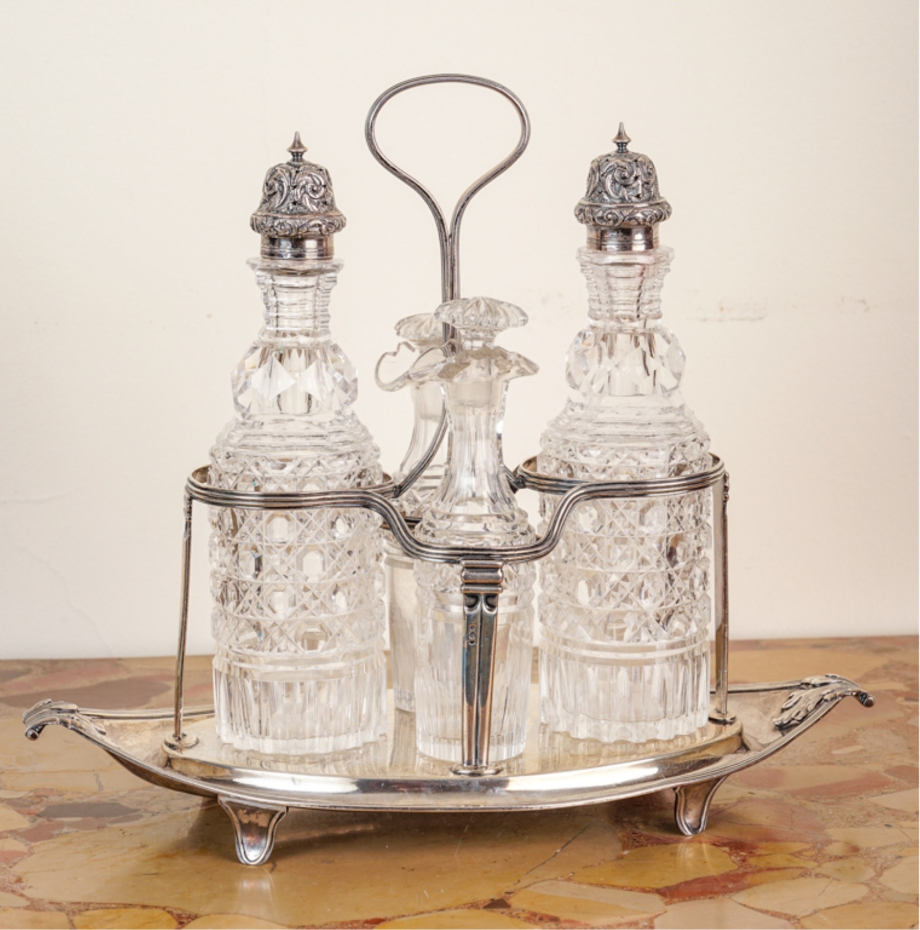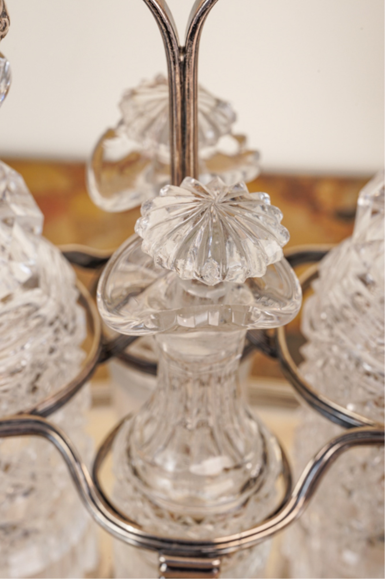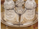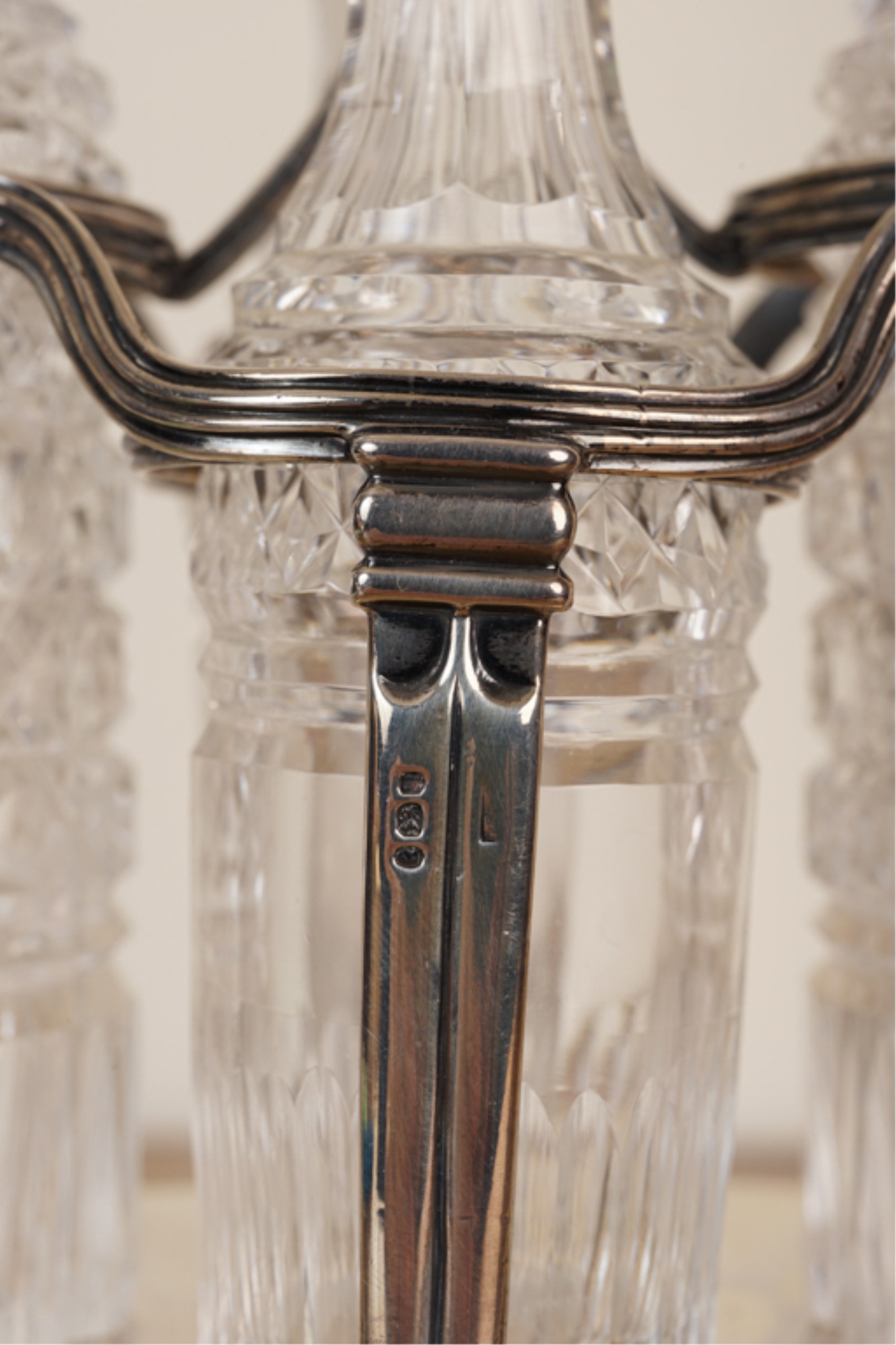With center armorial mark. (4) cut glass vessels, (2) with silver tops.