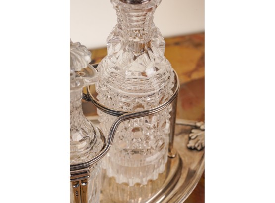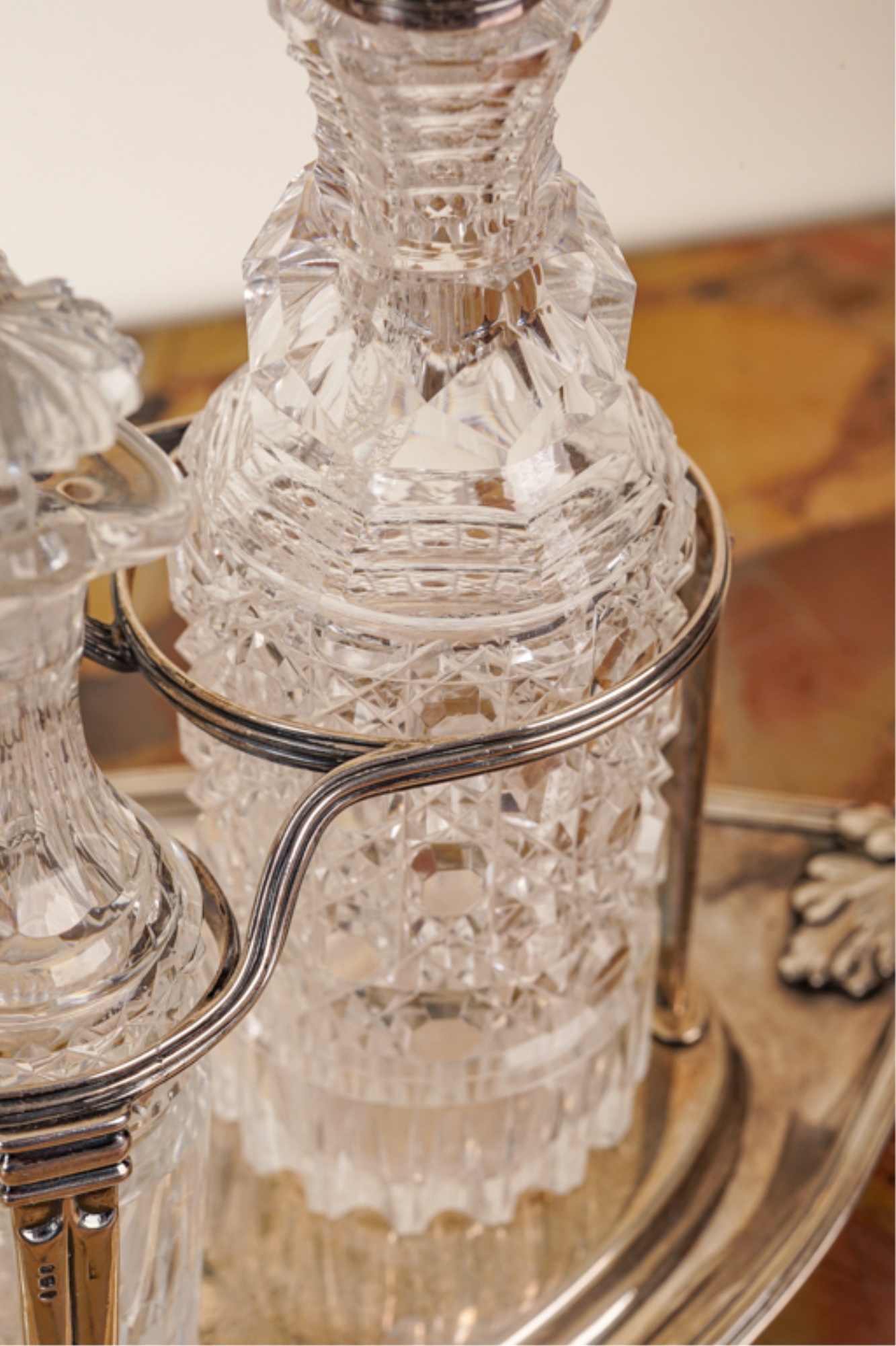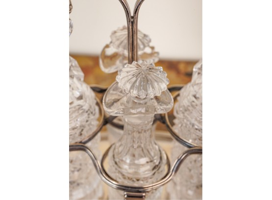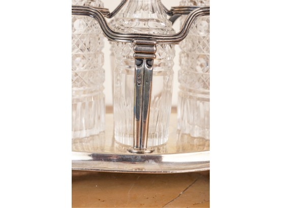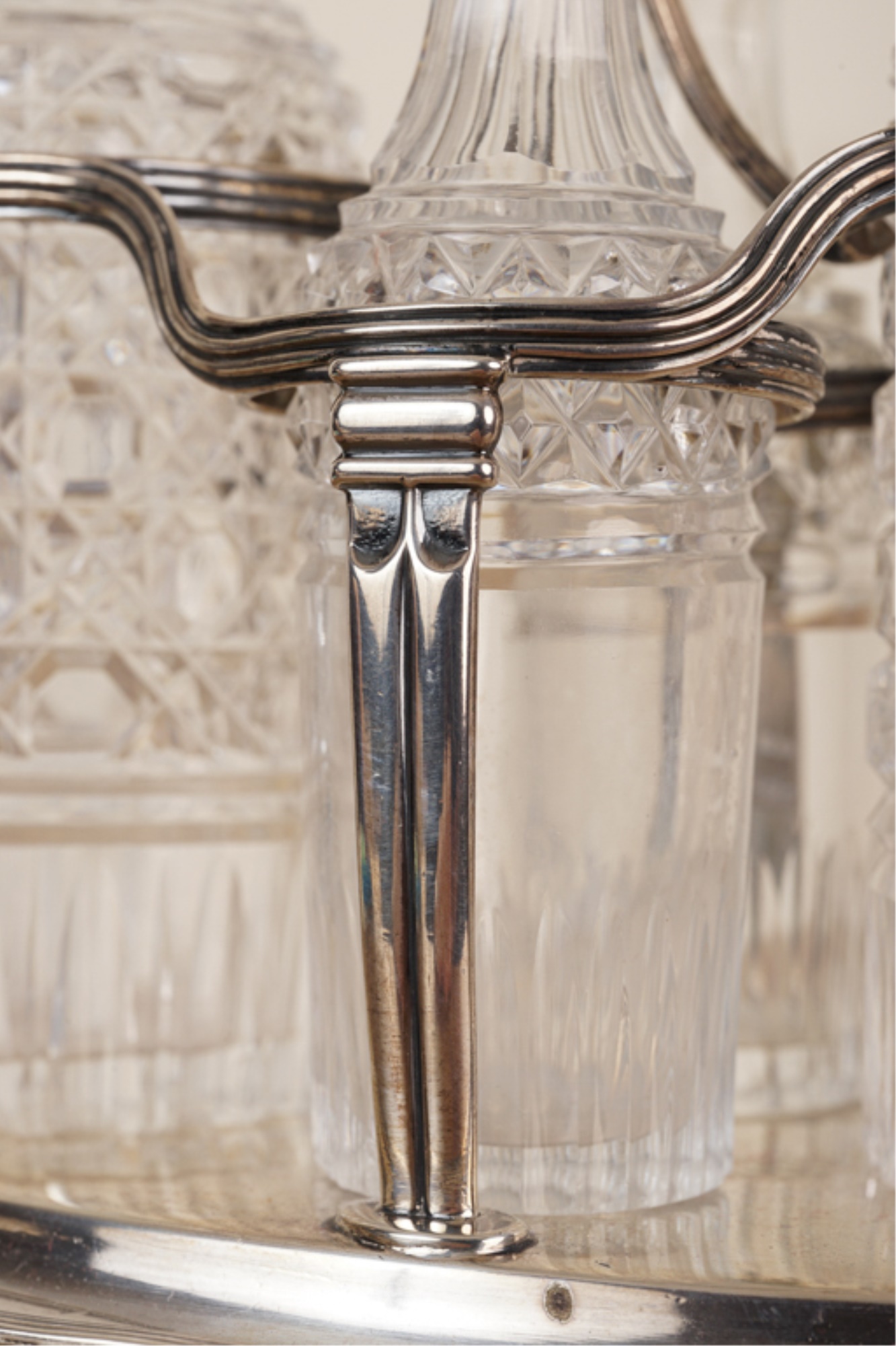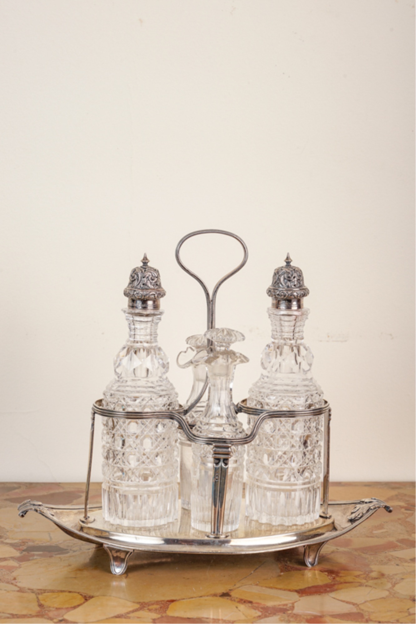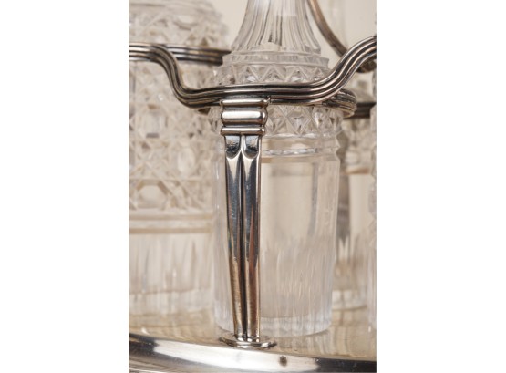 With center armorial mark. (4) cut glass vessels, (2) with silver tops.