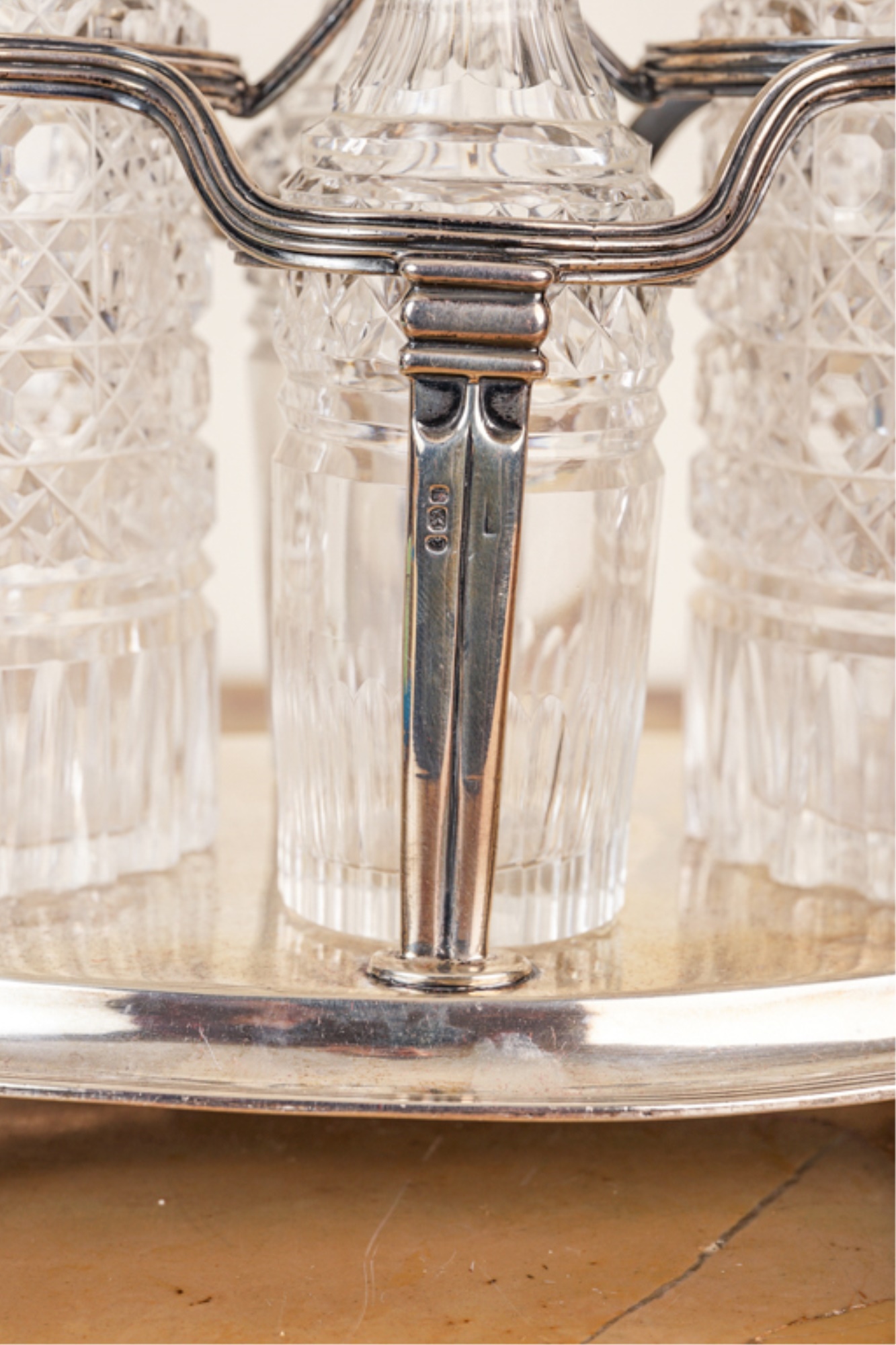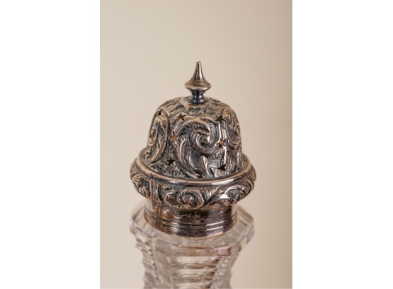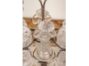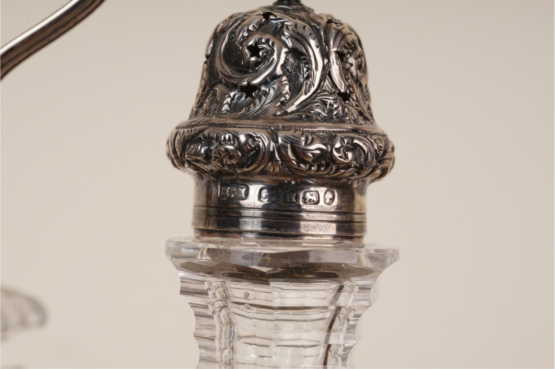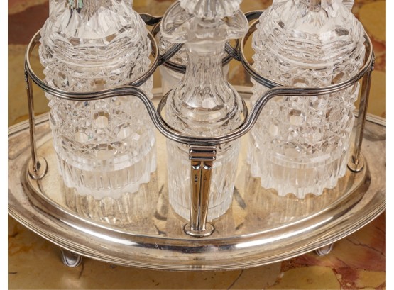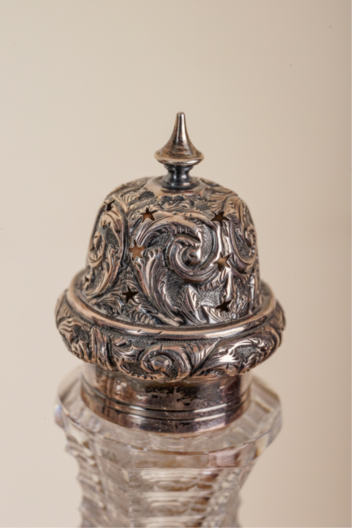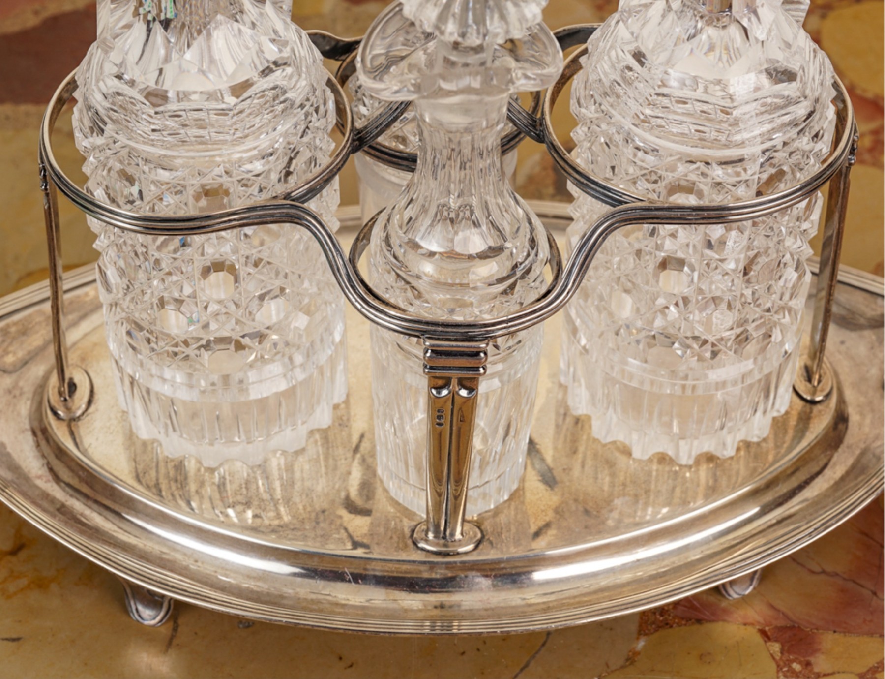 With center armorial mark. (4) cut glass vessels, (2) with silver tops.