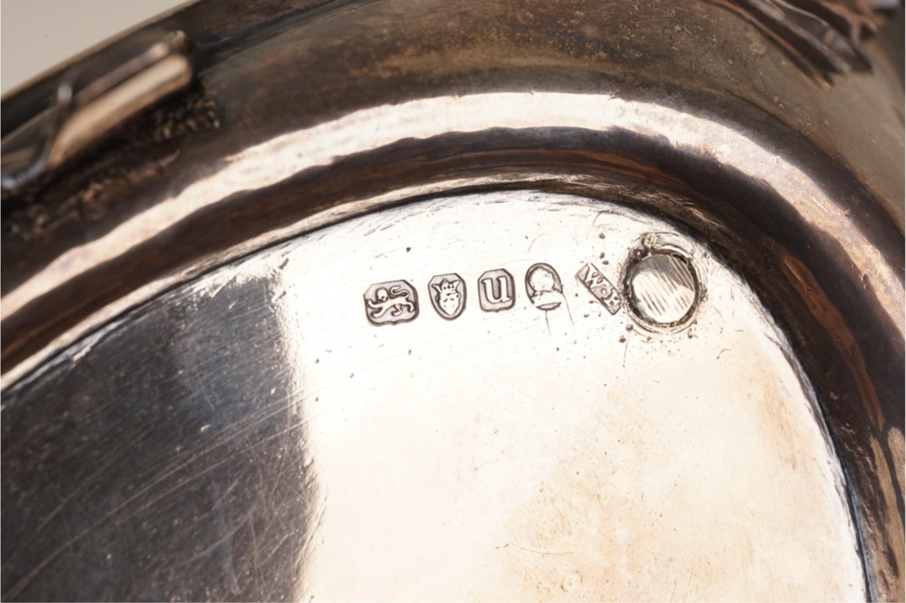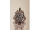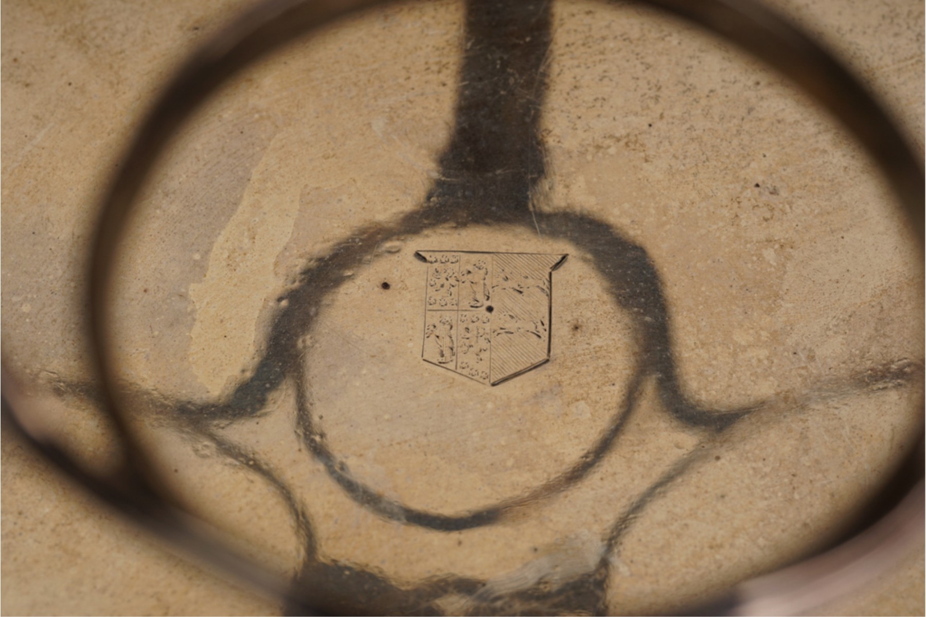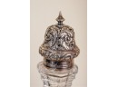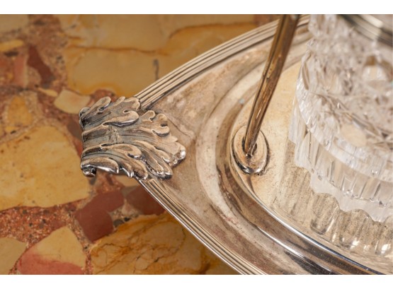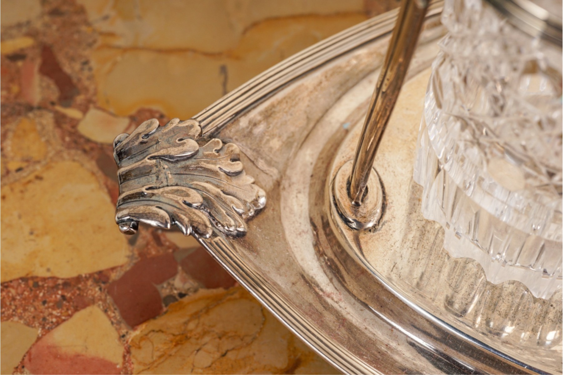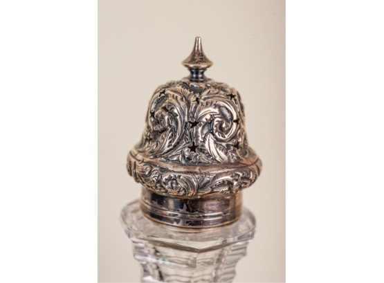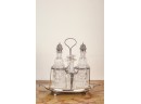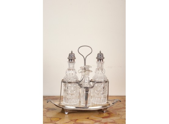 With center armorial mark. (4) cut glass vessels, (2) with silver tops.