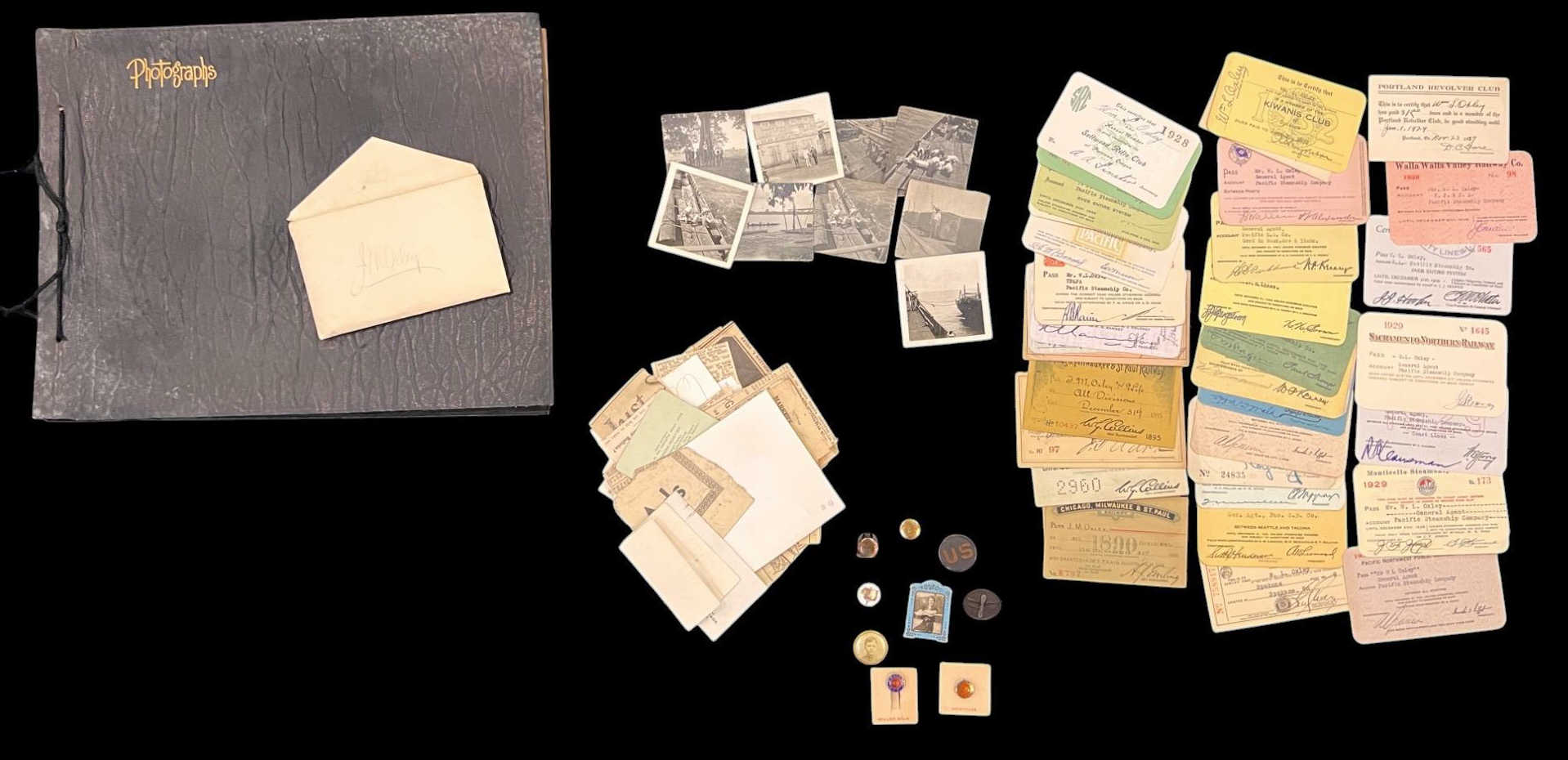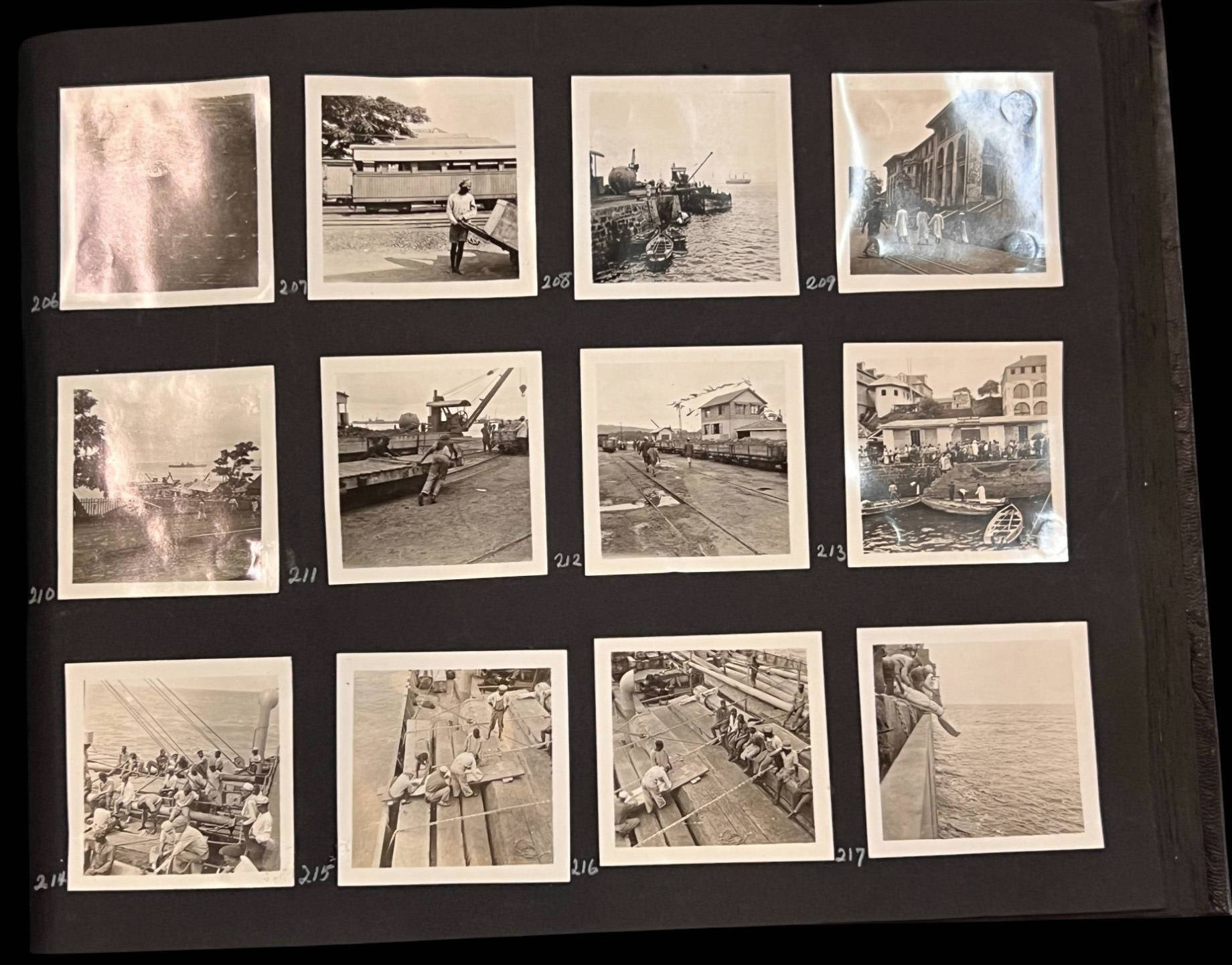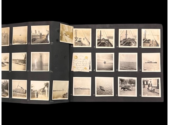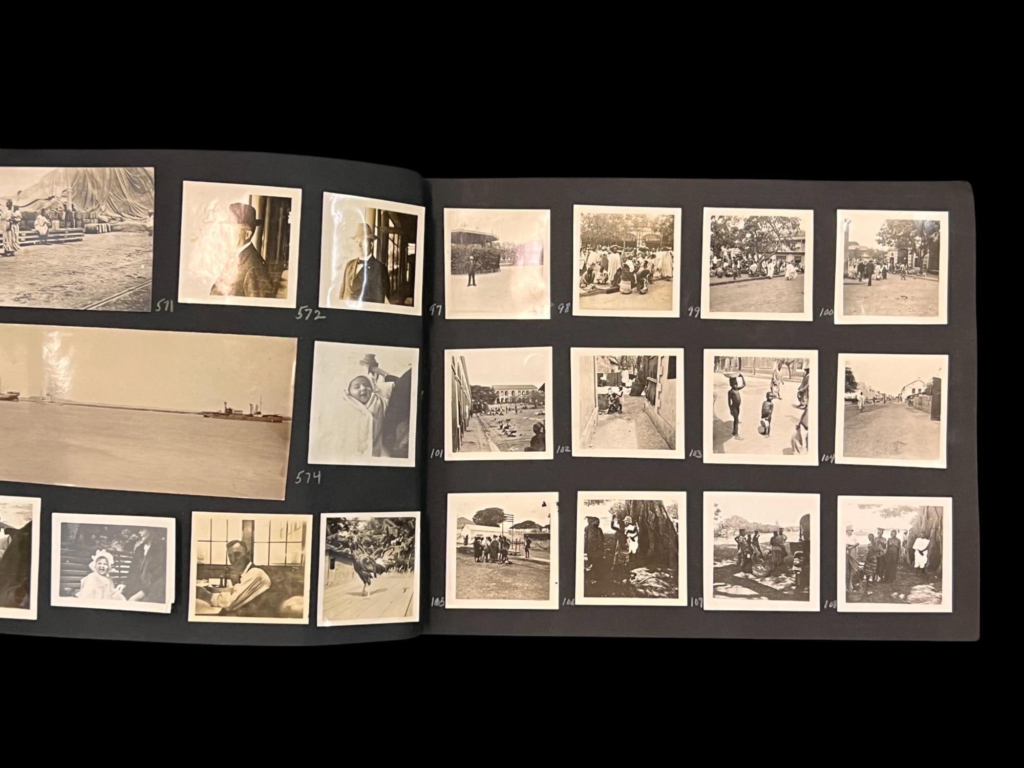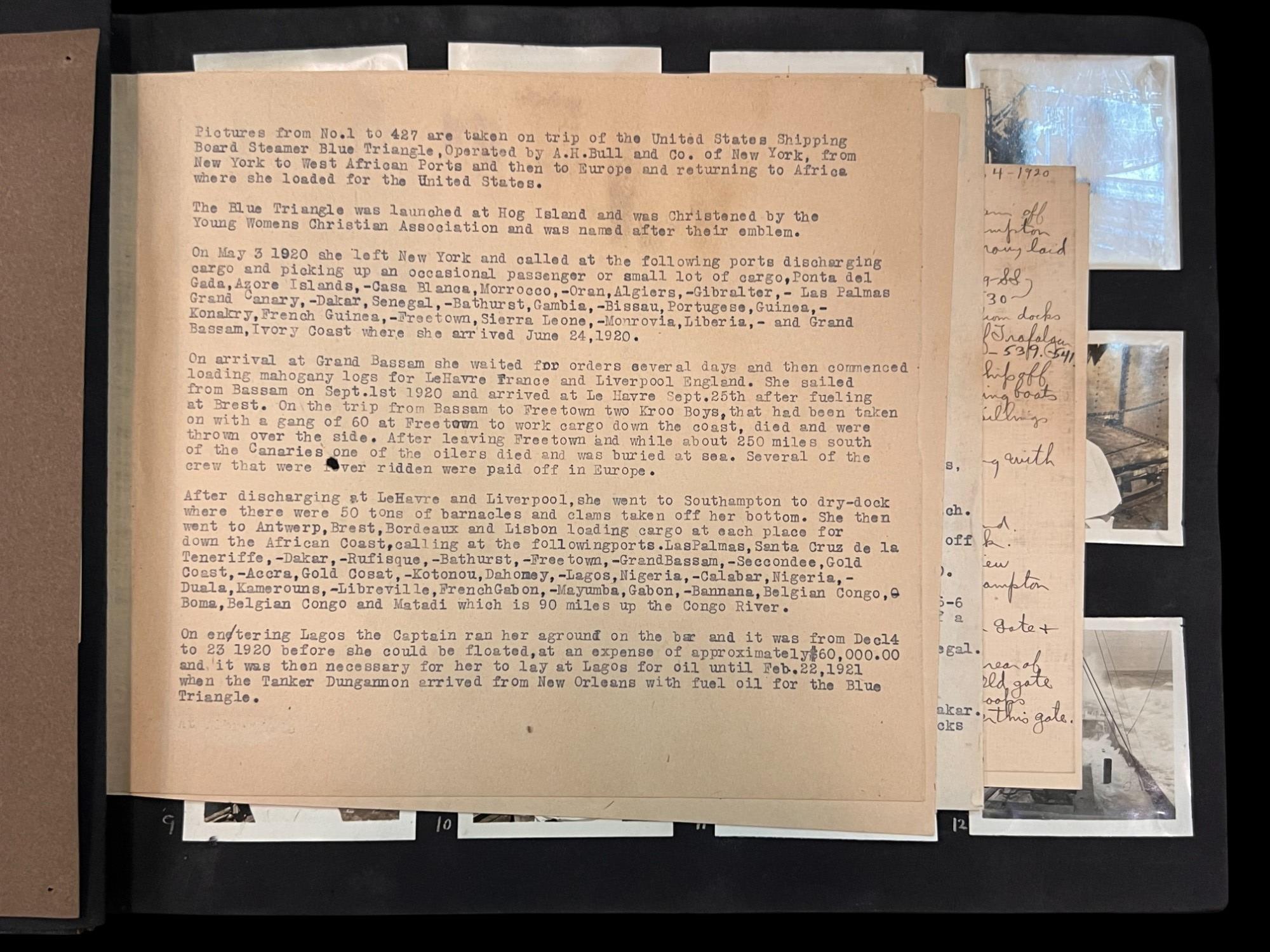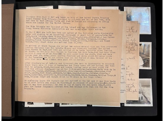 William L. Oxley, WWI Veteran, Rifleman. The lot is consisting of a very well documented trip photo album from a journey on the United States Shipping Board Steamer, Blue Triangle, operated by A. H. Bull & Co of New York. This album has a typed account with 427 photos each numbered with accompanying ledger of details, noted are ports from New York to West Africa, then to Europe, returning to Africa where she was loaded for the United States. There is an accounts and pictures of cargo loading, natives of African ports, as well as other photos of crew, time of leisure, sharpshooting and more. Besides running aground, a very interesting 1920 documented 26,000 trip. In addition, there are a few military buttons, WWII US & Army Aviation collar discs, a few pins, etc. a lot of over 40 Railroad and steamer passes, photos etc.