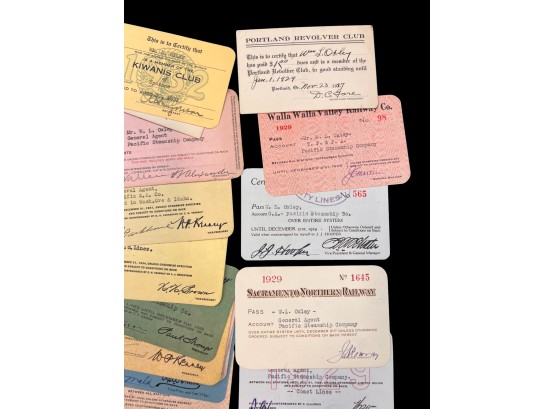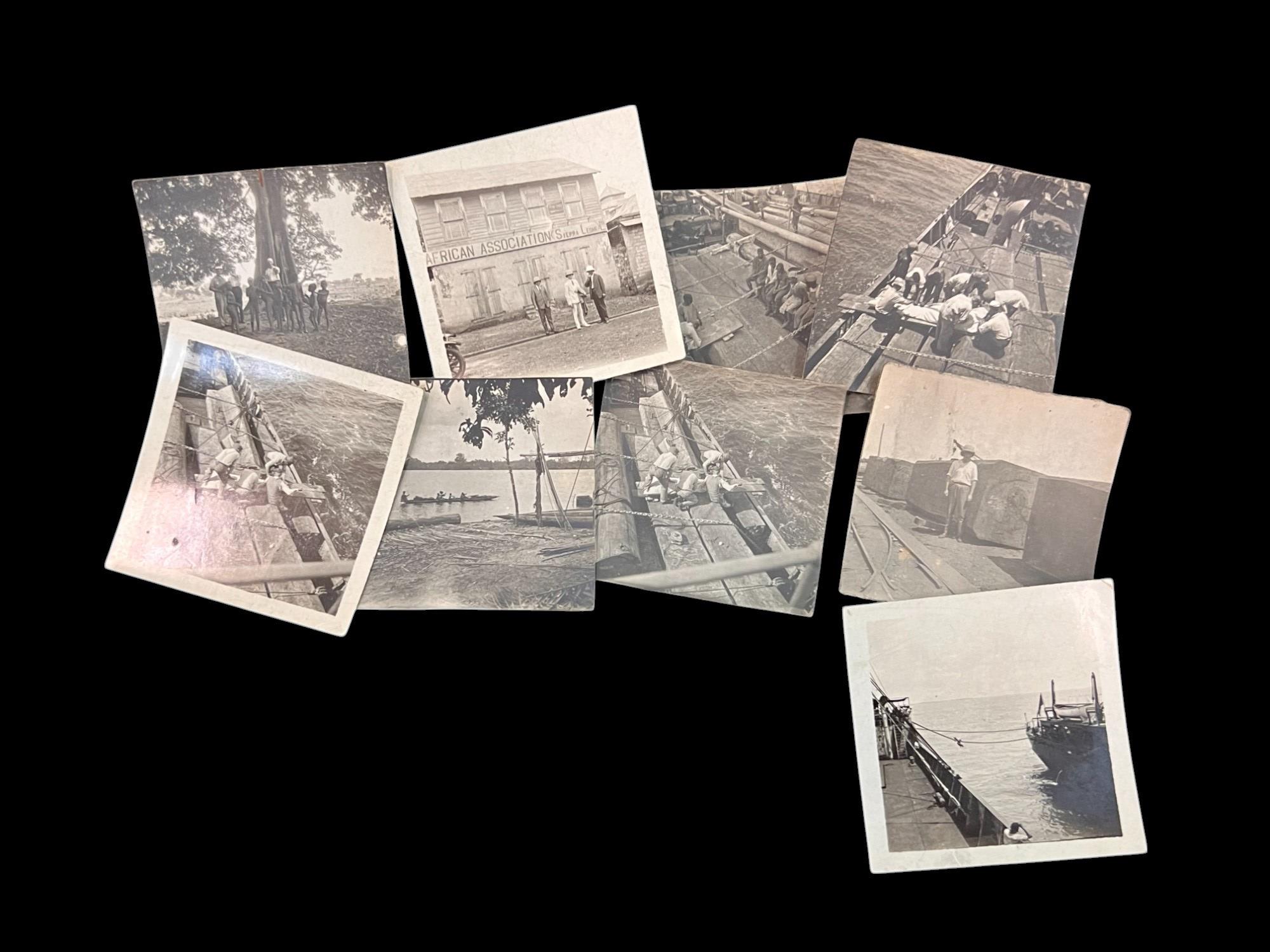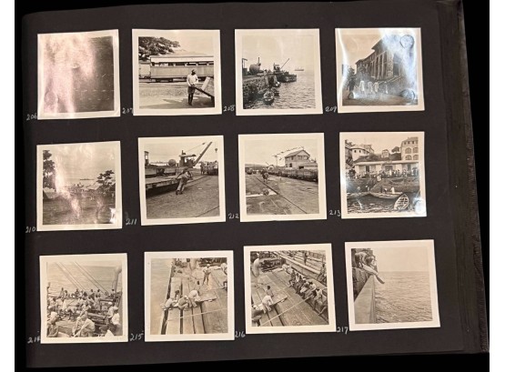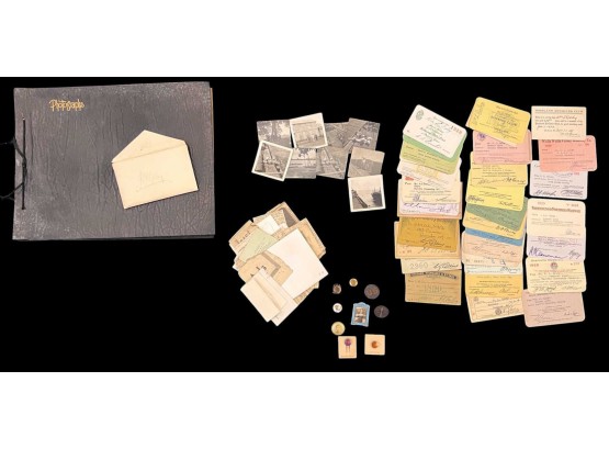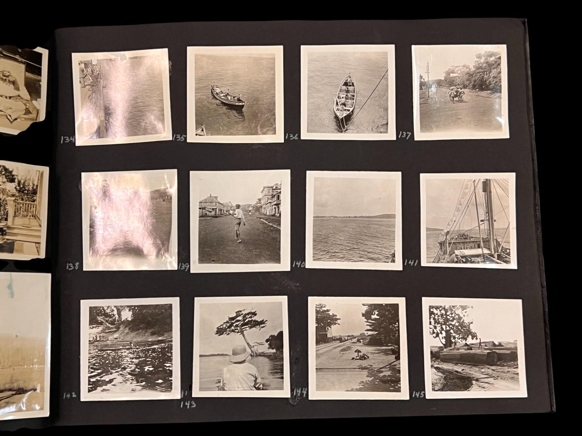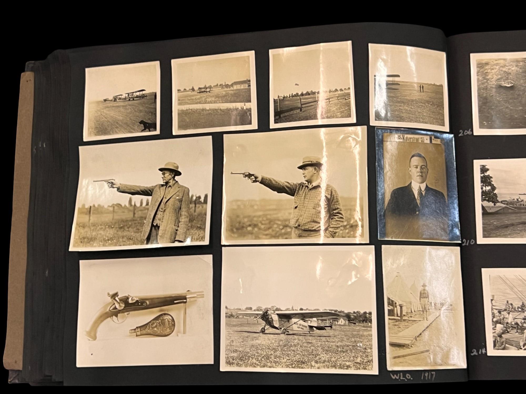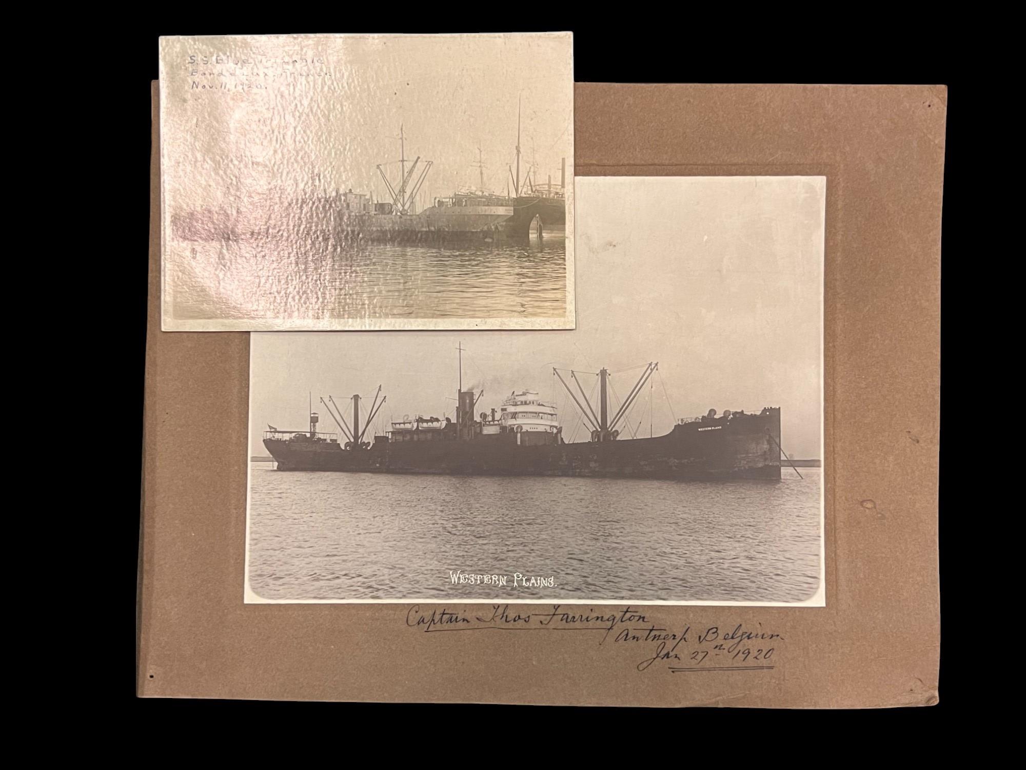 William L. Oxley, WWI Veteran, Rifleman. The lot is consisting of a very well documented trip photo album from a journey on the United States Shipping Board Steamer, Blue Triangle, operated by A. H. Bull & Co of New York. This album has a typed account with 427 photos each numbered with accompanying ledger of details, noted are ports from New York to West Africa, then to Europe, returning to Africa where she was loaded for the United States. There is an accounts and pictures of cargo loading, natives of African ports, as well as other photos of crew, time of leisure, sharpshooting and more. Besides running aground, a very interesting 1920 documented 26,000 trip. In addition, there are a few military buttons, WWII US & Army Aviation collar discs, a few pins, etc. a lot of over 40 Railroad and steamer passes, photos etc.