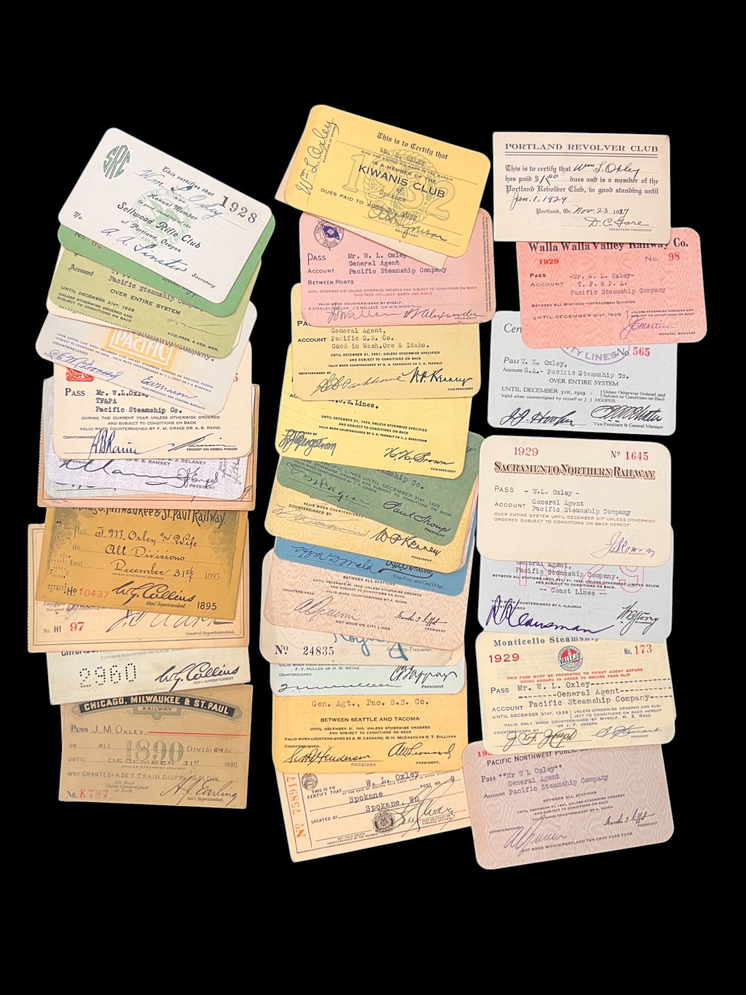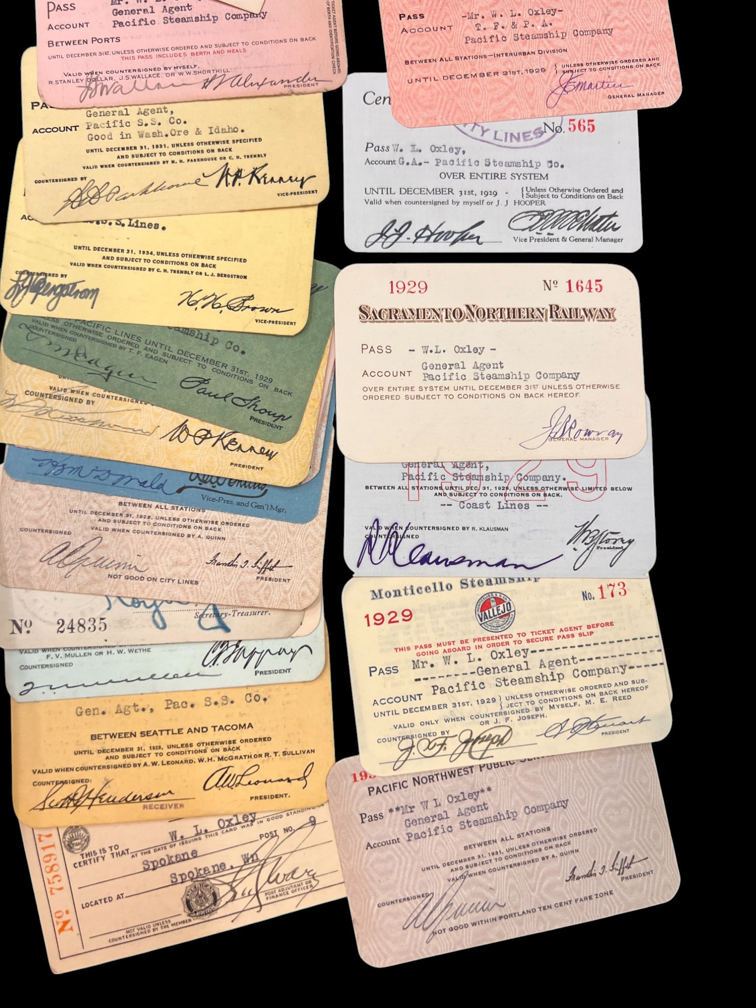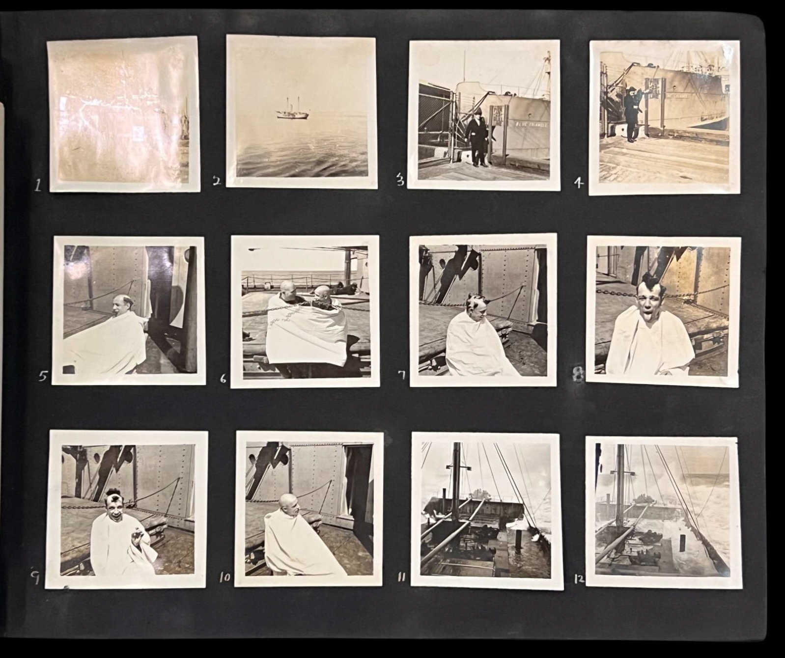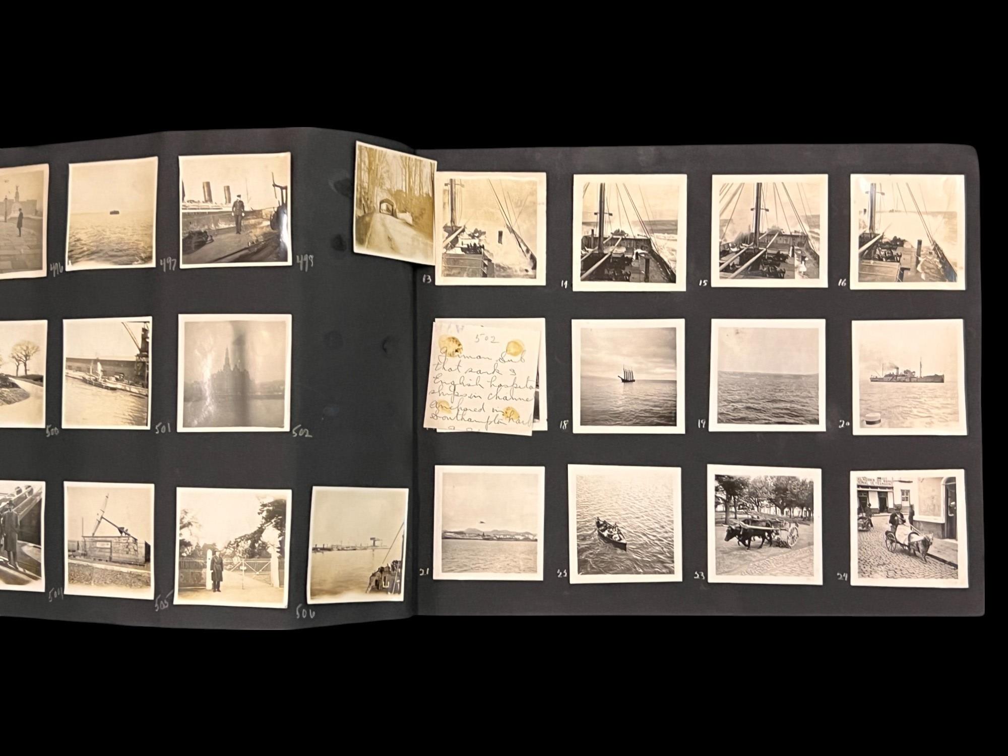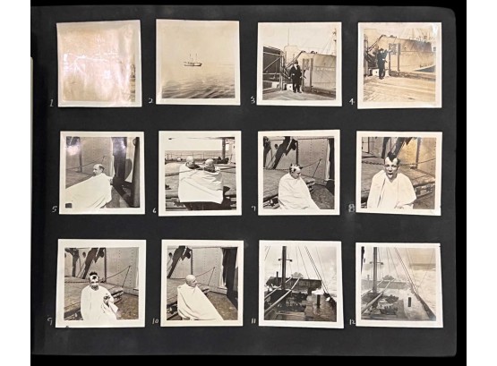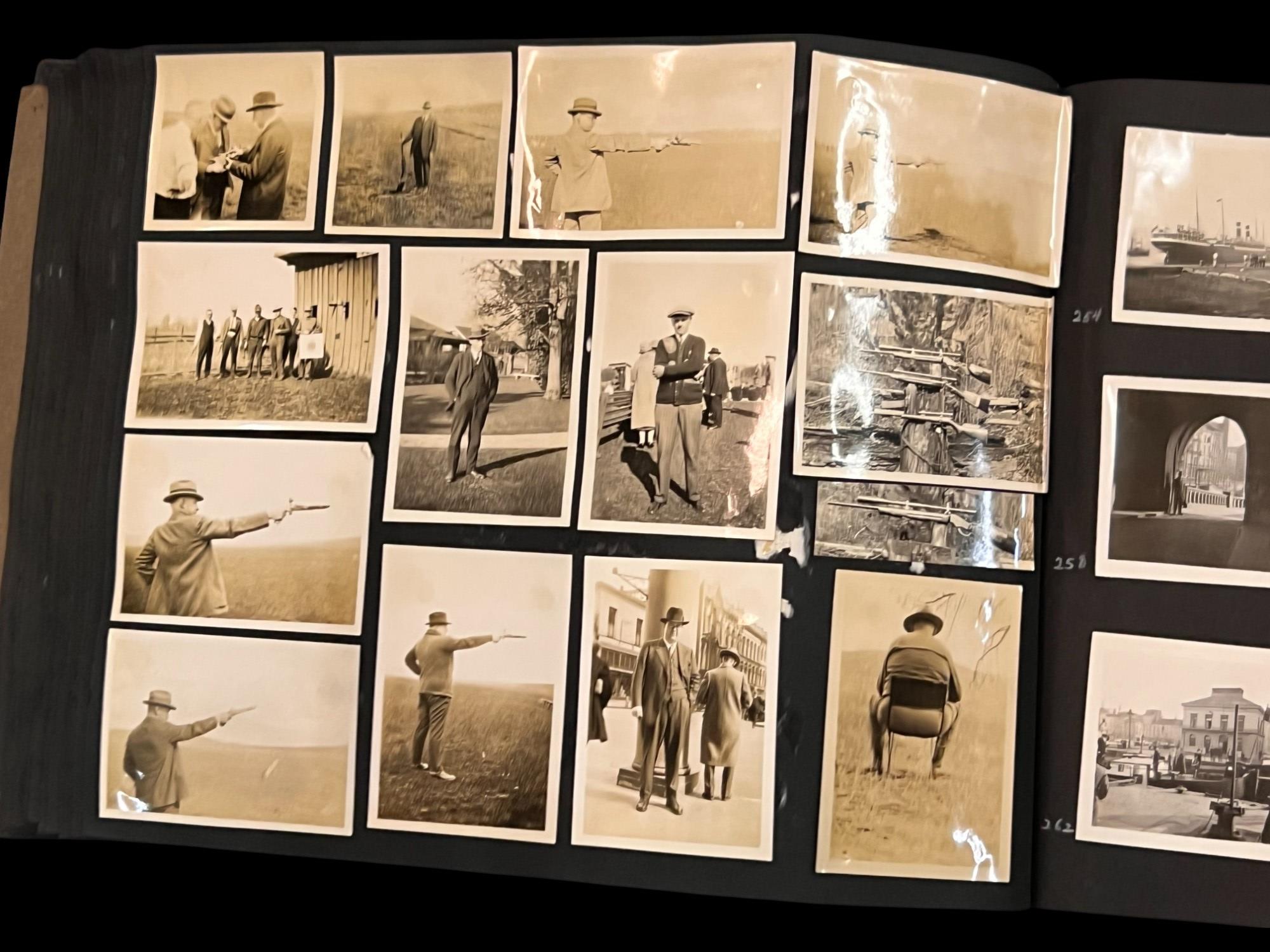 William L. Oxley, WWI Veteran, Rifleman. The lot is consisting of a very well documented trip photo album from a journey on the United States Shipping Board Steamer, Blue Triangle, operated by A. H. Bull & Co of New York. This album has a typed account with 427 photos each numbered with accompanying ledger of details, noted are ports from New York to West Africa, then to Europe, returning to Africa where she was loaded for the United States. There is an accounts and pictures of cargo loading, natives of African ports, as well as other photos of crew, time of leisure, sharpshooting and more. Besides running aground, a very interesting 1920 documented 26,000 trip. In addition, there are a few military buttons, WWII US & Army Aviation collar discs, a few pins, etc. a lot of over 40 Railroad and steamer passes, photos etc.