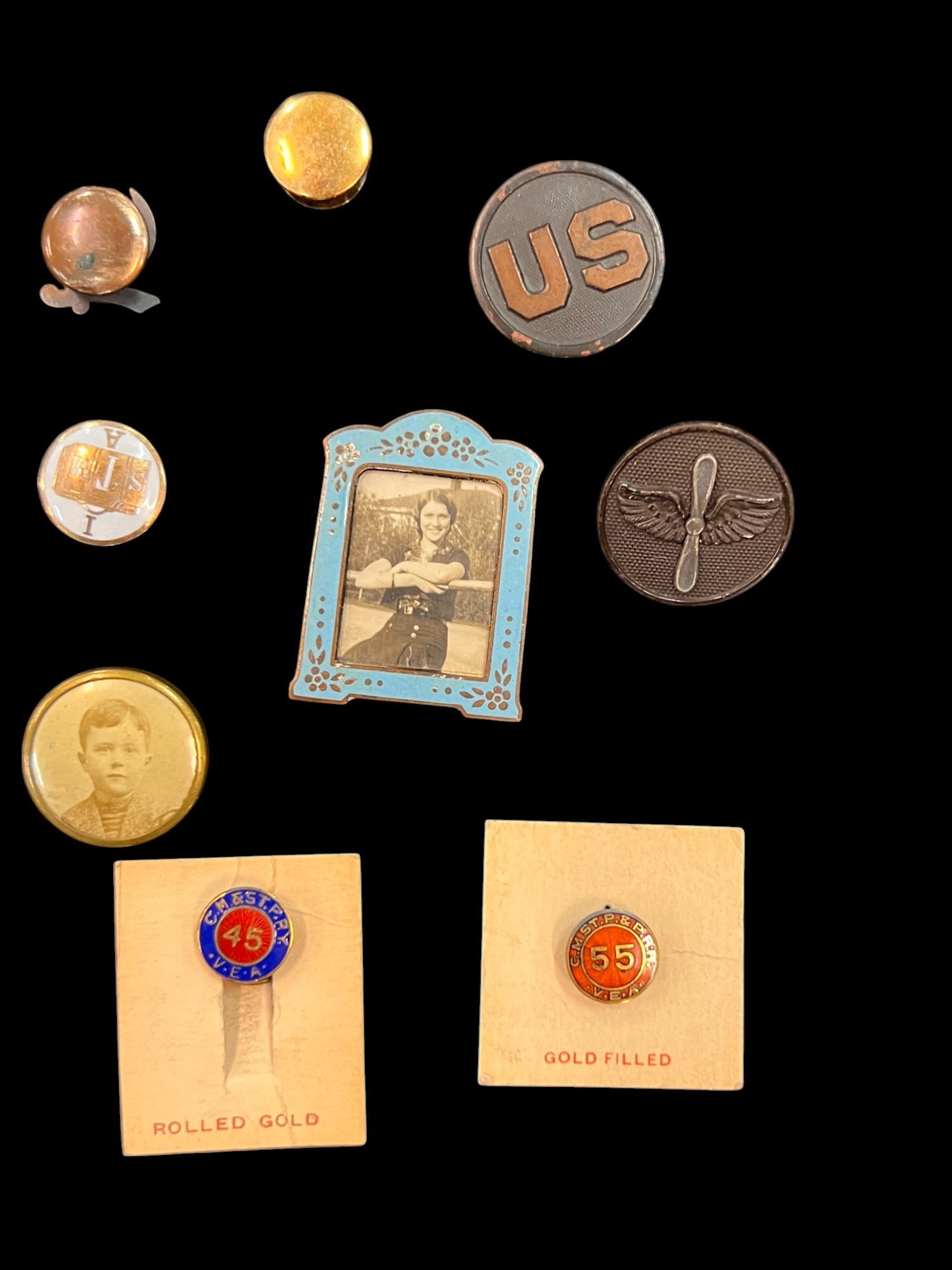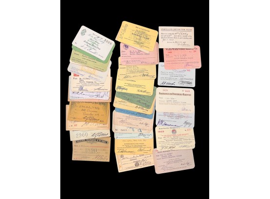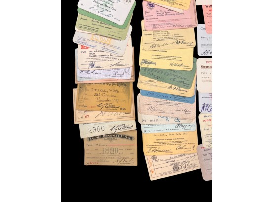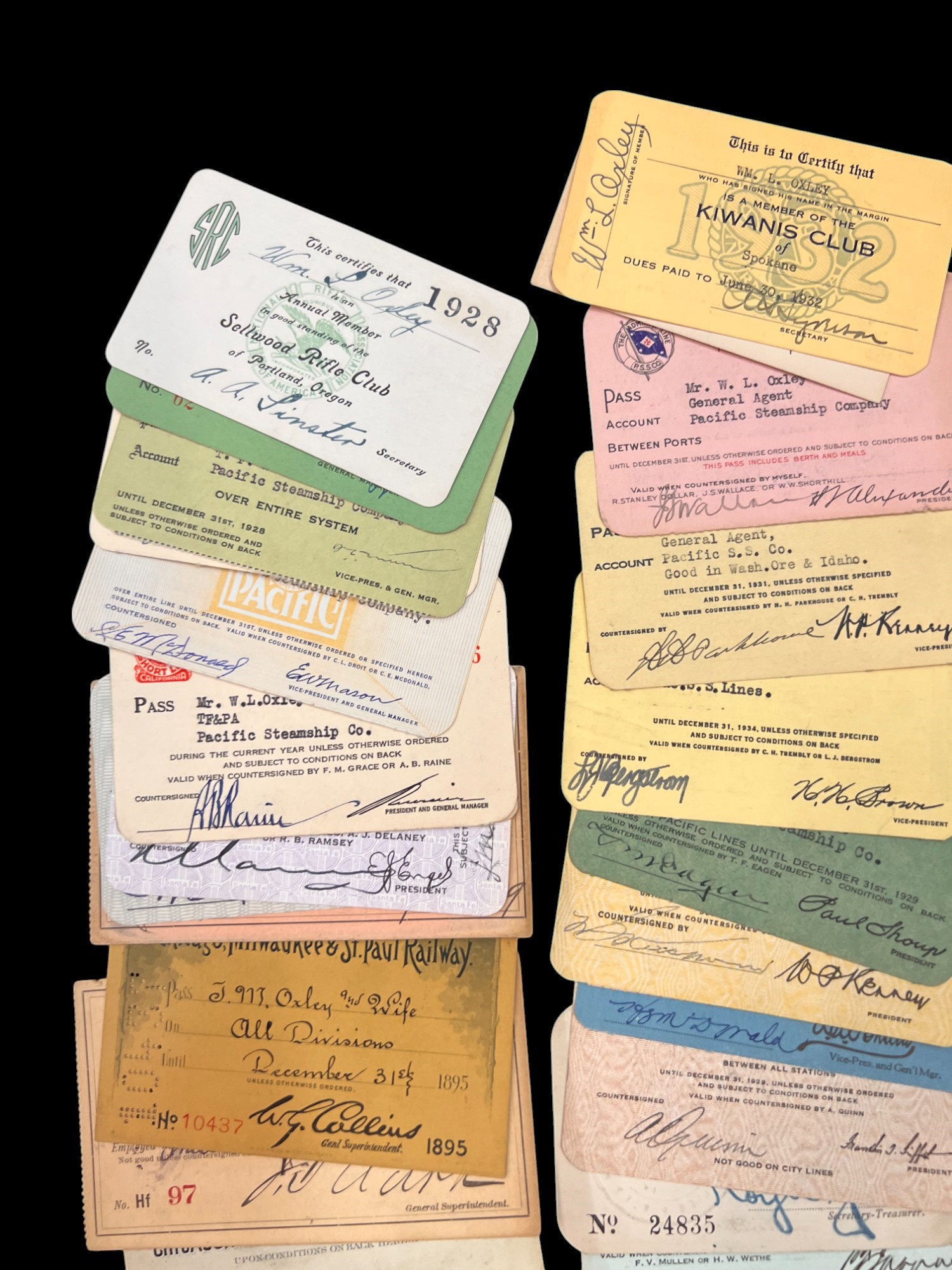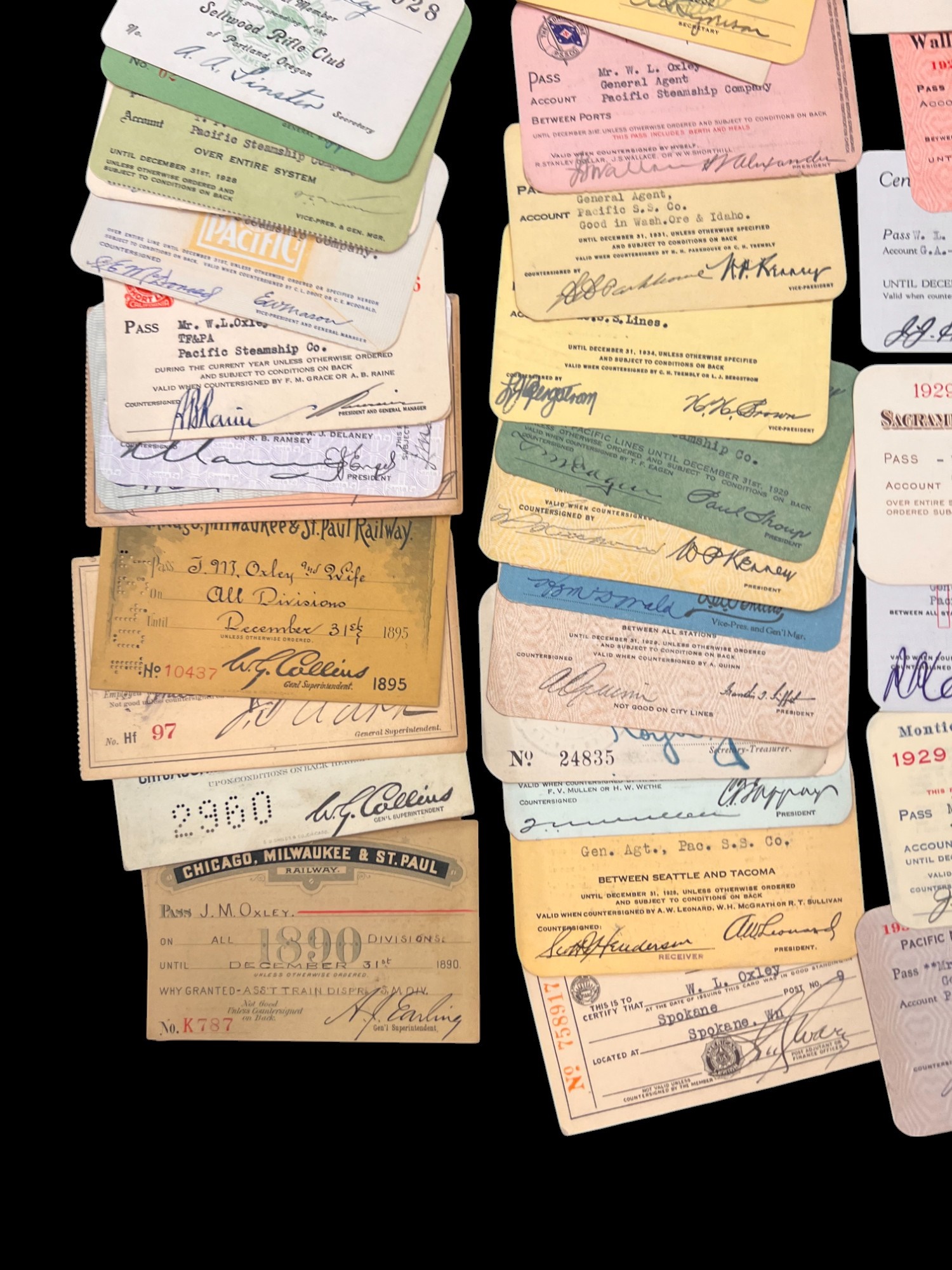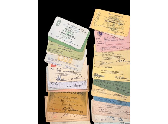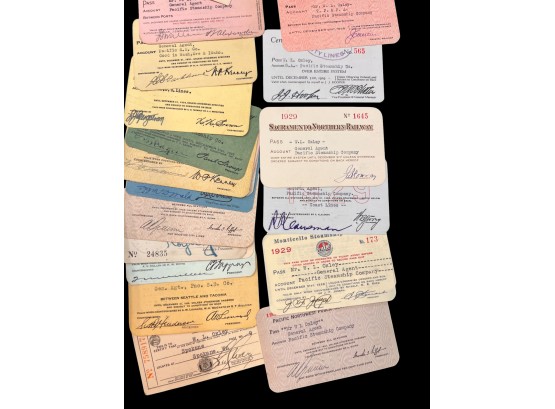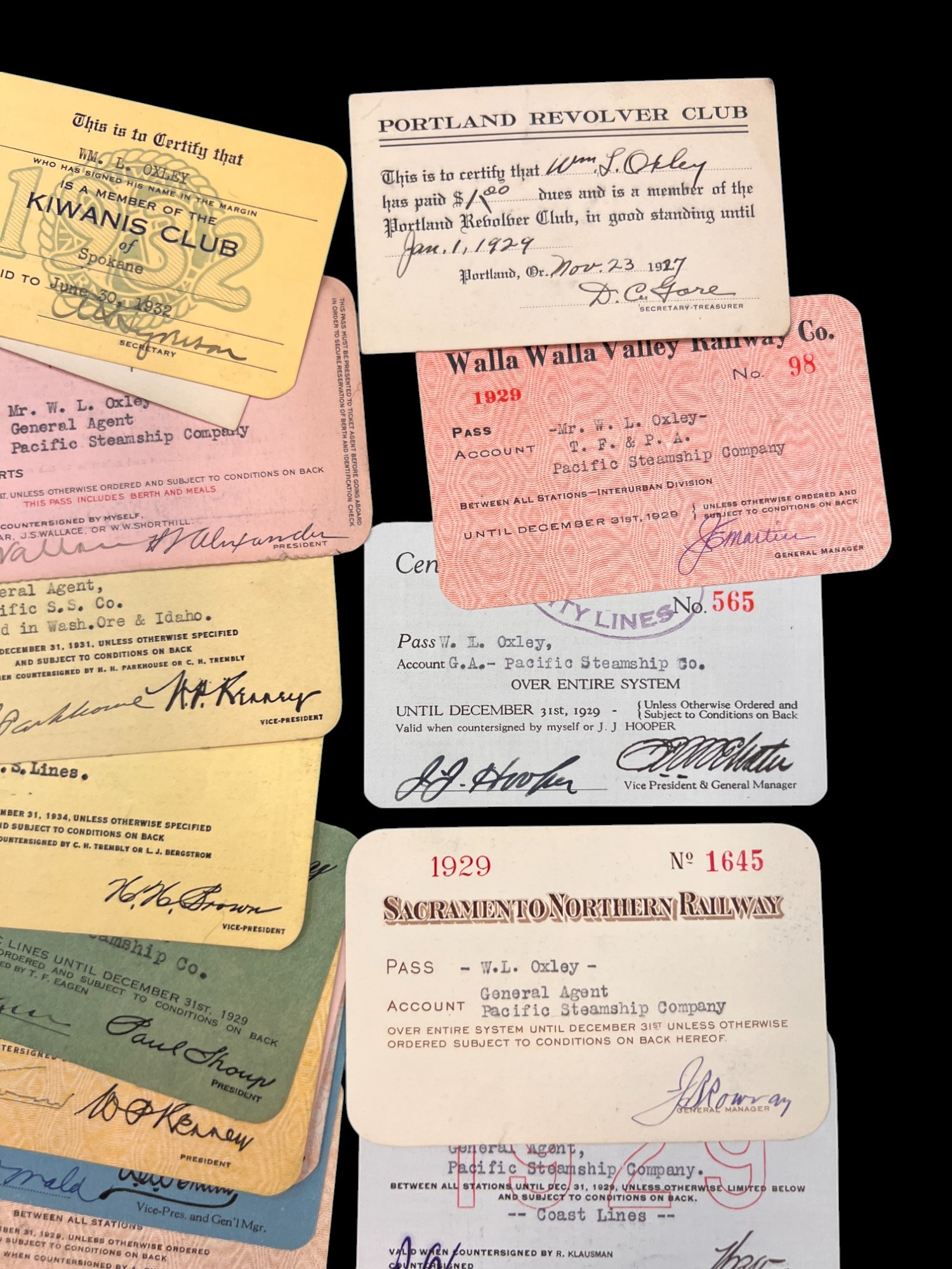 William L. Oxley, WWI Veteran, Rifleman. The lot is consisting of a very well documented trip photo album from a journey on the United States Shipping Board Steamer, Blue Triangle, operated by A. H. Bull & Co of New York. This album has a typed account with 427 photos each numbered with accompanying ledger of details, noted are ports from New York to West Africa, then to Europe, returning to Africa where she was loaded for the United States. There is an accounts and pictures of cargo loading, natives of African ports, as well as other photos of crew, time of leisure, sharpshooting and more. Besides running aground, a very interesting 1920 documented 26,000 trip. In addition, there are a few military buttons, WWII US & Army Aviation collar discs, a few pins, etc. a lot of over 40 Railroad and steamer passes, photos etc.