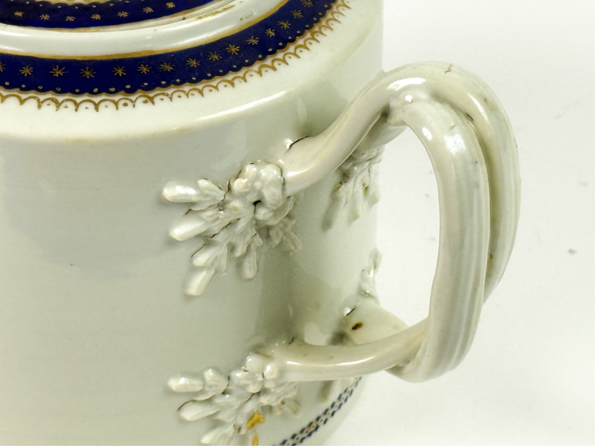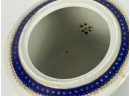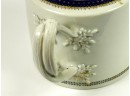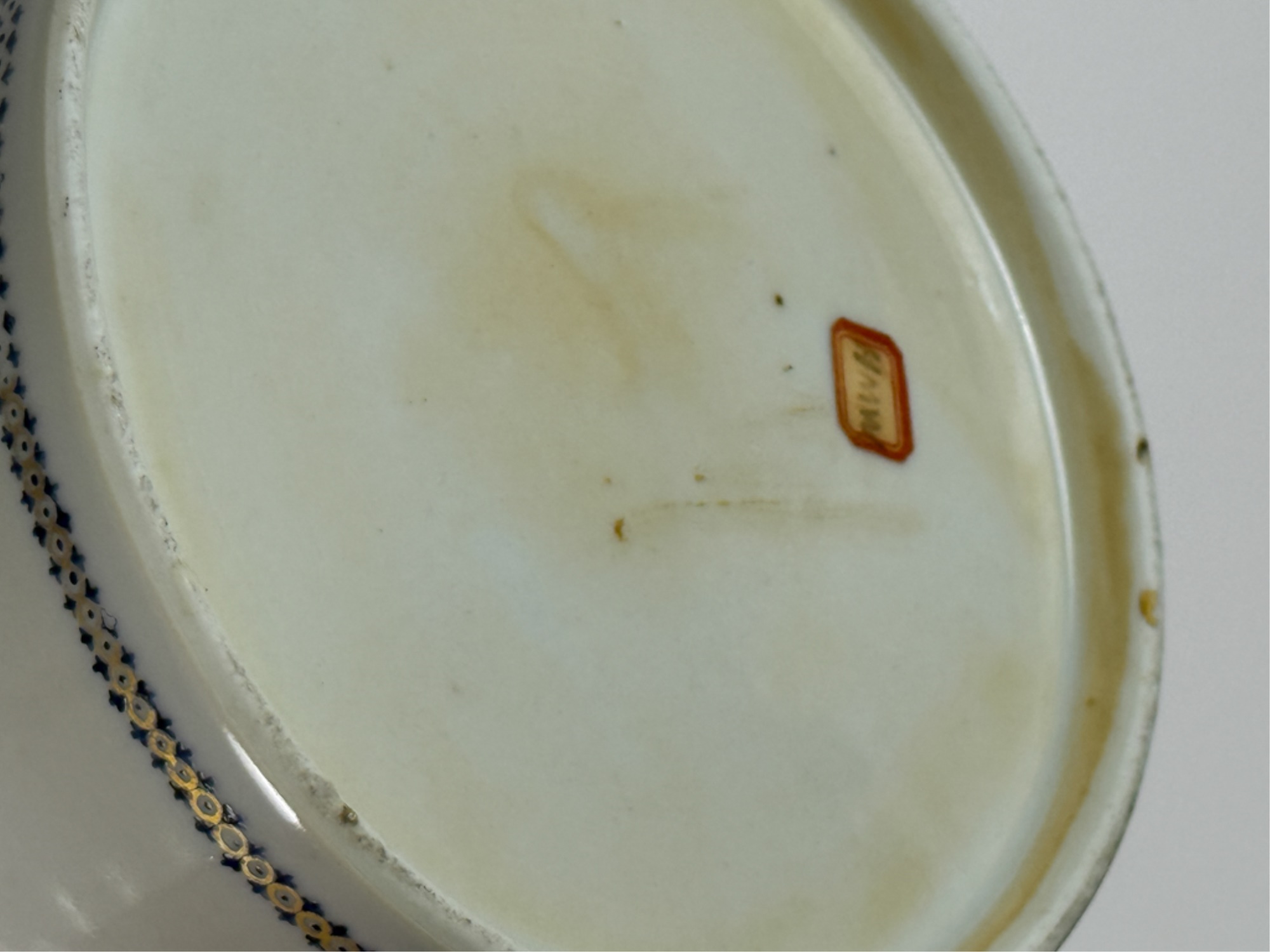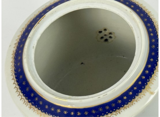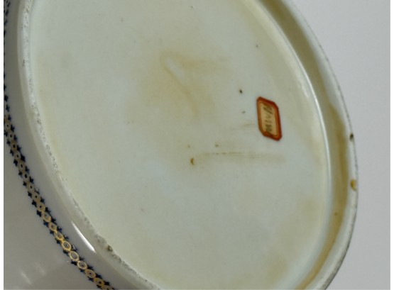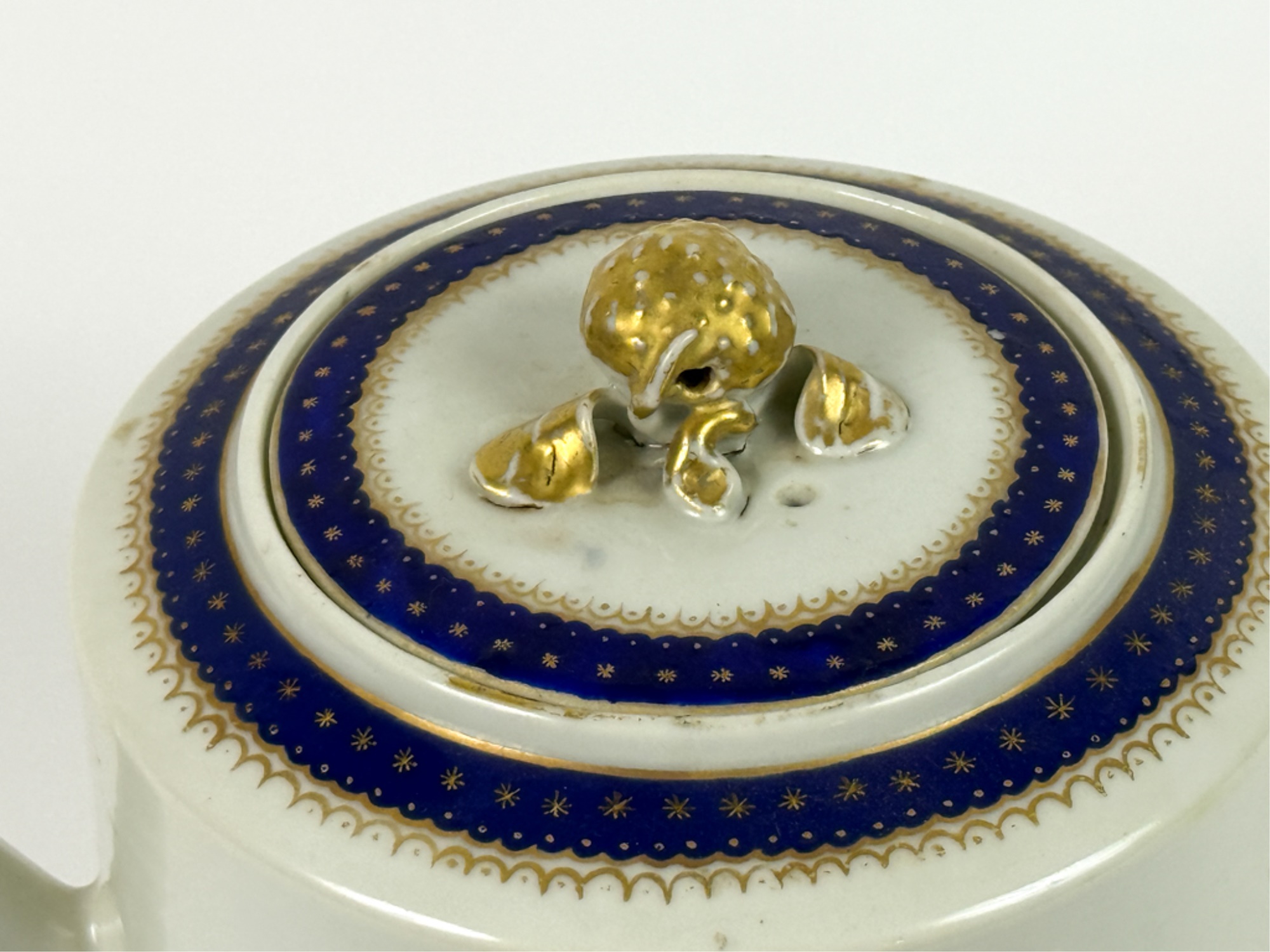 Hand painted & gilt, figural fruit handle on lid. 6 1/2 x 5 1/4 x 10 inches. Condition: Good, wear to gilt. Temp No 3711