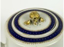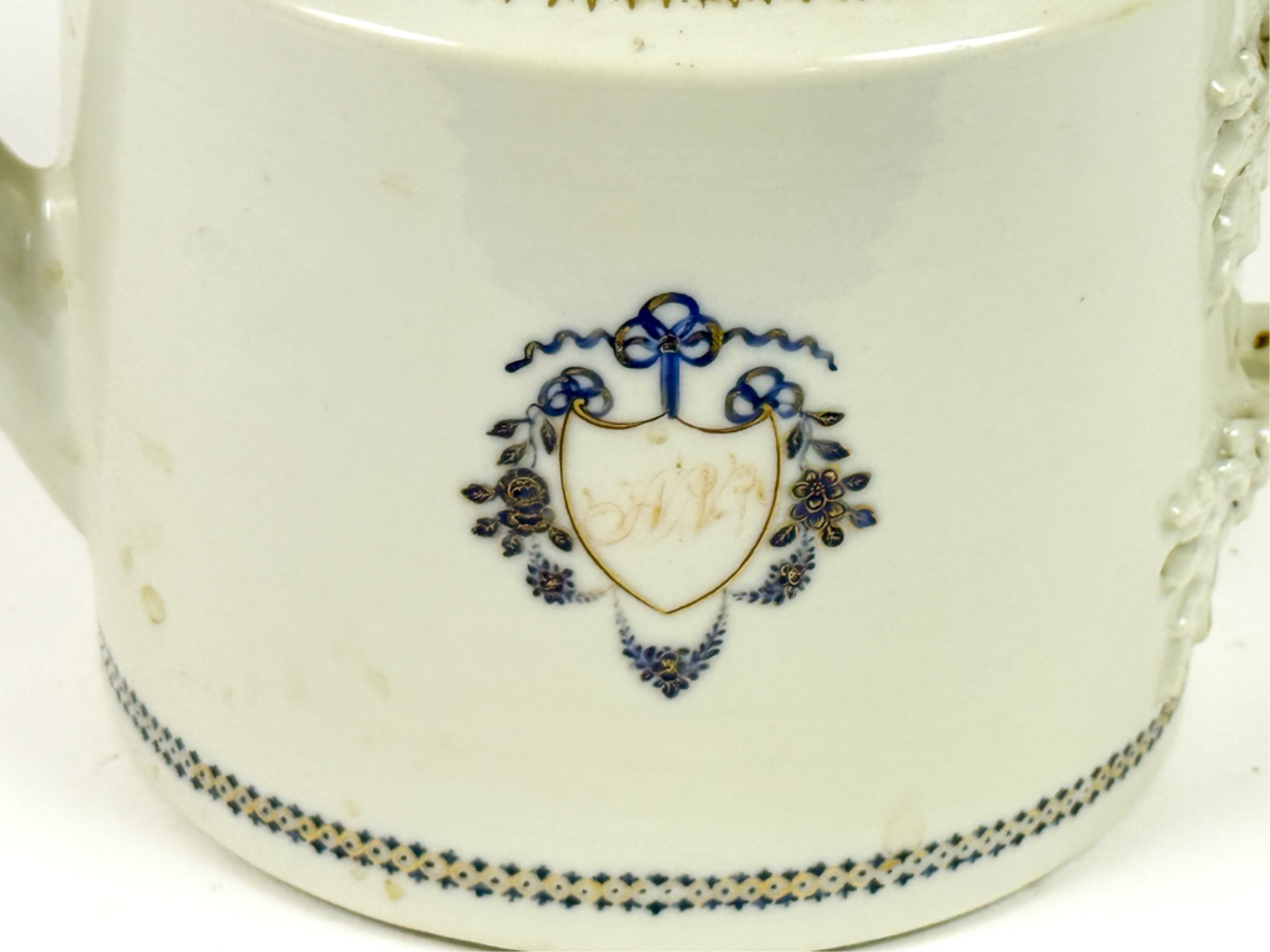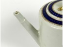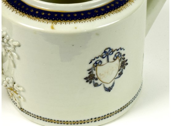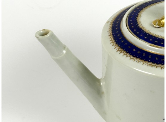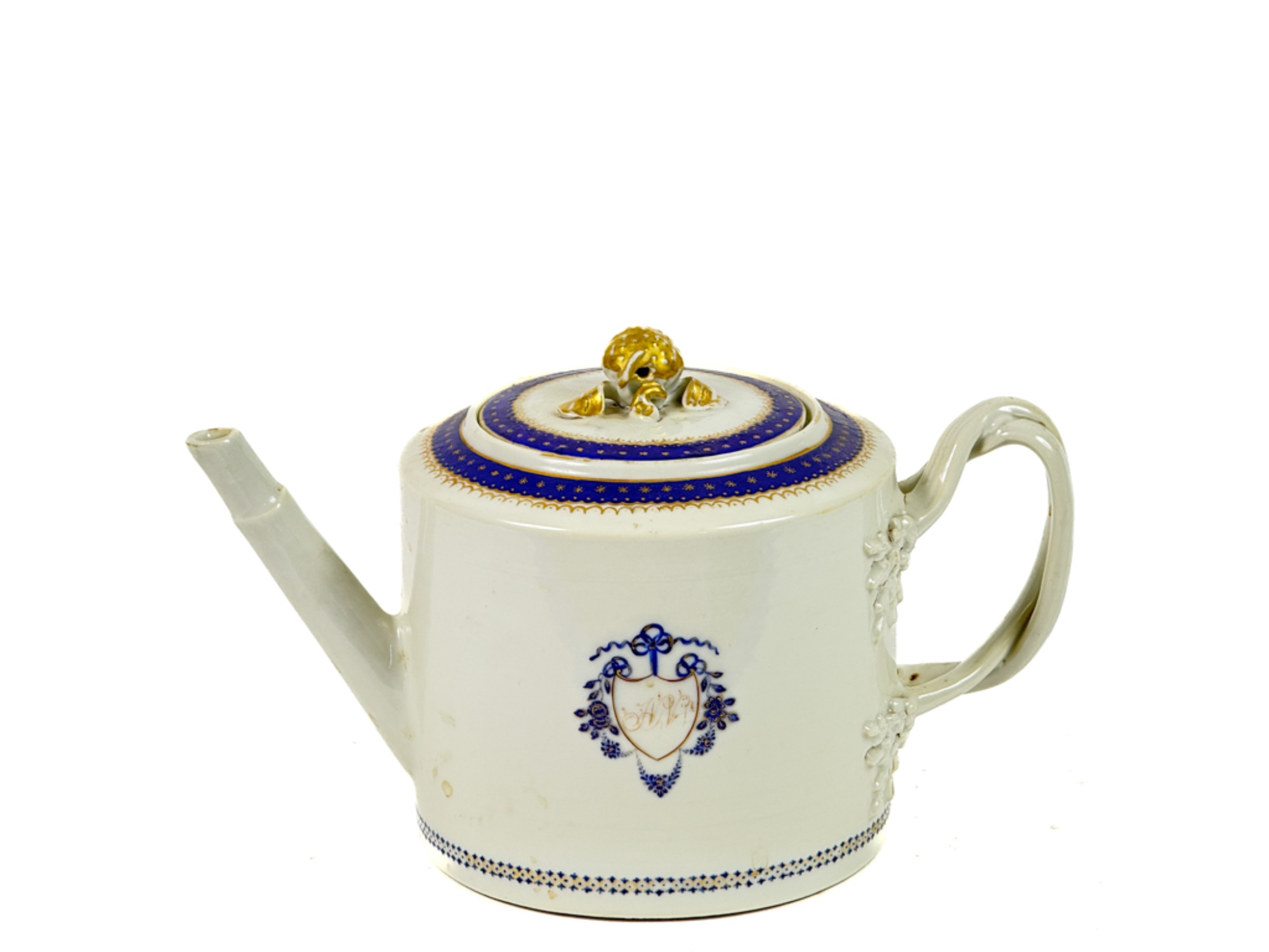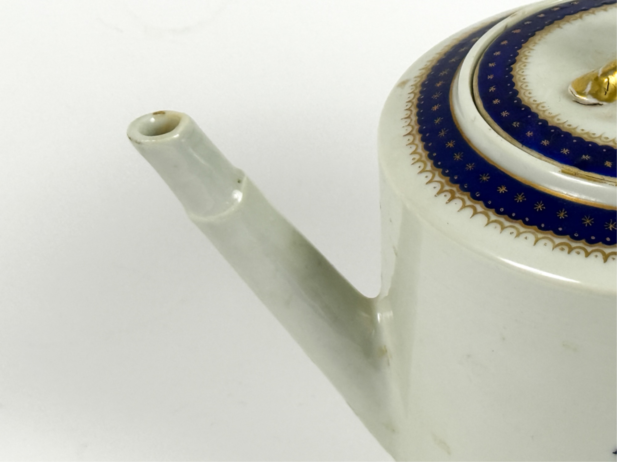 Hand painted & gilt, figural fruit handle on lid. 6 1/2 x 5 1/4 x 10 inches. Condition: Good, wear to gilt. Temp No 3711