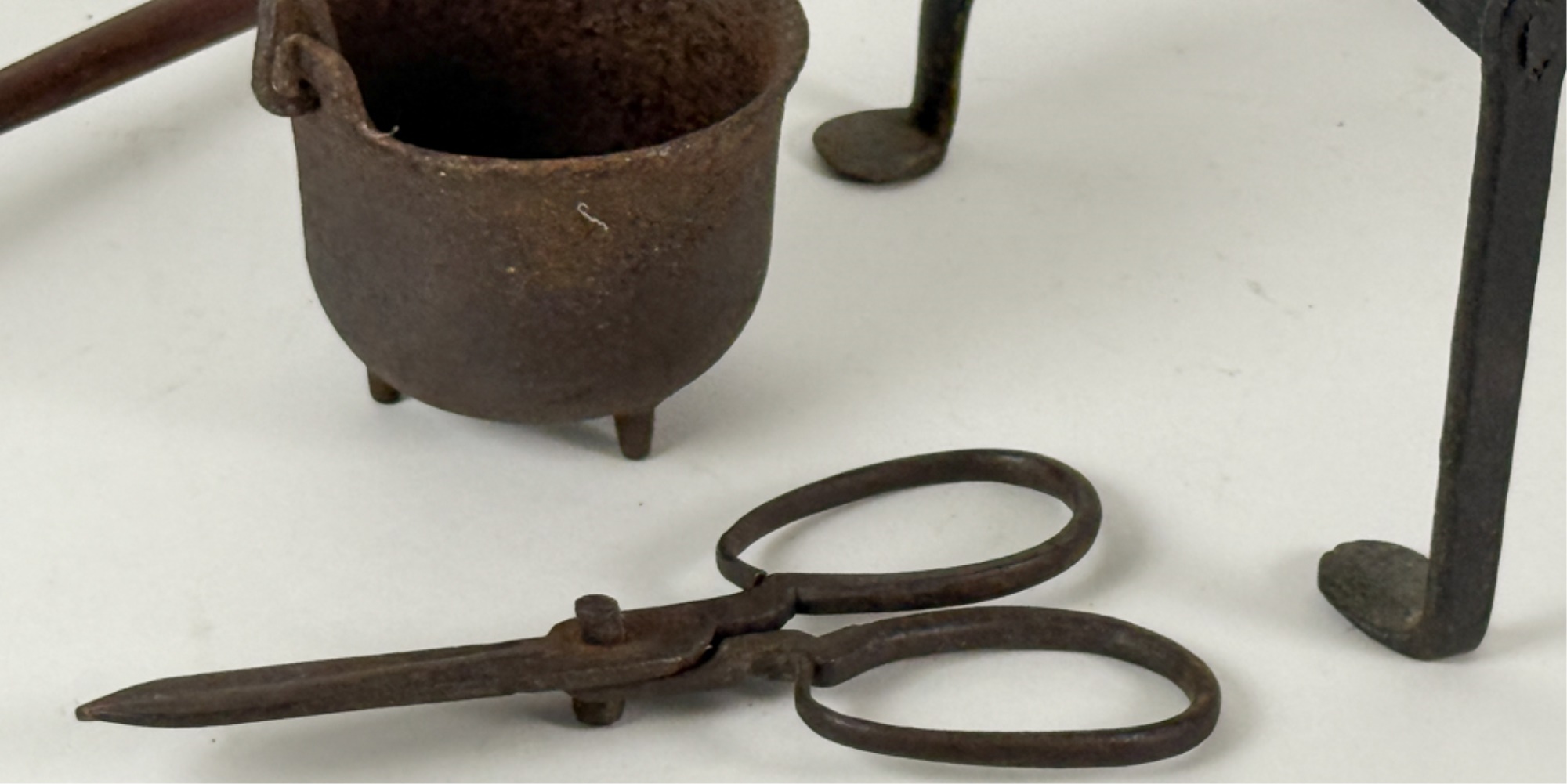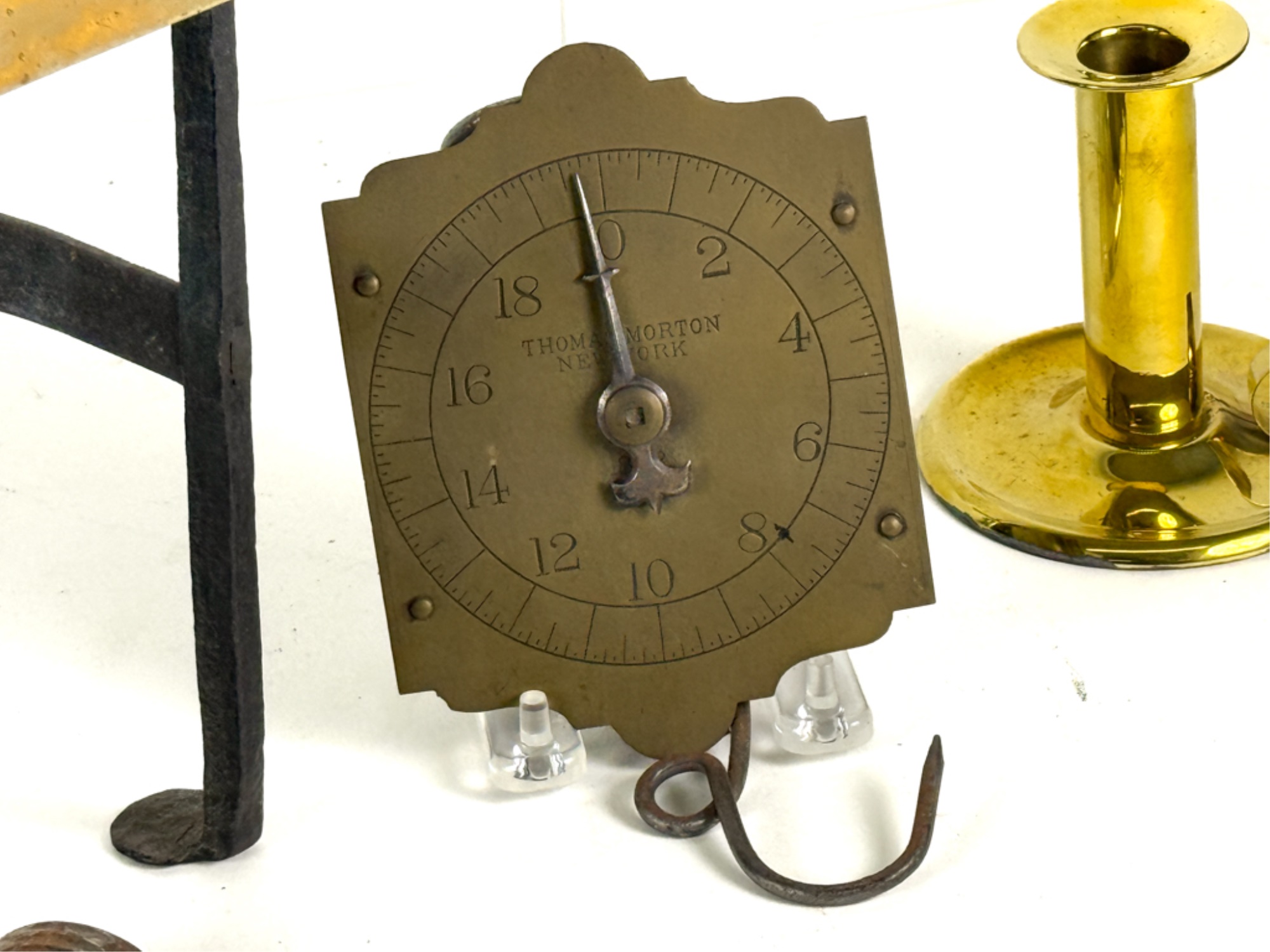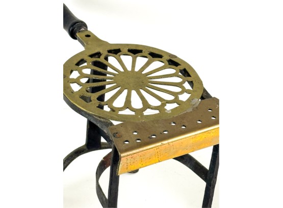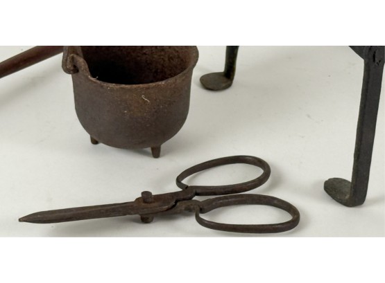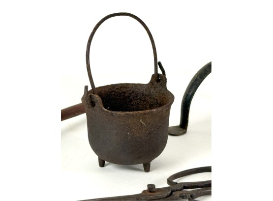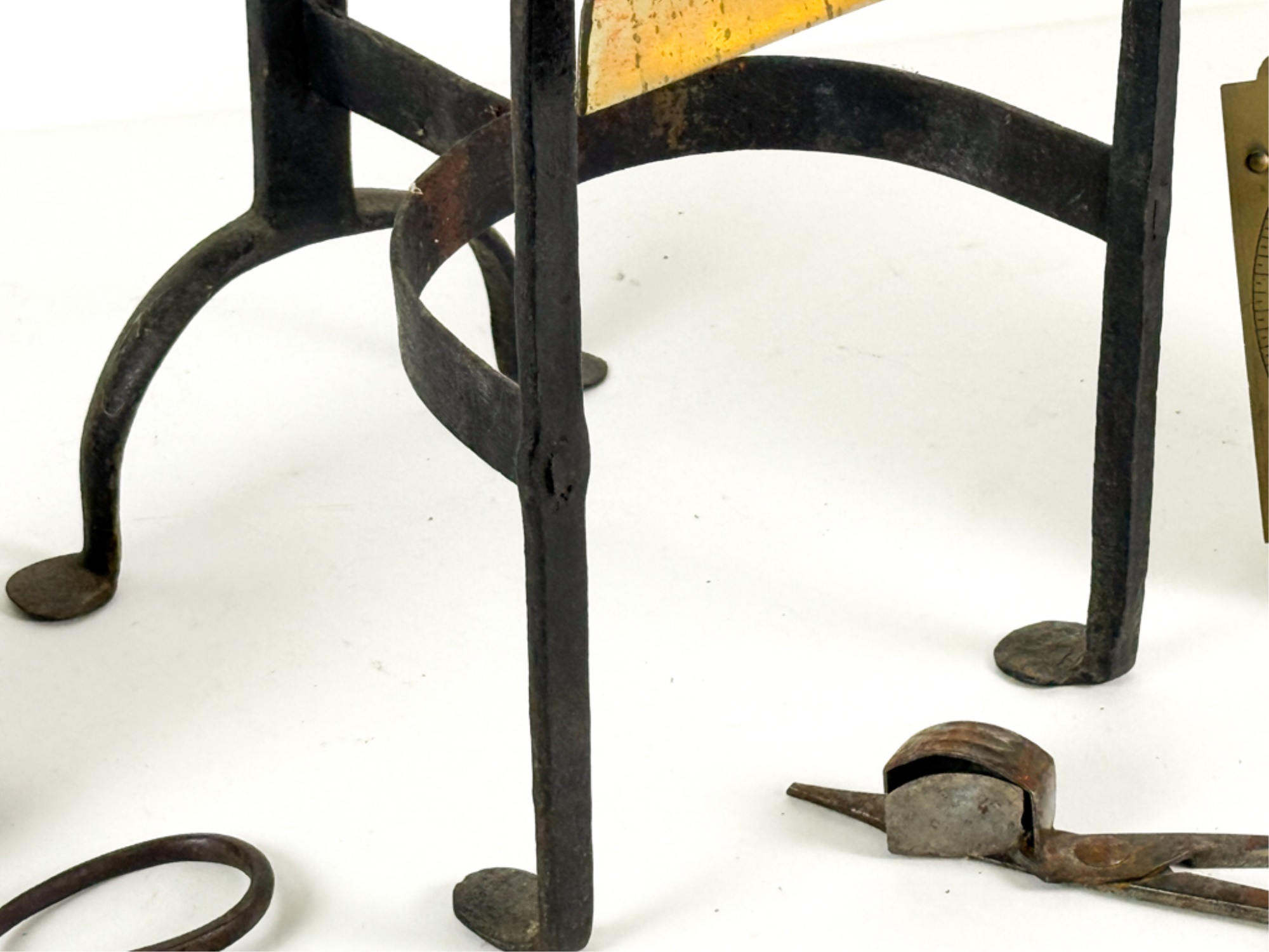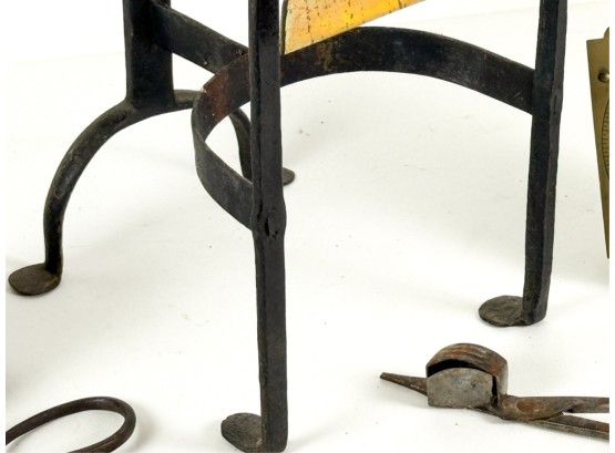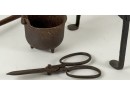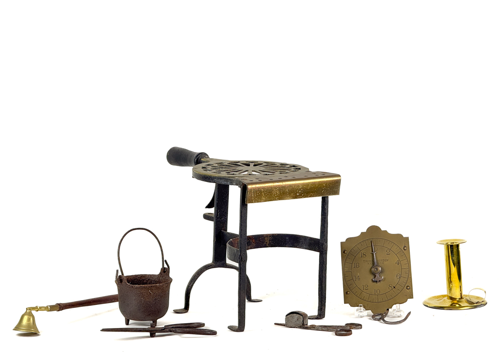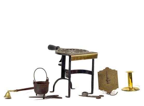 (19th c) pierced brass & wrought iron kettle stand along with a group of other fire related tools including Thomas Morton (NY) brass scale, small cast iron pot, candle snuffer, wick trimmers, etc. 9 1/4 x 7 x 14 inches. Condition: Good, some