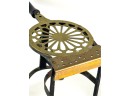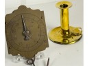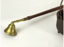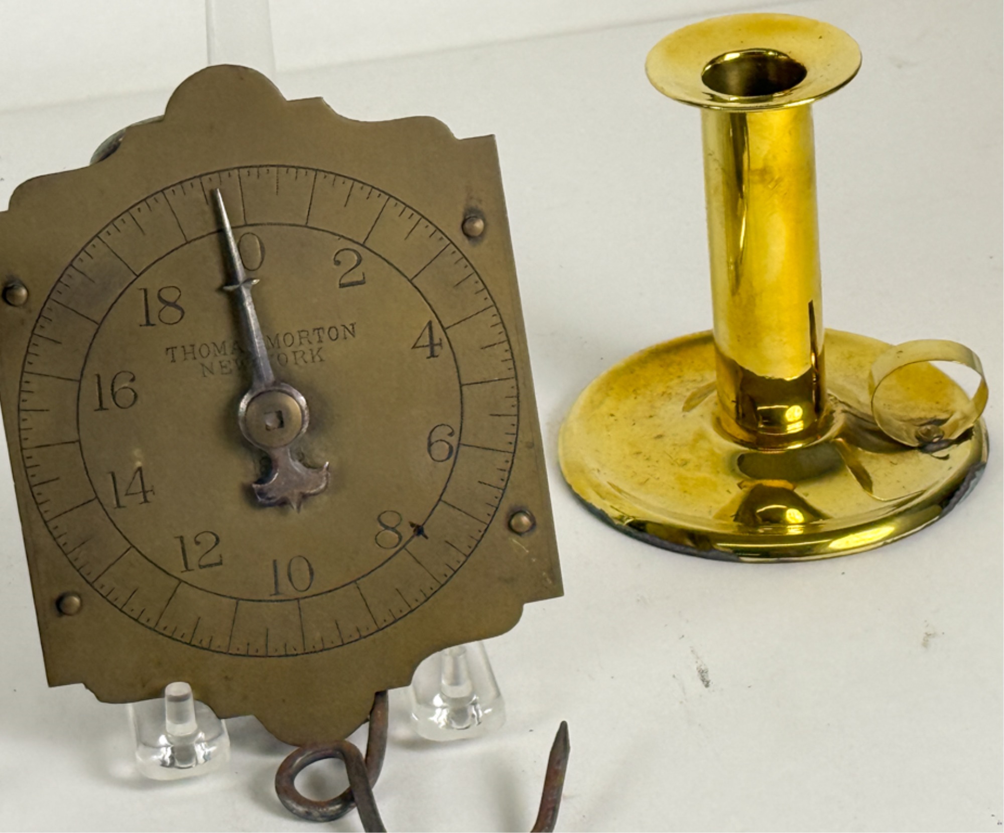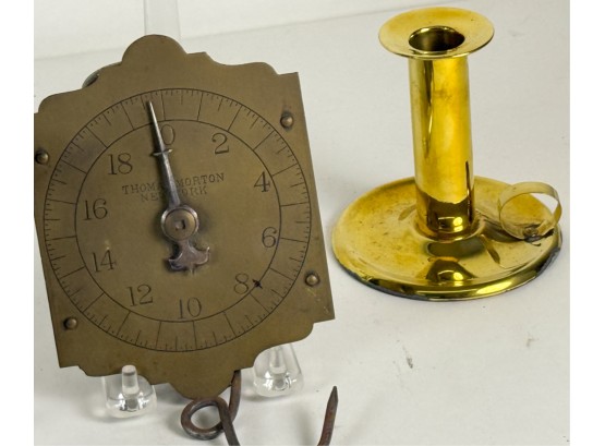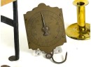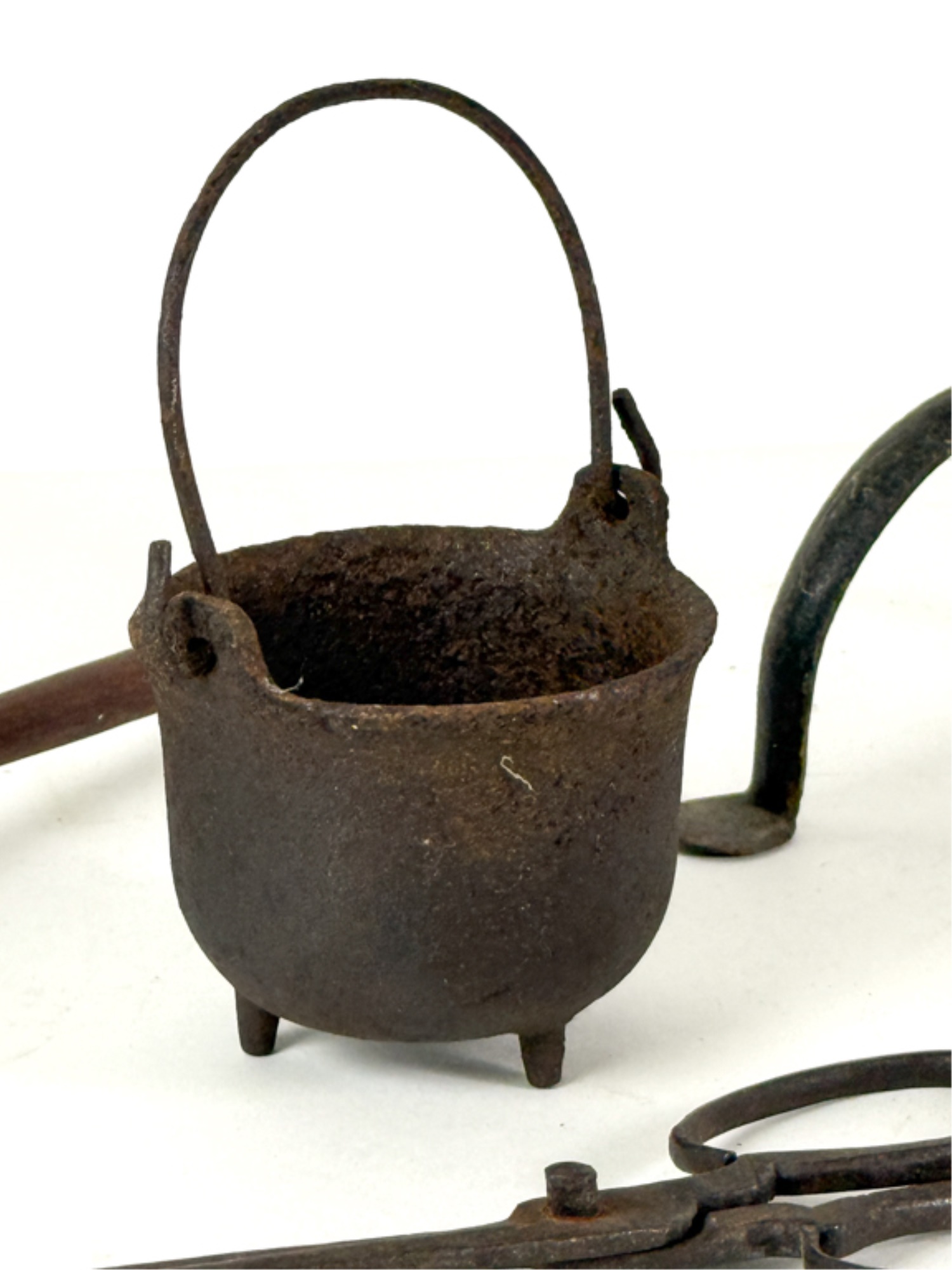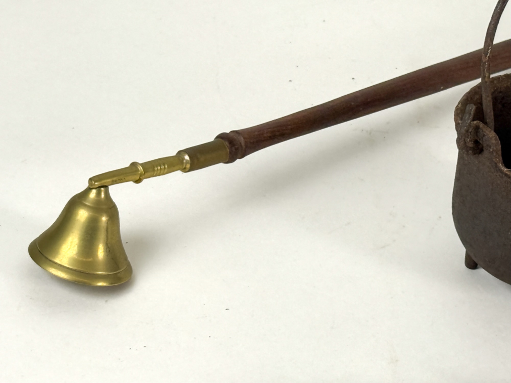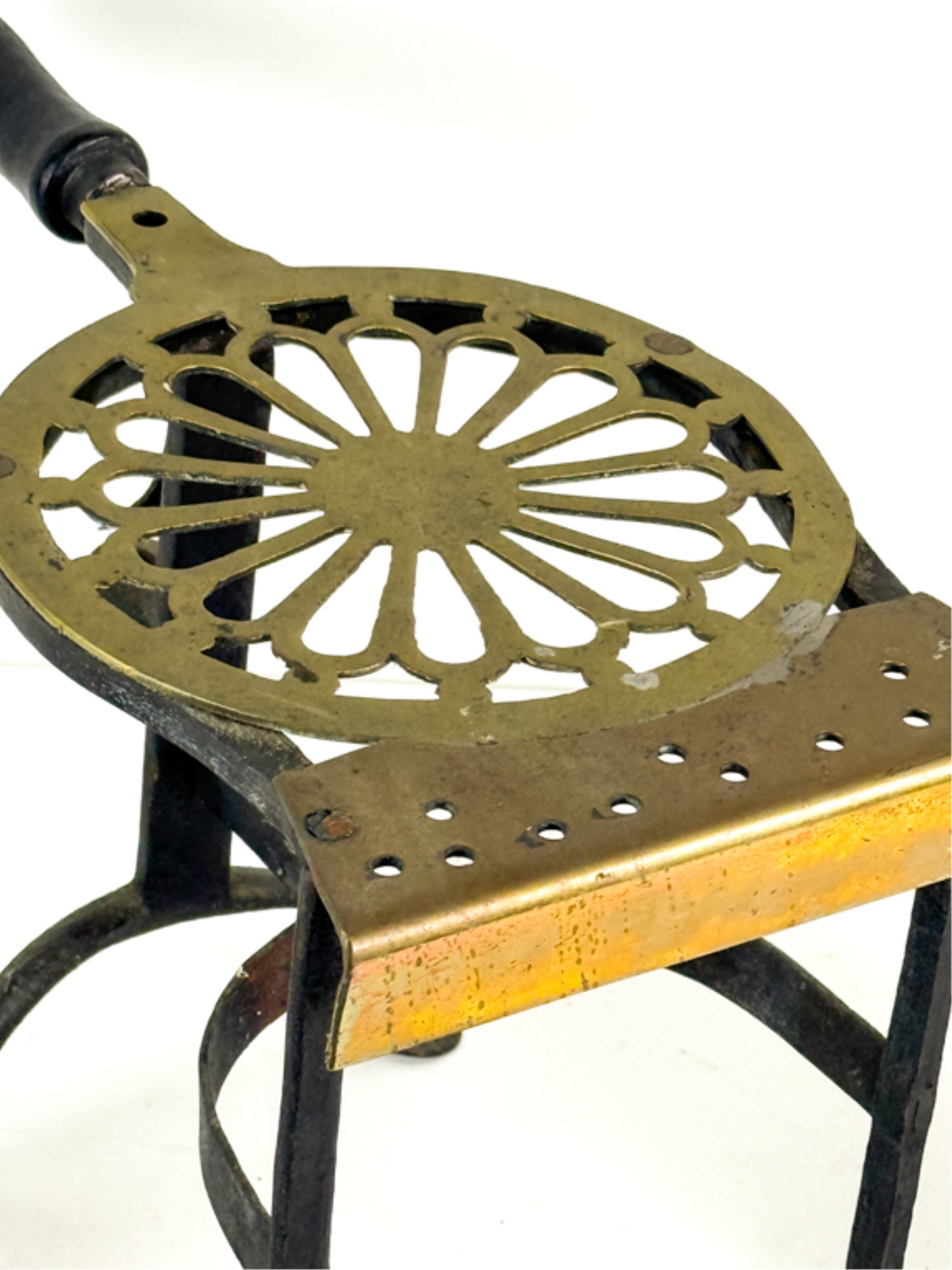 (19th c) pierced brass & wrought iron kettle stand along with a group of other fire related tools including Thomas Morton (NY) brass scale, small cast iron pot, candle snuffer, wick trimmers, etc. 9 1/4 x 7 x 14 inches. Condition: Good, some
