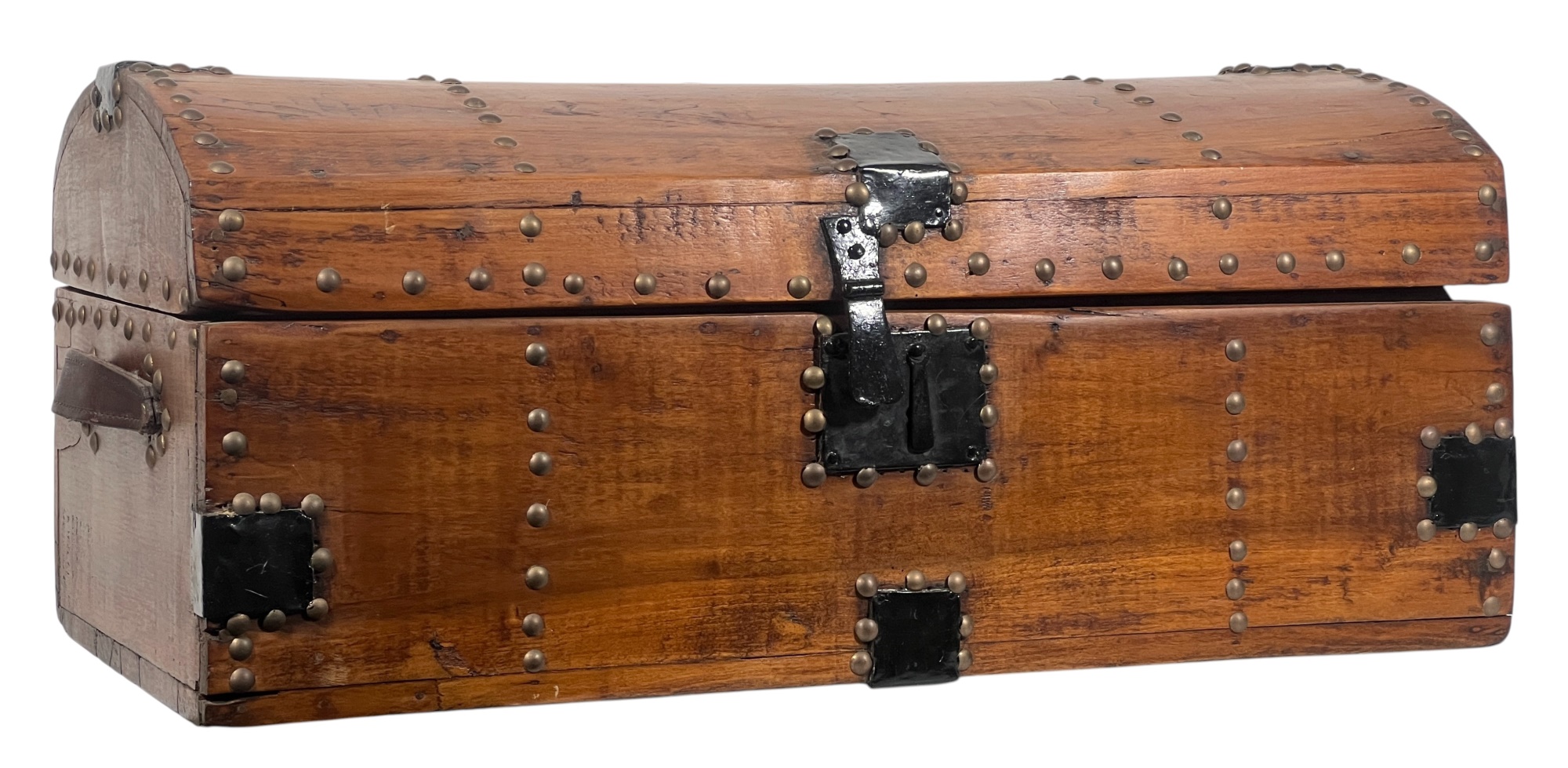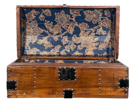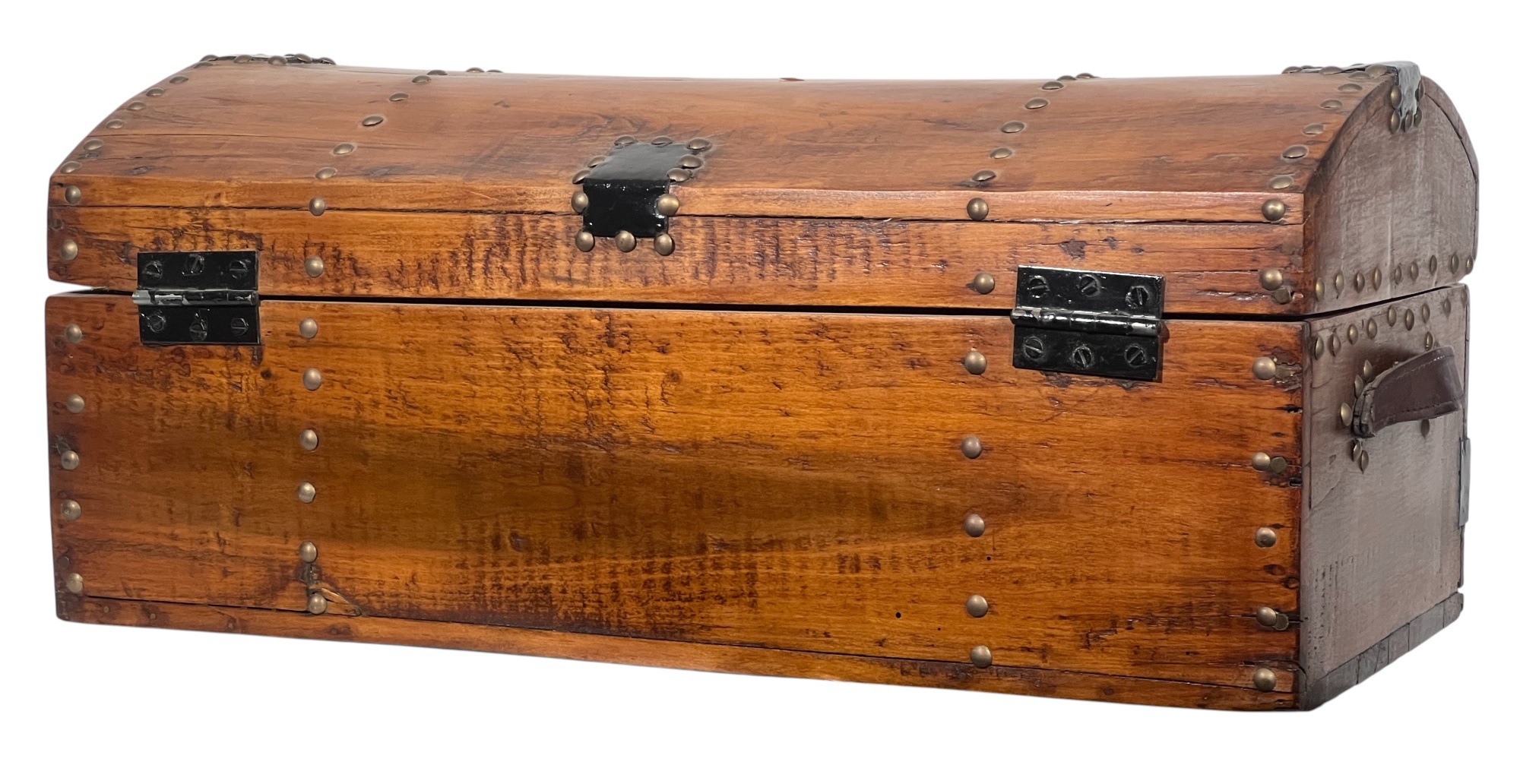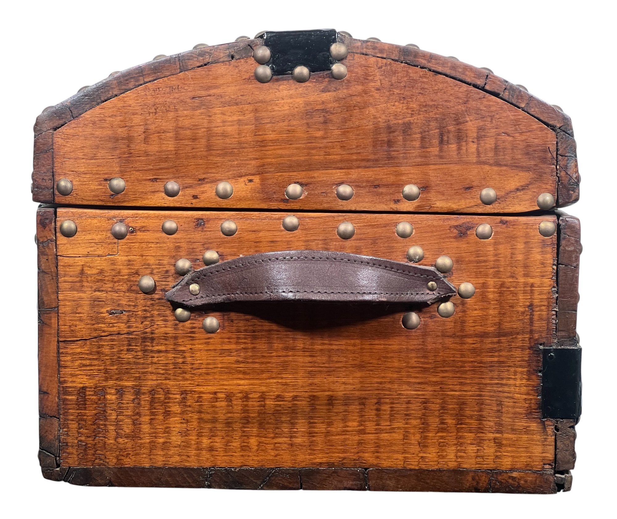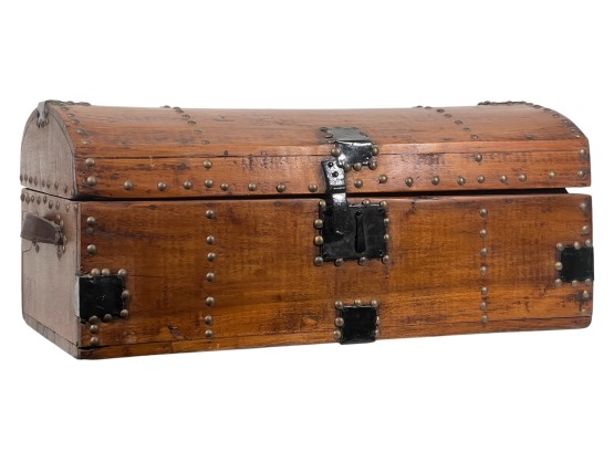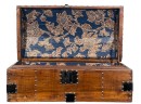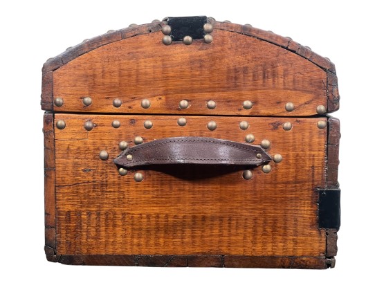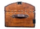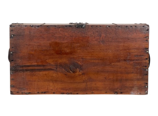 With iron lock & leather handles. 11 x 24 1/2 x 12 1/2 inches. Condition: Good. Temp No 8789