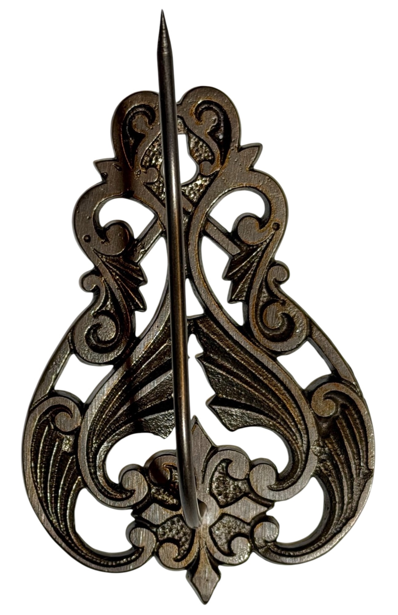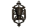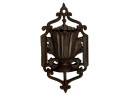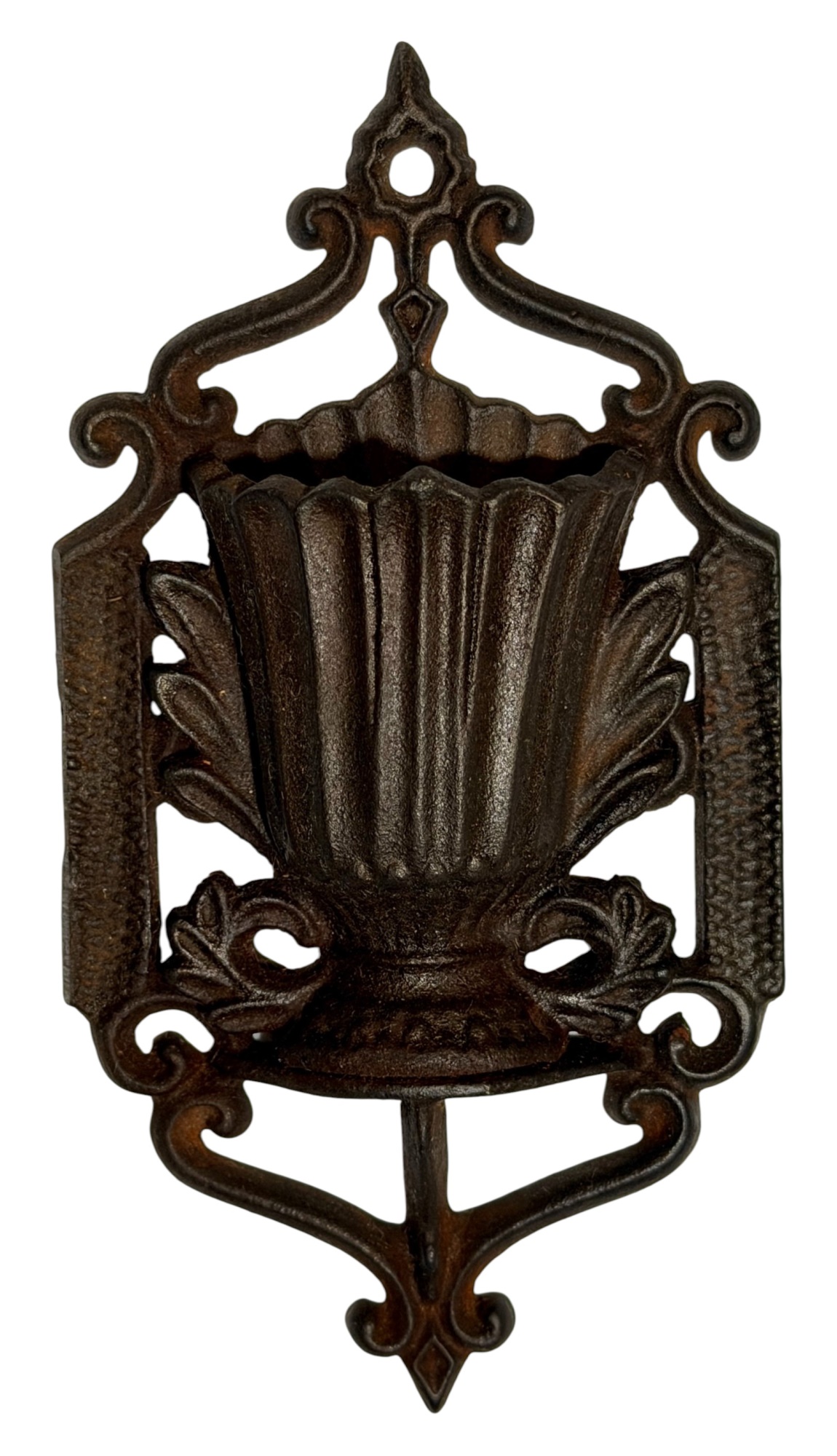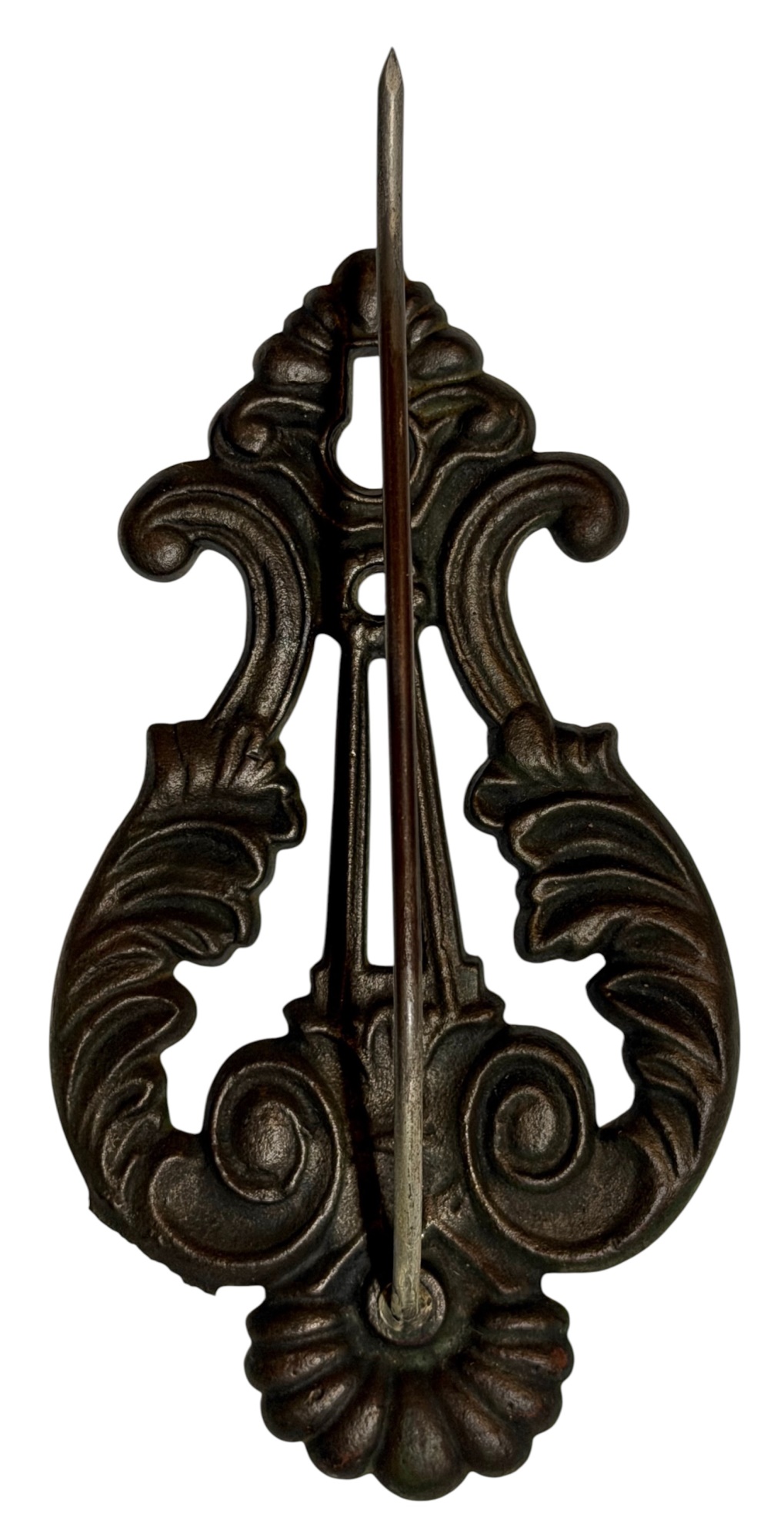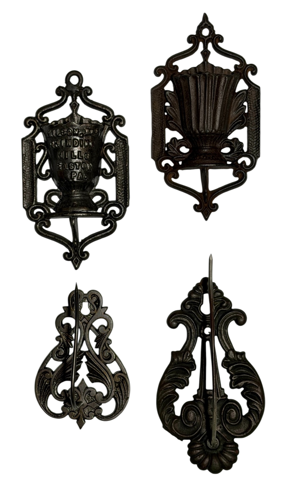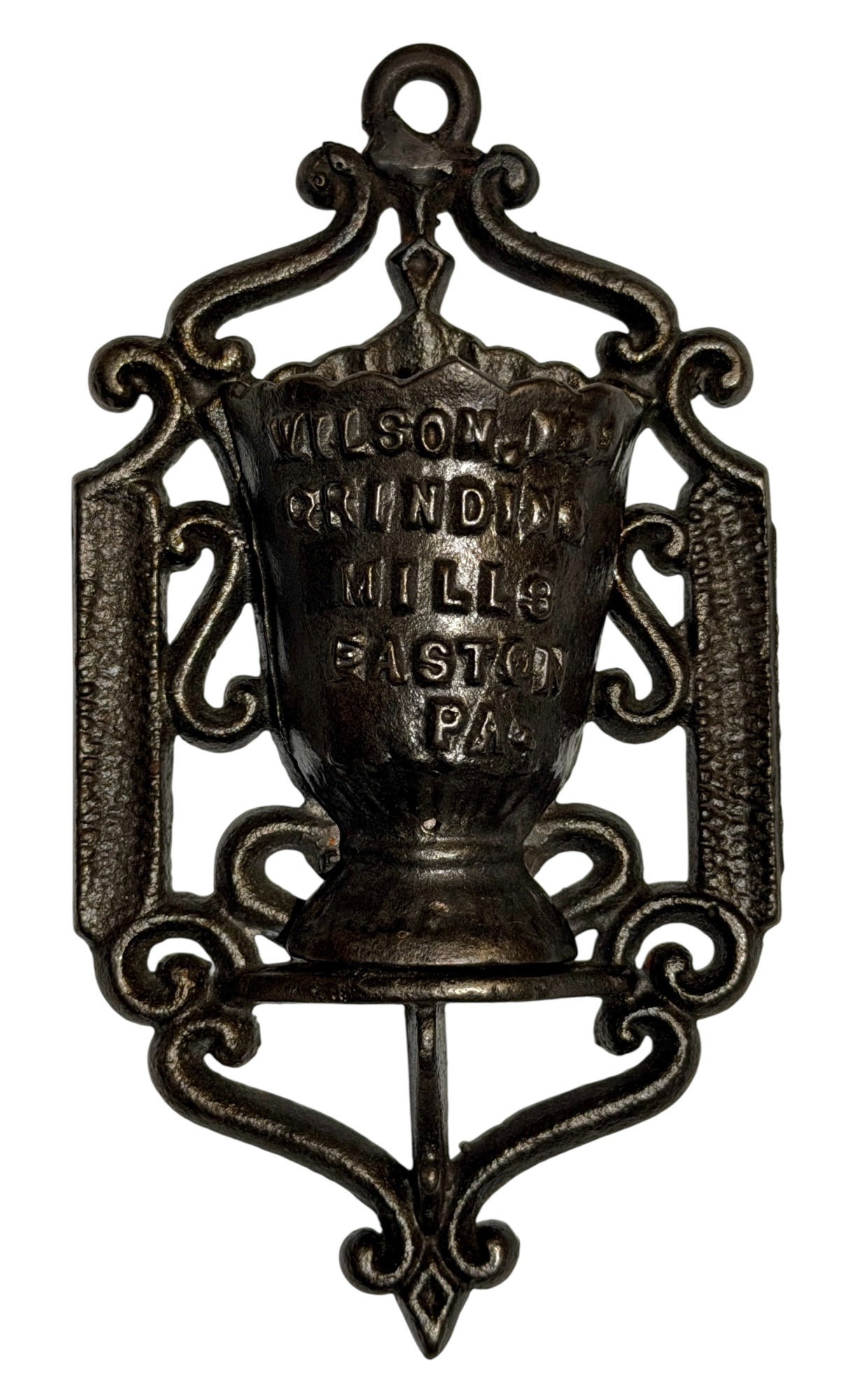 (2) cast iron wall hanging match safes including (1) advertising for Wilson Grinding Mills and (2) lyre form receipt spikes. 5 3/4 x 3 x 2 inches. Condition: Good. Temp No 8659