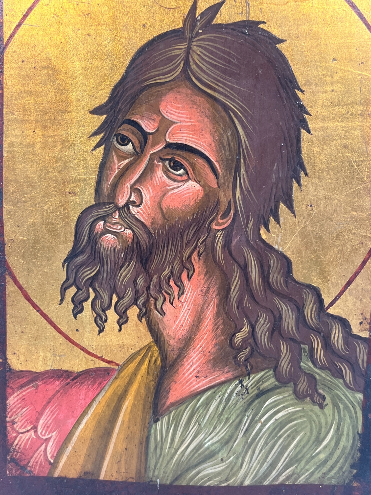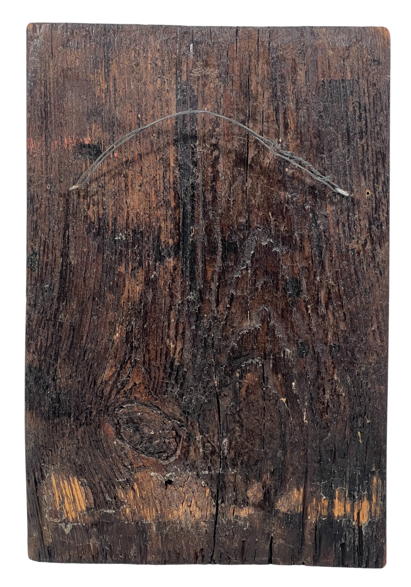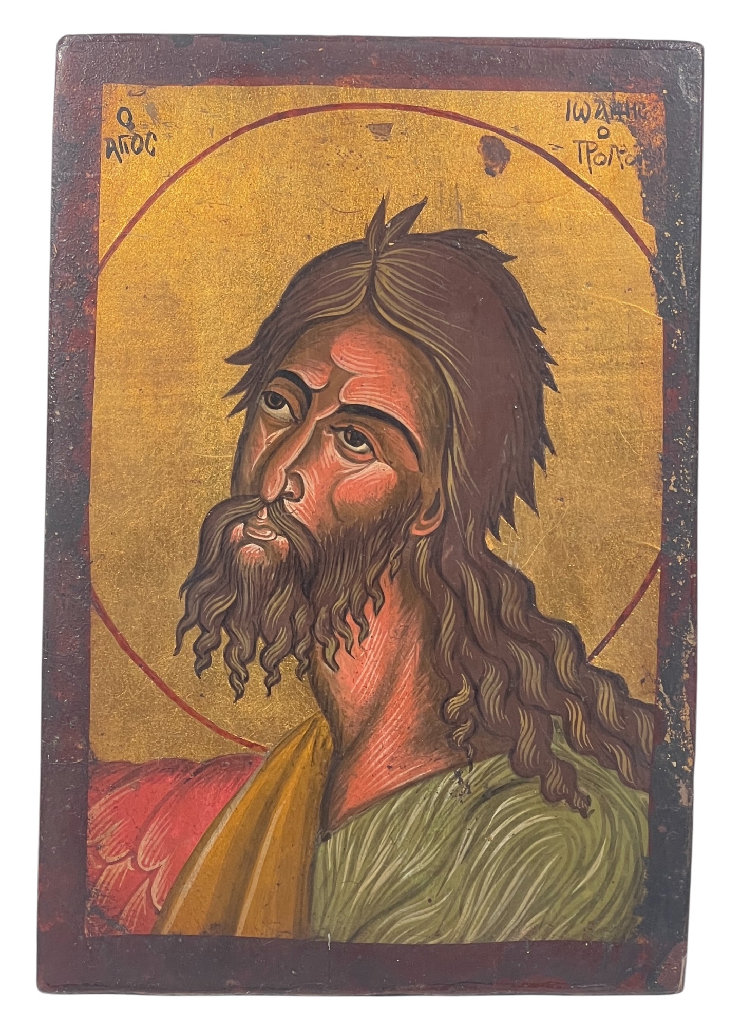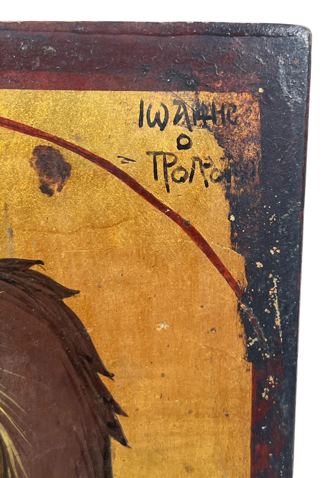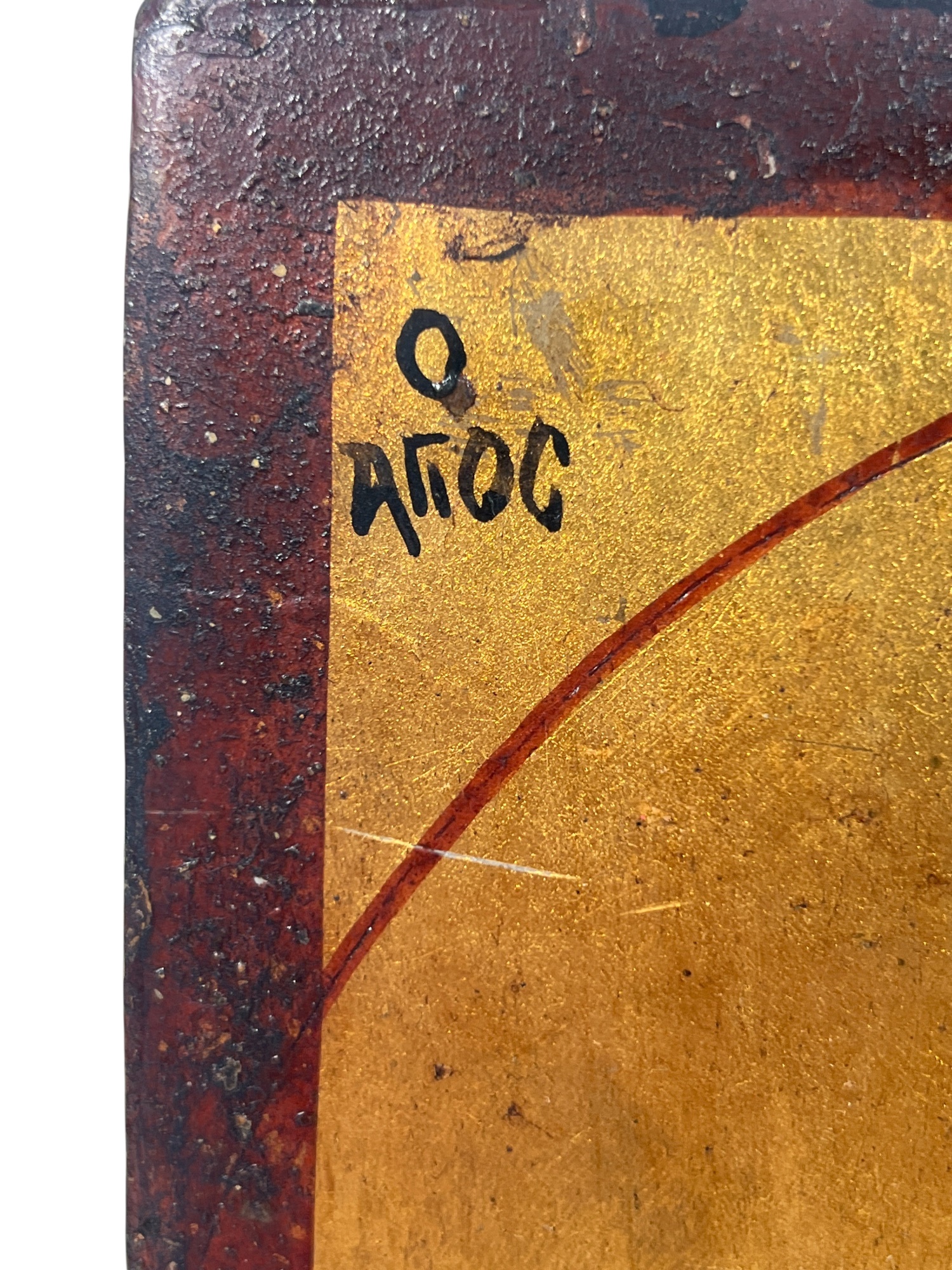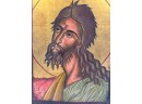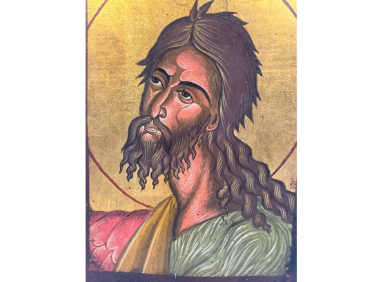(19th c) hand painted & gilt Eastern Orthodox icon on panel depicting Jesus. 9 1/2 x 6 1/2 inches. Condition: Some wear to paint. Temp No 8856