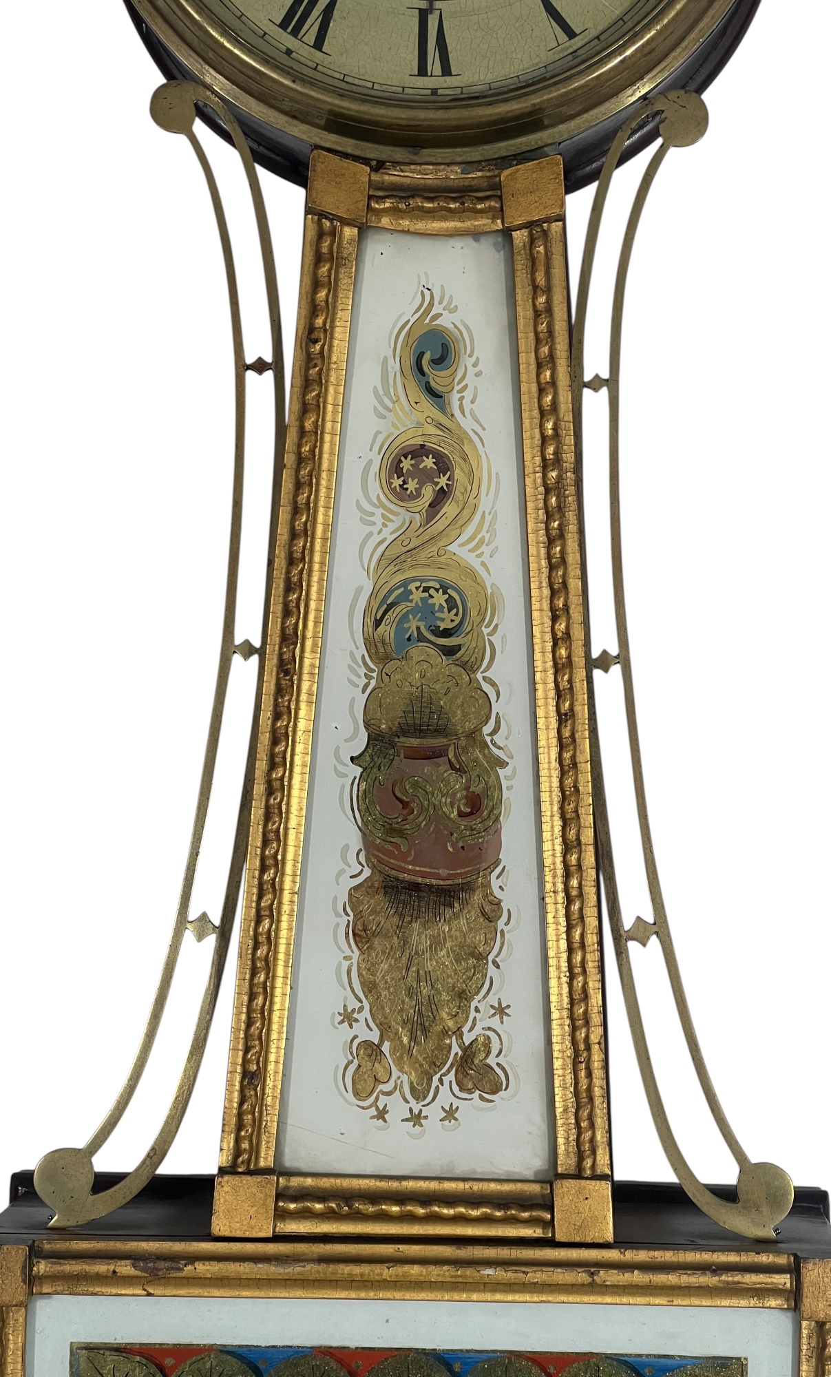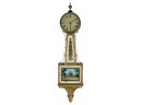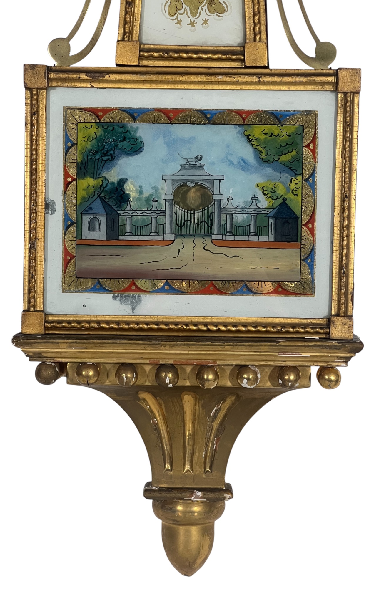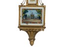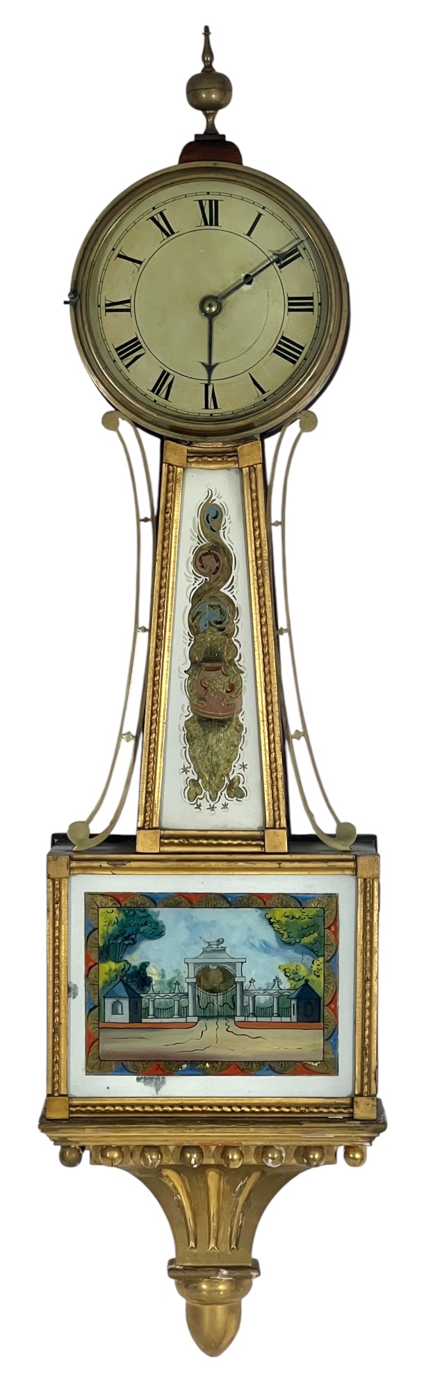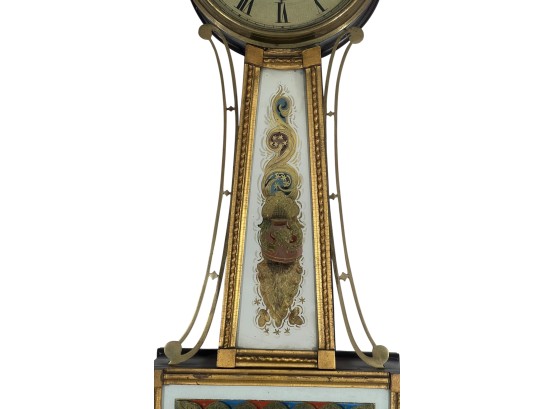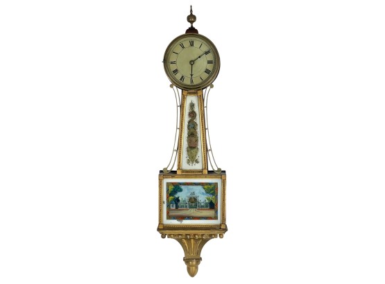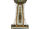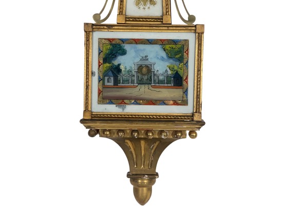 Gilt mahogany case, 6 1/2 inch painted iron dial, nice reverse painted glass eglomise panels. 37 x 10 1/2 x 3 1/2 inches. Condition: Some scattered gilt loss, untested. Temp No 8838
