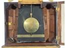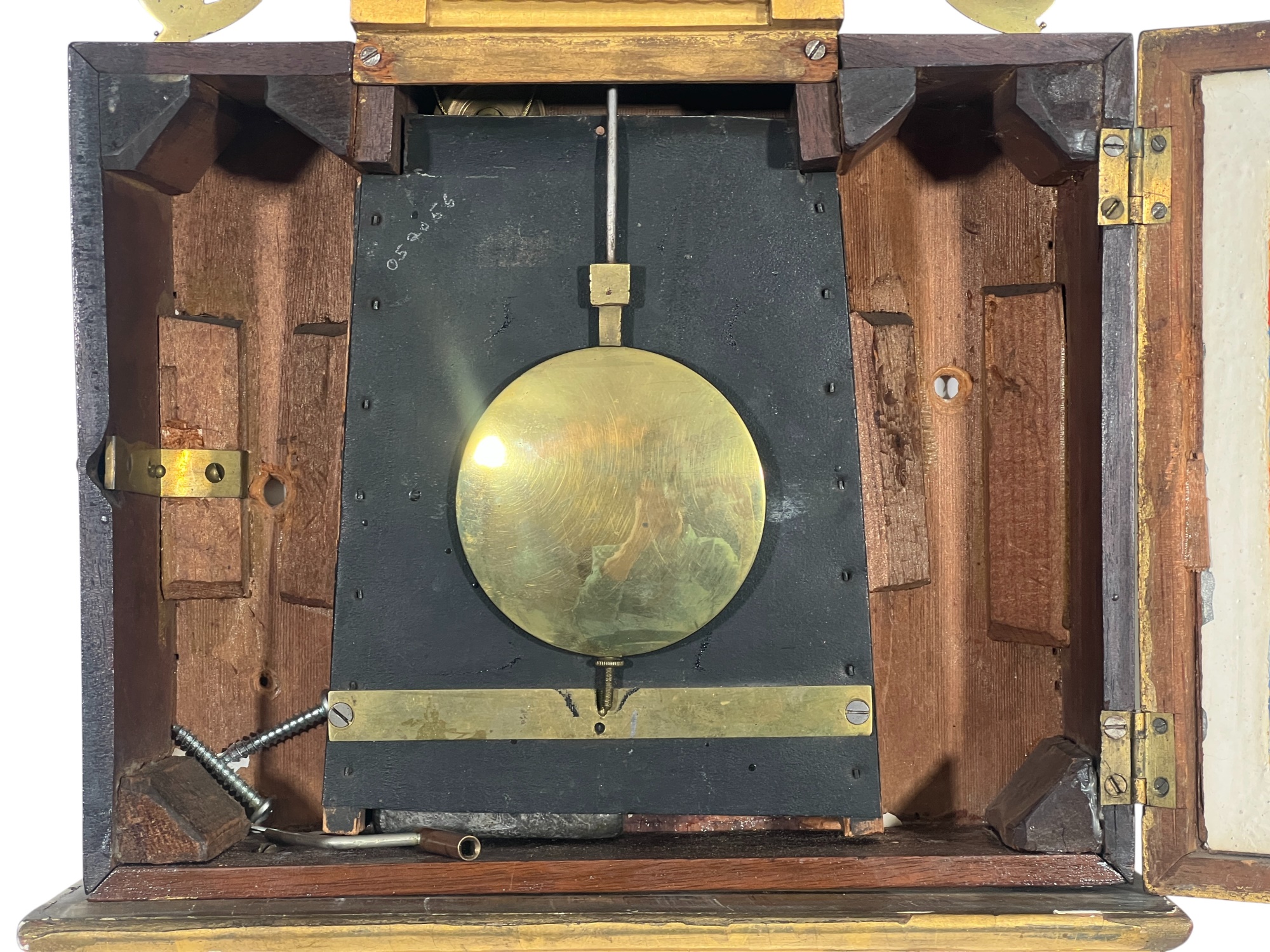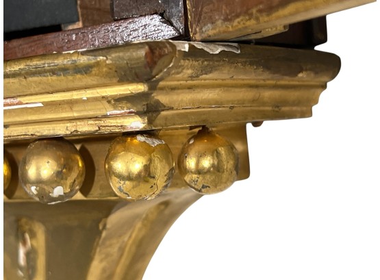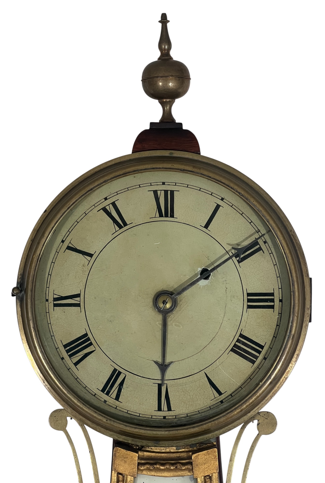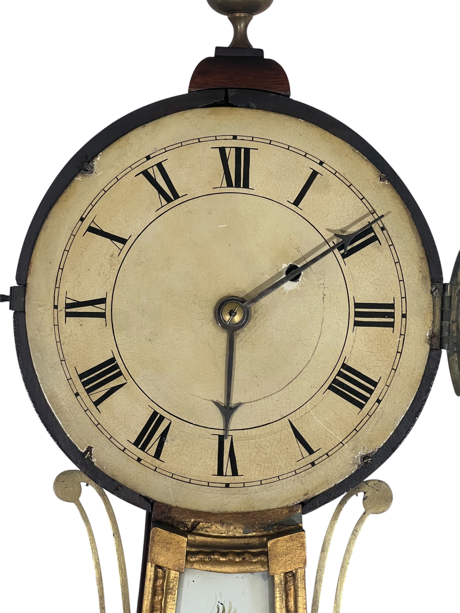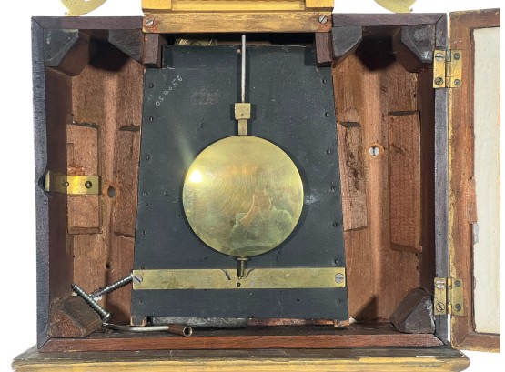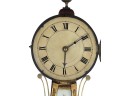 Gilt mahogany case, 6 1/2 inch painted iron dial, nice reverse painted glass eglomise panels. 37 x 10 1/2 x 3 1/2 inches. Condition: Some scattered gilt loss, untested. Temp No 8838