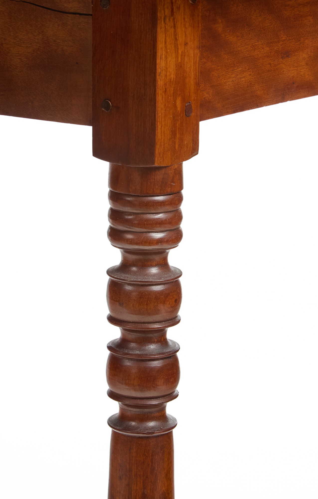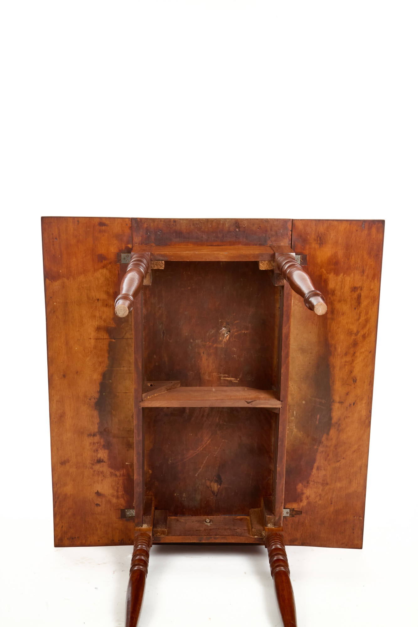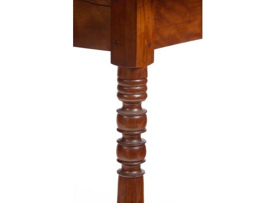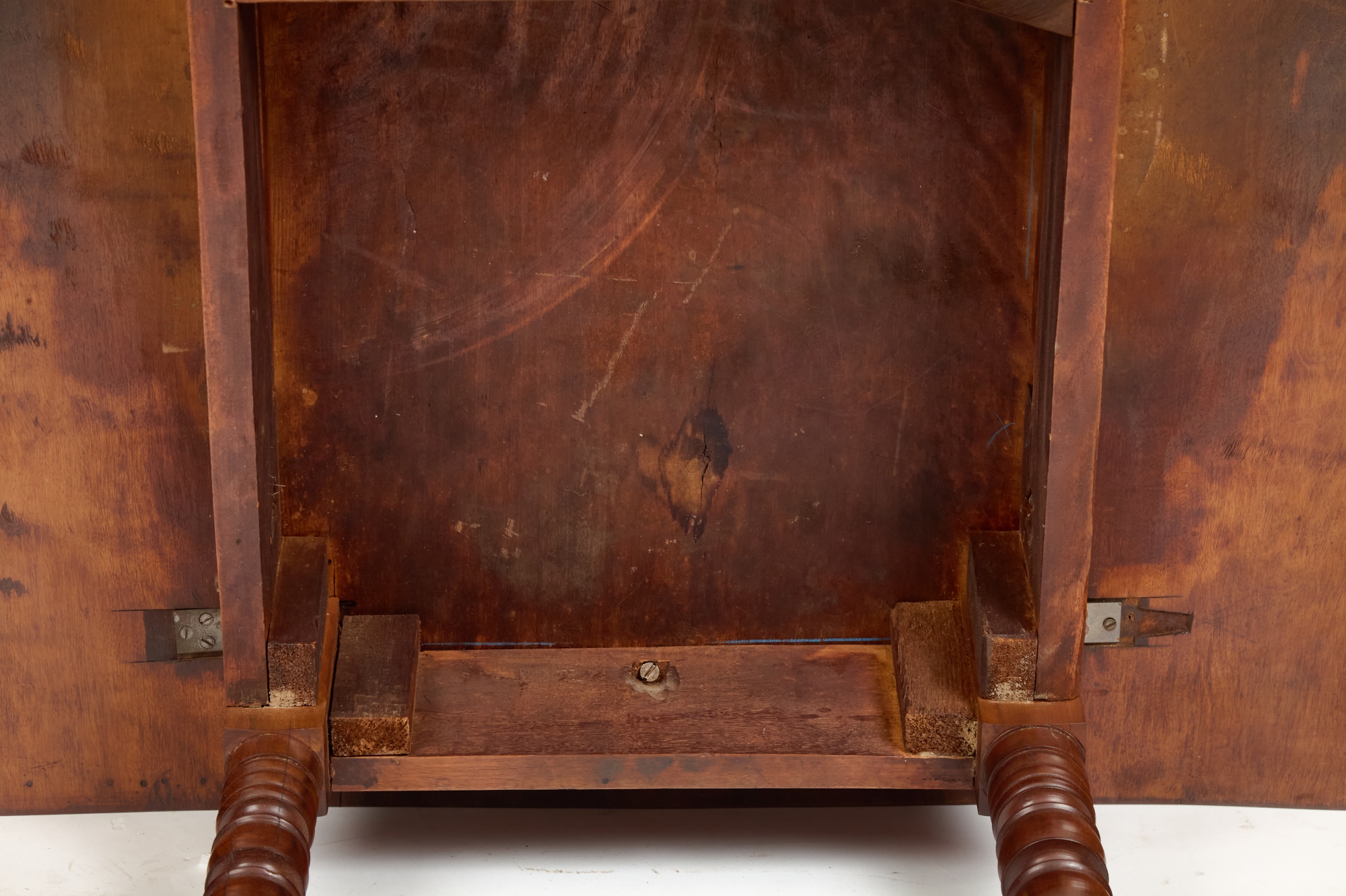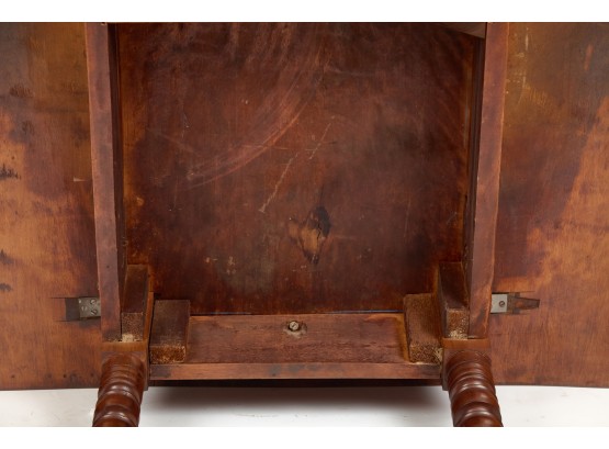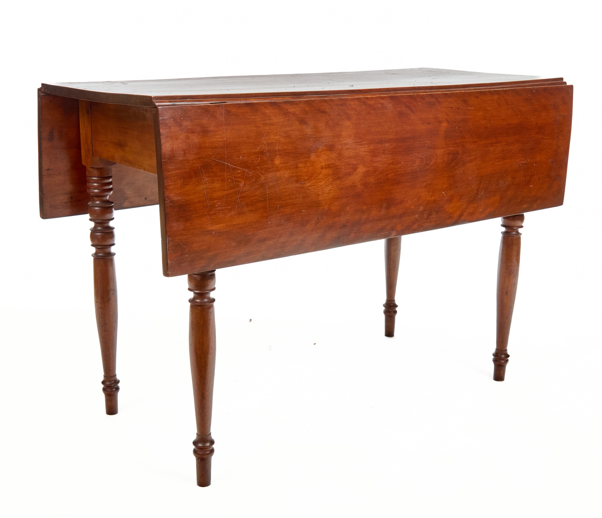 Nicely turned legs, pegged construction. 28 1/2 x 42 x 19 3/4 inches; 39 1/2 inches open. Condition: Minor surface inconsistency to top, (1) hinge should be replaced. Temp No 2599