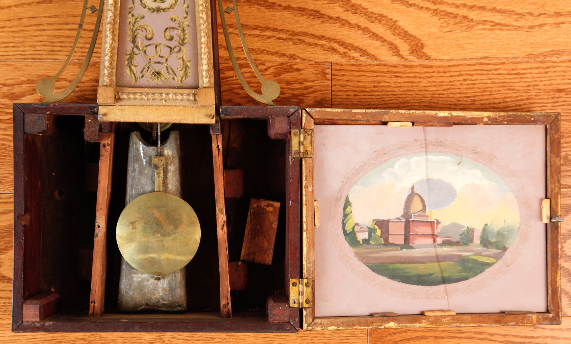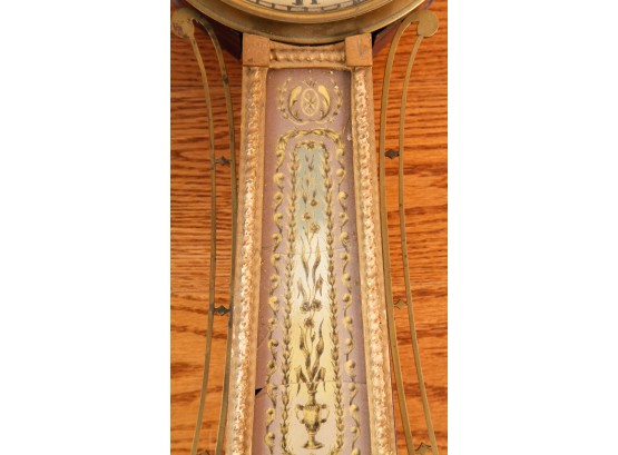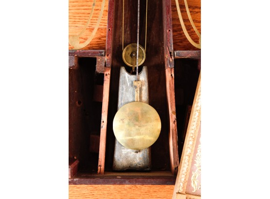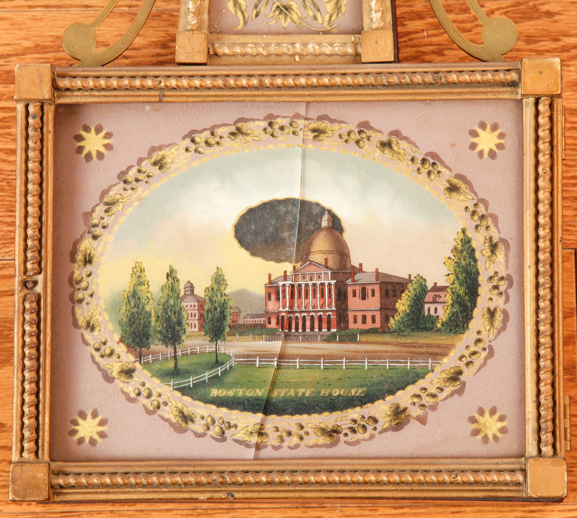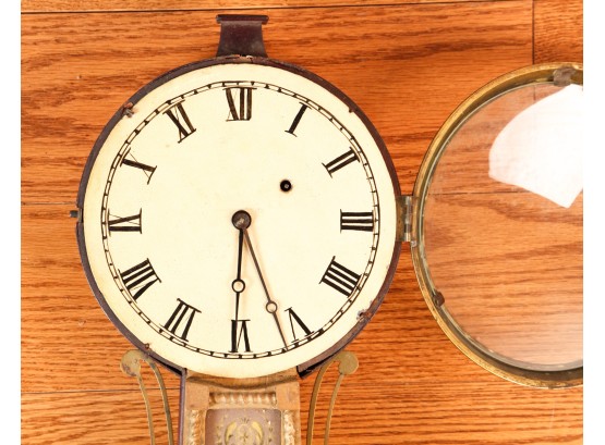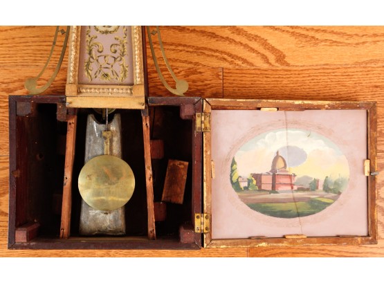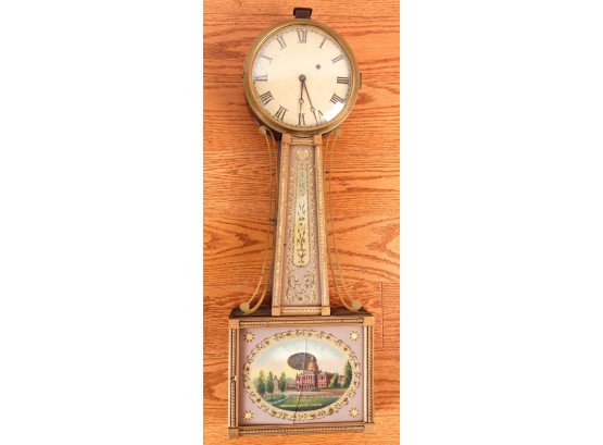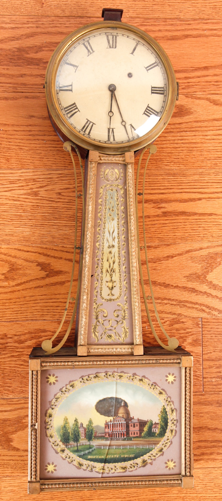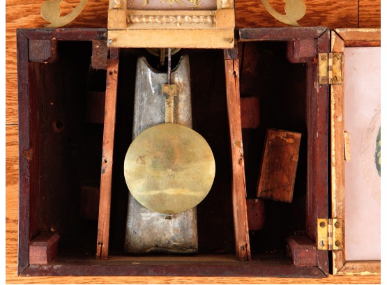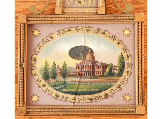 7 1/4 inch dial, reverse painted and eglomise throat and tablet with the Boston State House. 29 1/2 inches Condition: Surface grime, breaks to tablets, final absent Temp No 2346
