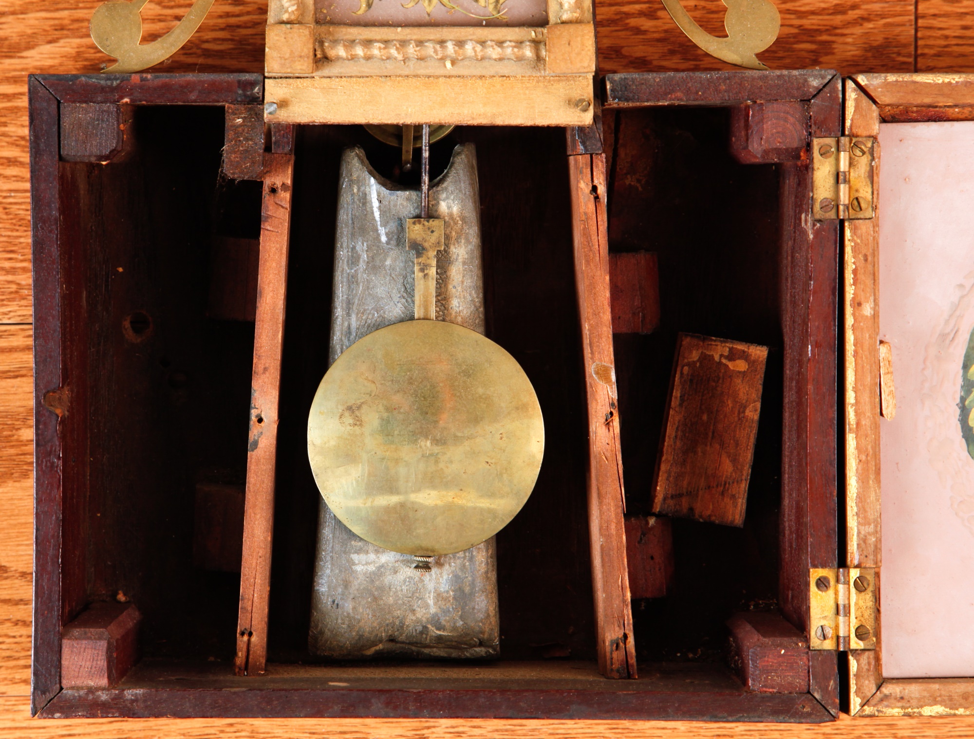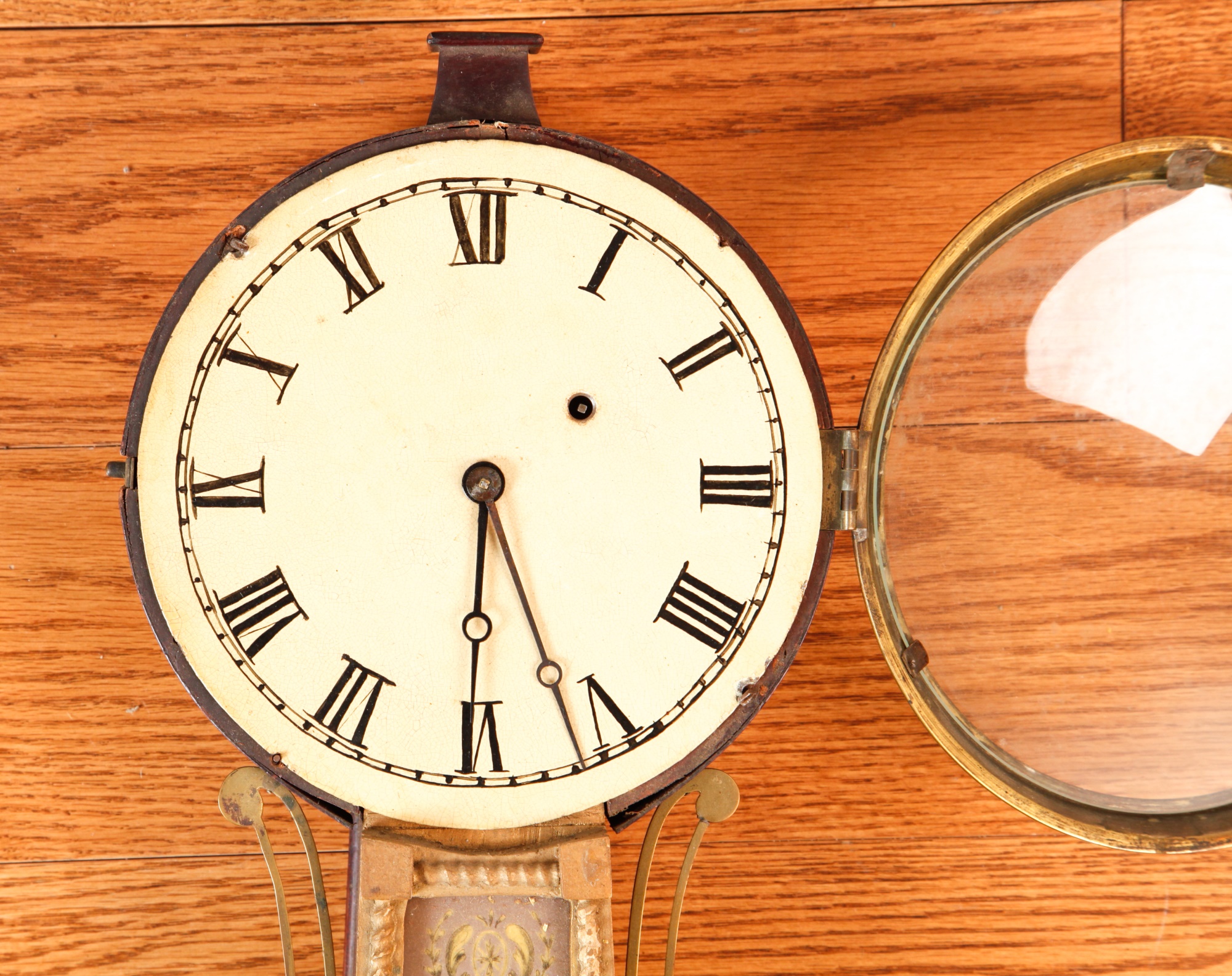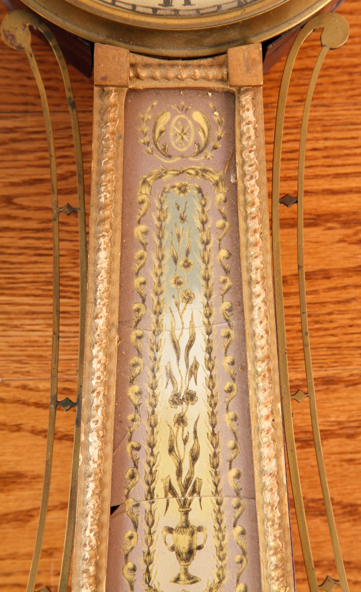 7 1/4 inch dial, reverse painted and eglomise throat and tablet with the Boston State House. 29 1/2 inches Condition: Surface grime, breaks to tablets, final absent Temp No 2346