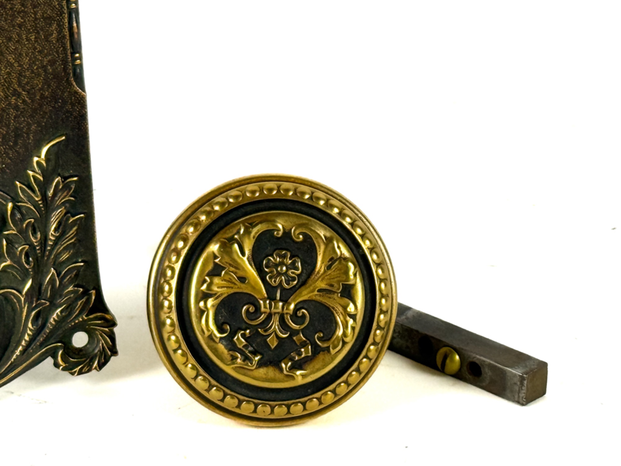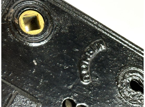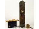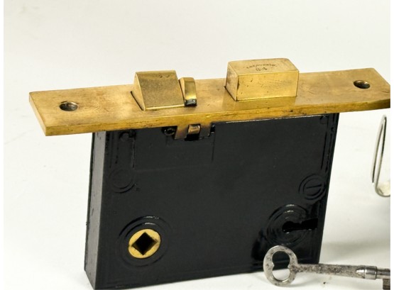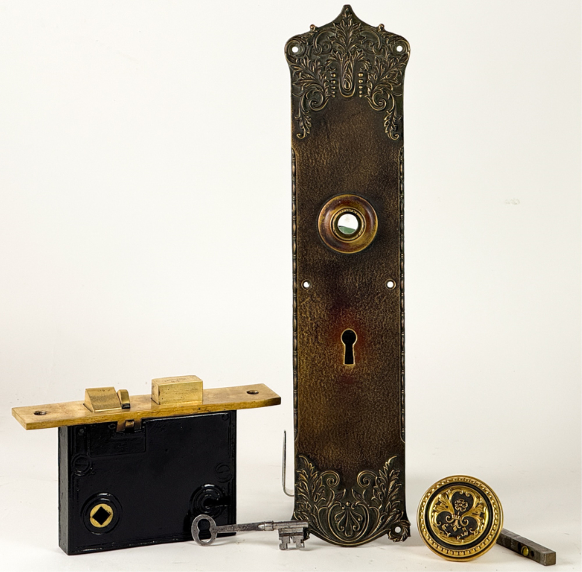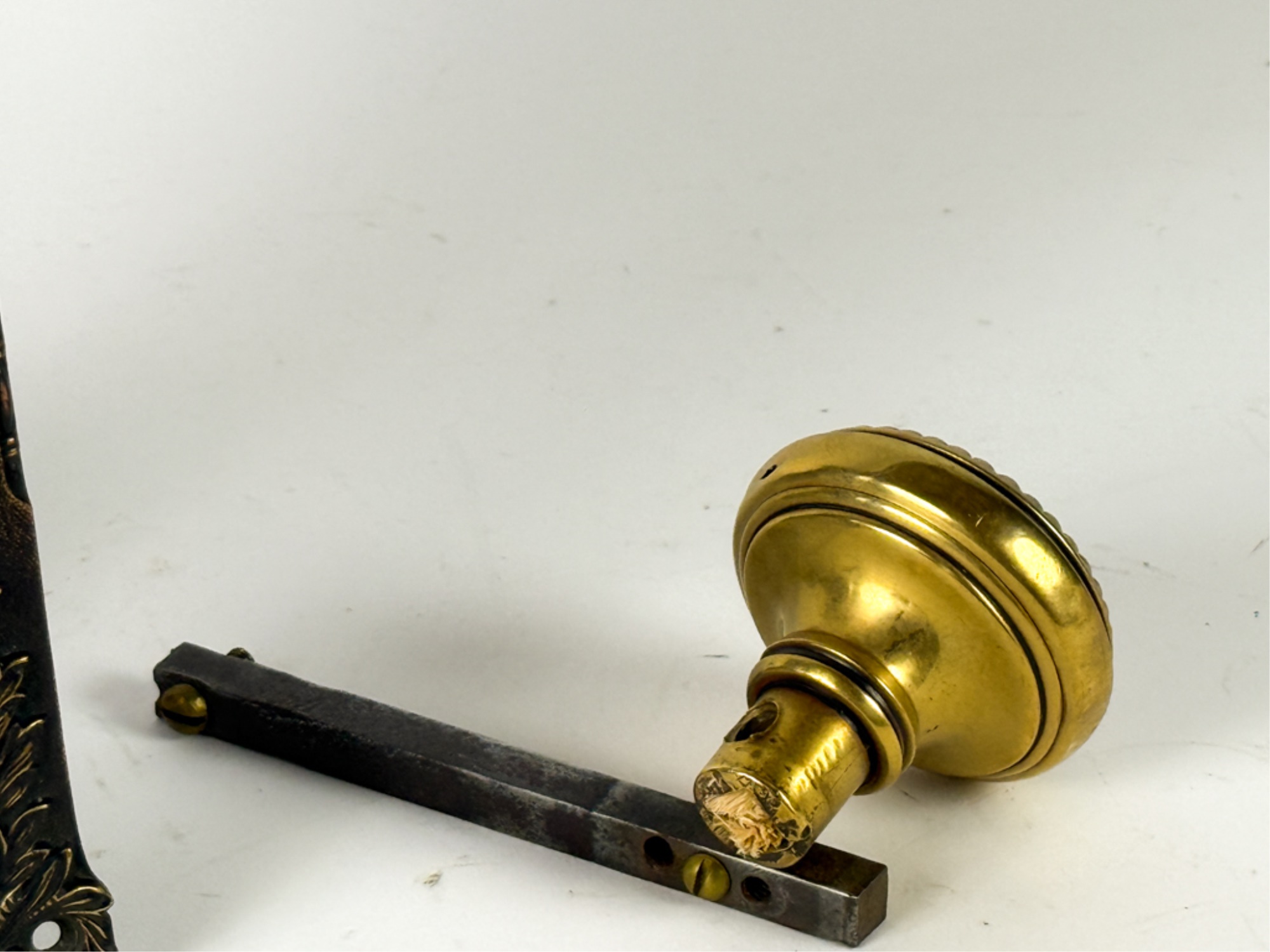 Back Plate and knob, locking mechanism, key and spindle. Plate measures 15 inches. Condition: Good. Temp No 4268
