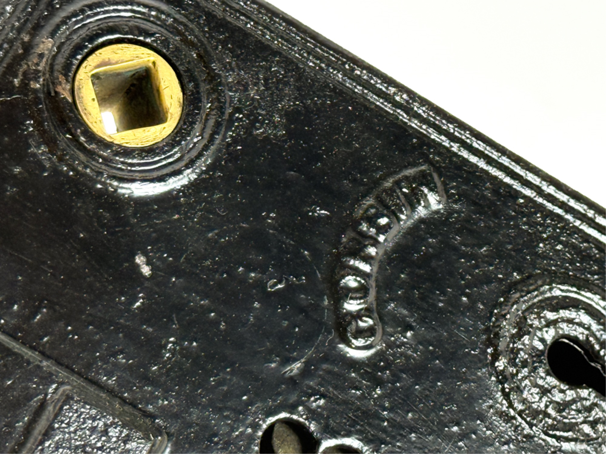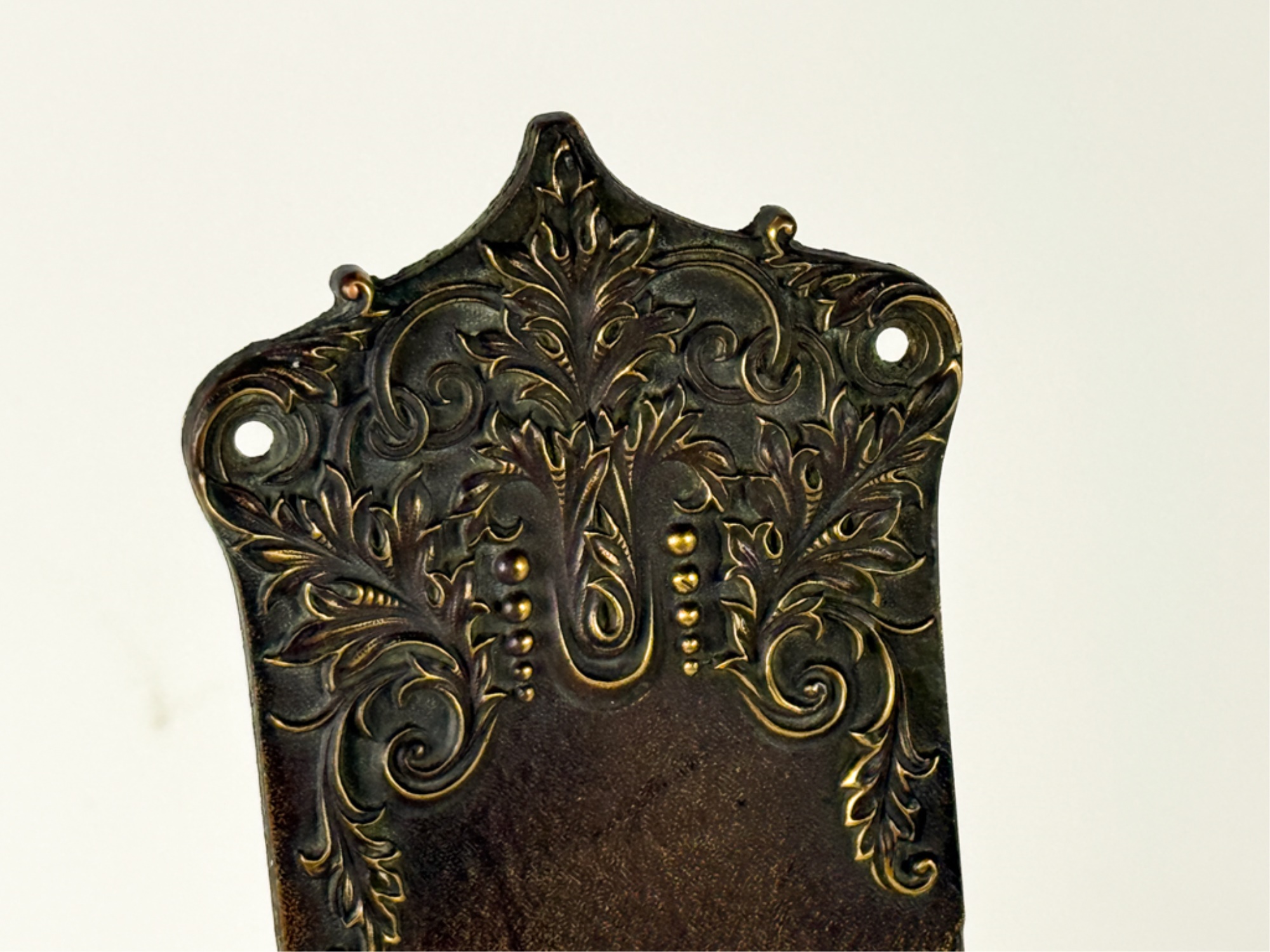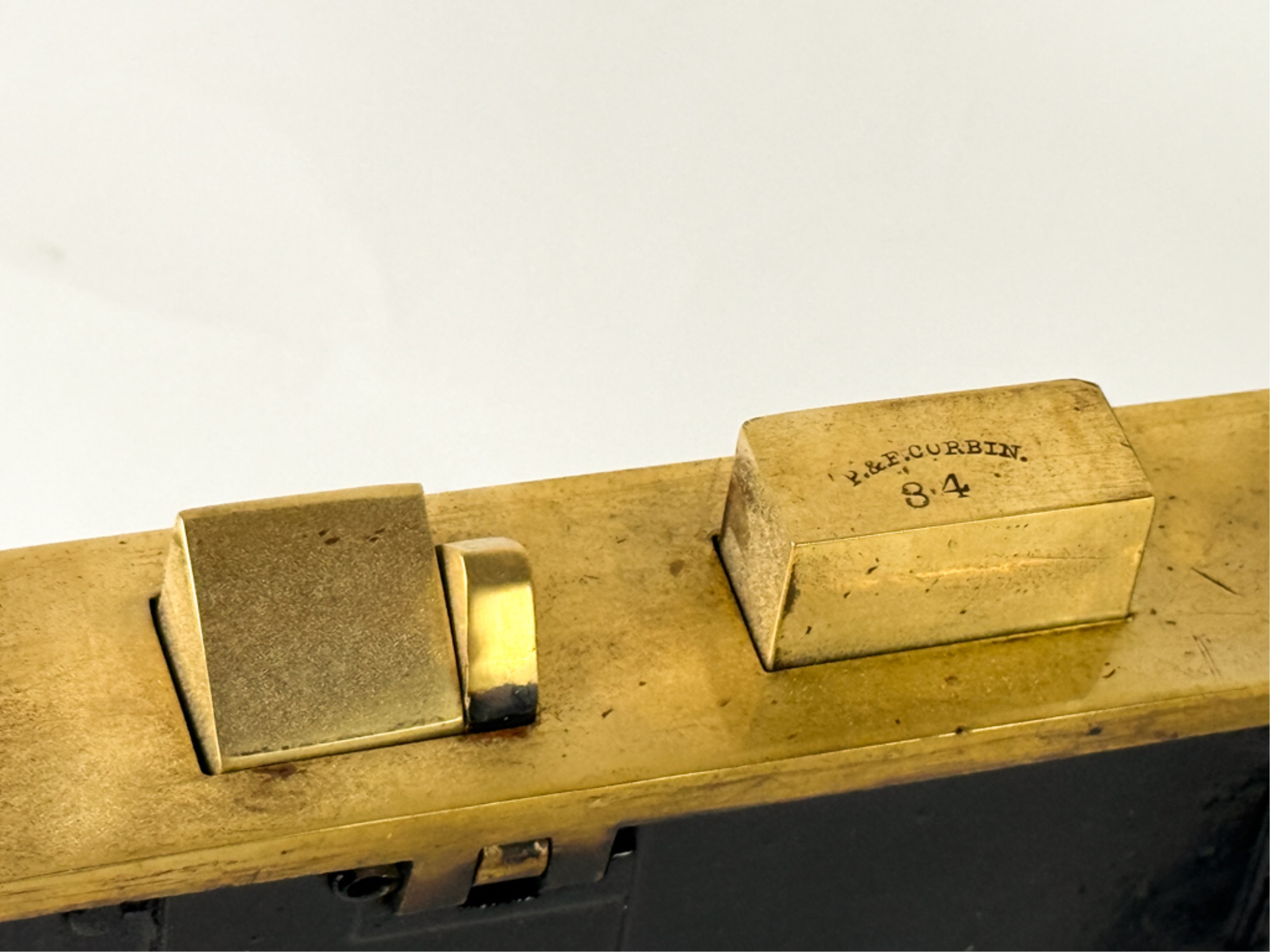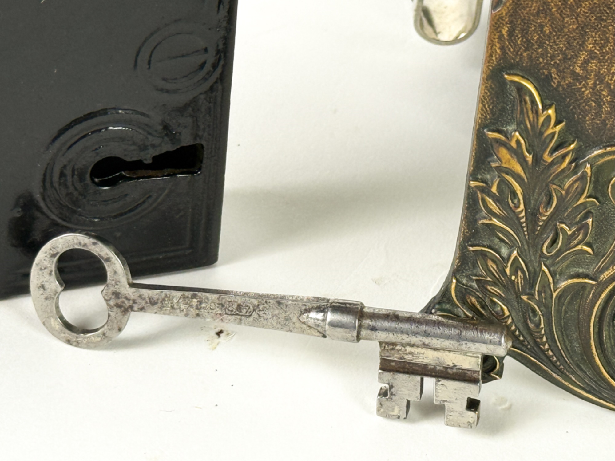 Back Plate and knob, locking mechanism, key and spindle. Plate measures 15 inches. Condition: Good. Temp No 4268