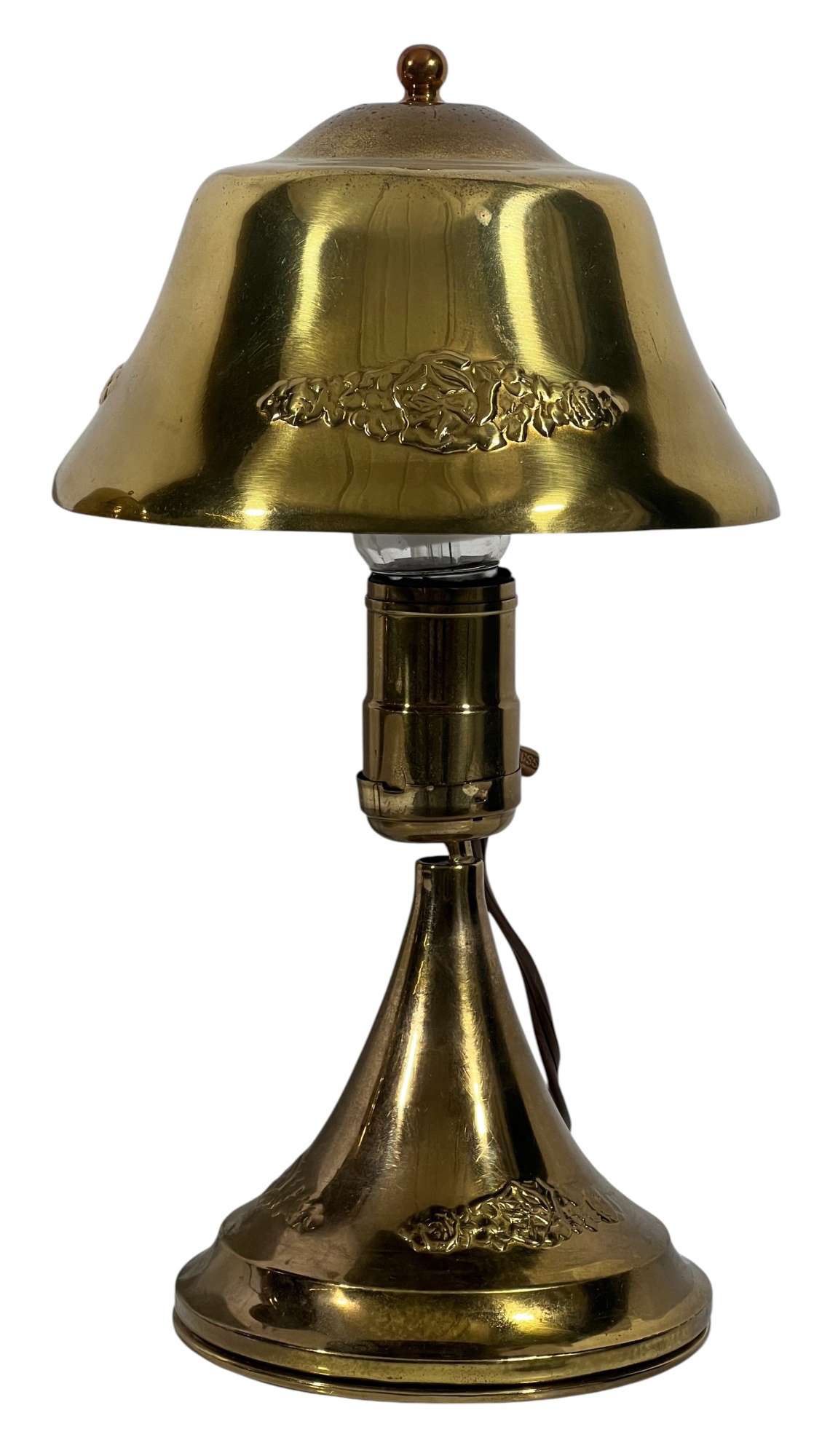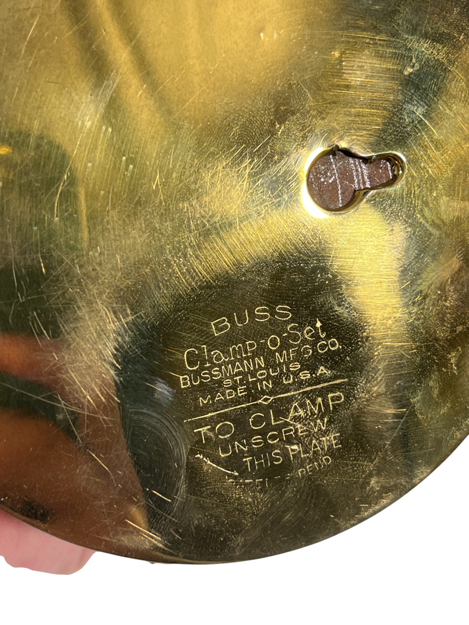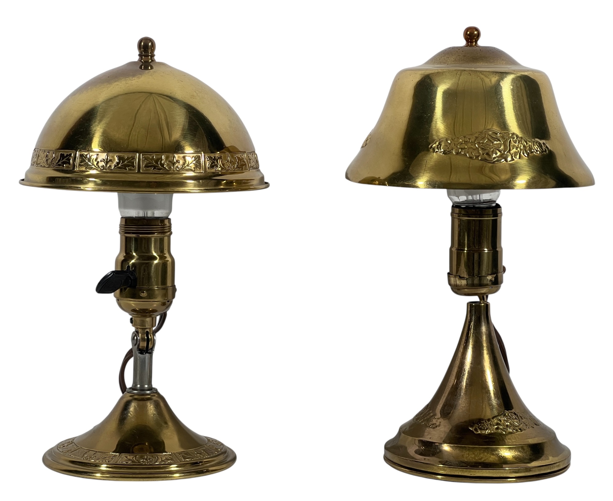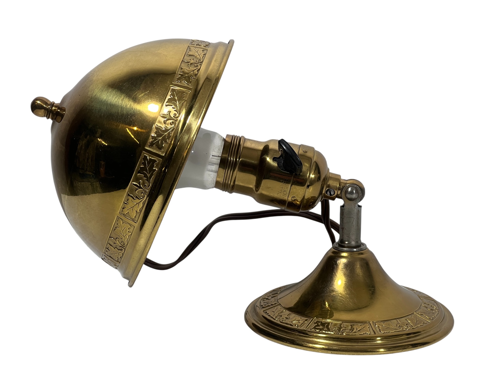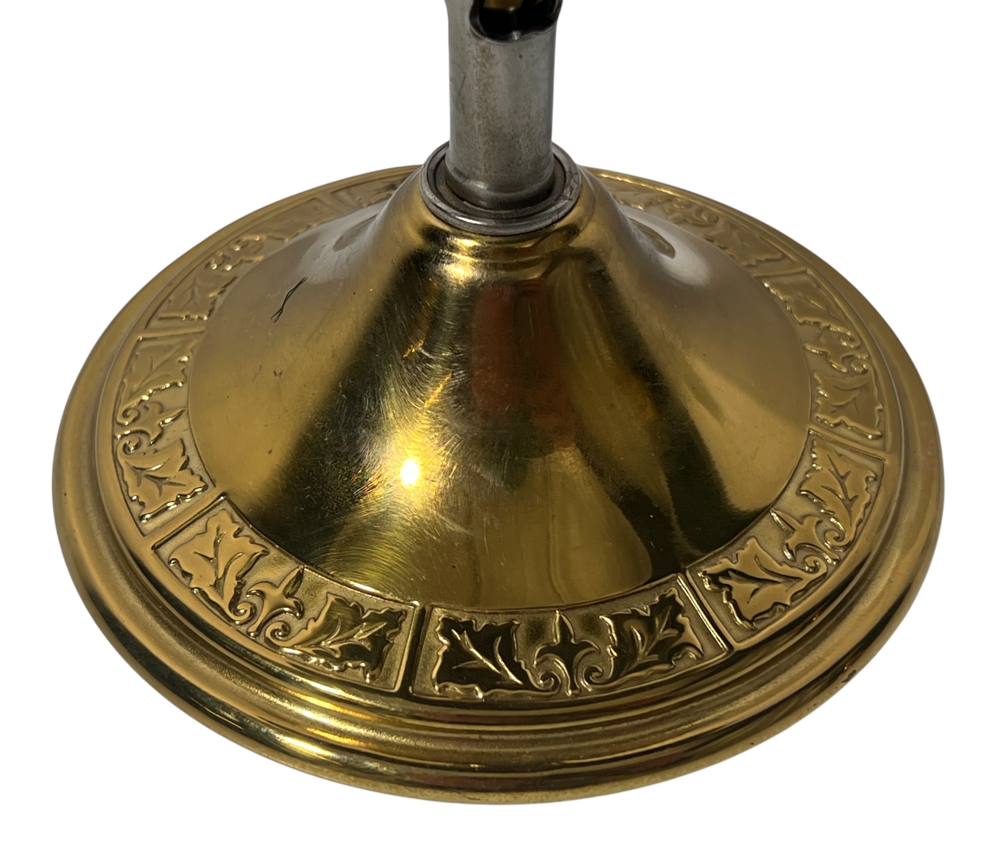 (2) 1920's brass table lamps with adjustable necks than can be clamped anywhere. (1) Buss Clamp-o-Set and (1) with adjustable neck. Nice floral motifs. 7 1/2 x 6 inches. Condition: Good. Untested.