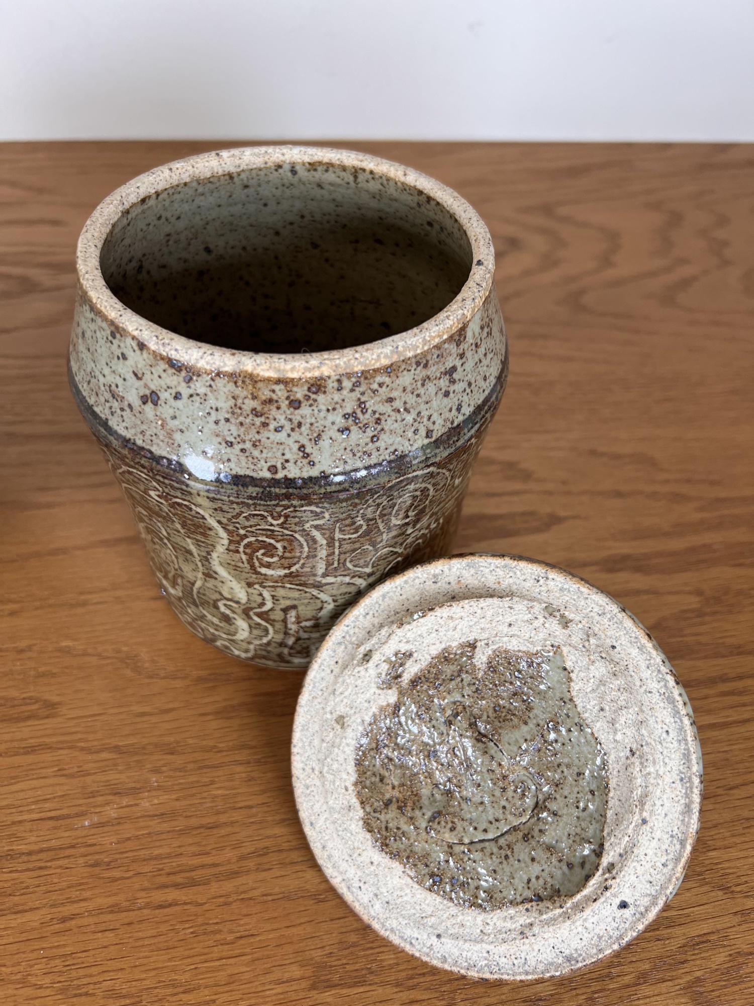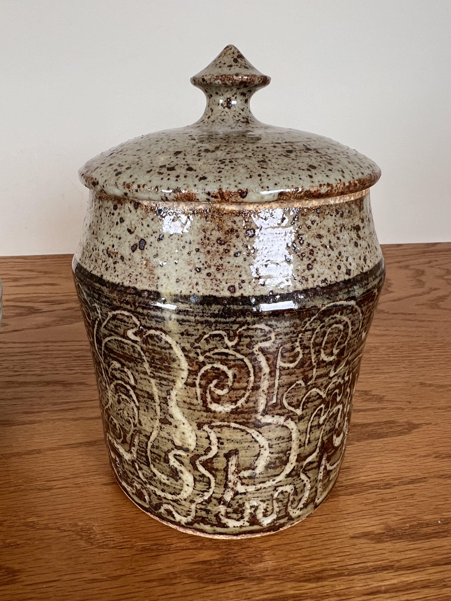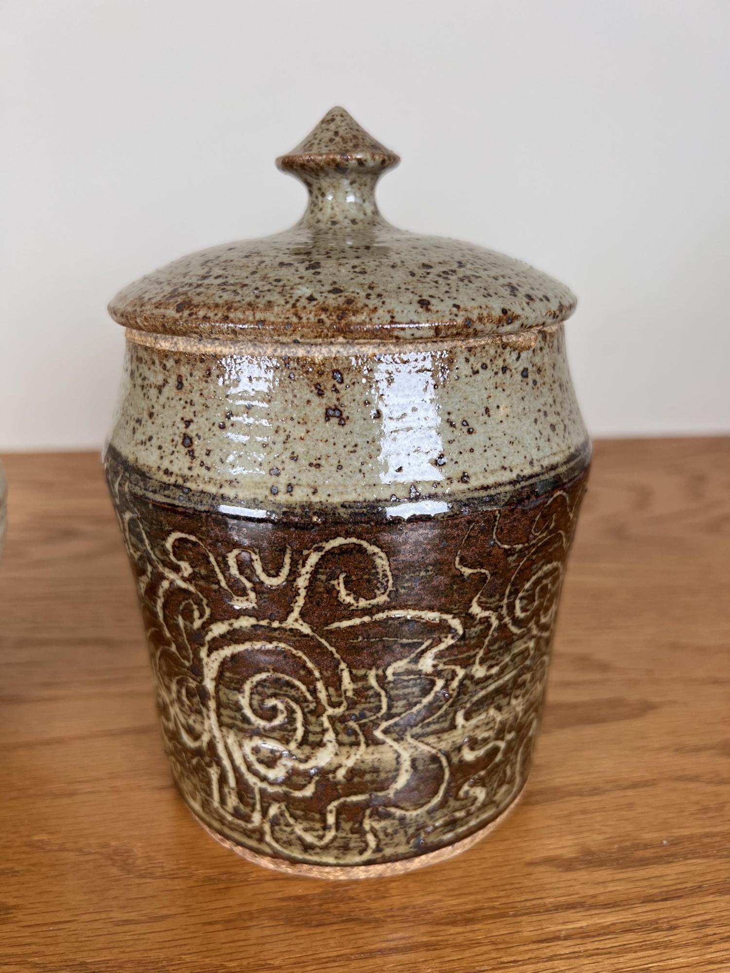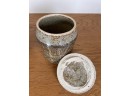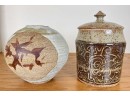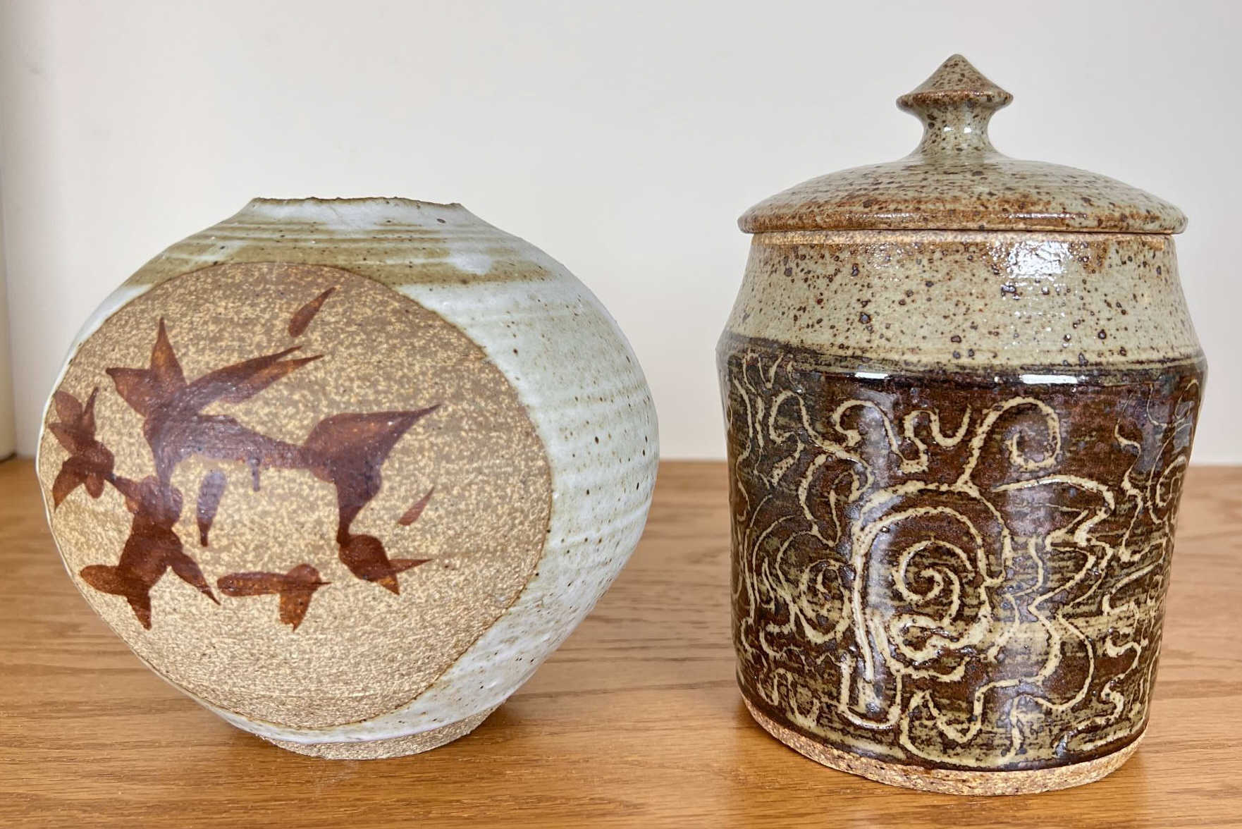 Including an Asian inspired glazed vase signed TeRik? And a covered jar with sgriffito decoration in glaze signed illeg. 5.5 and 6.6 inches Condition: Good