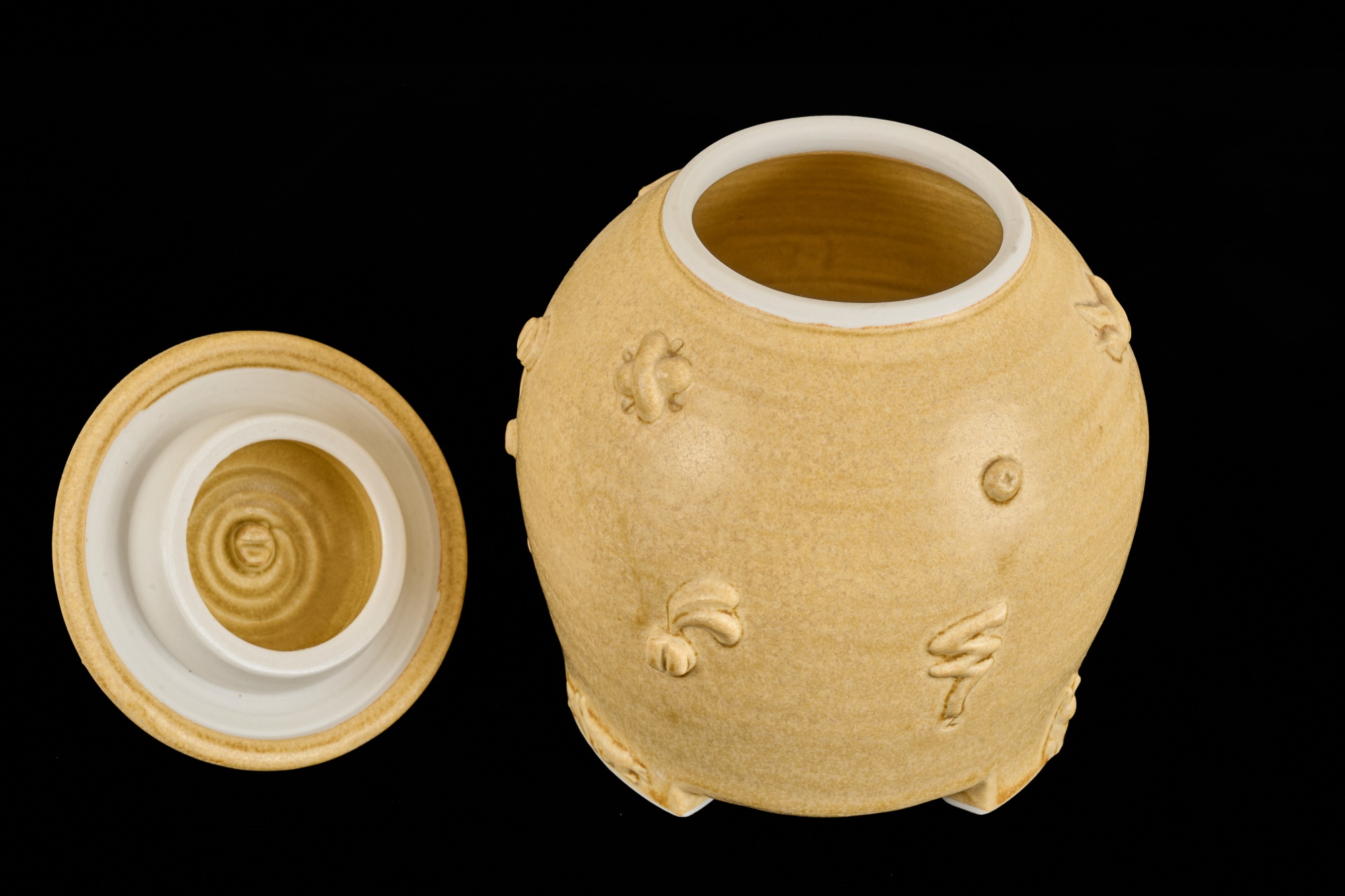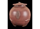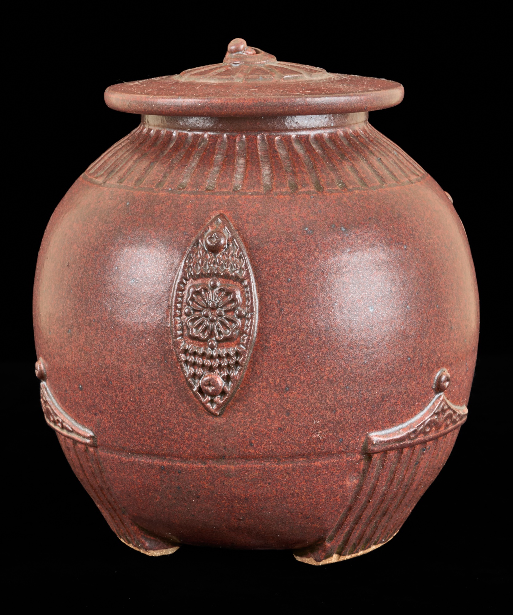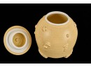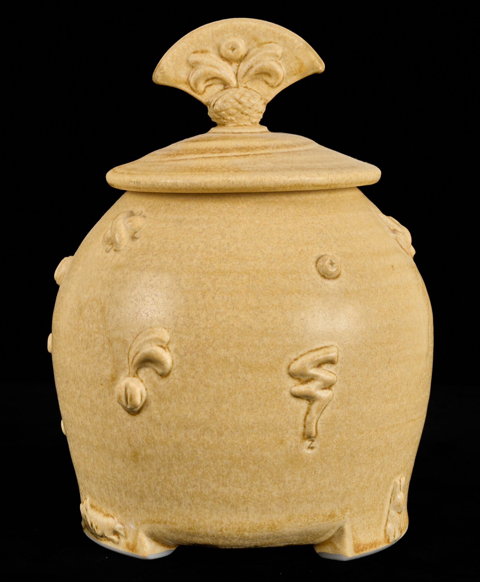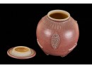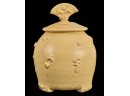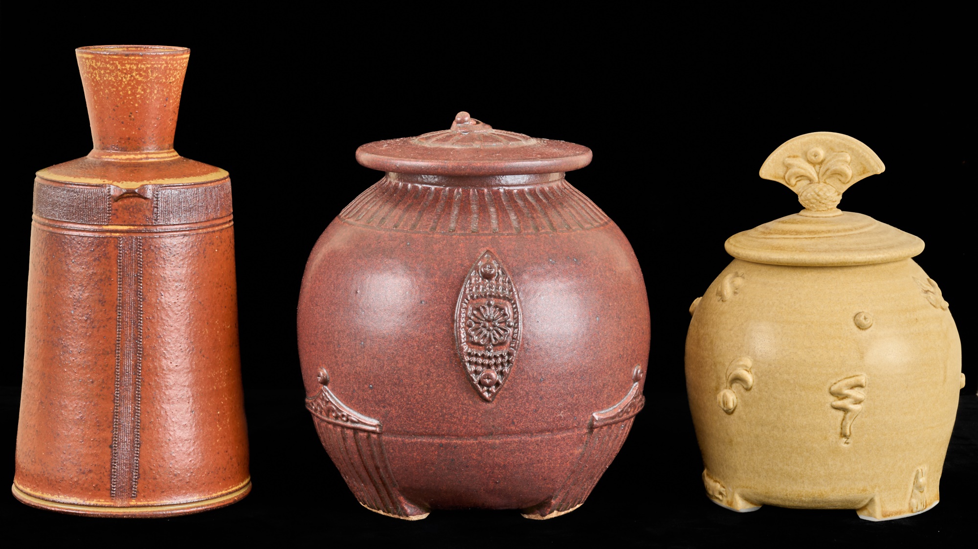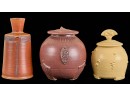 Covered earthenware jar by Susan Douglass, a second taller earthenware example is unsigned as well as the porcelain jar with fan finial. 6 , 7.5 and 8 inches Condition: Good