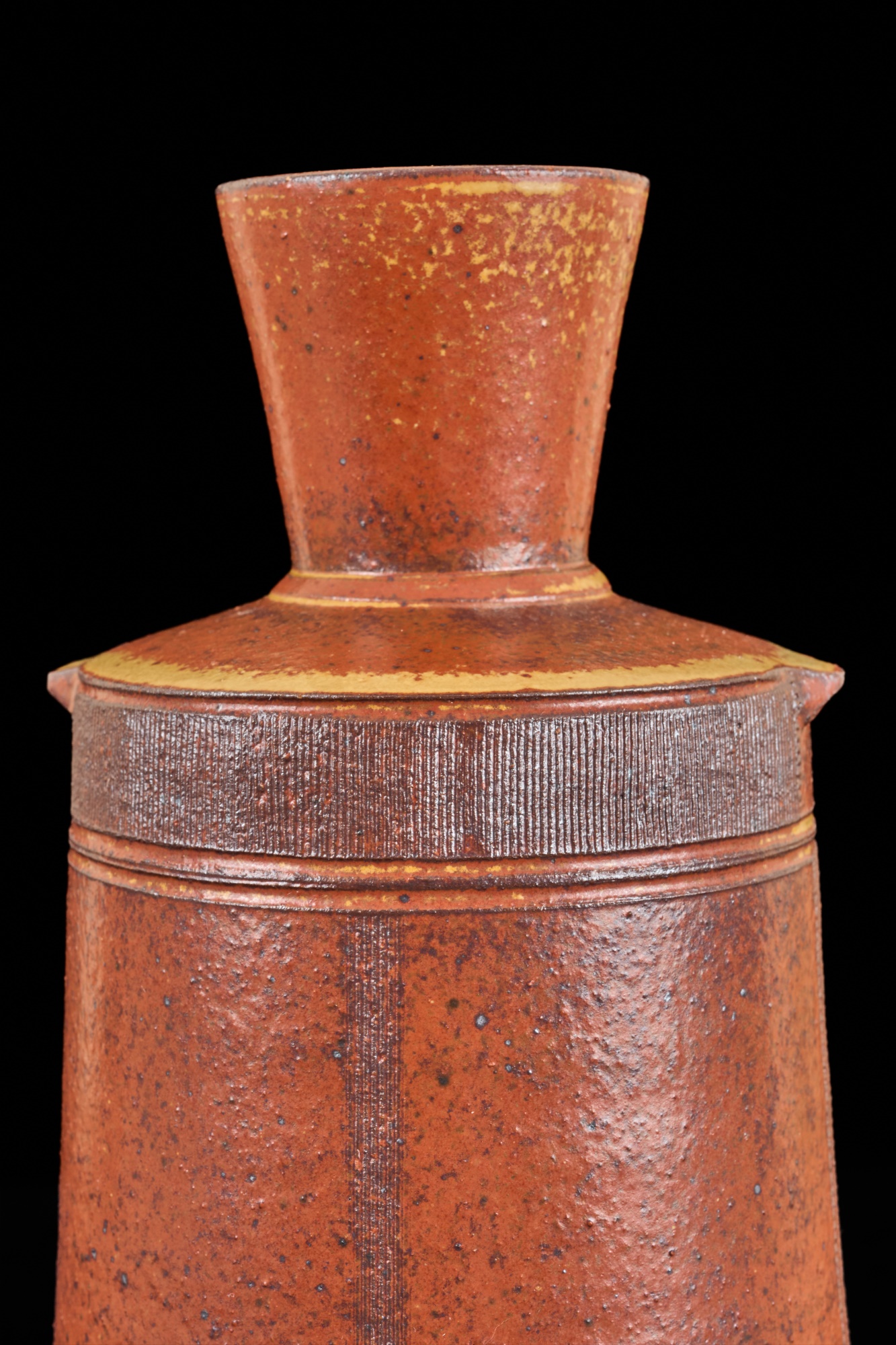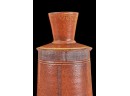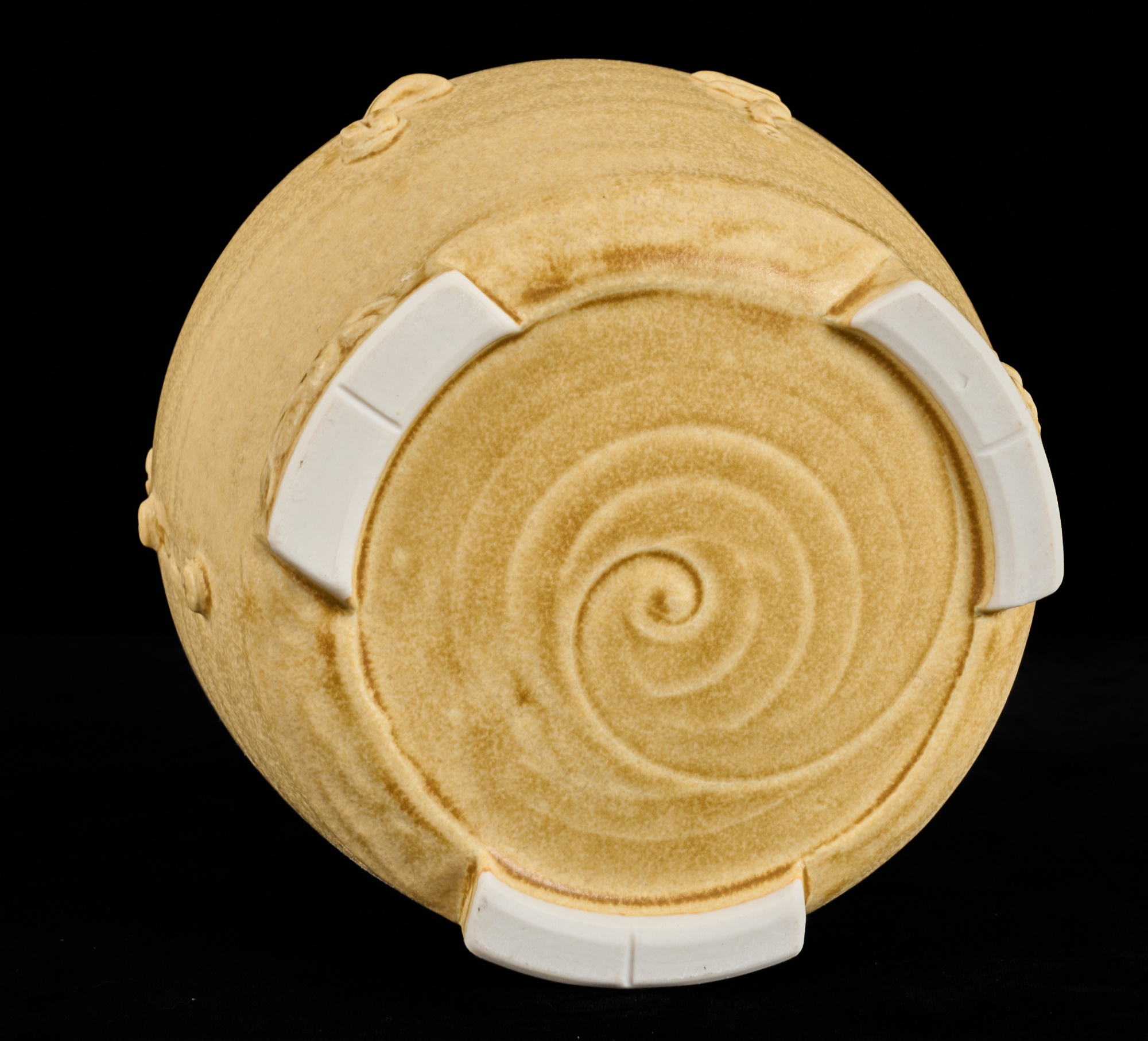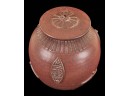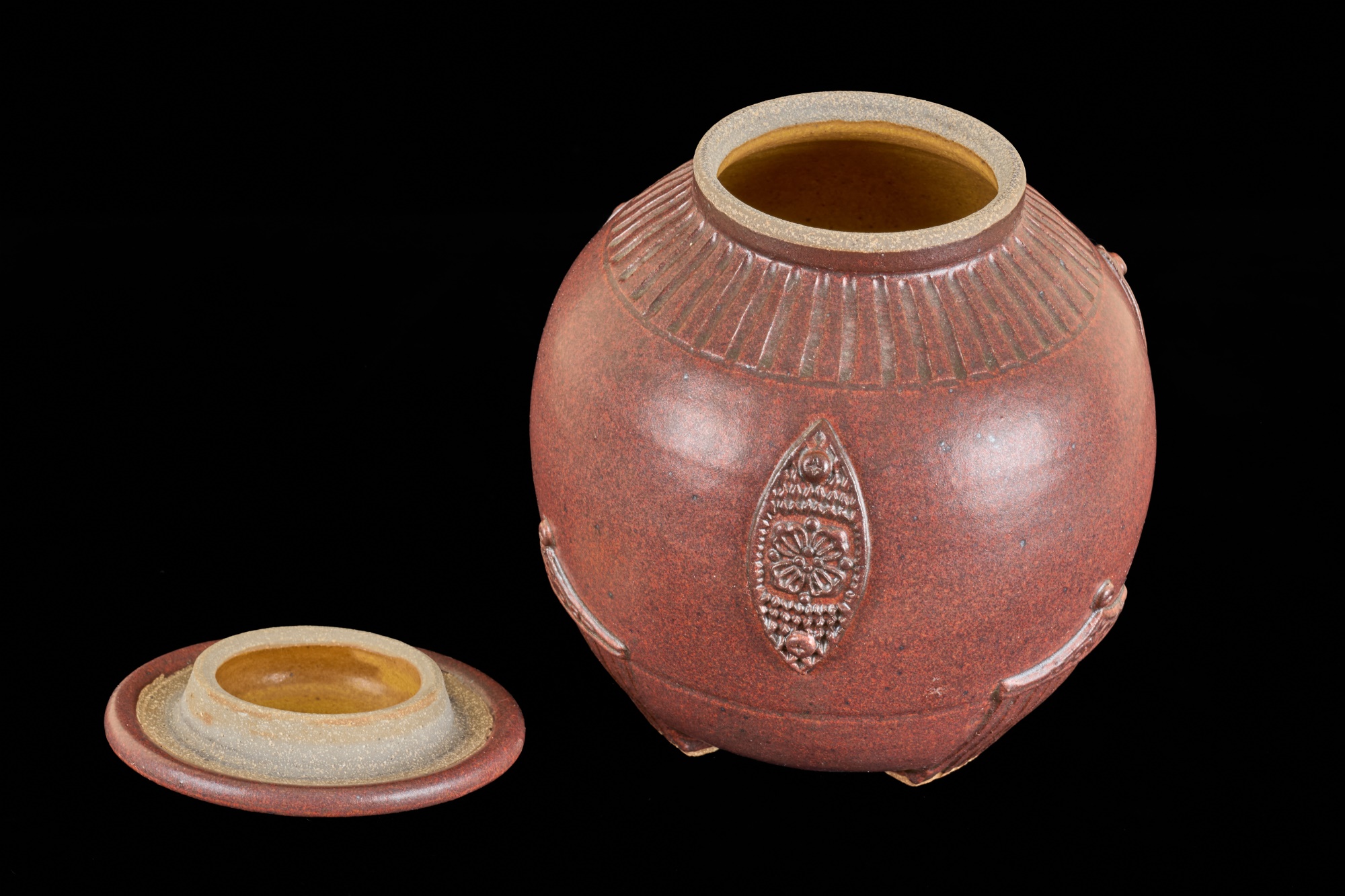 Covered earthenware jar by Susan Douglass, a second taller earthenware example is unsigned as well as the porcelain jar with fan finial. 6 , 7.5 and 8 inches Condition: Good