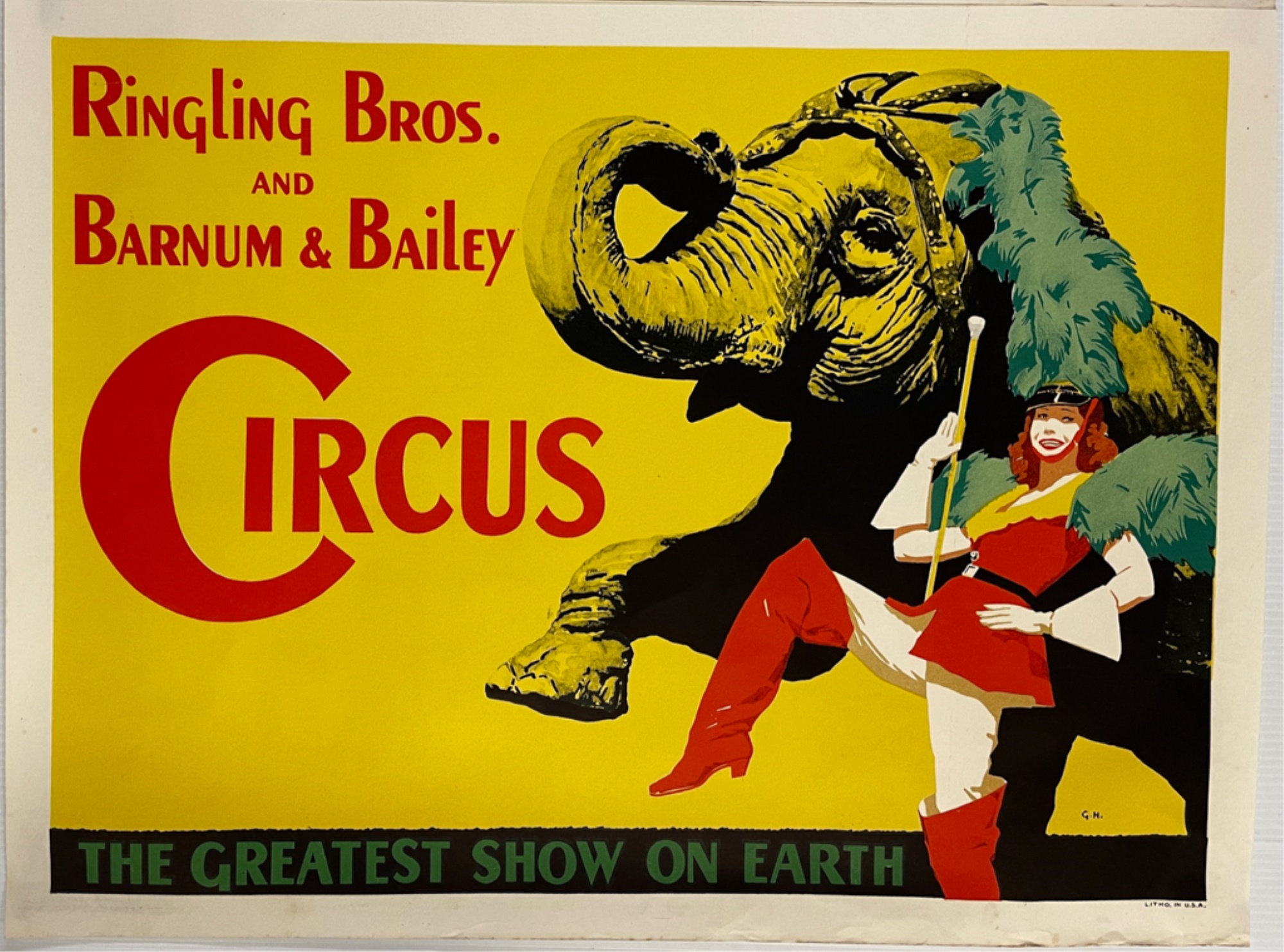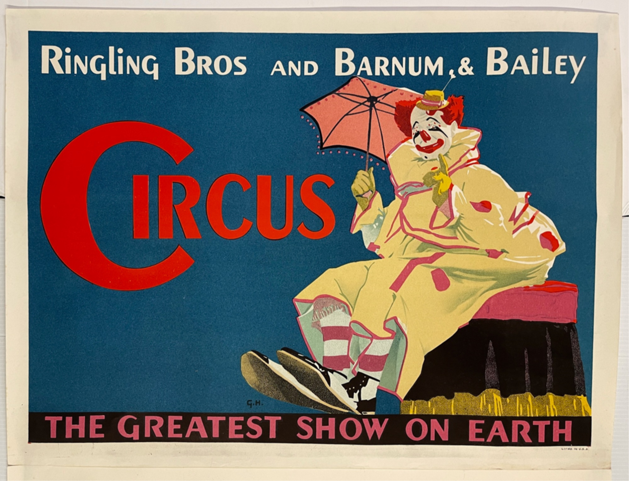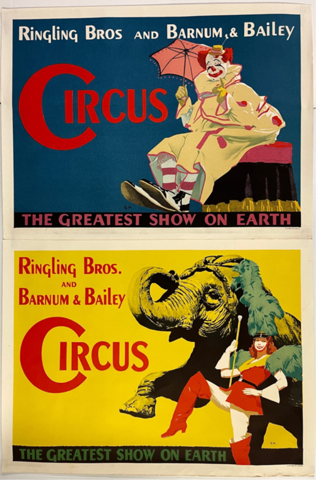 Half sheet horizontal Clown and Elephant Circus Posters by George Howe. 21 x 28 inches