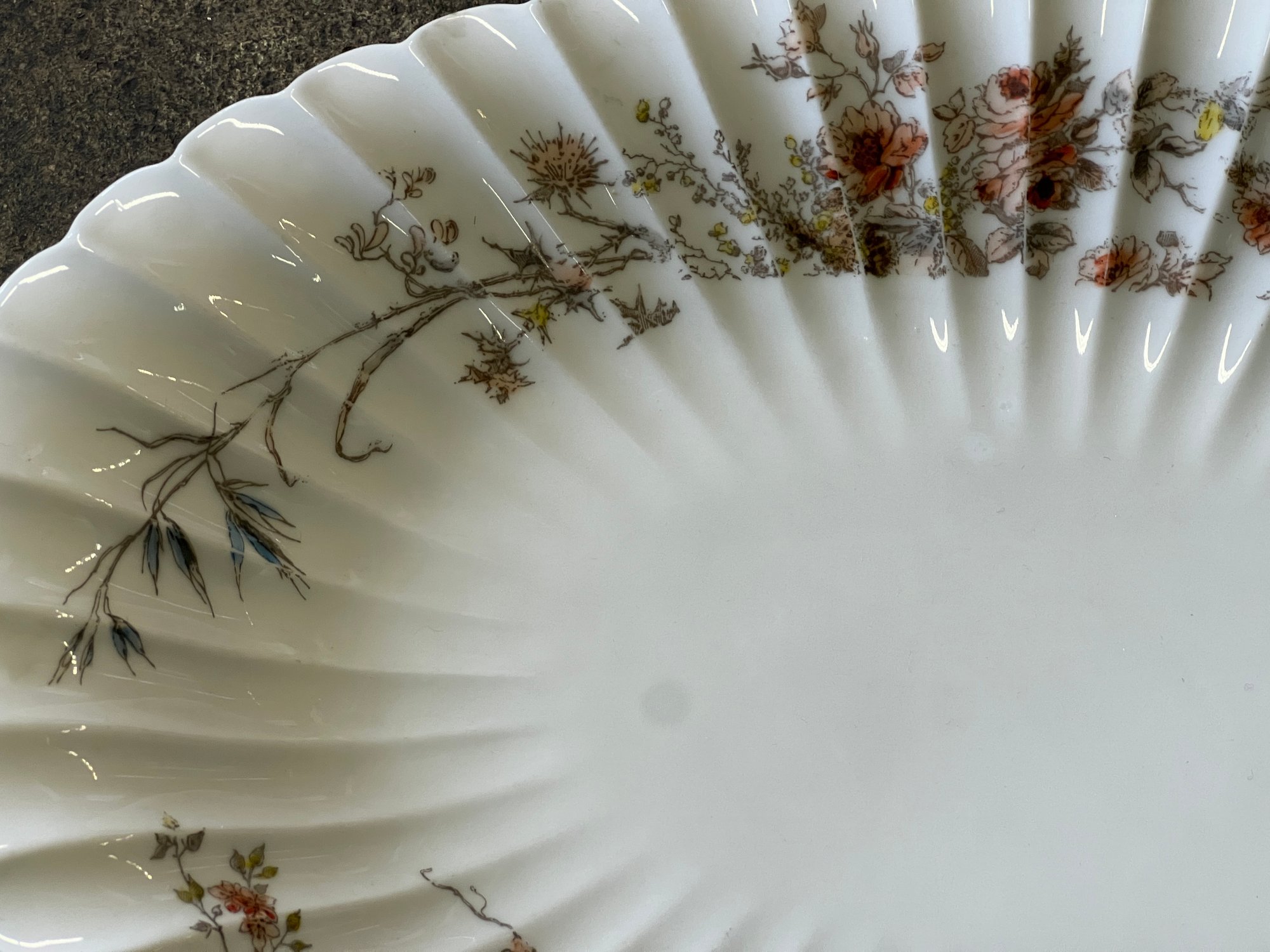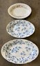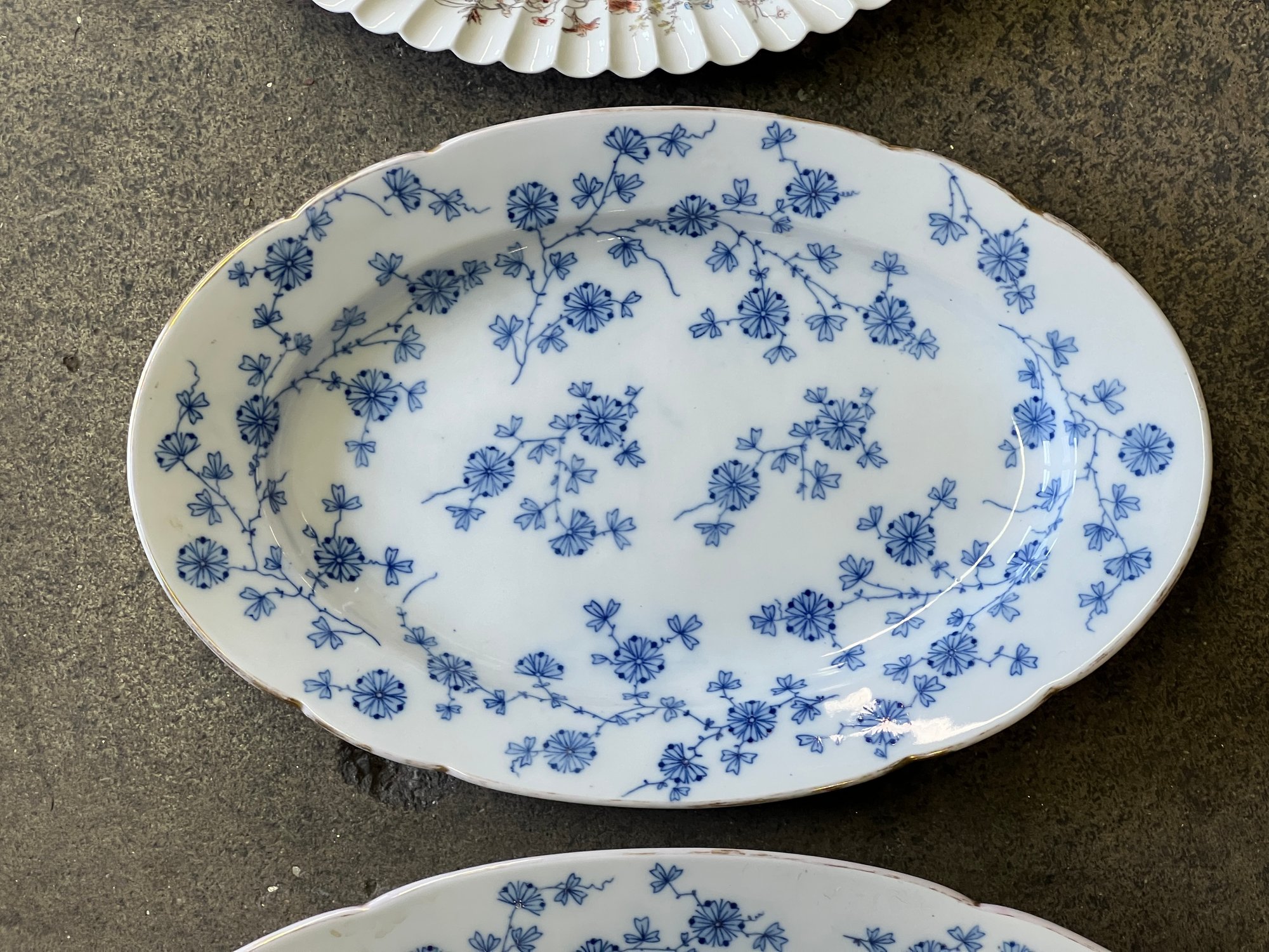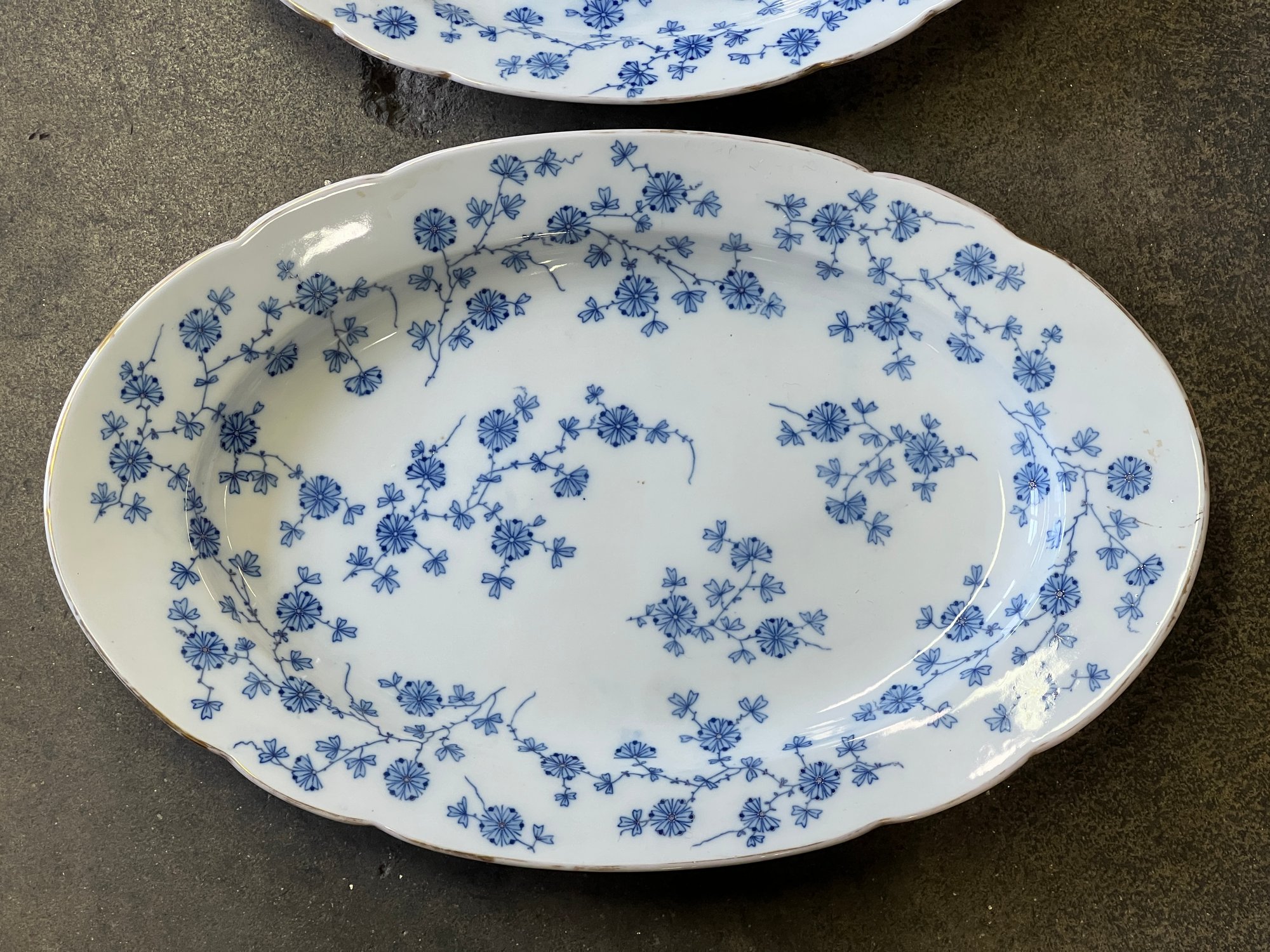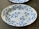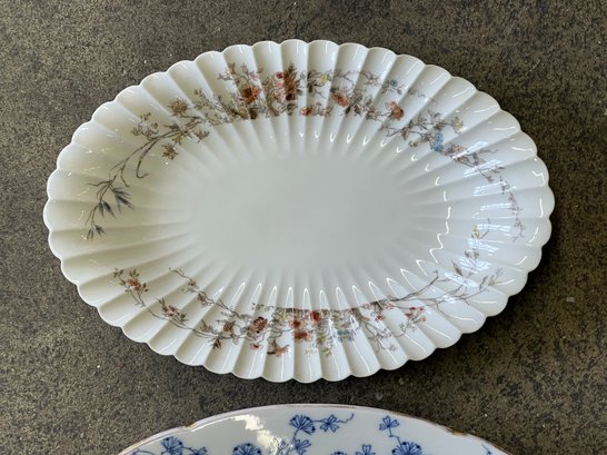 (2) F & M porcelain platters with blue floral pattern along with a floral Limoges porcelain platter. Largest measures 15 1/2 x 23 1/2 inches.