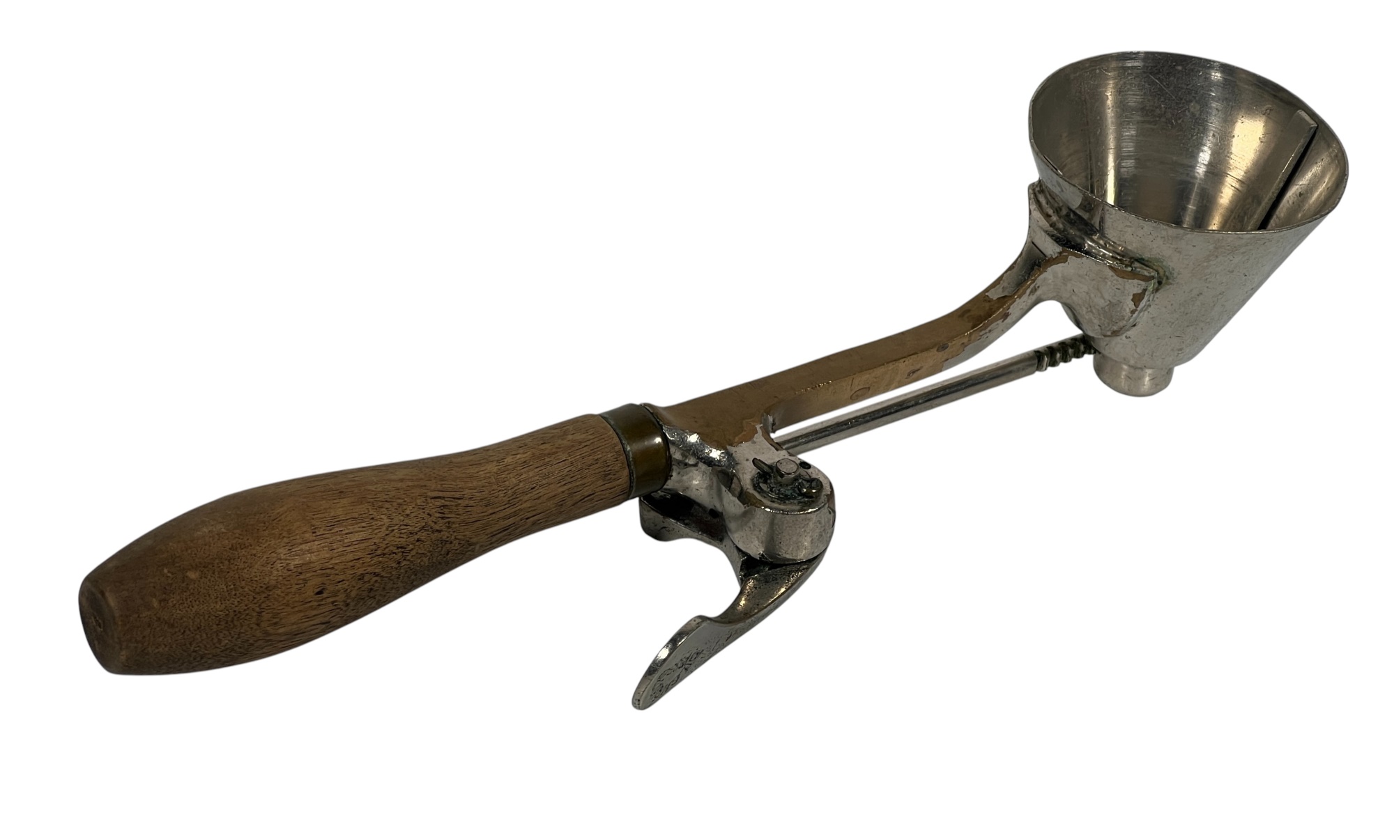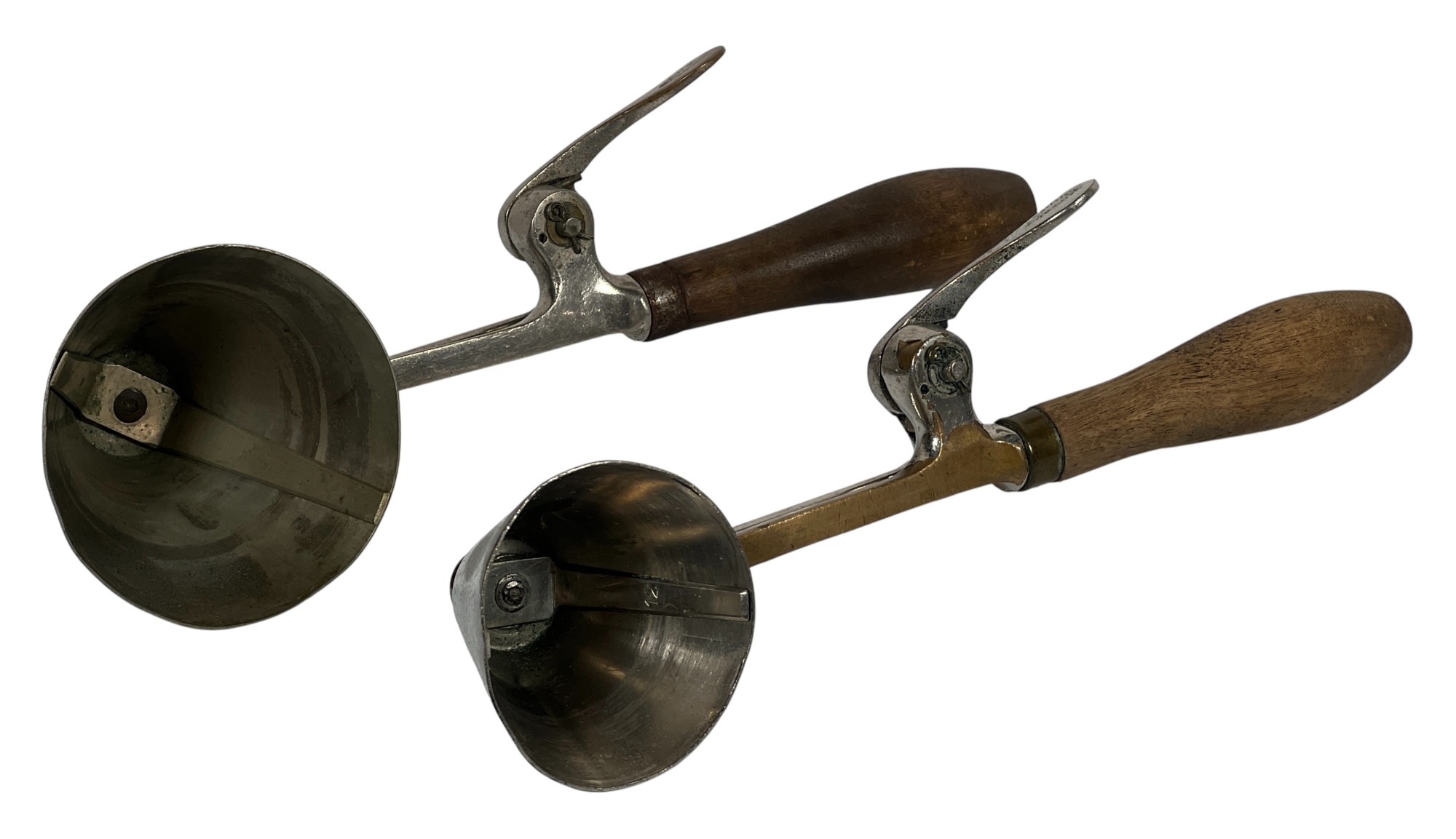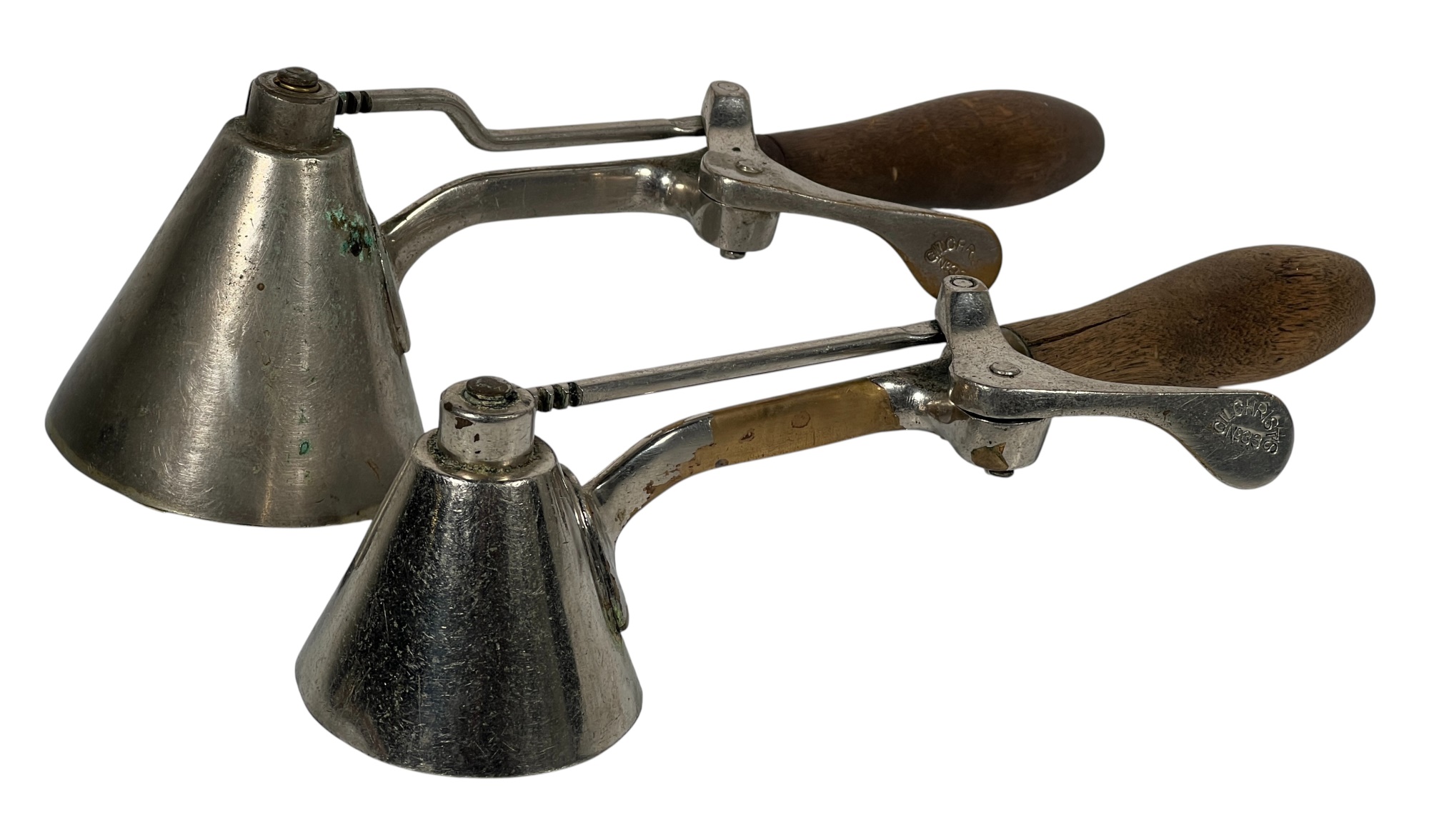 (2) early (20th c) Gilchrist's no. 33 ice cream scoops with cone shaped heads and gear action sweeping arms. Chromed brass and wood. 10 inches. Condition: Wear/loss to chrome from age & use. Temp No 8705