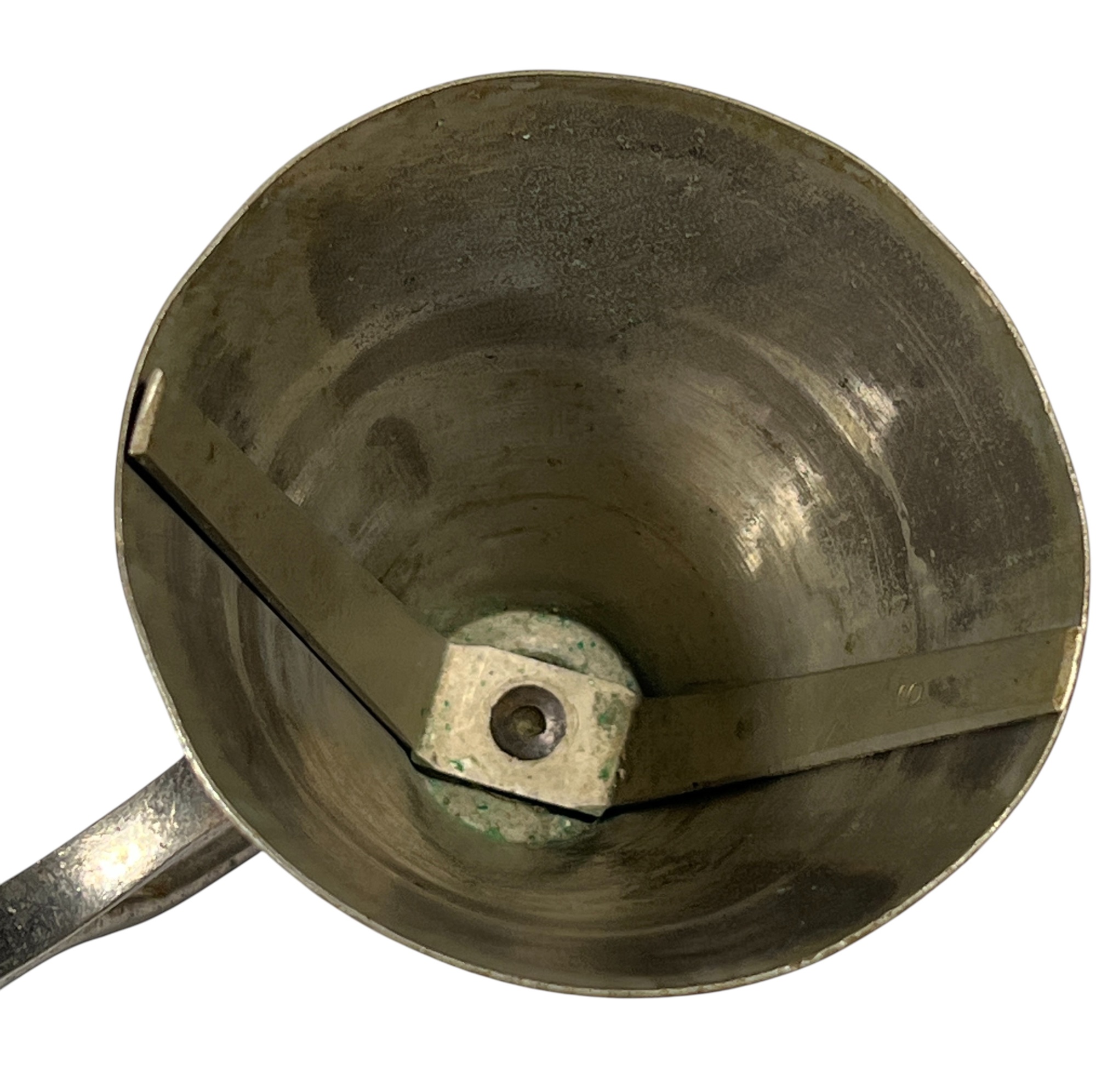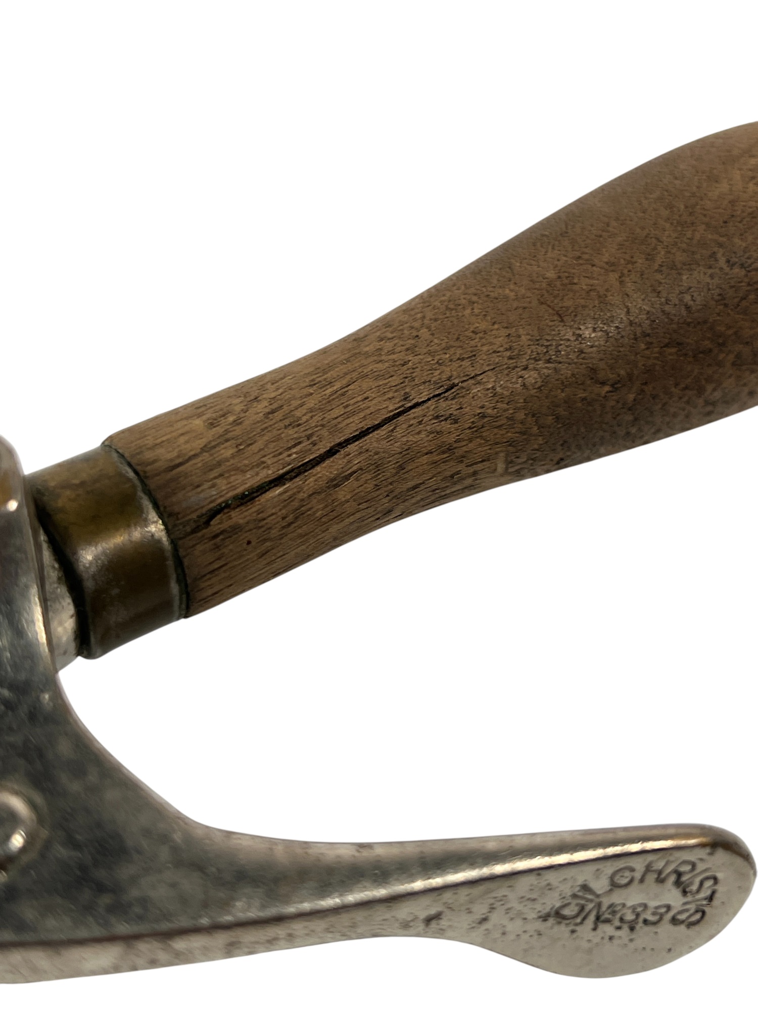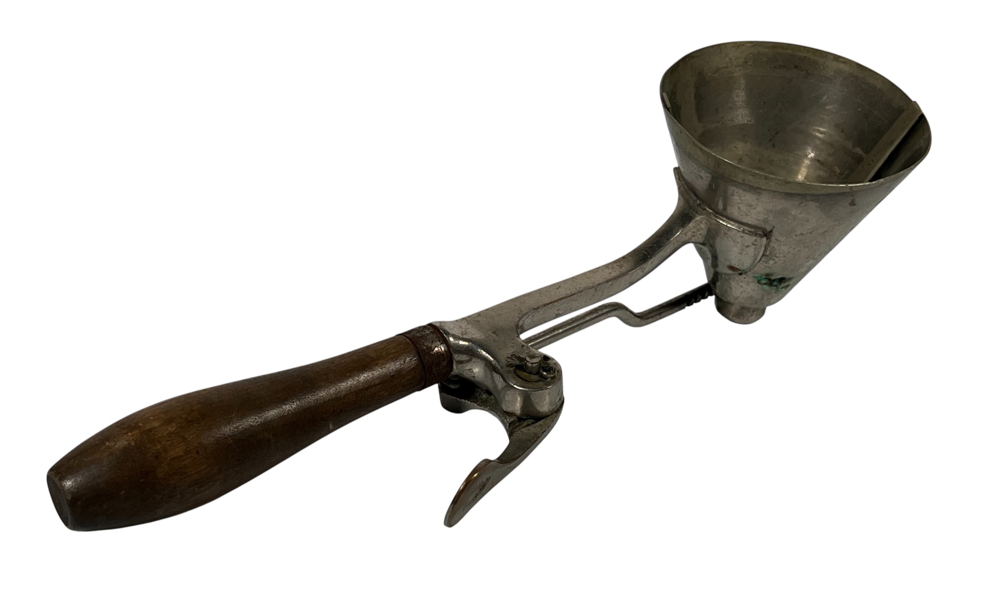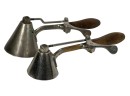 (2) early (20th c) Gilchrist's no. 33 ice cream scoops with cone shaped heads and gear action sweeping arms. Chromed brass and wood. 10 inches. Condition: Wear/loss to chrome from age & use. Temp No 8705