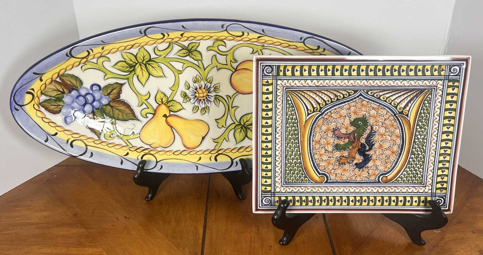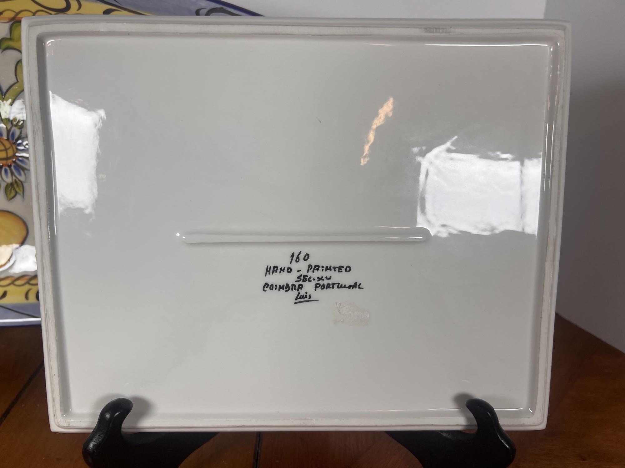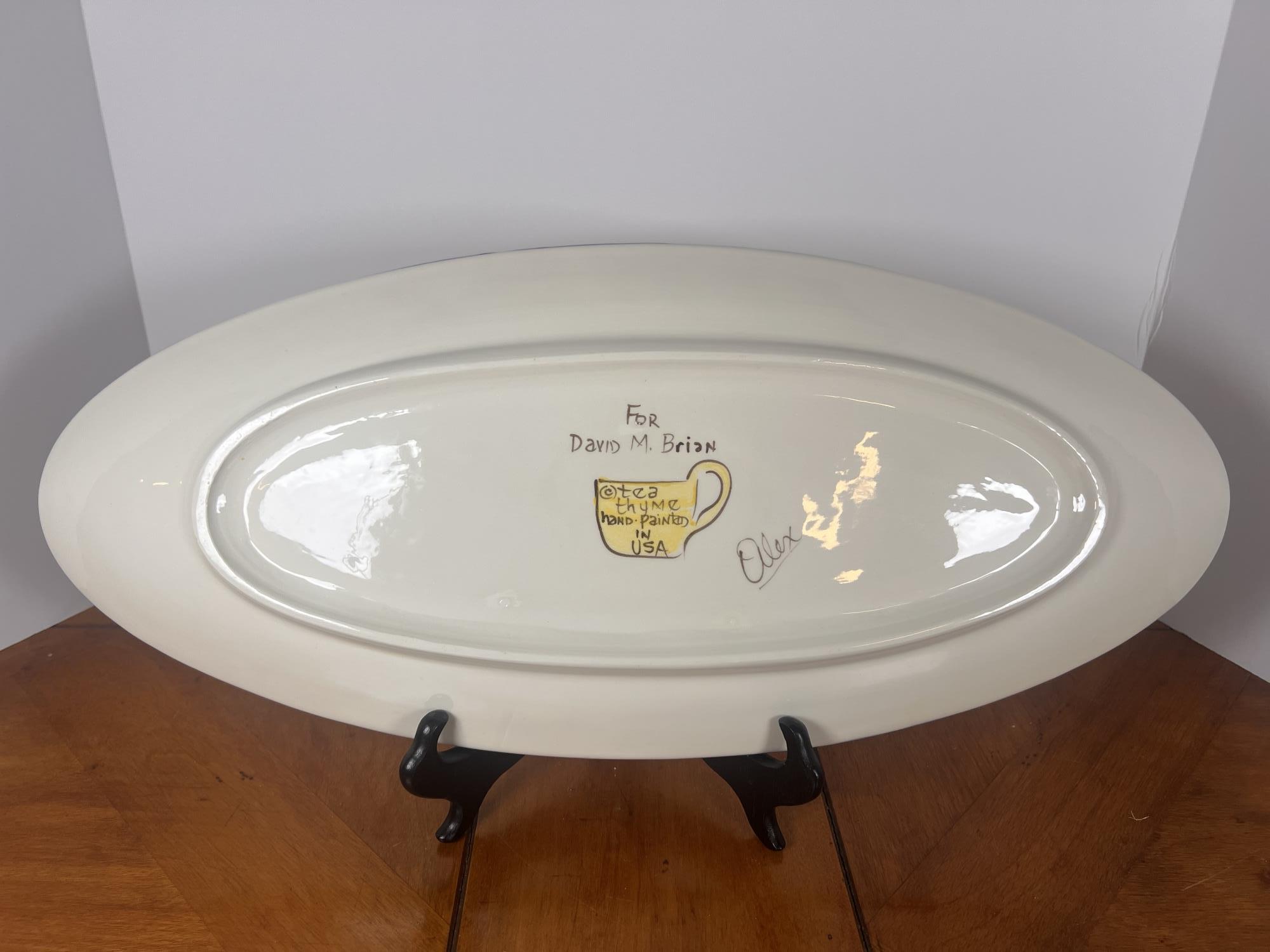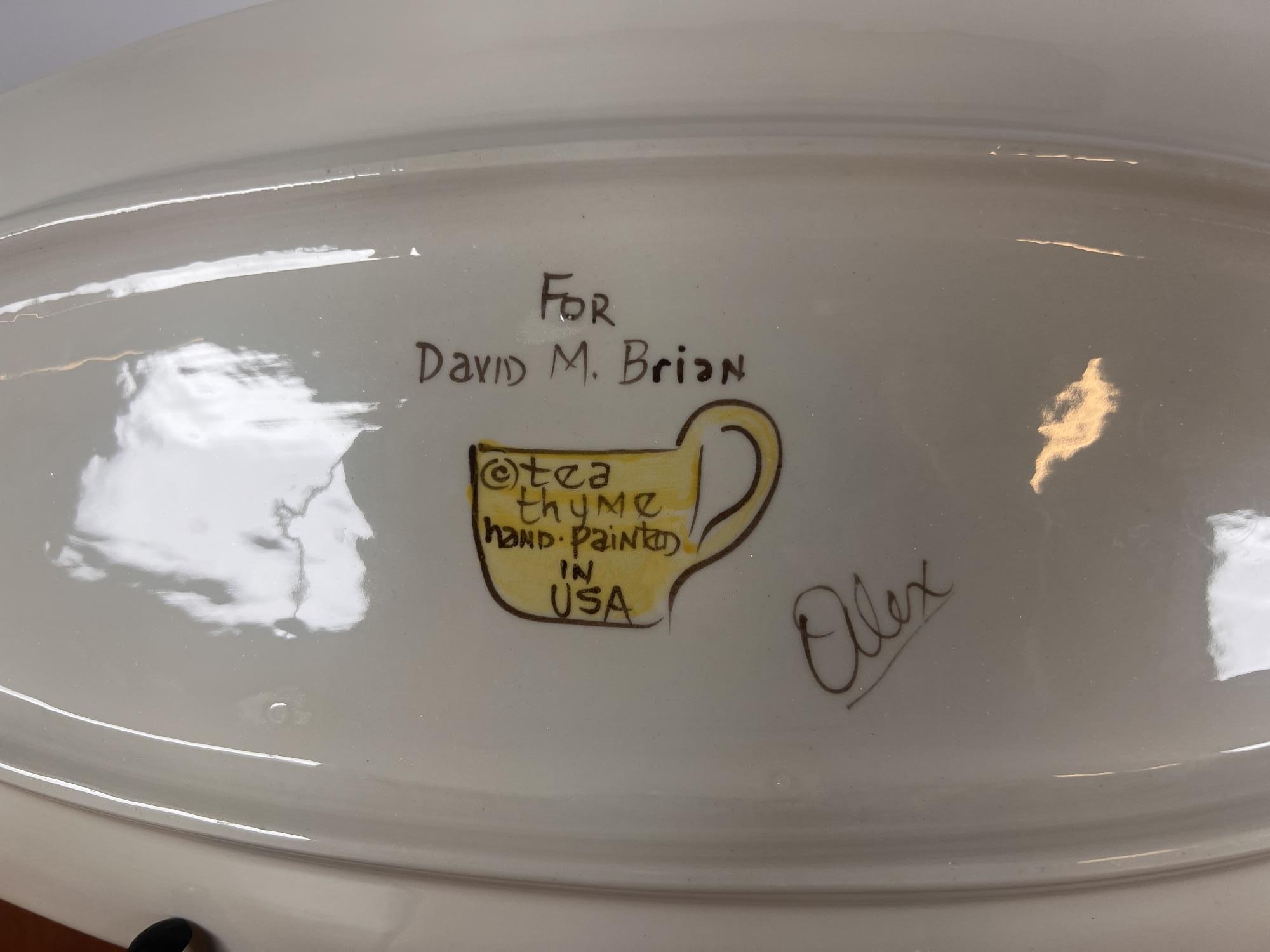 Platter signed and hand painted by Alex at Tea Thyme, personalized for David M. Brian. Porcelain trivet from Portugal signed "Luis". Platter is 21" long Condition: Good Temp No 6447