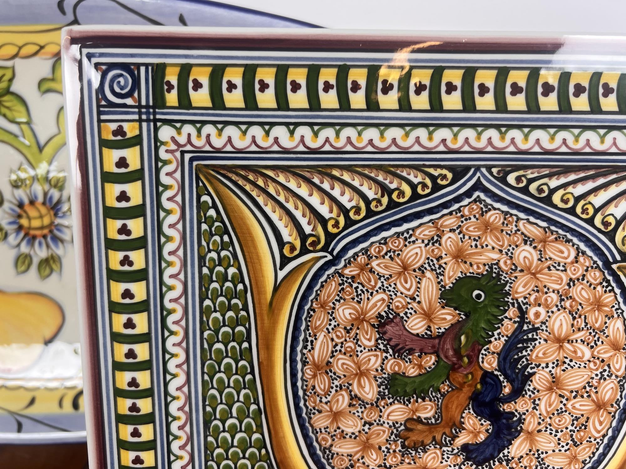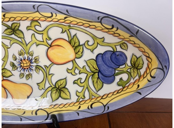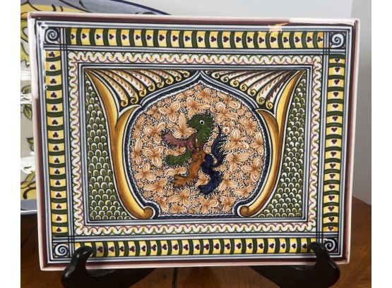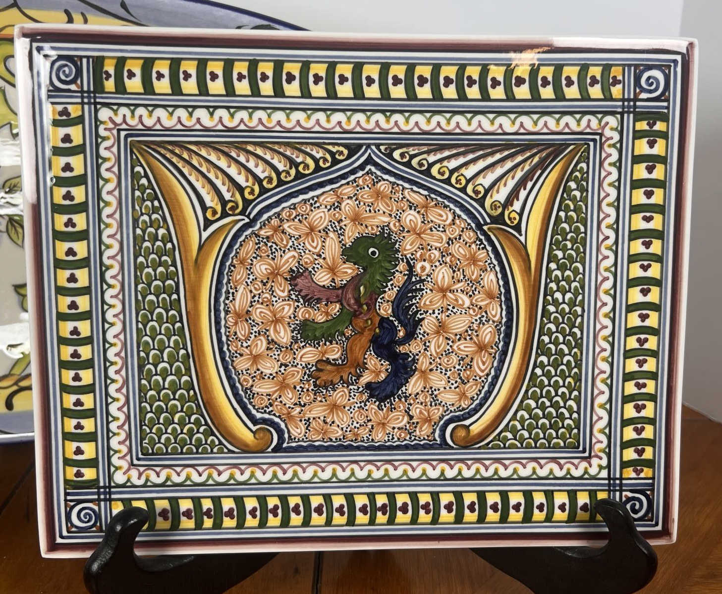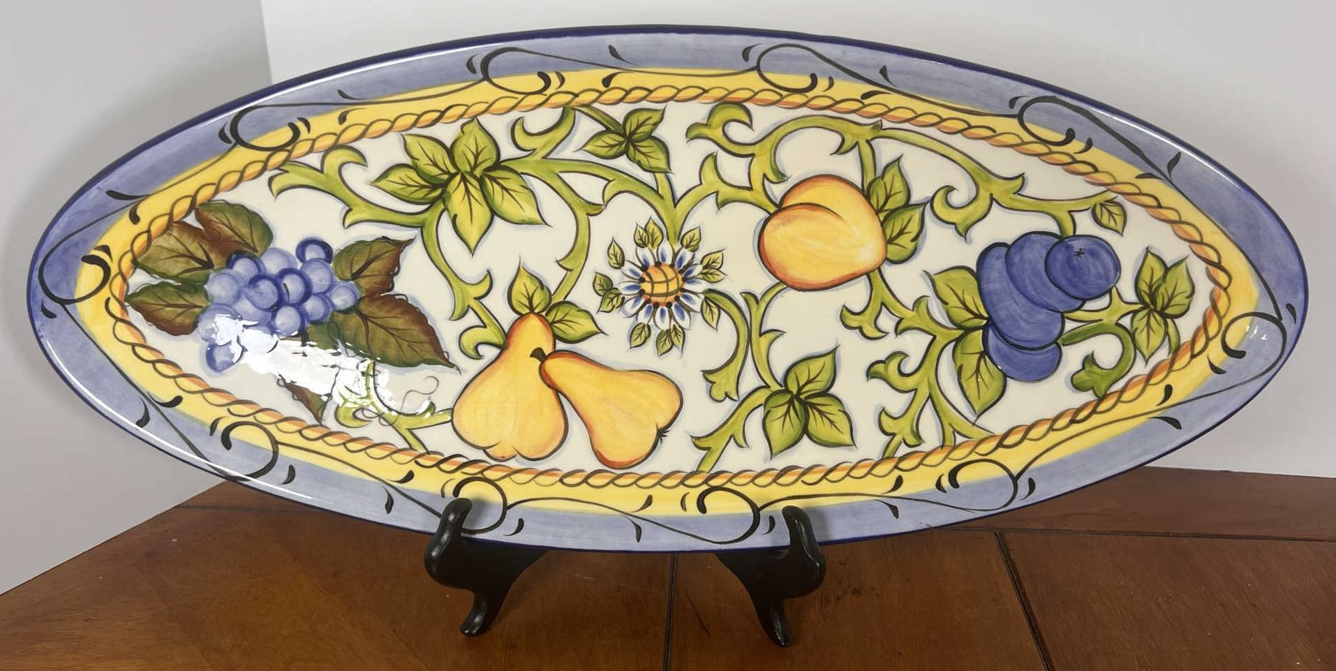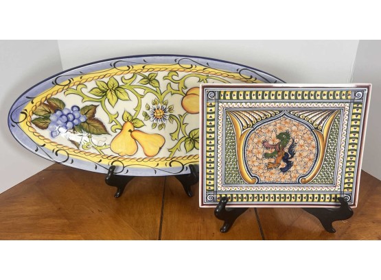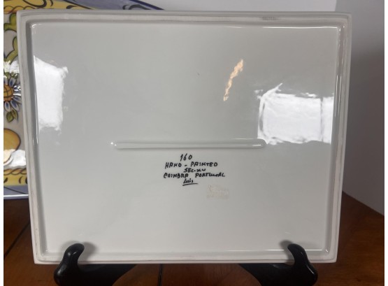 Platter signed and hand painted by Alex at Tea Thyme, personalized for David M. Brian. Porcelain trivet from Portugal signed "Luis". Platter is 21" long Condition: Good Temp No 6447