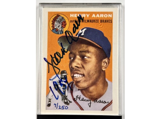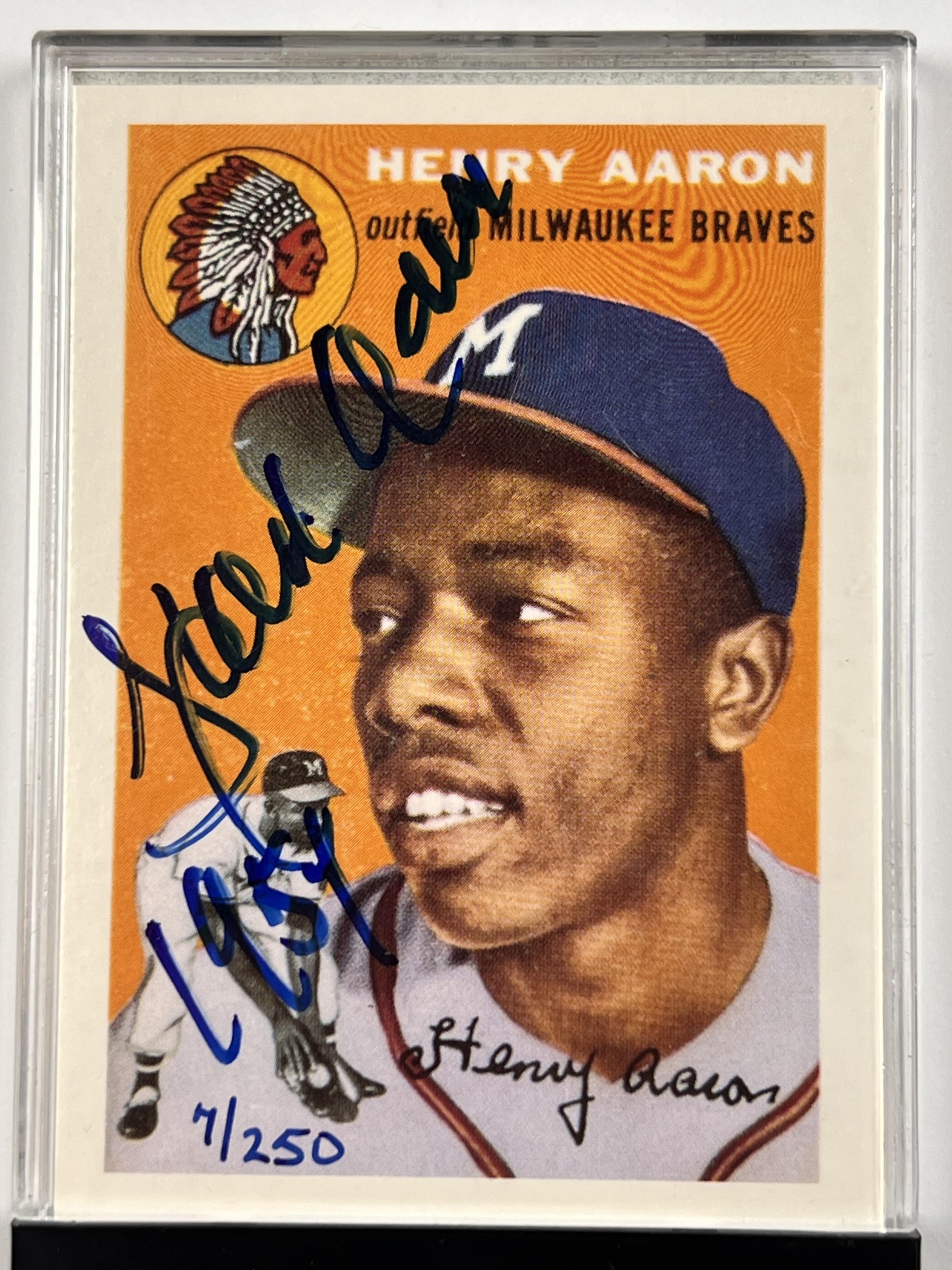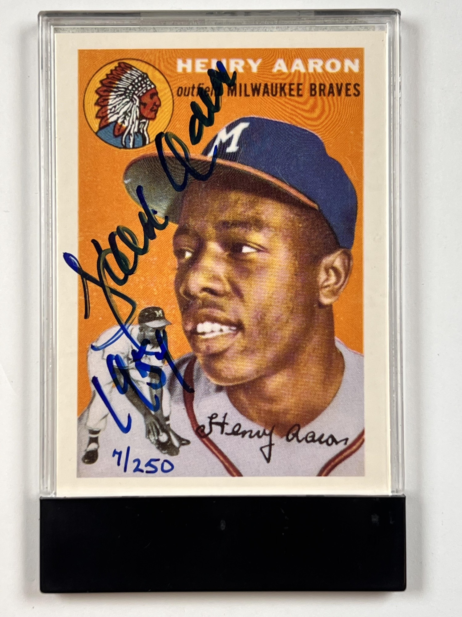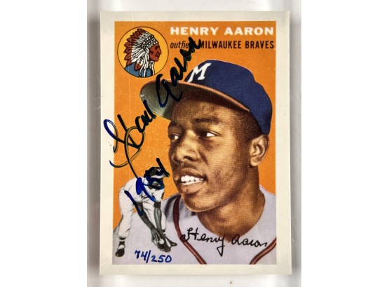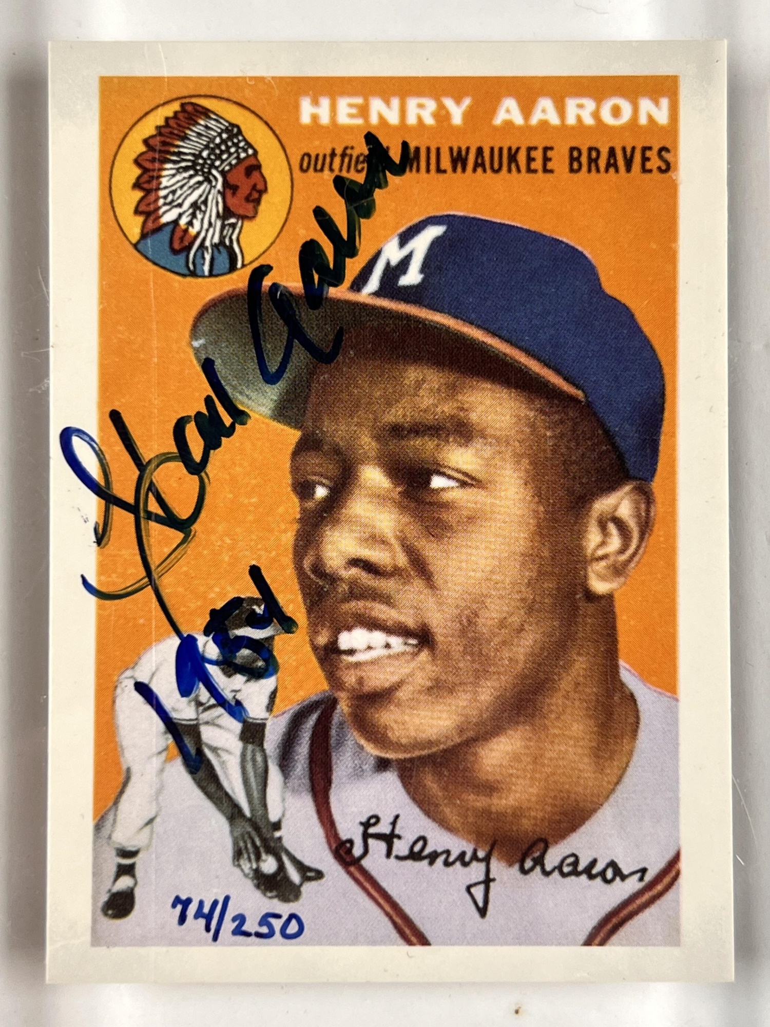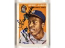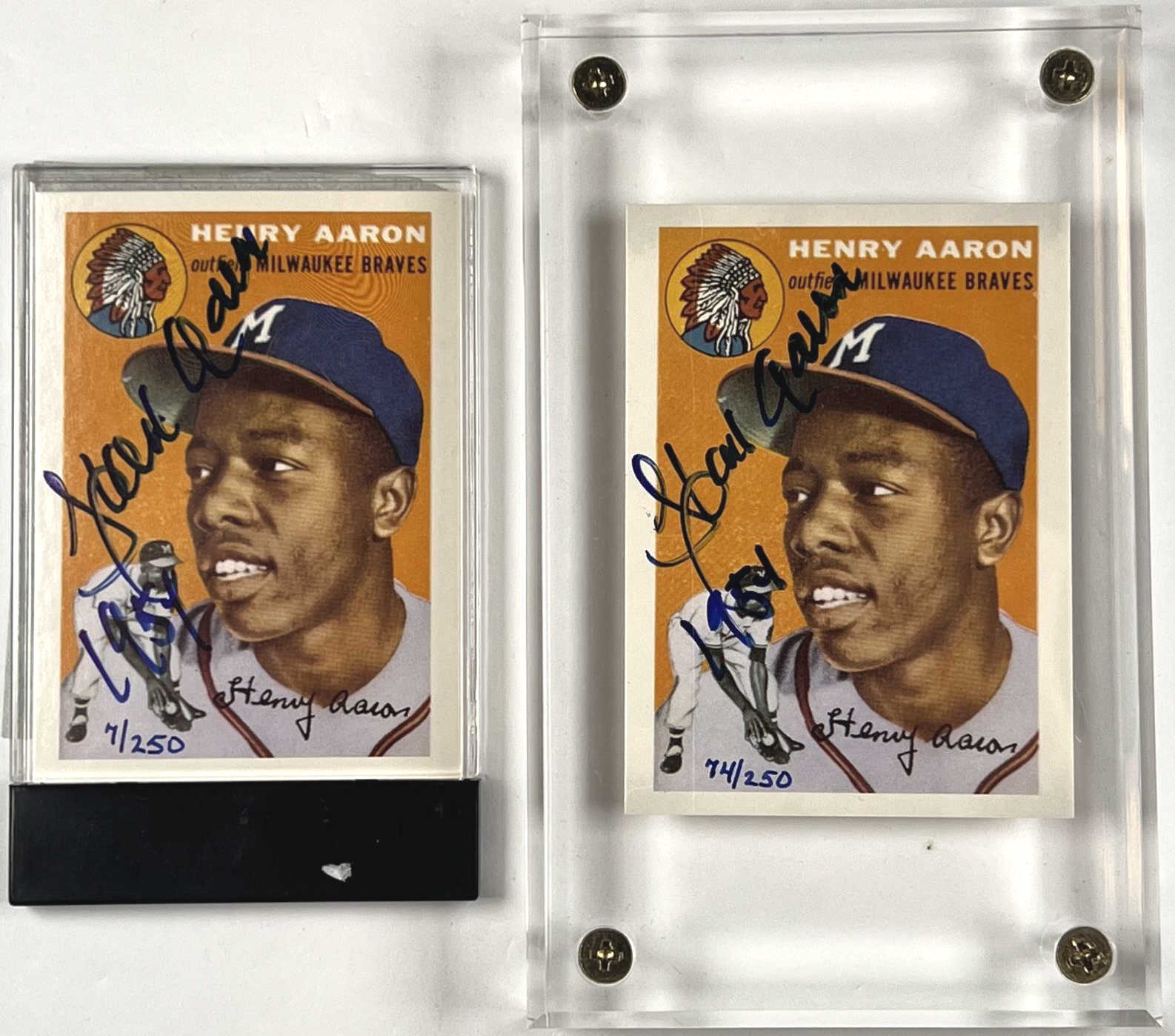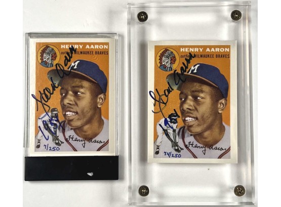 (2) Certified authentic 1991 Topps reprint of the 1954 Hank Aaron rookie card. Signed "Hank Aaron 1954" and numbered 7/250 and 74/250. With authentication certificate from Ken Goldin. Condition: See photos