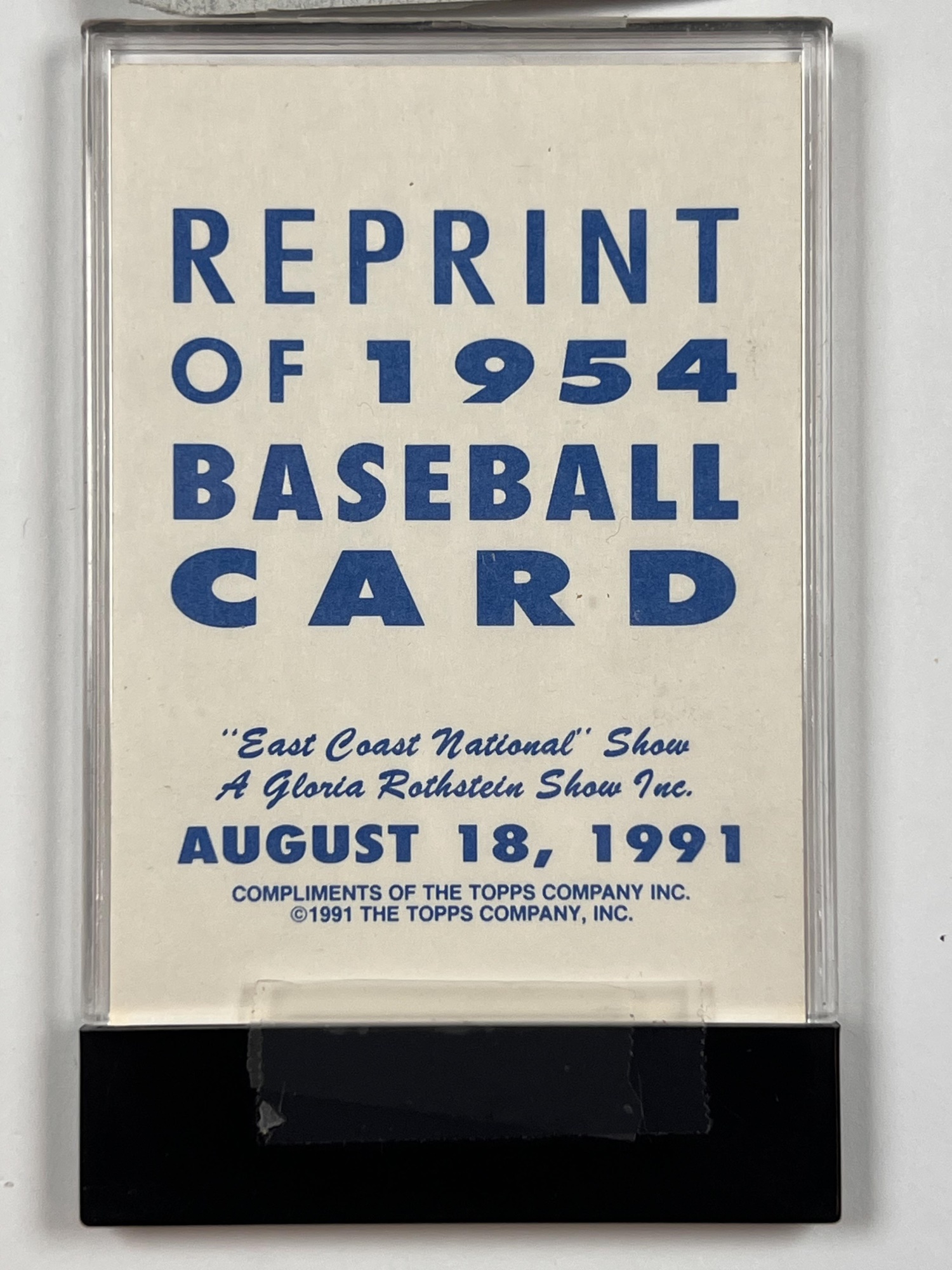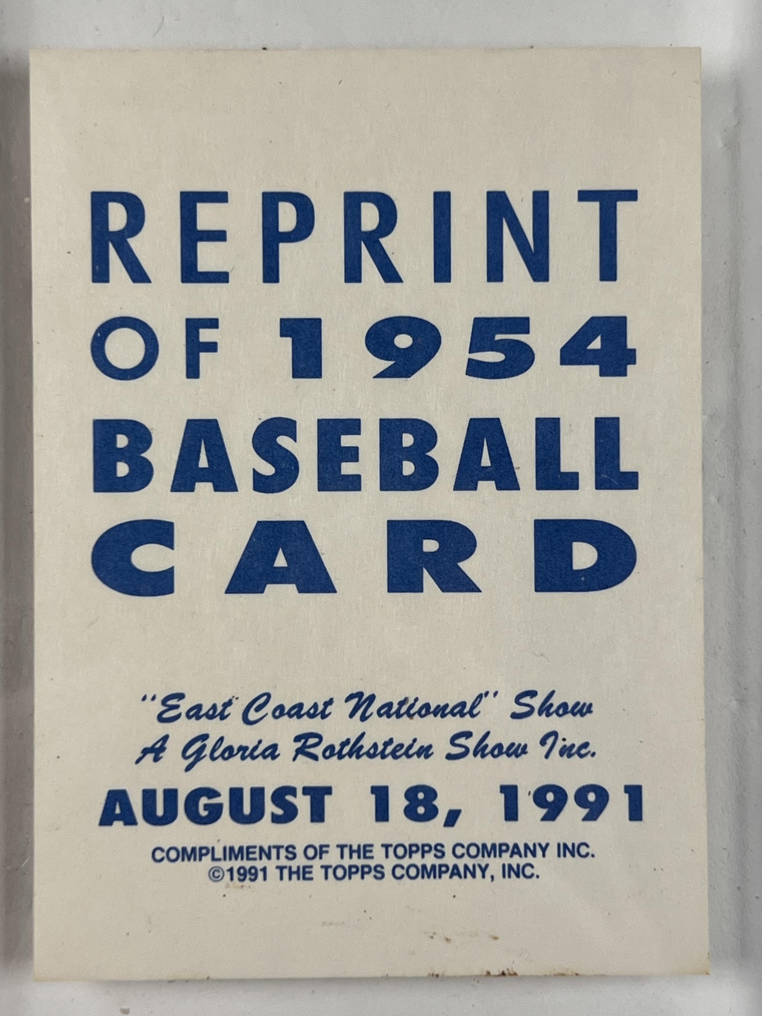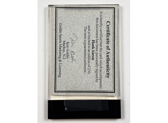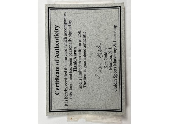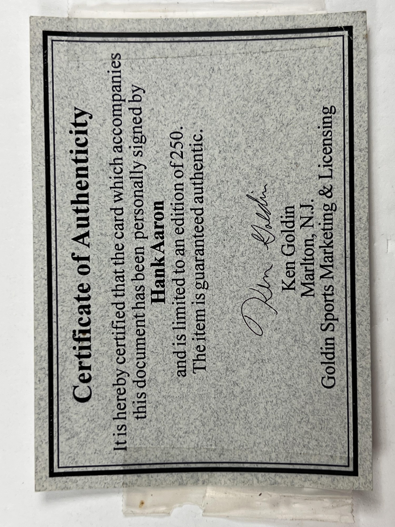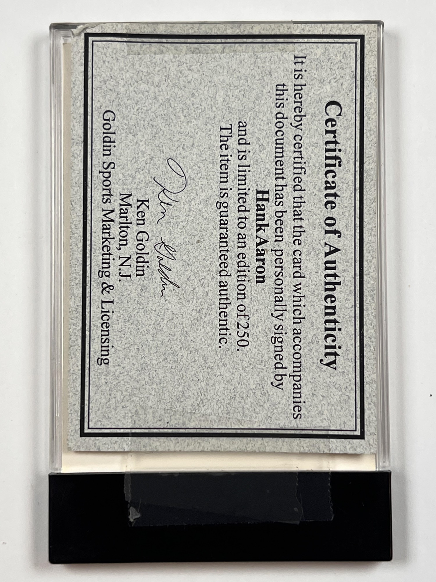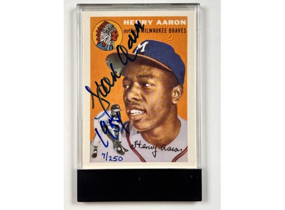 (2) Certified authentic 1991 Topps reprint of the 1954 Hank Aaron rookie card. Signed "Hank Aaron 1954" and numbered 7/250 and 74/250. With authentication certificate from Ken Goldin. Condition: See photos