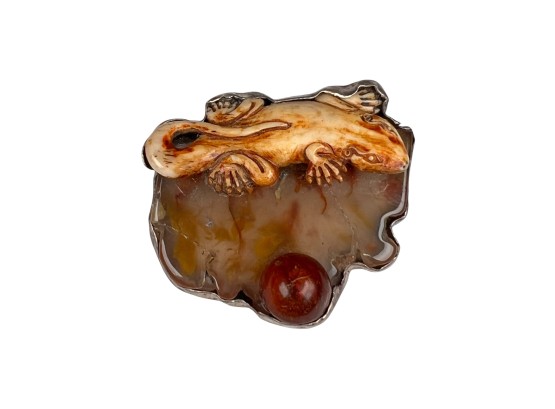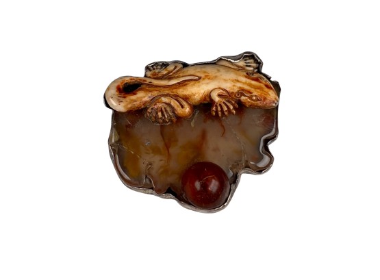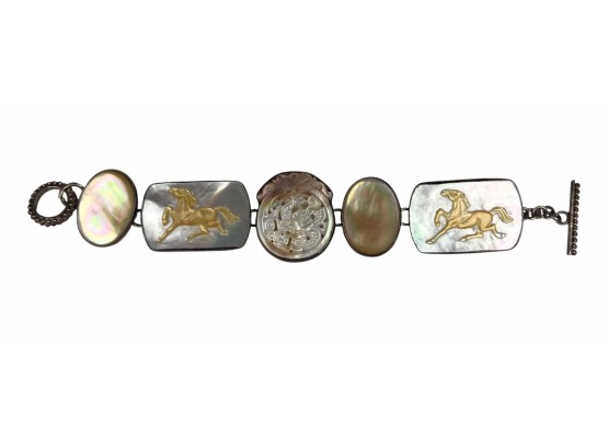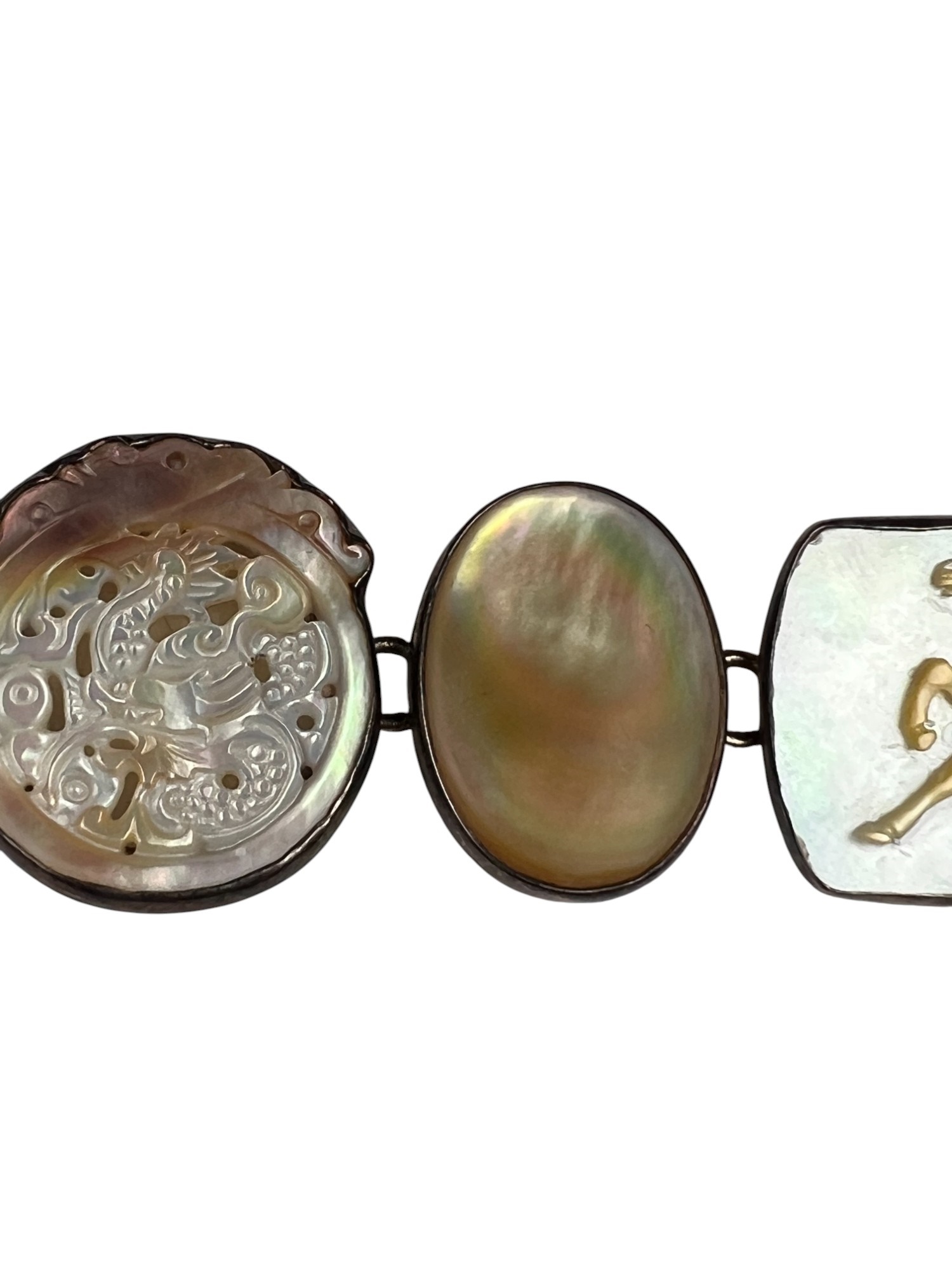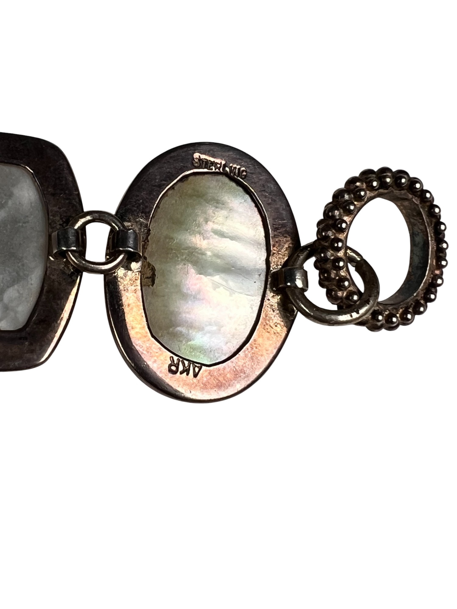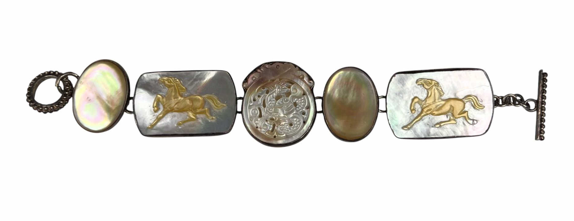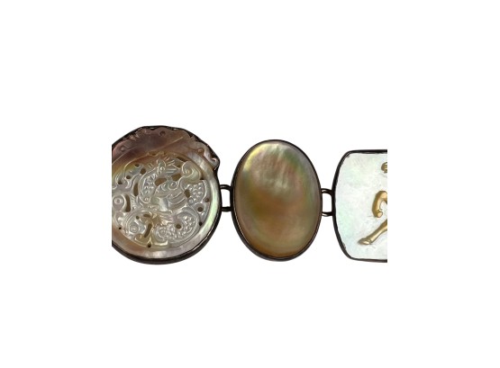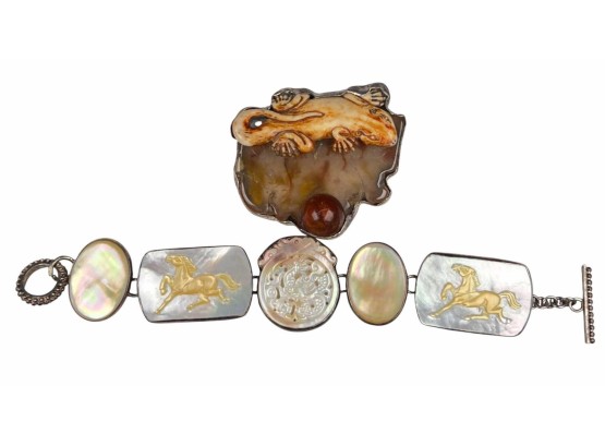 Sterling silver bracelet with carved mother of pearl panels signed AKR and marked sterling, 7" total length, .93 OZT overall. Sterling brooch with stone panel and carved lizard is signed AKR and marked sterling, 2 1/4" wide, .96 OZT overall