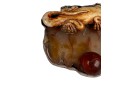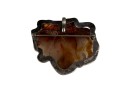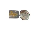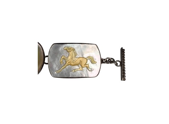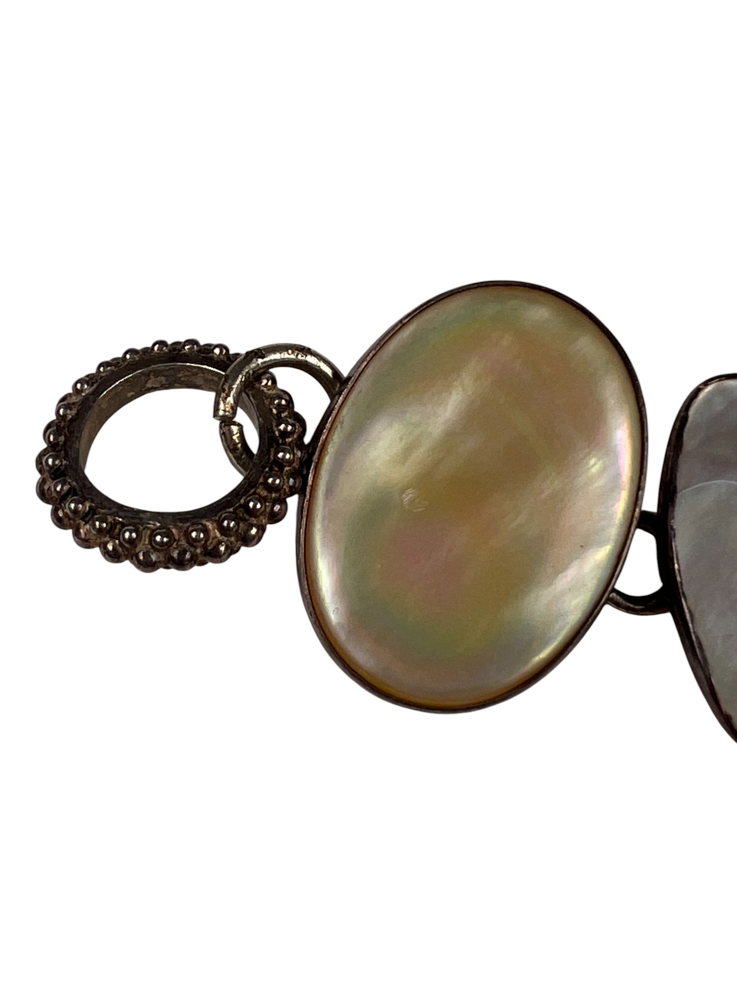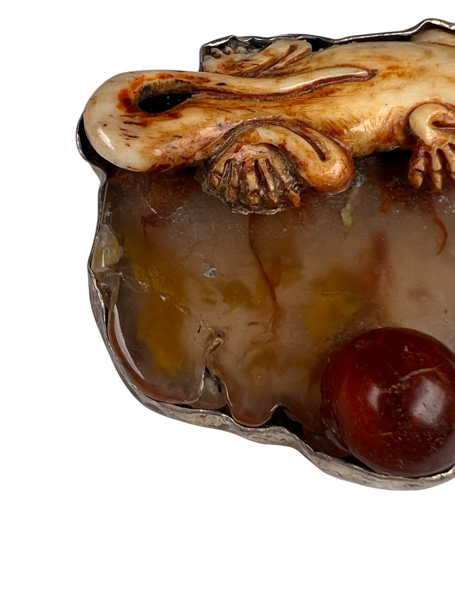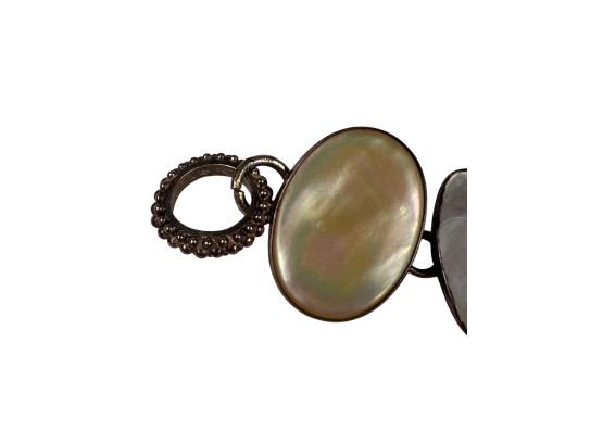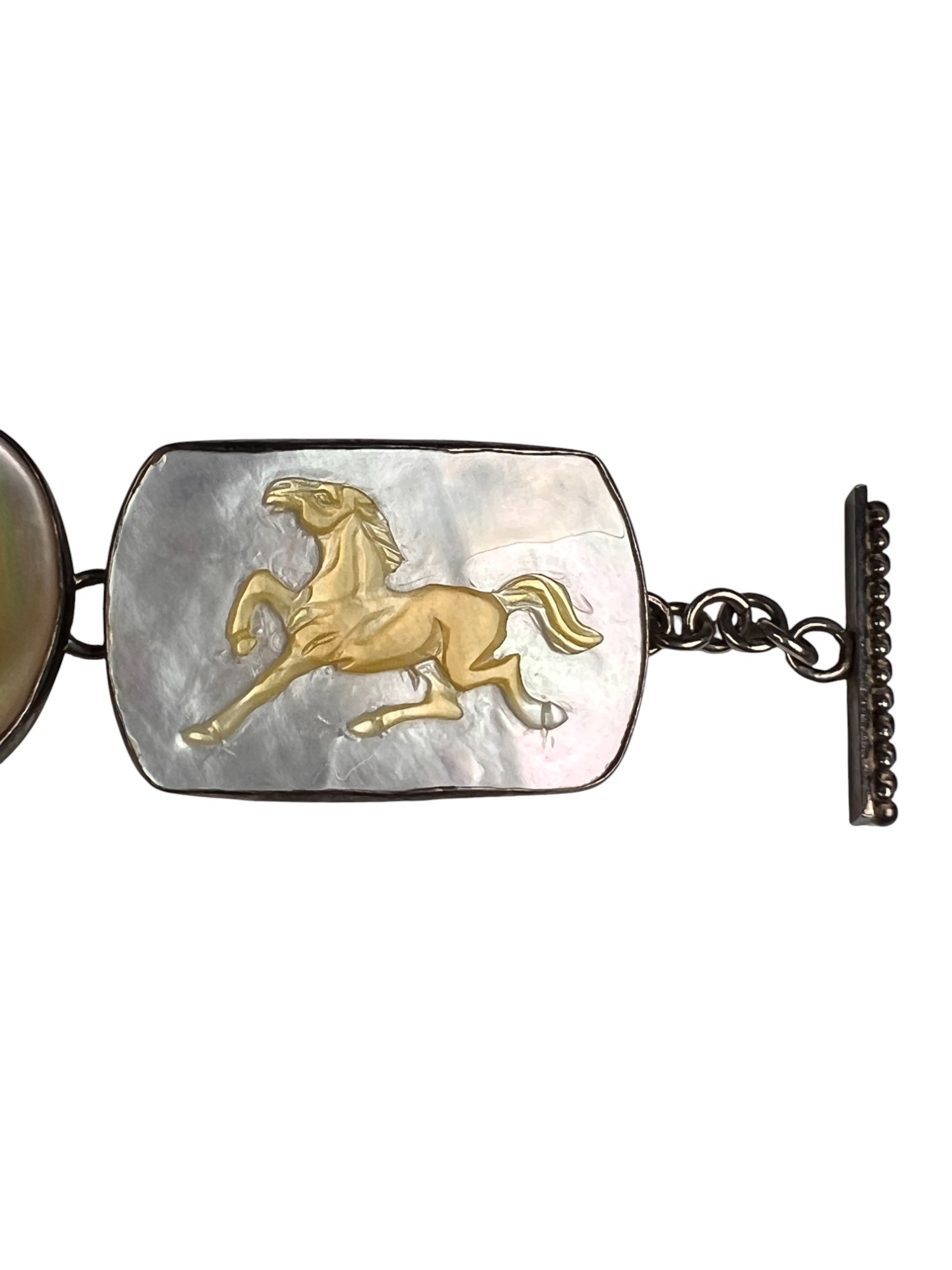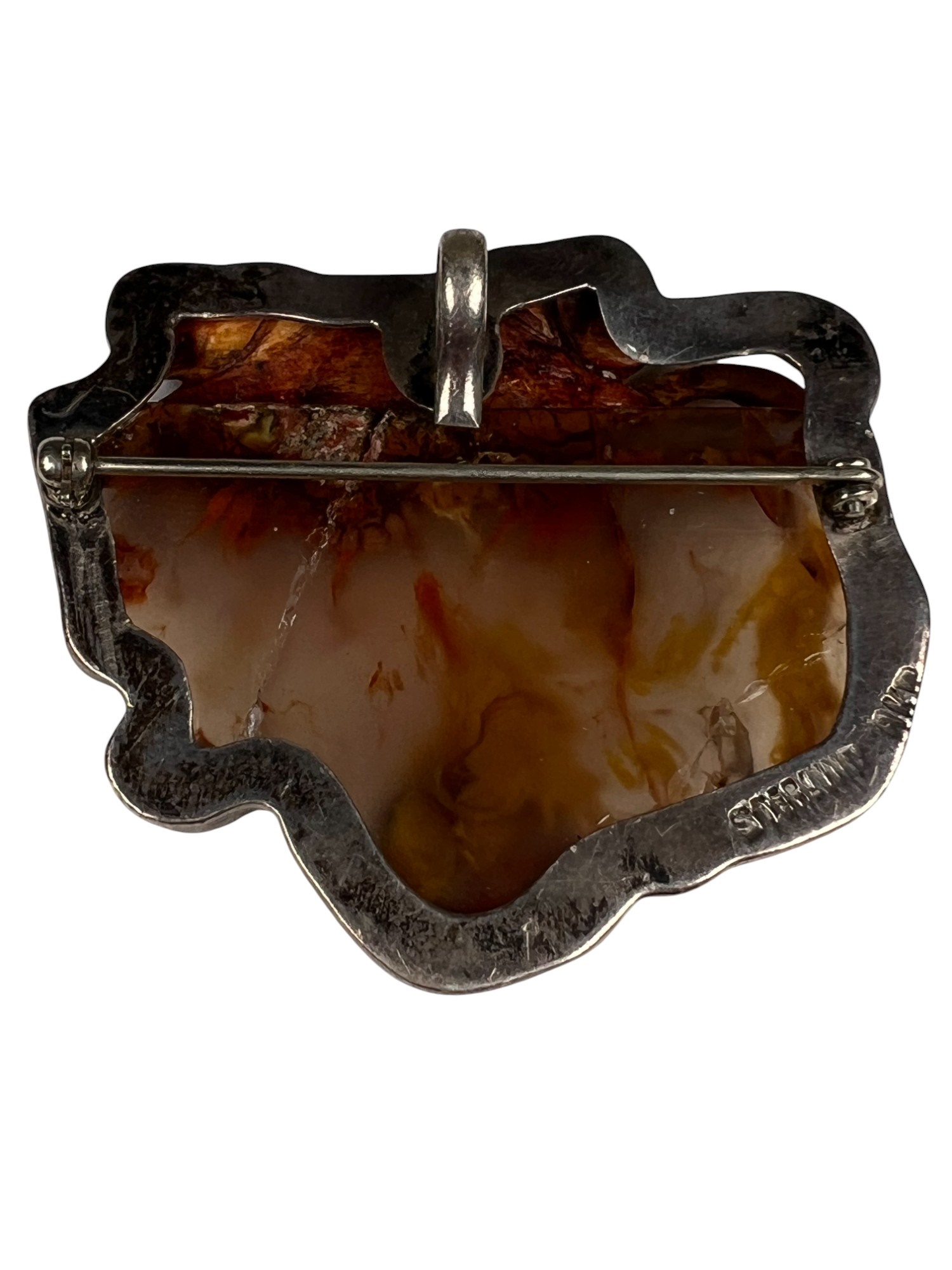 Sterling silver bracelet with carved mother of pearl panels signed AKR and marked sterling, 7" total length, .93 OZT overall. Sterling brooch with stone panel and carved lizard is signed AKR and marked sterling, 2 1/4" wide, .96 OZT overall