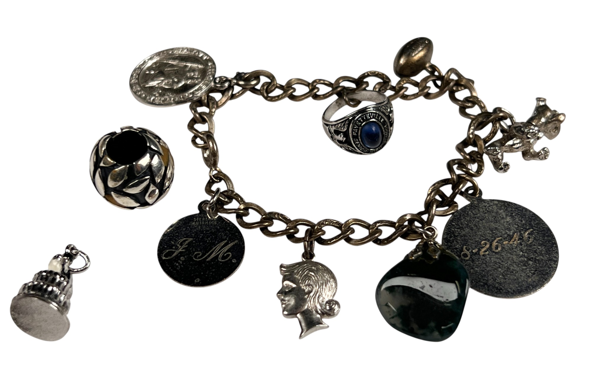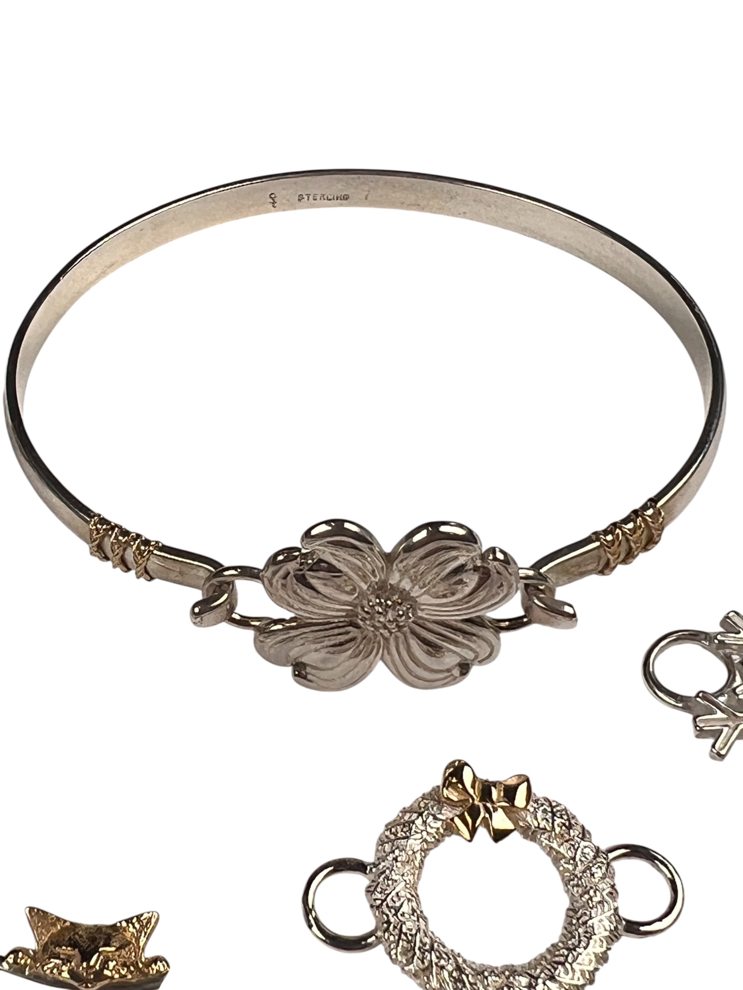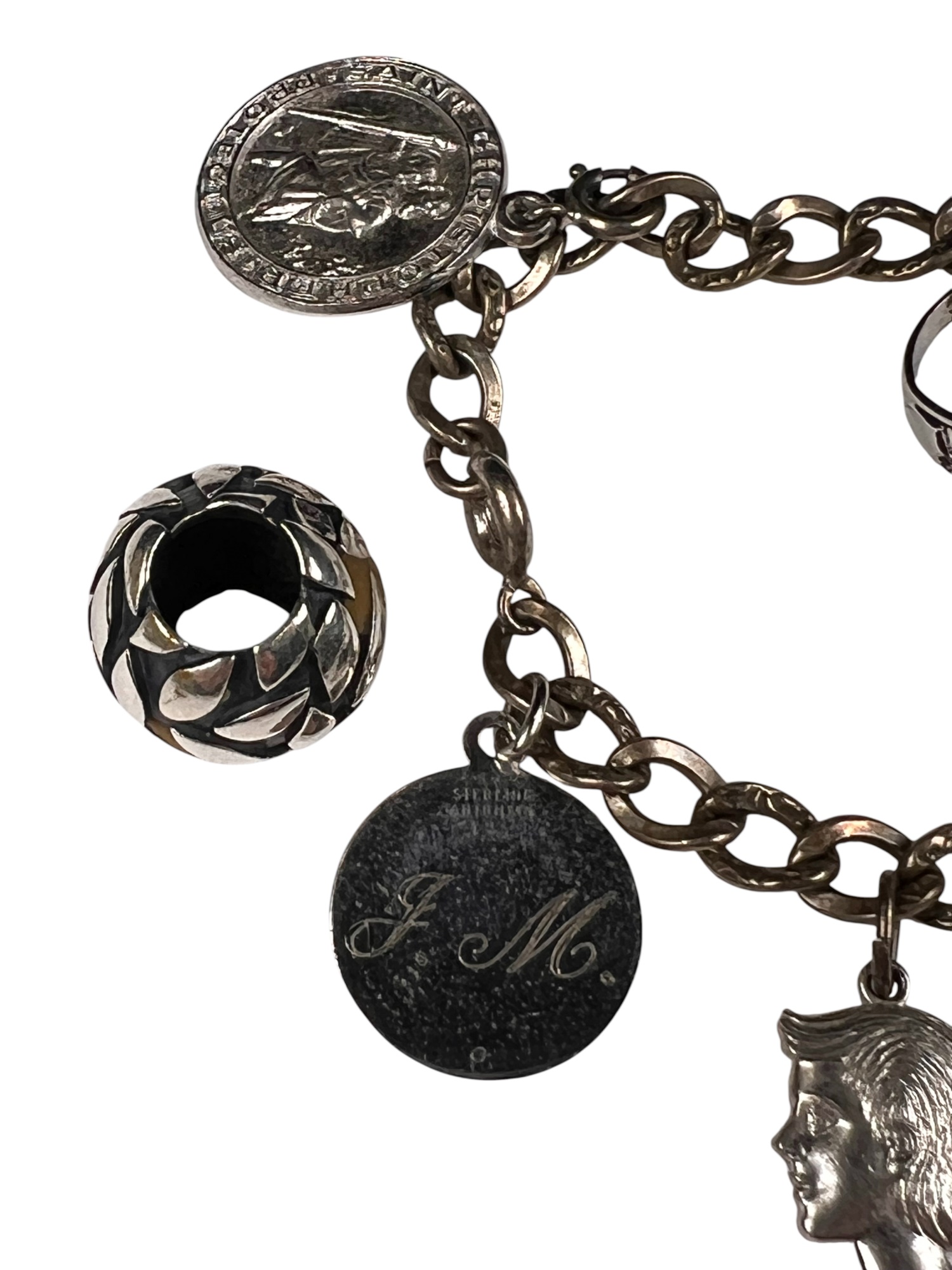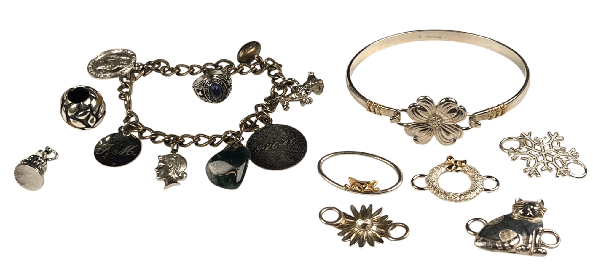 Sterling silver charm bracelet with sterling charms along with another sterling silver bracelet with optional clasps. All marked sterling. 2.06 OZT overall Condition: Good, used