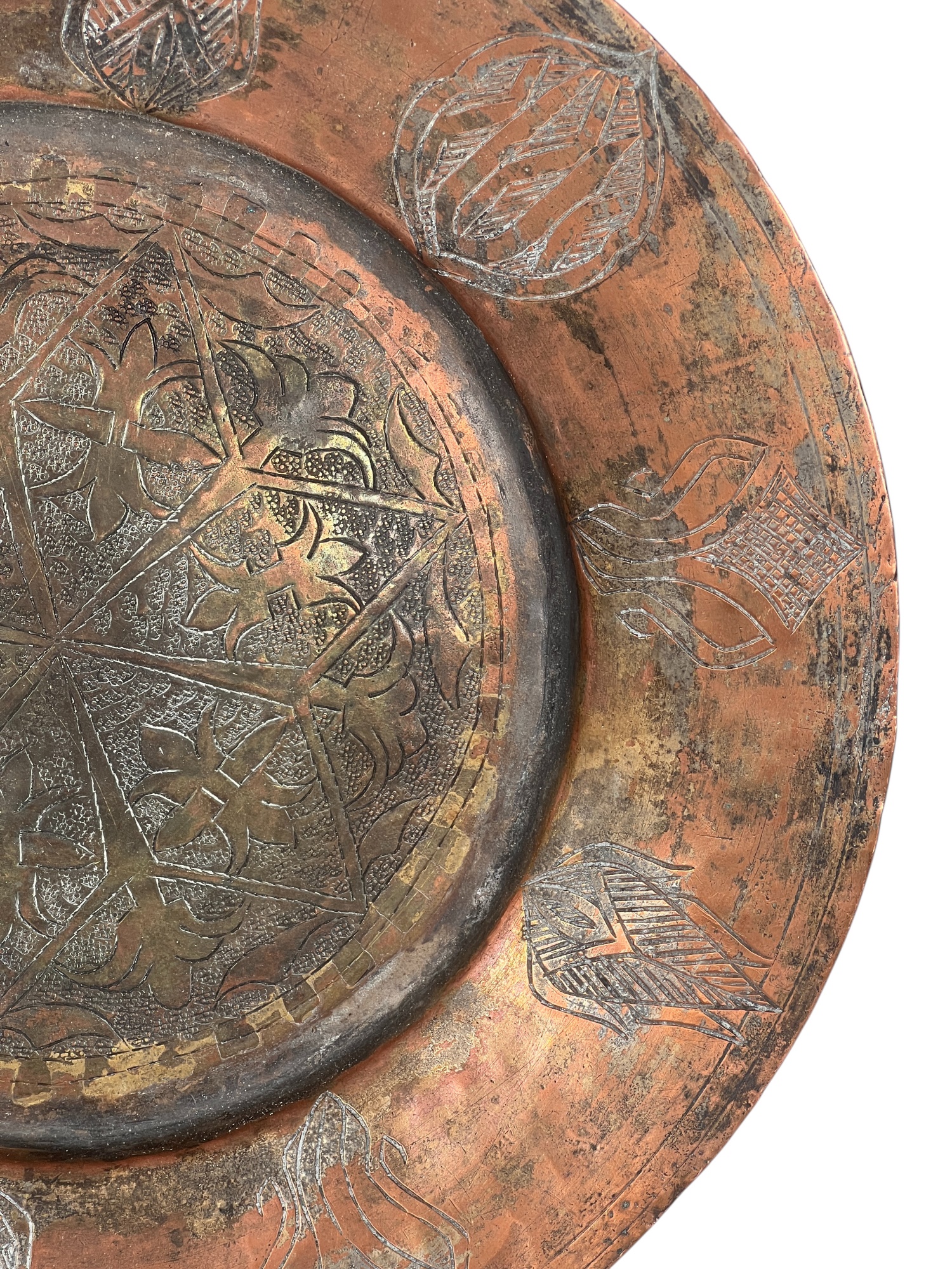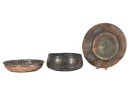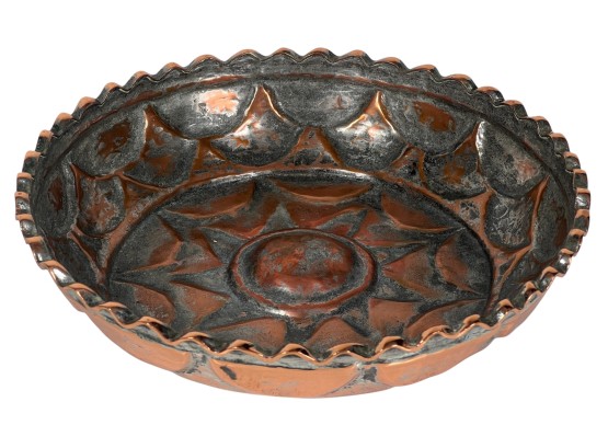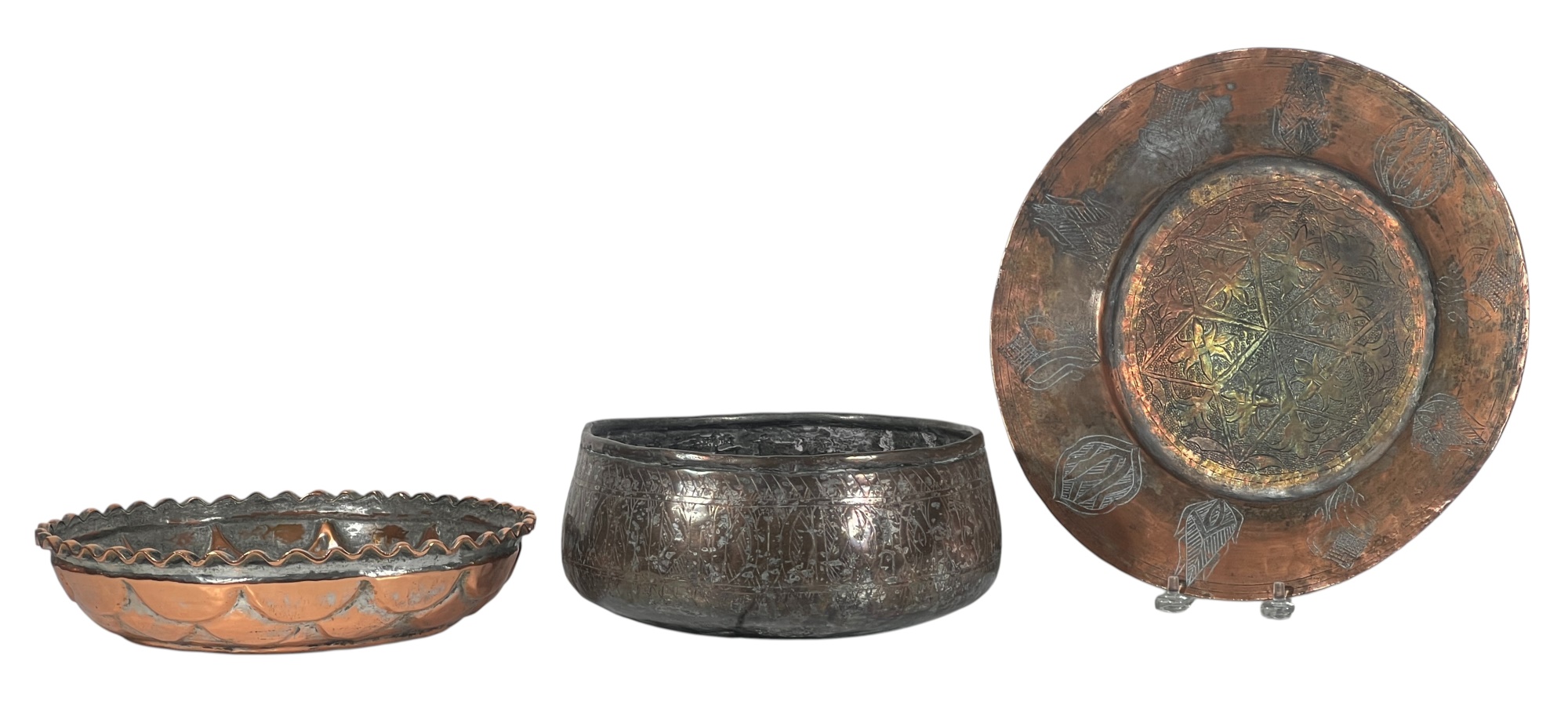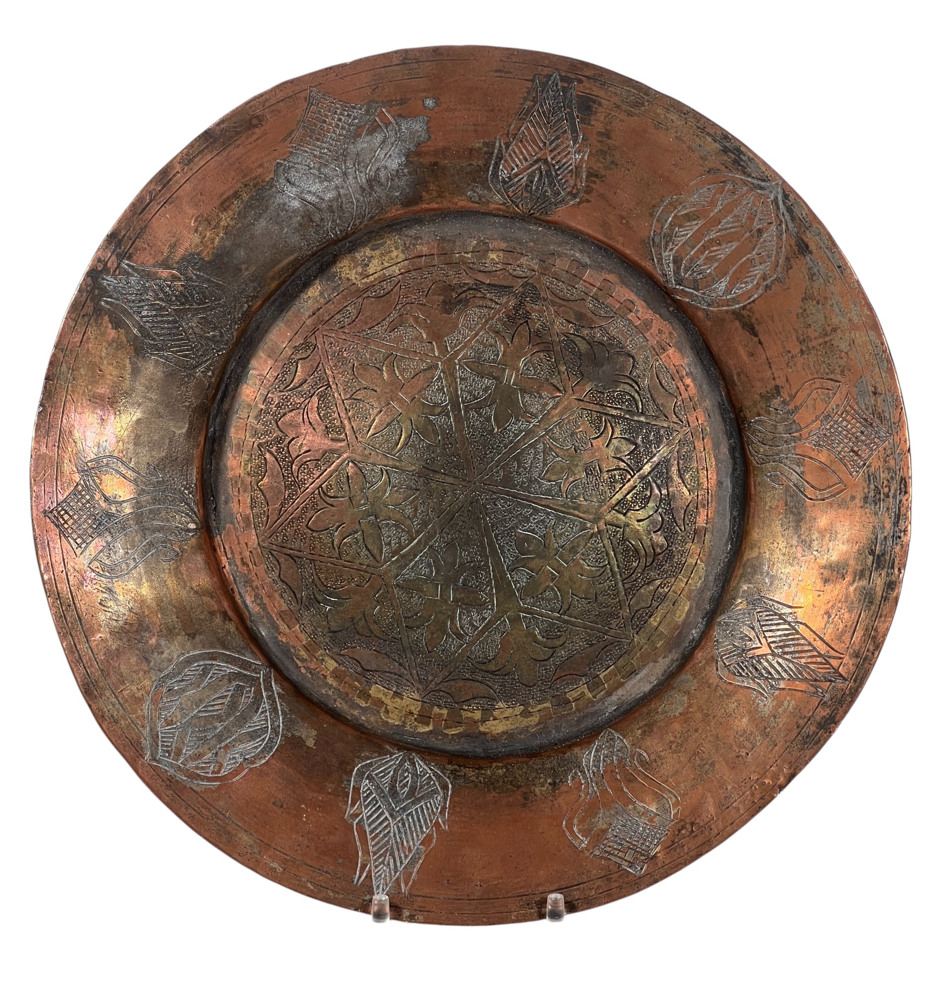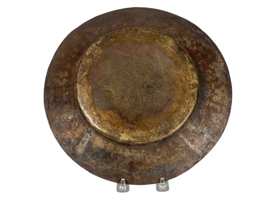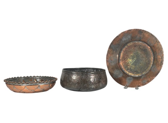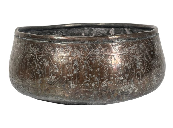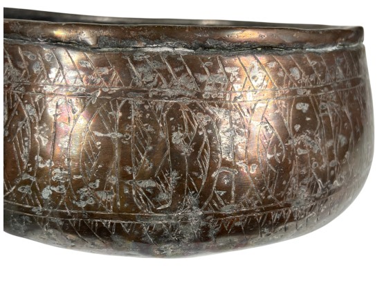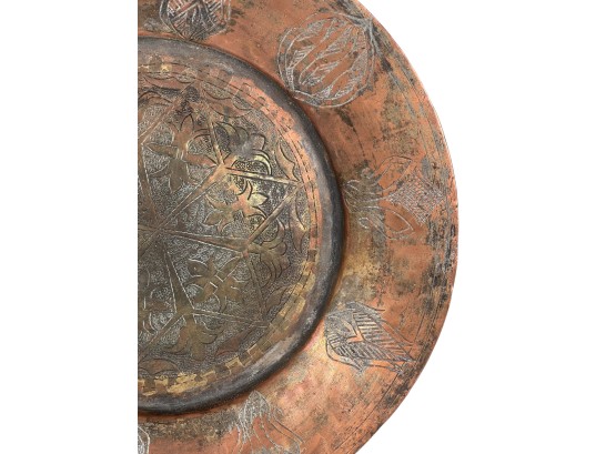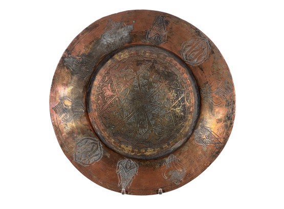 (1) geometric engraved bowl marked Syria, tray with nice geometric floral engravings. 4 1/4 x 8 inches. Condition: Good. Temp No 8862