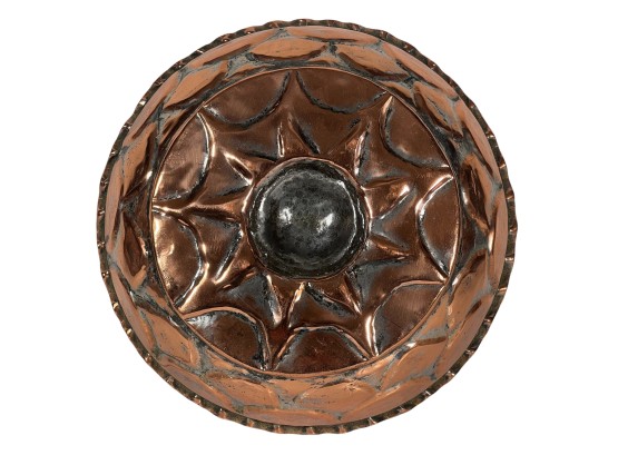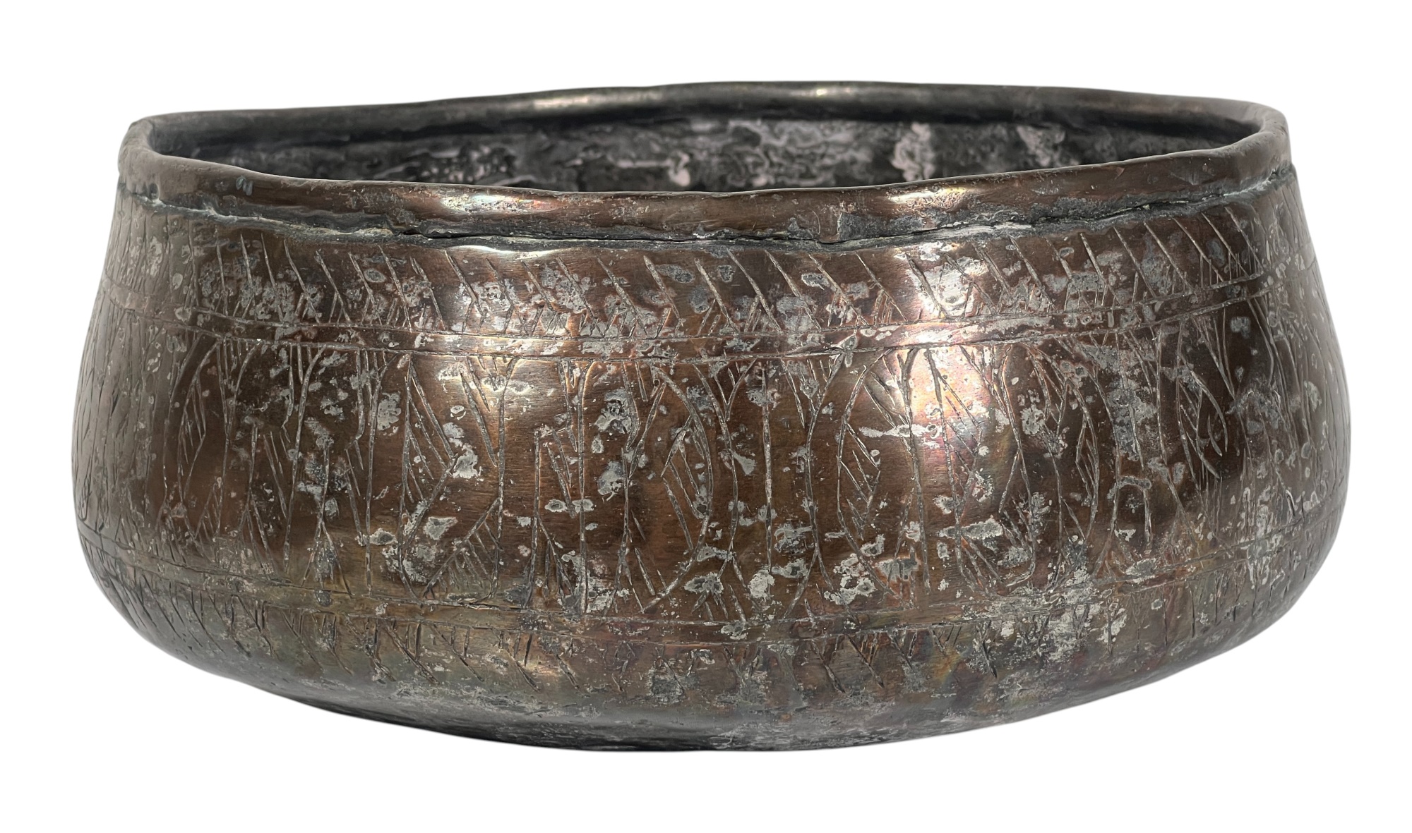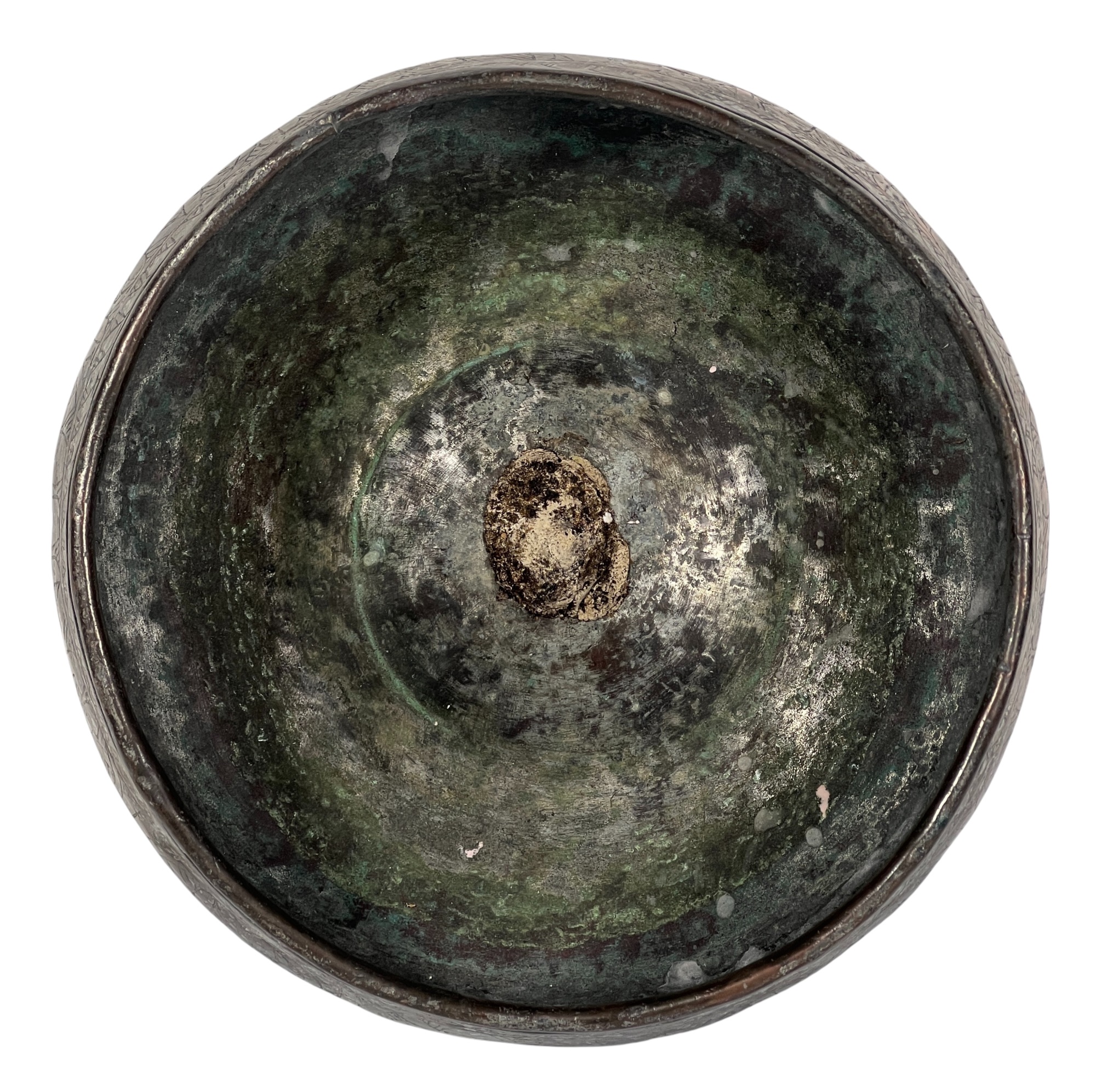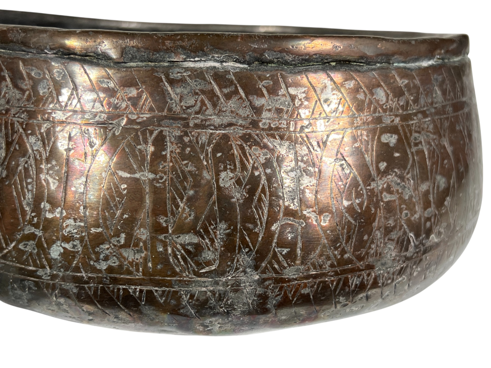 (1) geometric engraved bowl marked Syria, tray with nice geometric floral engravings. 4 1/4 x 8 inches. Condition: Good. Temp No 8862