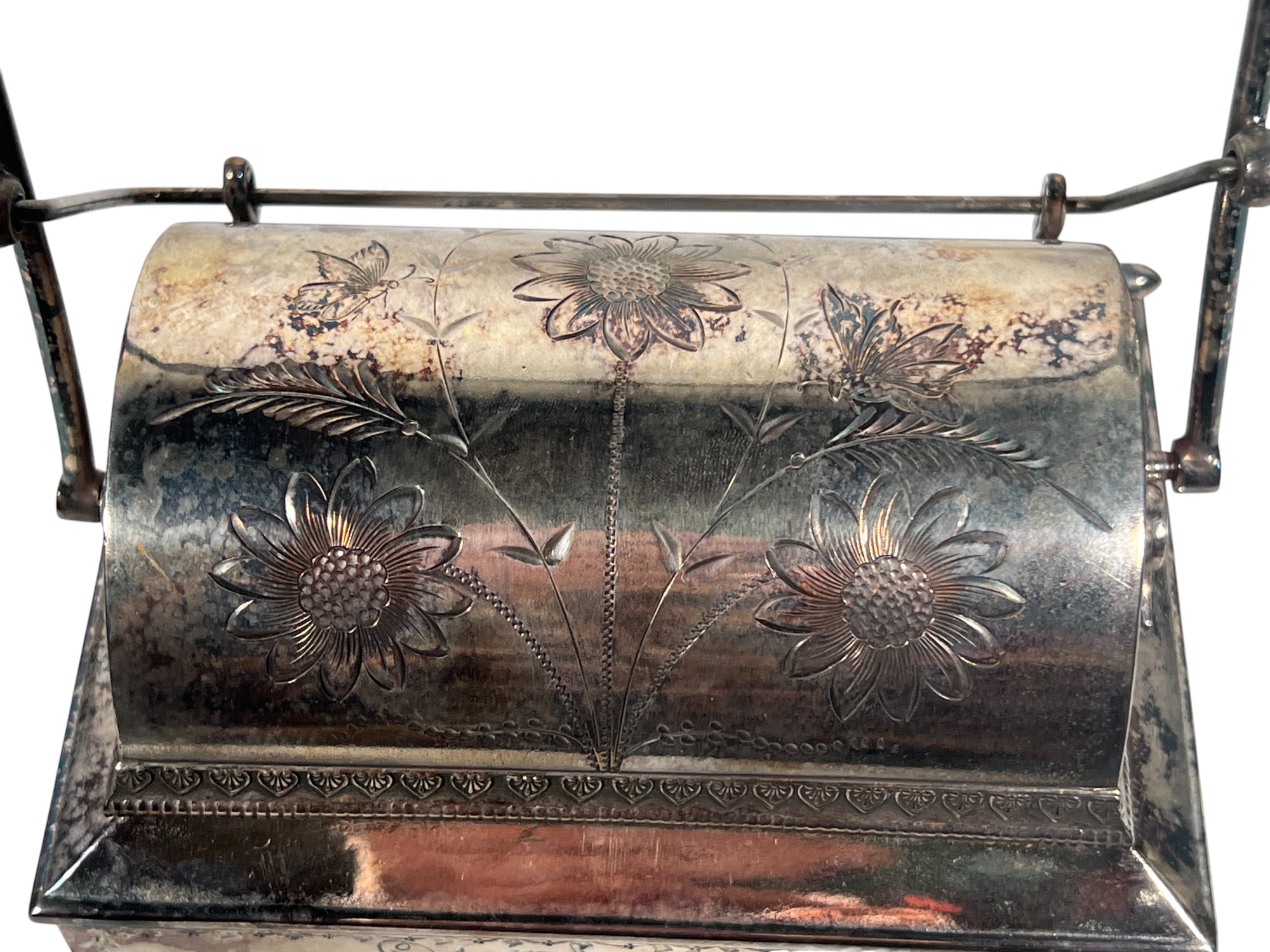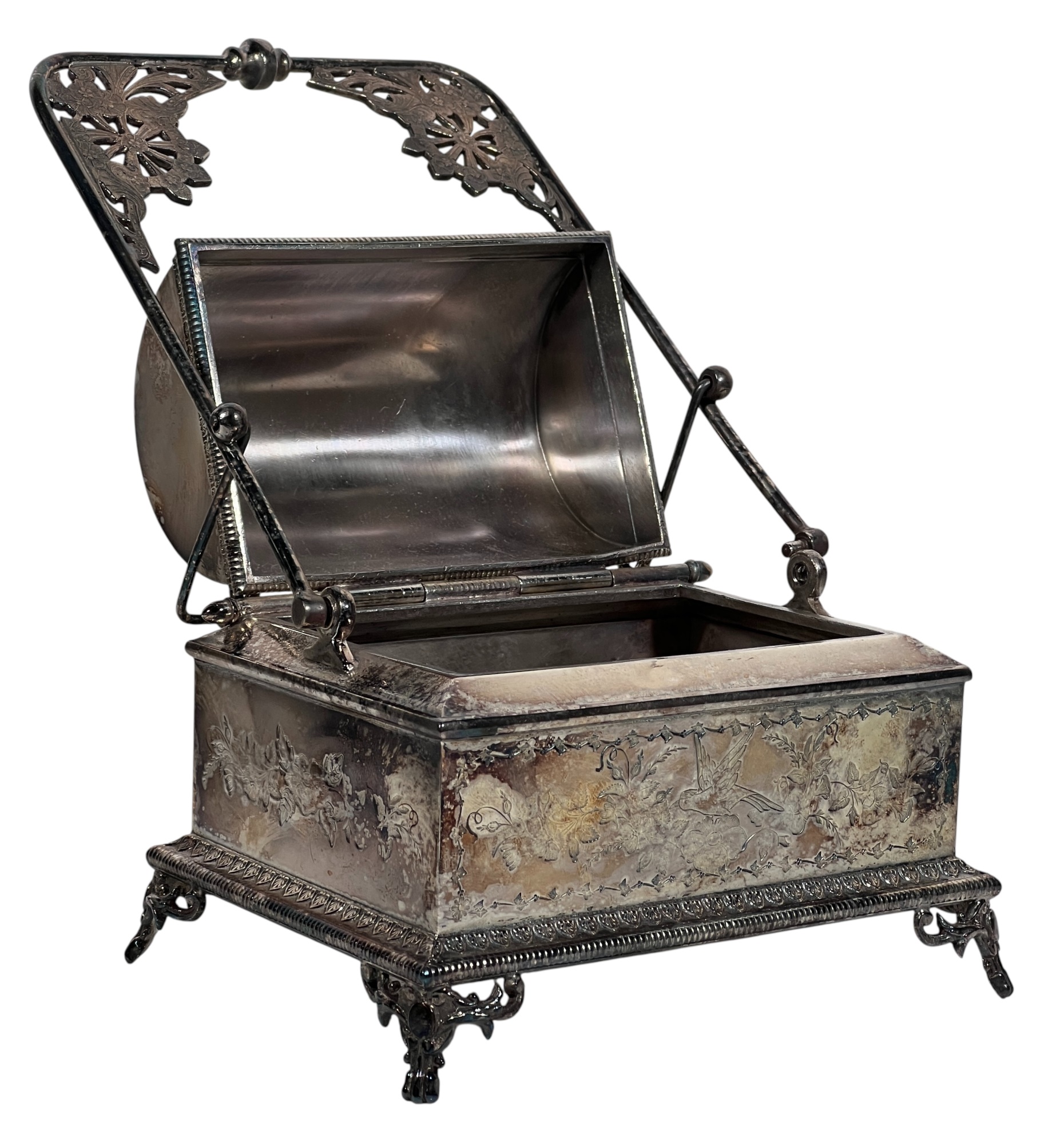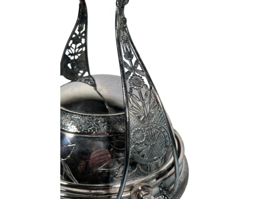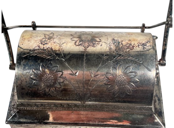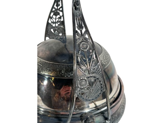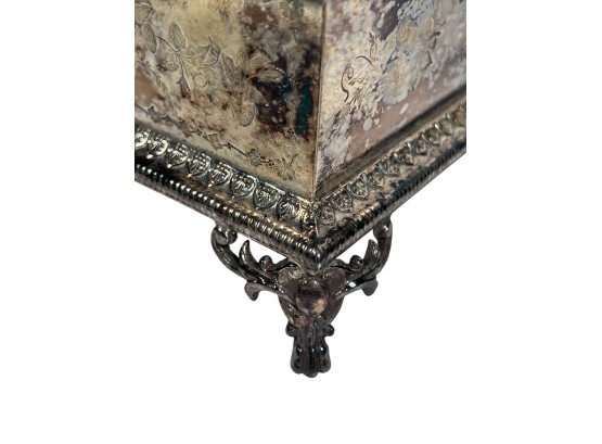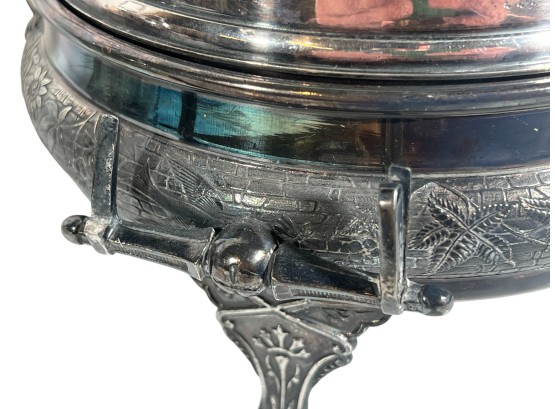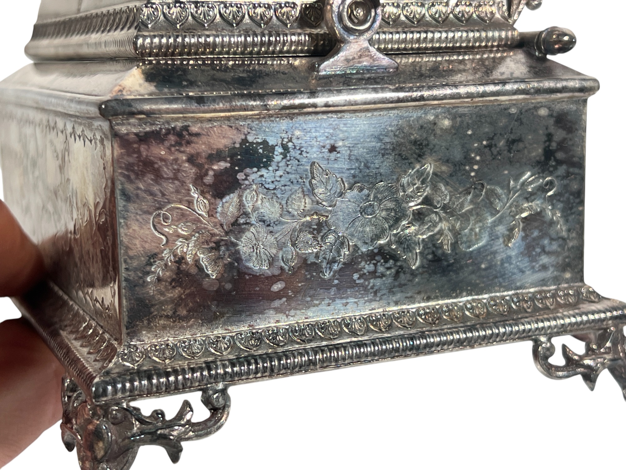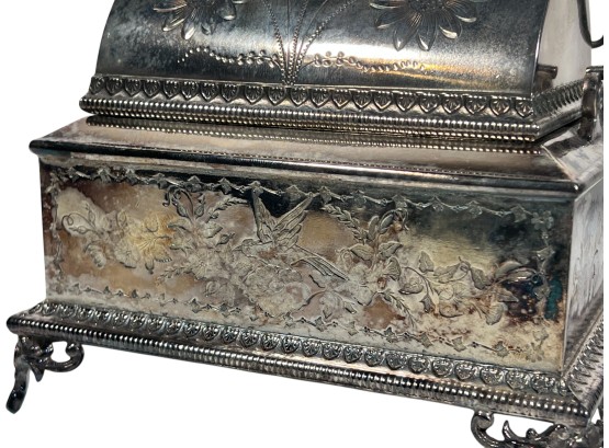 (2) beautifully detailed Victorian silver plate covered butter dishes & (1) jewelry box. 12 x 9 inches. Condition: Liner absent from jewelry box. Temp No 8561
