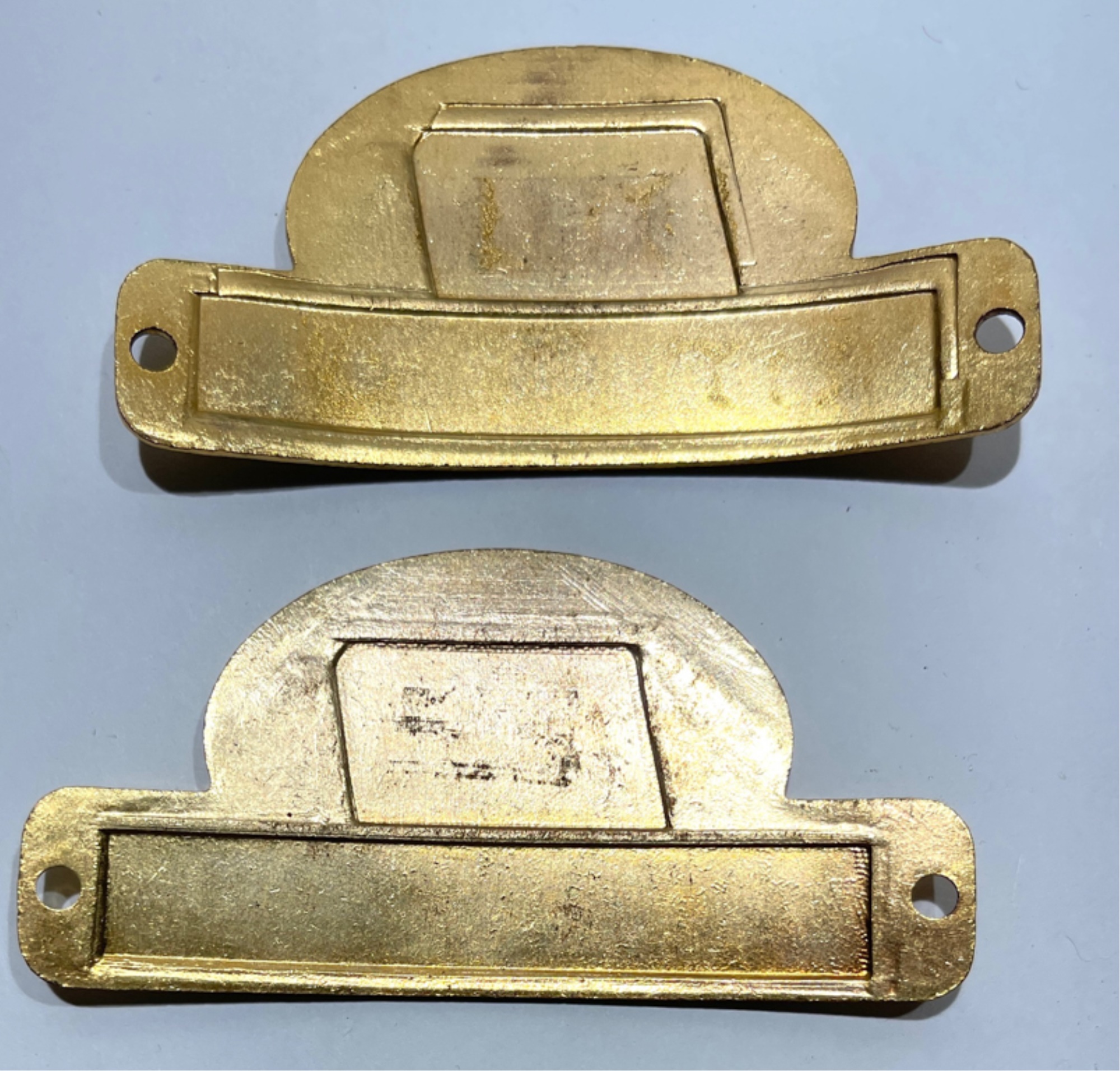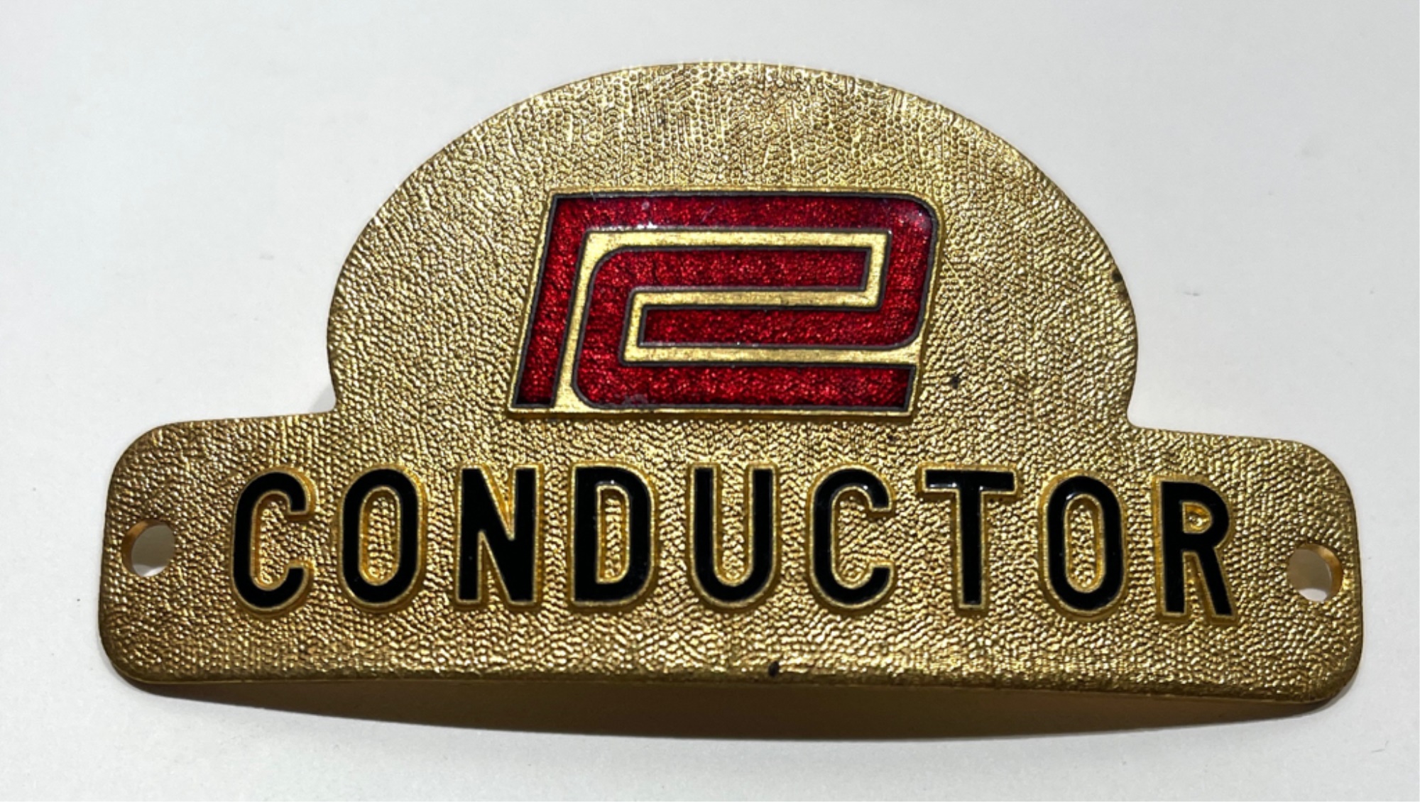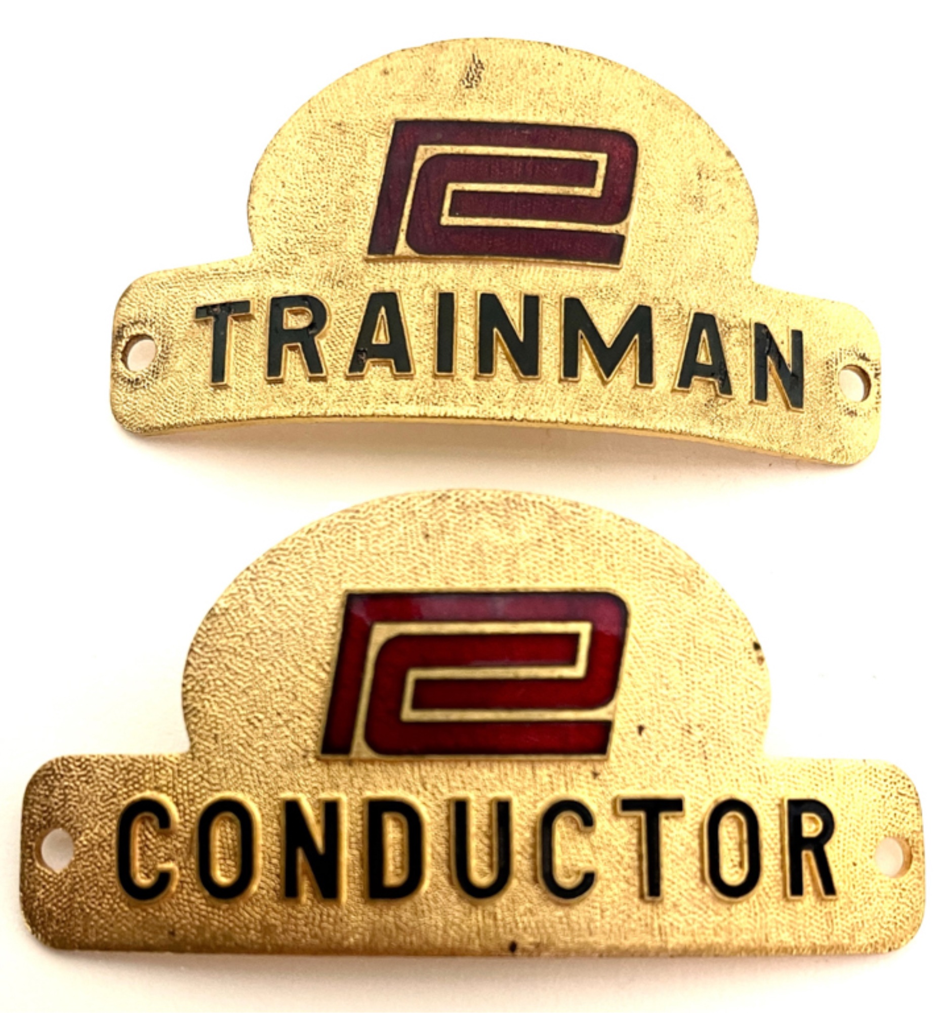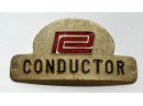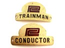 In metal, Trainman and Conductor. 1 1/2 x 3 1/8 inches.