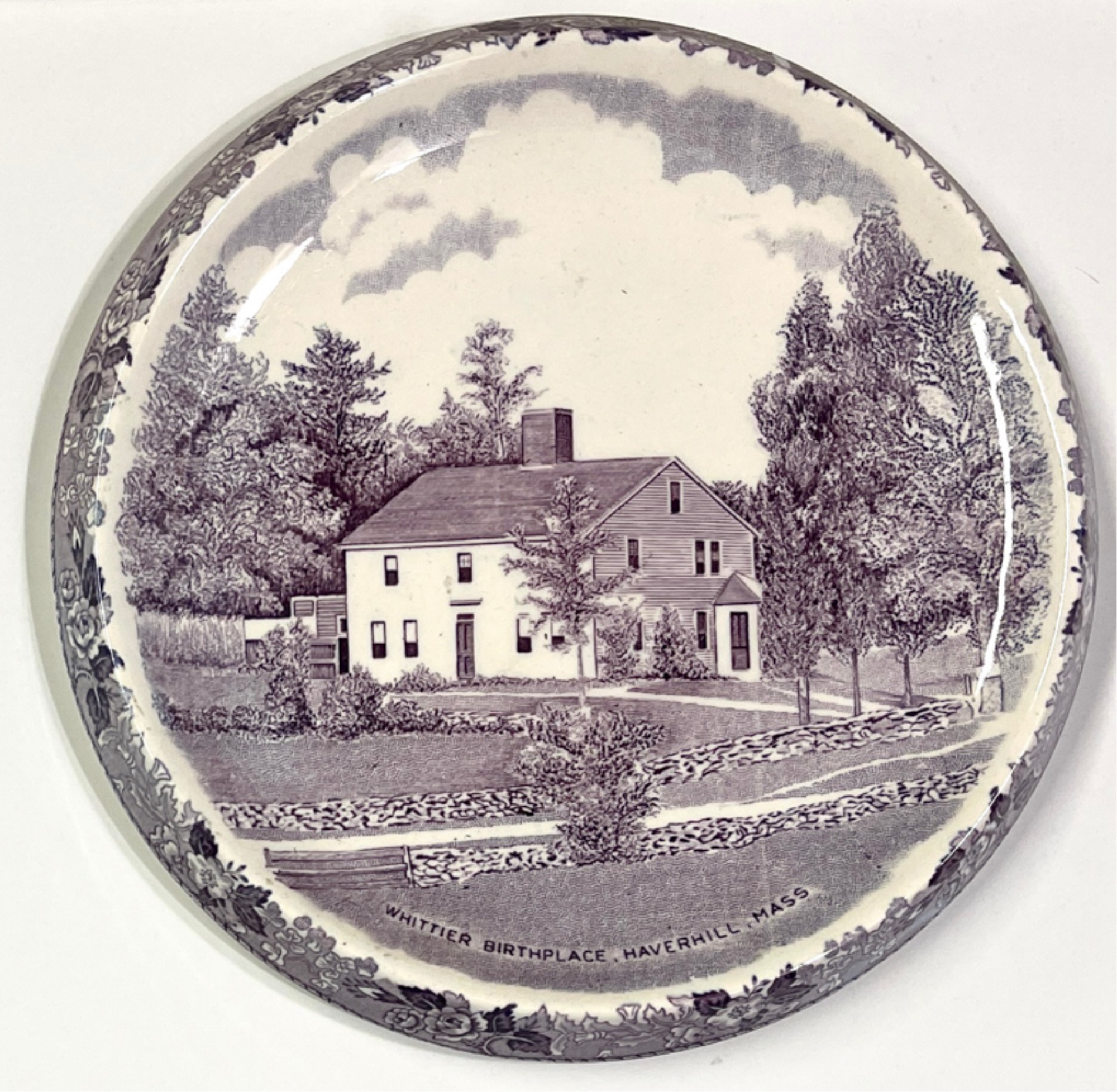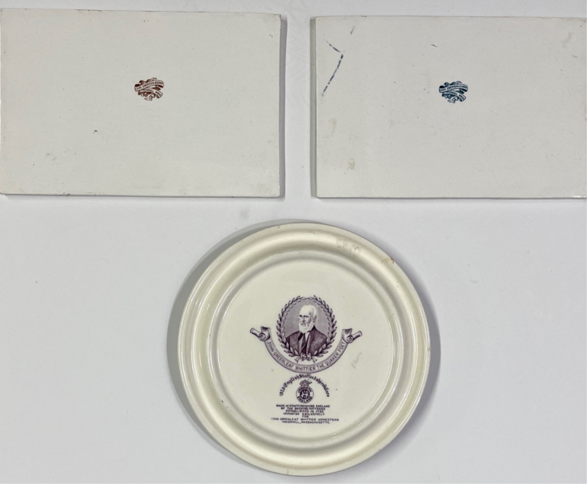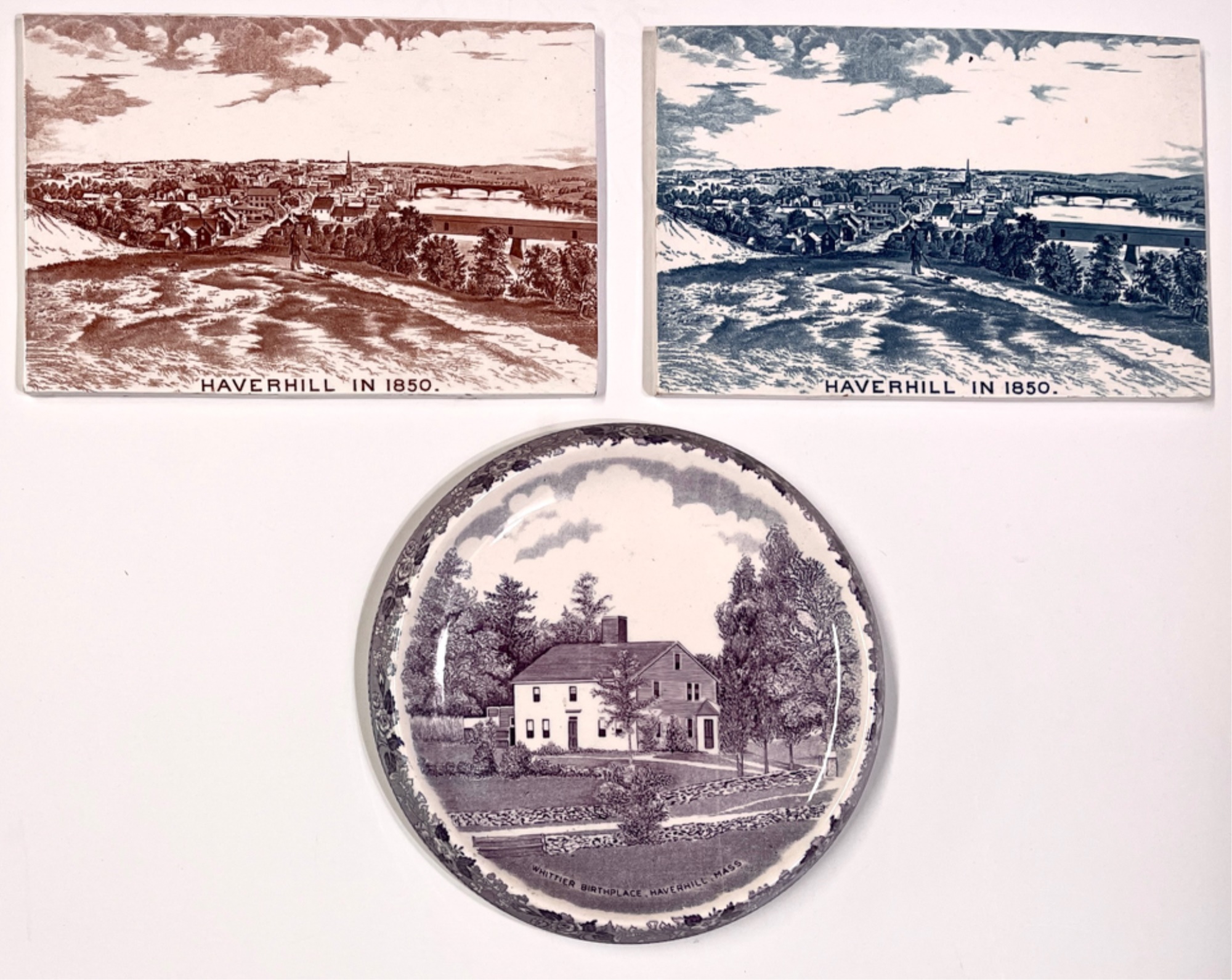 (2) porcelain tiles "Haverhill in 1850" sold by Chas Emerson & Sons and Whittier's birthplace Staffordshire plate by Jon Roth England. Tiles 5" x 7 1/2", plate 6 3/4" dia