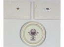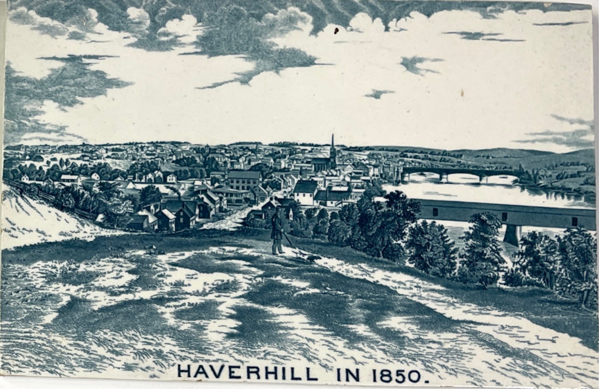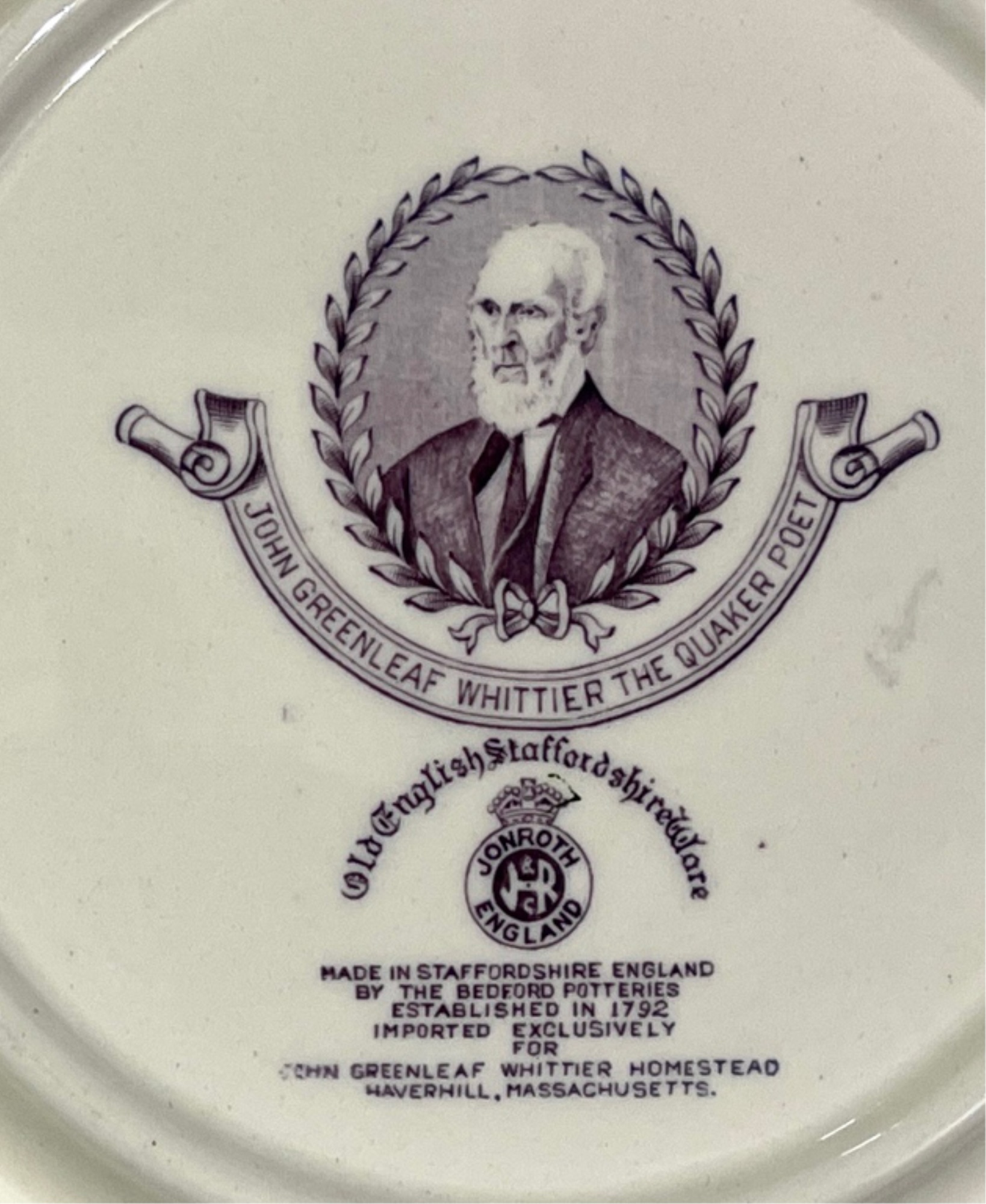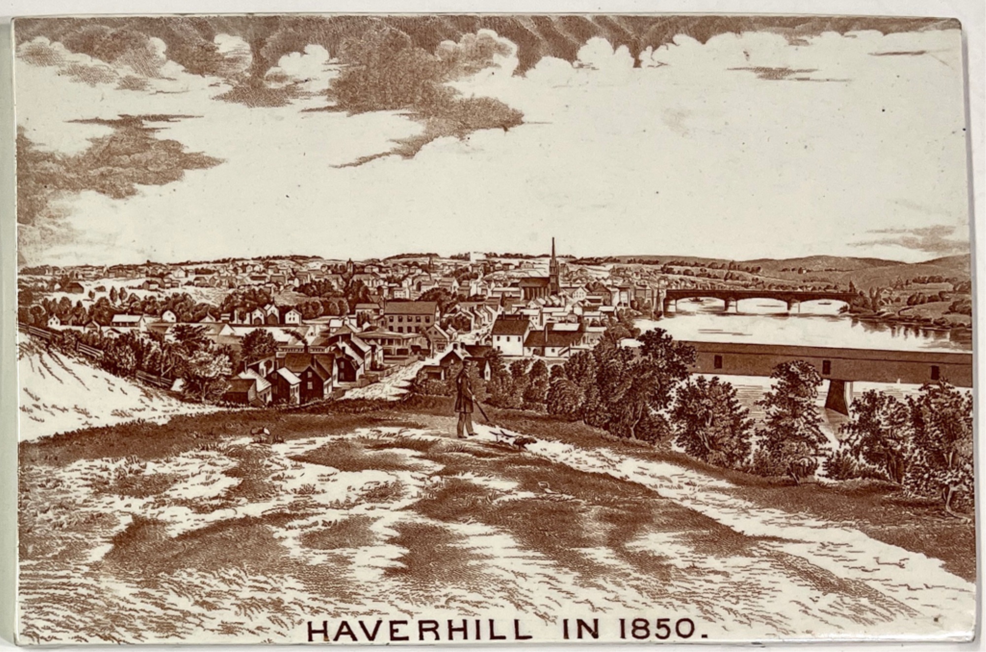 (2) porcelain tiles "Haverhill in 1850" sold by Chas Emerson & Sons and Whittier's birthplace Staffordshire plate by Jon Roth England. Tiles 5" x 7 1/2", plate 6 3/4" dia