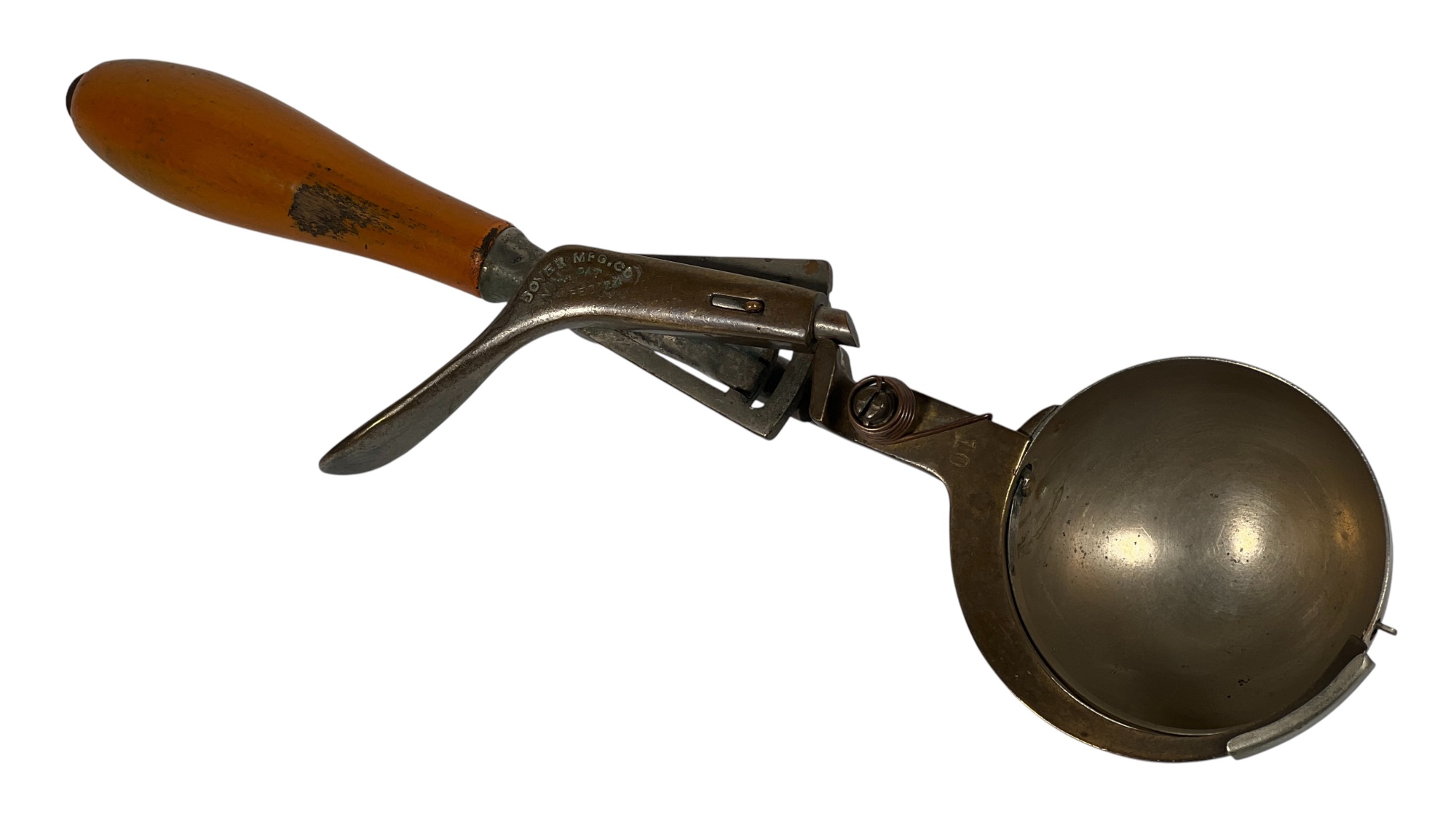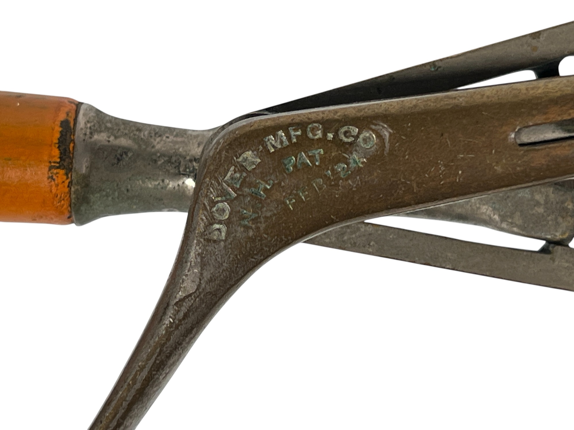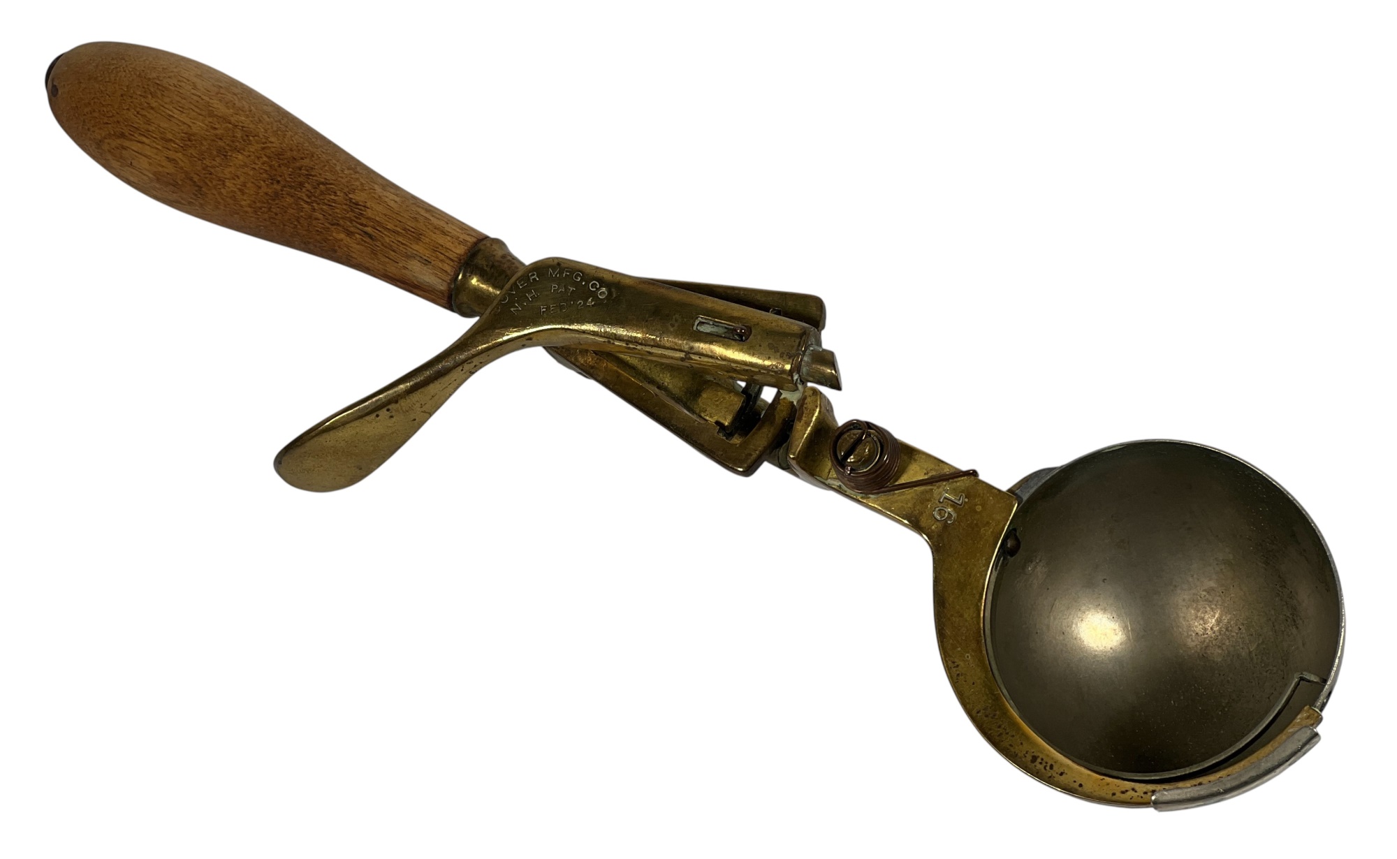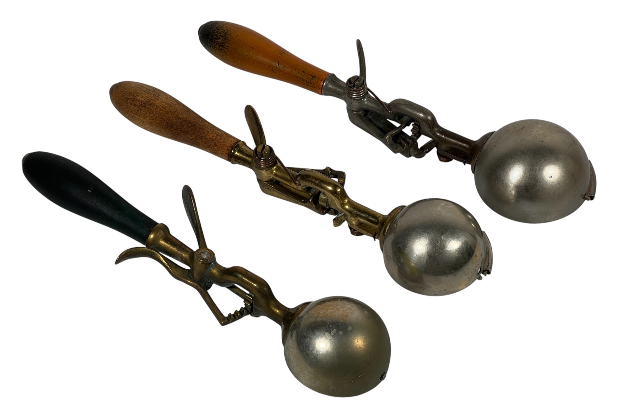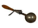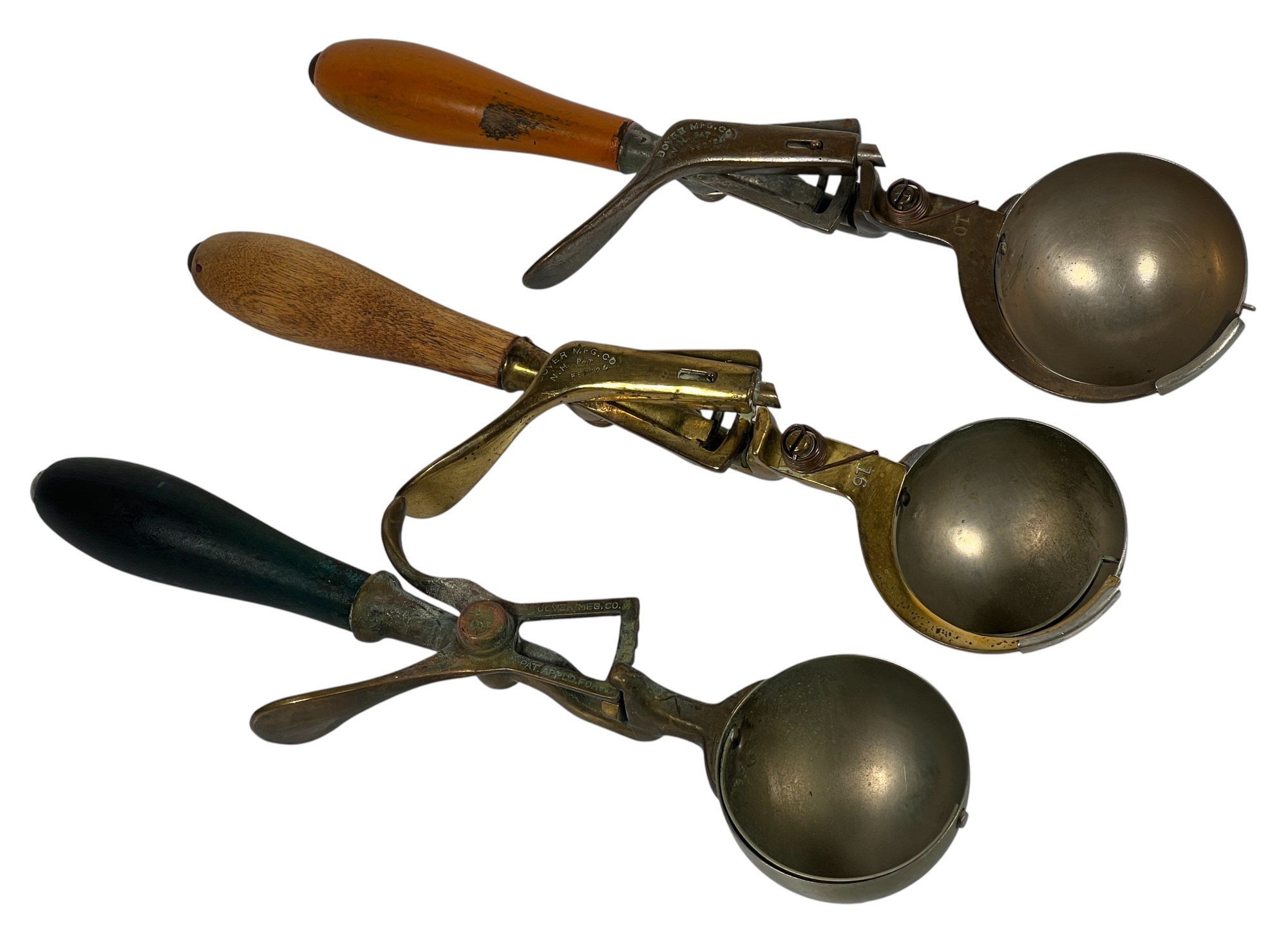 (2) dual action spring loaded ice cream scoops made by Dover Mfg. Co. (Dover, NH) models 10 and 16. Early (20th c), chromed brass and wood. 11 inches. Condition: Good. Temp No 8702