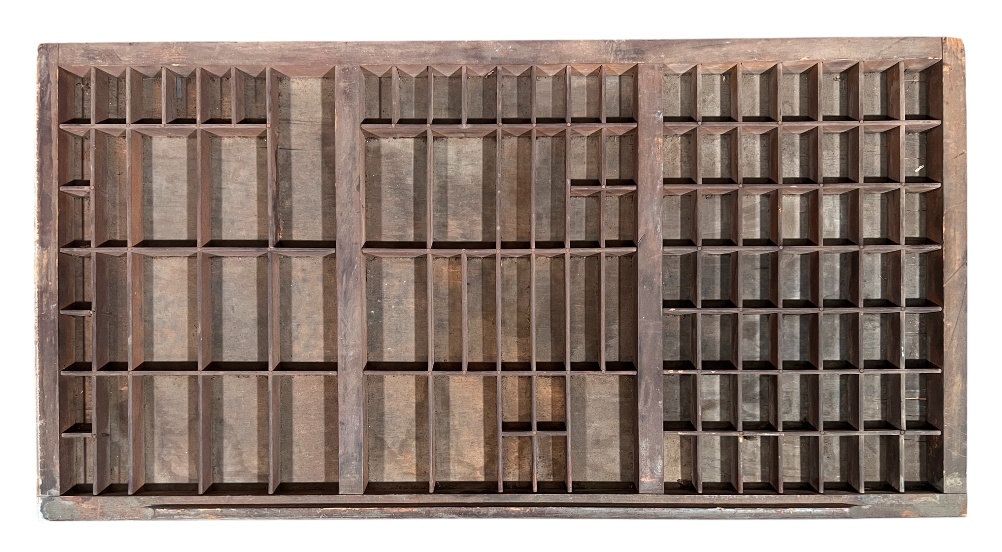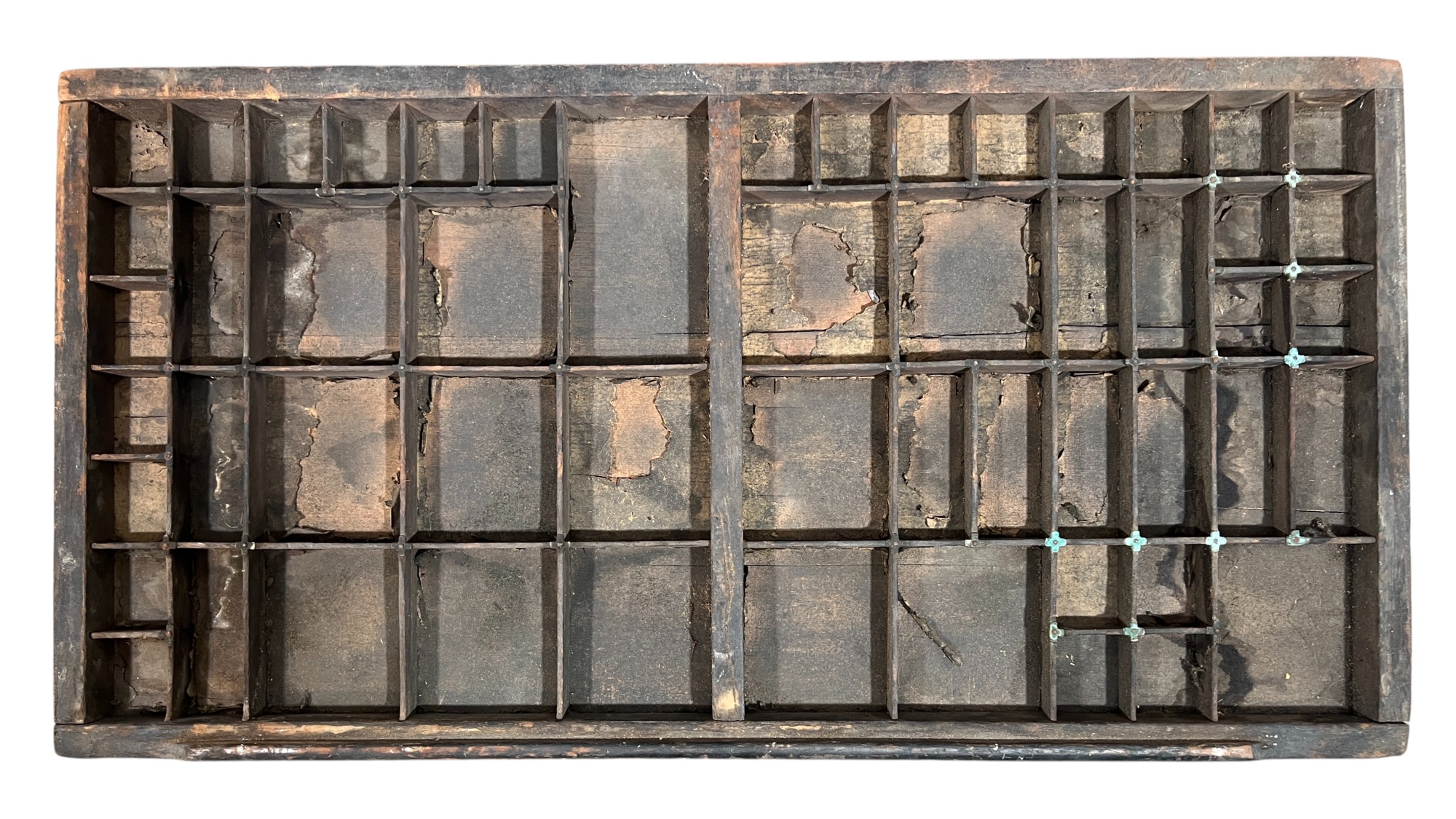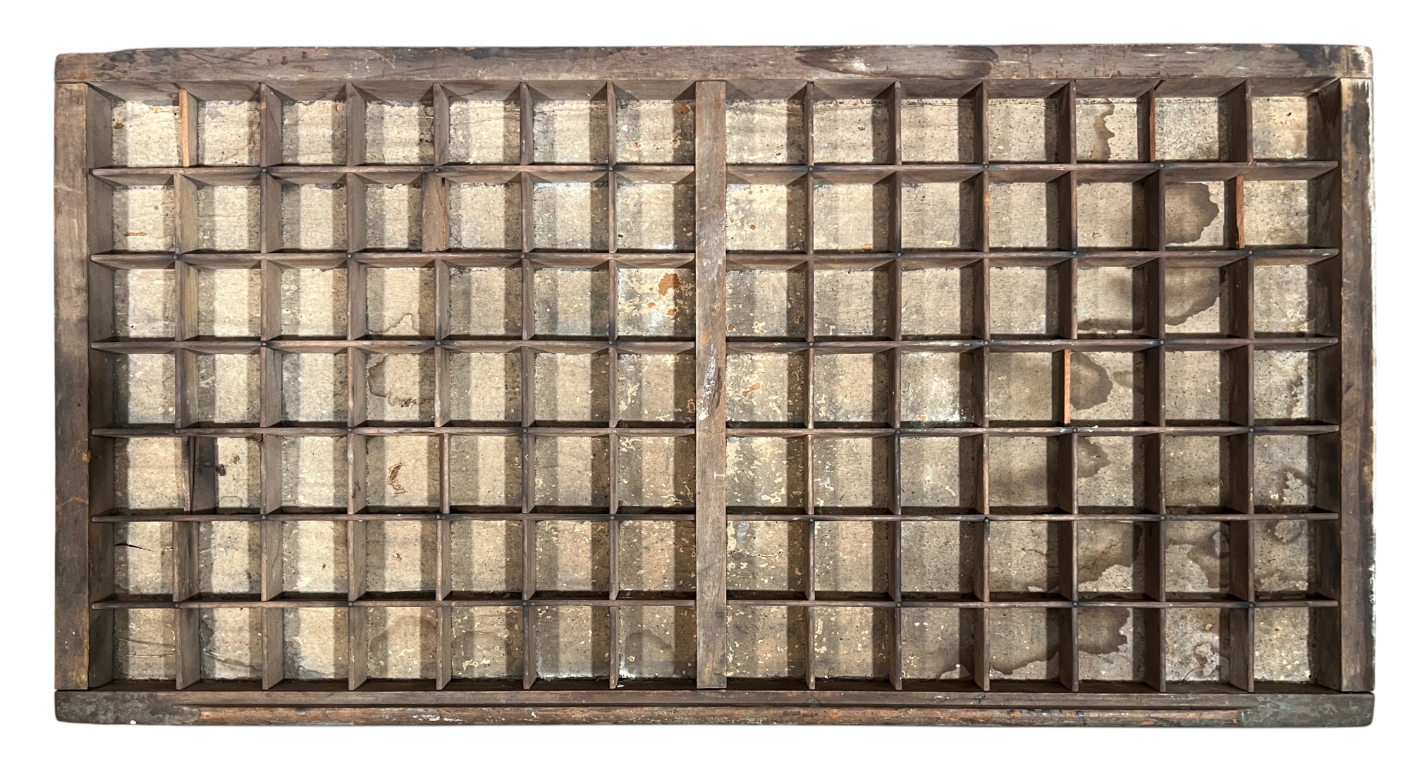 In old slate blue paint, (1) with paper typeset label. Great for displaying collections. 16 1/2 x 32 1/4 inches. Condition: Old surface. Please see photos. Temp No 8800