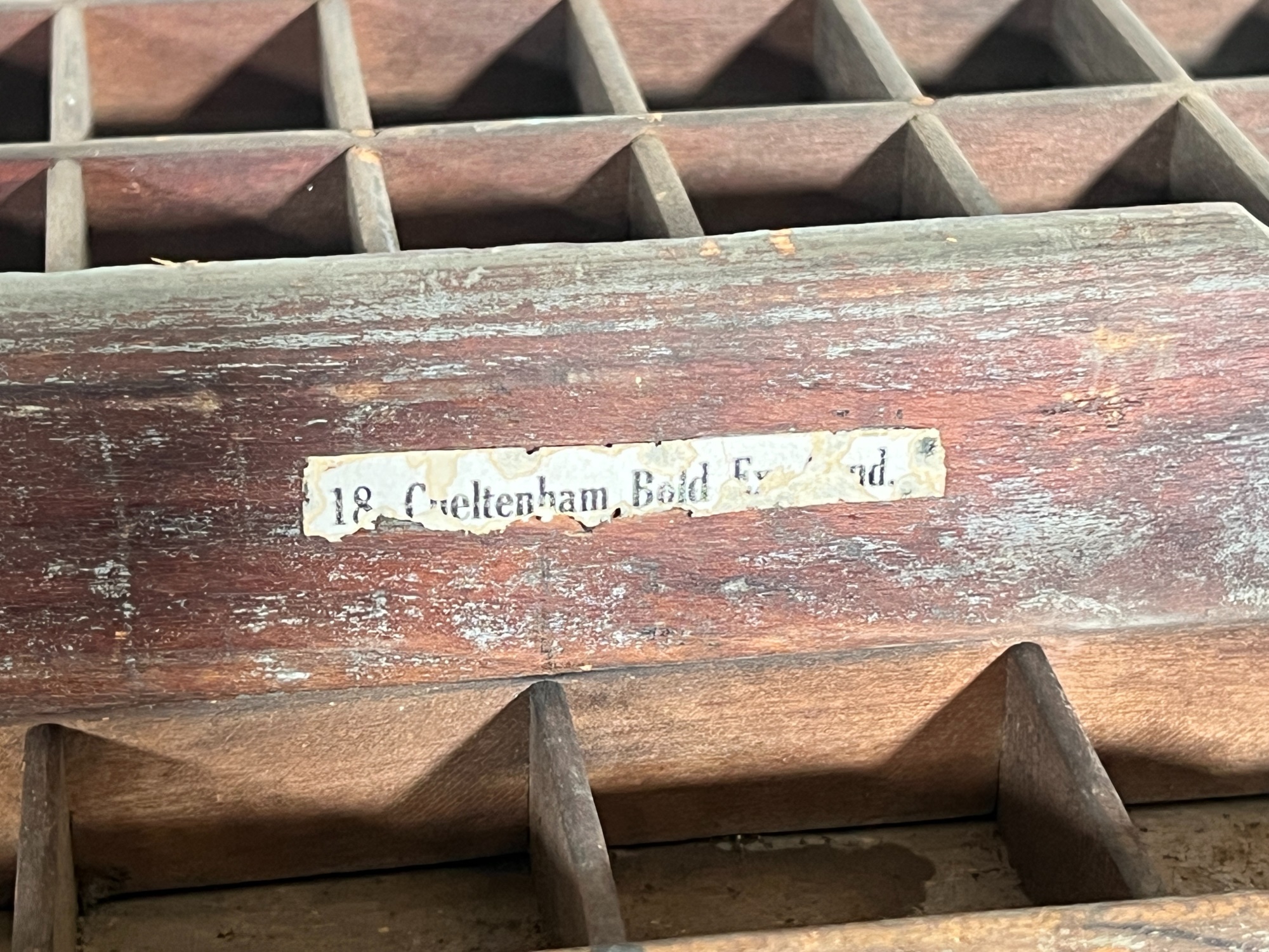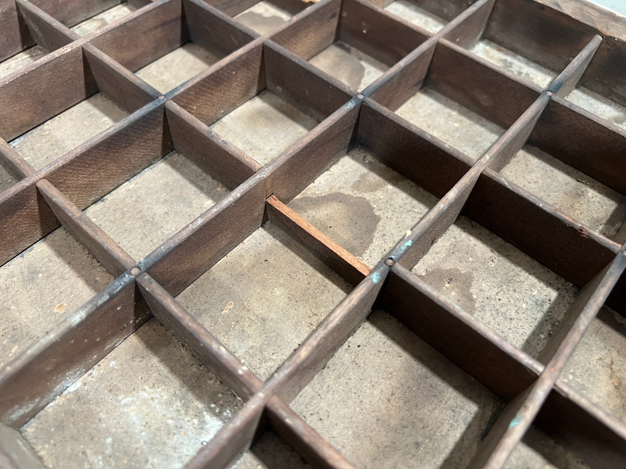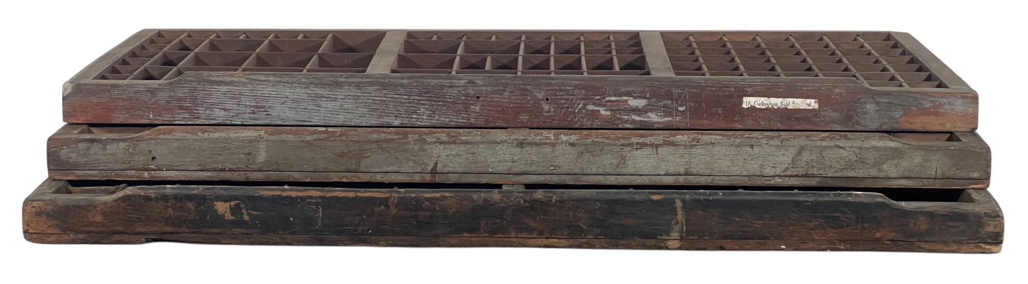 In old slate blue paint, (1) with paper typeset label. Great for displaying collections. 16 1/2 x 32 1/4 inches. Condition: Old surface. Please see photos. Temp No 8800